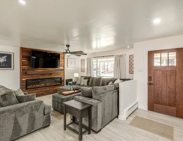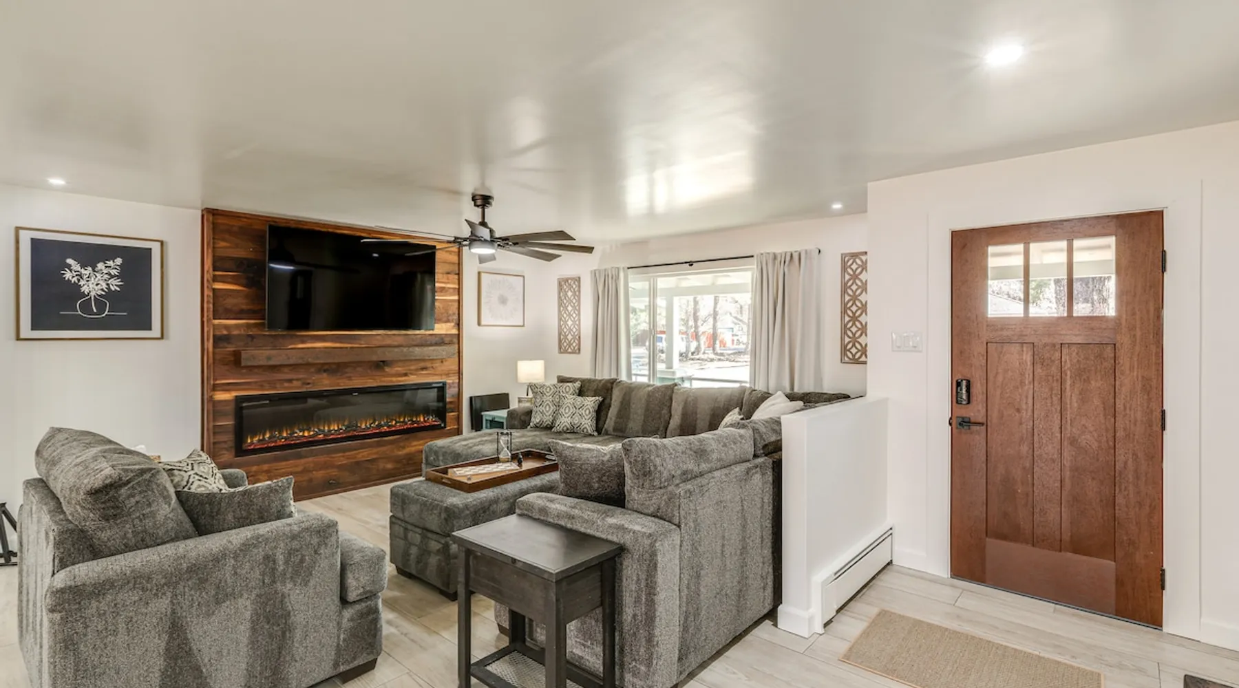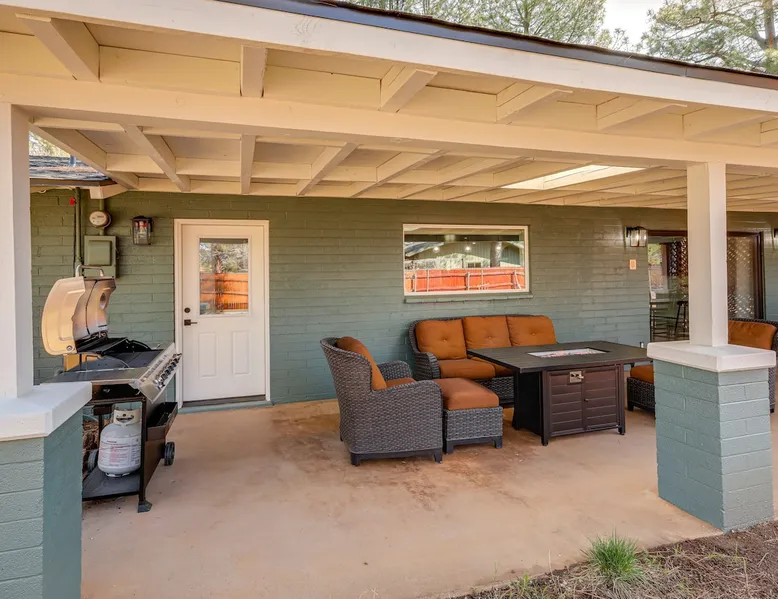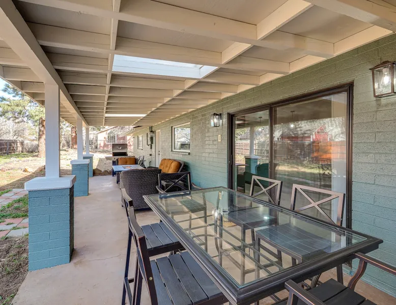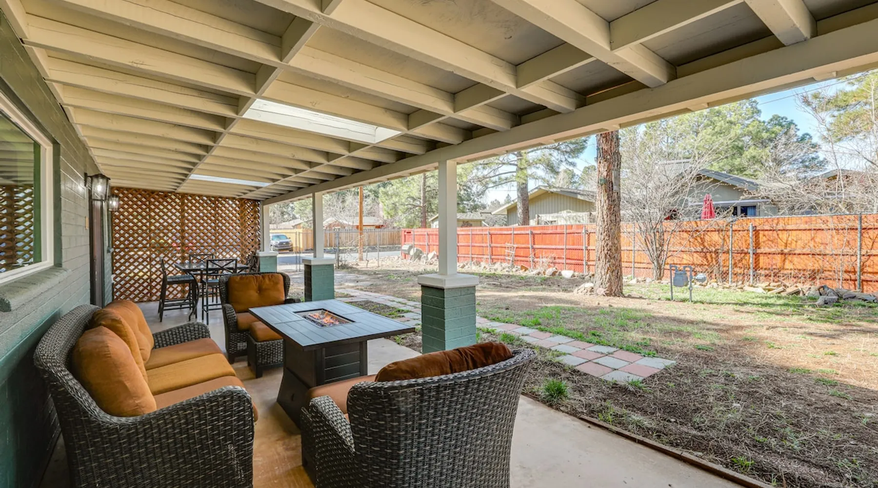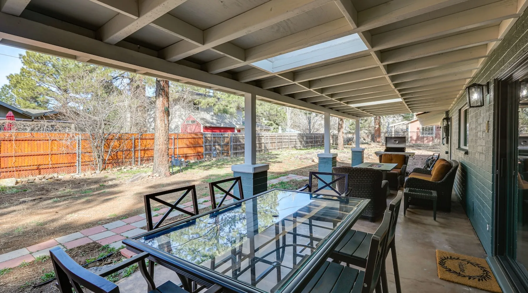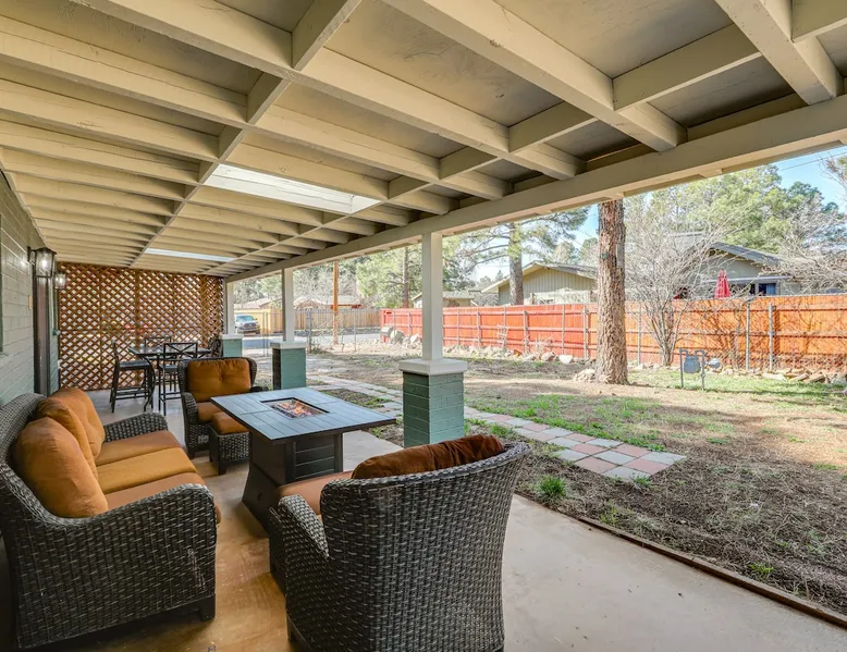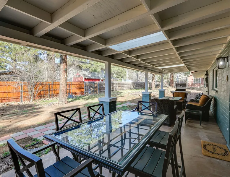 Large Fenced Yard | BBQ Ready | Fireside Relaxation | Pets Welcome w/ Fee Find peace among the tall pines when you stay at this Flagstaff vacation rental. This 5-bedroom, 3-bathroom home makes it easy to explore the beauty and fun of Northern Arizona, whether you want to set out on stunning hikes or walk to downtown for dinner and drinks. When you feel like staying in, fire up the grill while your furry friend runs through the trees or cozy up for a movie night in front of the fireplace. The space TPT-21585849 SLEEPING ARRANGEMENTS - Bedroom 1: 1 king bed - Bedroom 2: 1 king bed - Bedroom 3: 1 queen bed - Bedroom 4: 1 queen bed - Bedroom 5: 1 queen bed - Additional Sleeping: 1 portable crib INDOOR LIVING - Smart TVs w/ cable, bluetooth speaker - Electric fireplace, wet bar - Board games, books - Dining table, high chair - En-suite bathrooms, walk-in showers OUTDOOR LIVING - Covered patio, fire pit table - Outdoor dining set, gas grill - Fenced backyard, cornhole, horseshoes KITCHEN - Refrigerator, stove/oven, microwave, dishwasher - Dual Keurig/drip coffee maker (starter coffee provided) - Toaster, Crockpot, blender, cooking basics, spices - Island w/ bar seating, dishware & flatware GENERAL - Keyless entry, self check-in, free WiFi - Washer & dryer, laundry detergent - Iron/board, trash bags/paper towels - Towels/linens, complimentary toiletries, makeup remover pads, hair dryer, baby tub - Gas heating, portable fans, ceiling fans FAQ - Pet fee (paid pre-trip) - No A/C - Quiet hours (10:00 PM-8:00 AM) - 3 exterior security cameras (facing out) - 4WD/AWD required in winter/snowy weather ACCESSIBILITY - Single-story house, 1 step required to access PARKING - Gravel surface (2 vehicles) - Garage (2 vehicles) - RV/trailer parking allowed - Seasonal street parking Guest access Guests will have access to the entire property via keyless entry Other things to note - No smoking - Pet friendly w/ $100 fee (+ fees & taxes, 2 max) - No events, parties, or large gatherings - Please observe quiet hours from 10:00 PM to 8:00 AM - Additional fees and taxes may apply - Photo ID may be required upon check-in ADDITIONAL INFORMATION - This single-story house requires using 1 step to access - The property does not offer air conditioning - The property has portable fans and ceiling fans - Your safety matters. This property features 3 exterior security cameras. Camera 1 is located on the front porch facing the main entrance. Camera 2 is located at the front of the house facing the driveway. Camera 3 is located at the back of the home facing the rear porch. These cameras do not look into any interior spaces. The cameras record video and sound when activated by motion - Flagstaff experiences significant winter weather, and we want to ensure our guests are well-prepared for snow-related conditions. Please travel with a 4WD/AWD vehicle and carry snow chains if required. Check the weather and road conditions before departing for your trip. Be prepared to shovel walkways or vehicles if snow falls during your stay