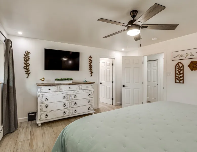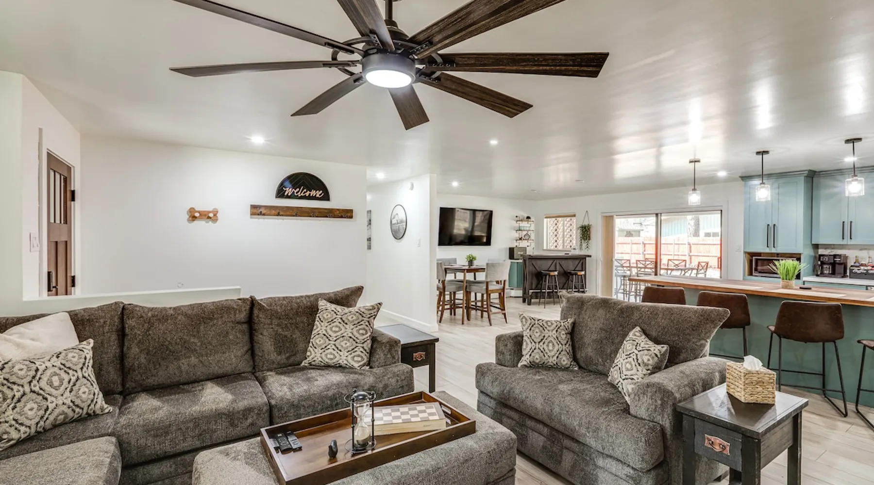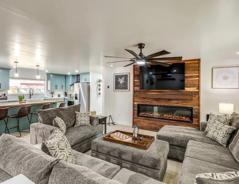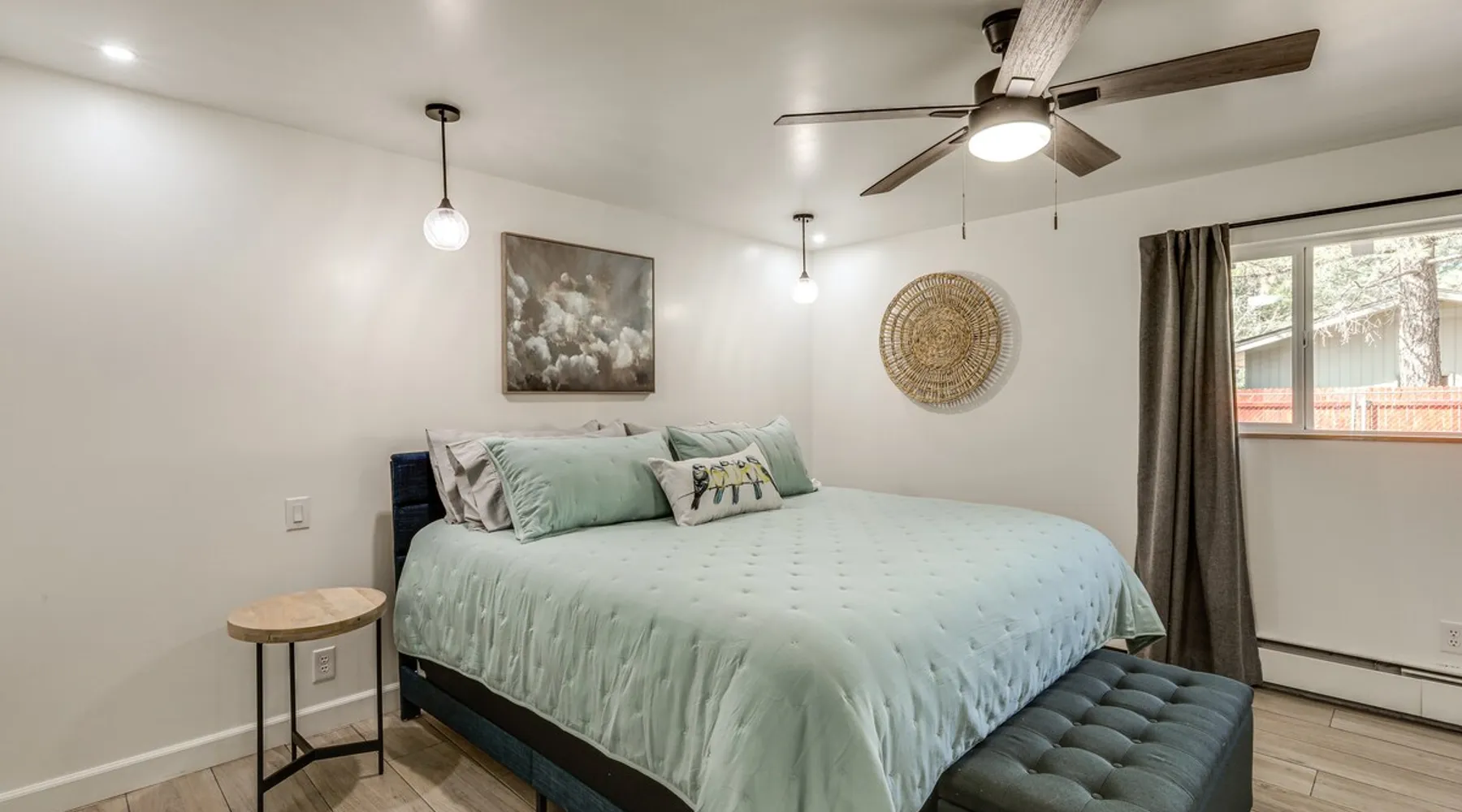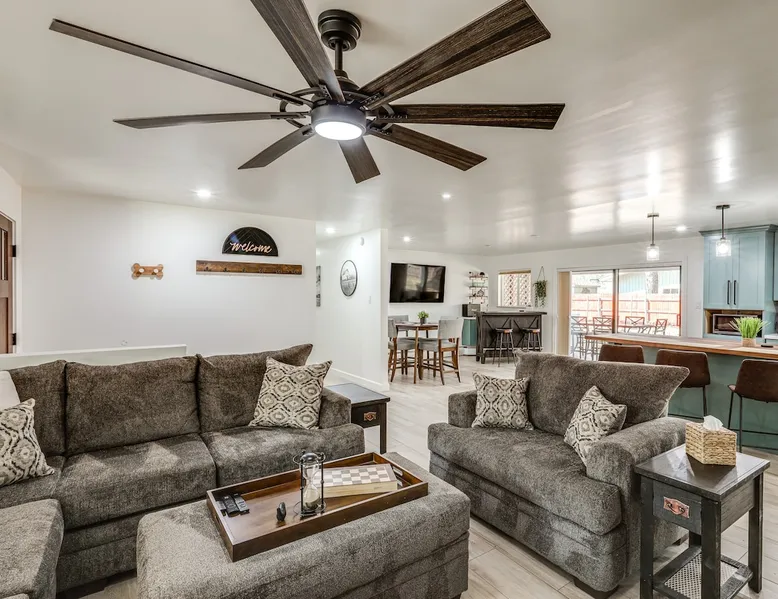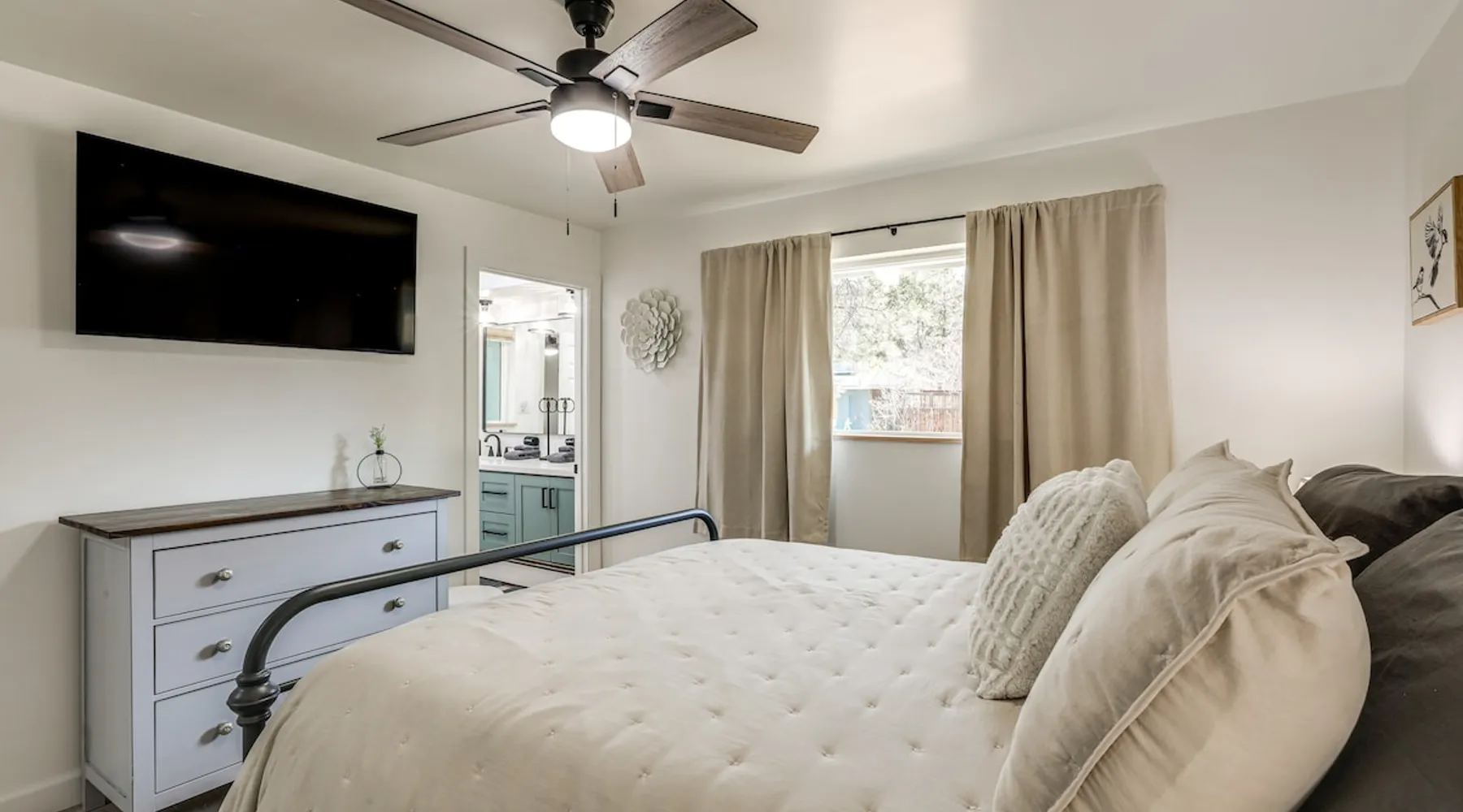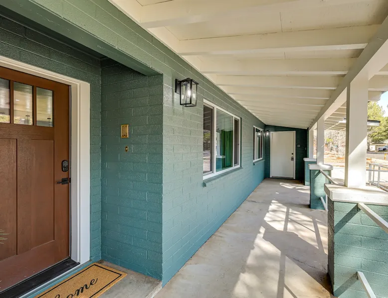 Large Fenced Yard | BBQ Ready | Fireside Relaxation | Pets Welcome w/ Fee Find peace among the tall pines when you stay at this Flagstaff vacation rental. This 5-bedroom, 3-bathroom home makes it easy to explore the beauty and fun of Northern Arizona, whether you want to set out on stunning hikes or walk to downtown for dinner and drinks. When you feel like staying in, fire up the grill while your furry friend runs through the trees or cozy up for a movie night in front of the fireplace. The space TPT-21585849 SLEEPING ARRANGEMENTS - Bedroom 1: 1 king bed - Bedroom 2: 1 king bed - Bedroom 3: 1 queen bed - Bedroom 4: 1 queen bed - Bedroom 5: 1 queen bed - Additional Sleeping: 1 portable crib INDOOR LIVING - Smart TVs w/ cable, bluetooth speaker - Electric fireplace, wet bar - Board games, books - Dining table, high chair - En-suite bathrooms, walk-in showers OUTDOOR LIVING - Covered patio, fire pit table - Outdoor dining set, gas grill - Fenced backyard, cornhole, horseshoes KITCHEN - Refrigerator, stove/oven, microwave, dishwasher - Dual Keurig/drip coffee maker (starter coffee provided) - Toaster, Crockpot, blender, cooking basics, spices - Island w/ bar seating, dishware & flatware GENERAL - Keyless entry, self check-in, free WiFi - Washer & dryer, laundry detergent - Iron/board, trash bags/paper towels - Towels/linens, complimentary toiletries, makeup remover pads, hair dryer, baby tub - Gas heating, portable fans, ceiling fans FAQ - Pet fee (paid pre-trip) - No A/C - Quiet hours (10:00 PM-8:00 AM) - 3 exterior security cameras (facing out) - 4WD/AWD required in winter/snowy weather ACCESSIBILITY - Single-story house, 1 step required to access PARKING - Gravel surface (2 vehicles) - Garage (2 vehicles) - RV/trailer parking allowed - Seasonal street parking Guest access Guests will have access to the entire property via keyless entry Other things to note - No smoking - Pet friendly w/ $100 fee (+ fees & taxes, 2 max) - No events, parties, or large gatherings - Please observe quiet hours from 10:00 PM to 8:00 AM - Additional fees and taxes may apply - Photo ID may be required upon check-in ADDITIONAL INFORMATION - This single-story house requires using 1 step to access - The property does not offer air conditioning - The property has portable fans and ceiling fans - Your safety matters. This property features 3 exterior security cameras. Camera 1 is located on the front porch facing the main entrance. Camera 2 is located at the front of the house facing the driveway. Camera 3 is located at the back of the home facing the rear porch. These cameras do not look into any interior spaces. The cameras record video and sound when activated by motion - Flagstaff experiences significant winter weather, and we want to ensure our guests are well-prepared for snow-related conditions. Please travel with a 4WD/AWD vehicle and carry snow chains if required. Check the weather and road conditions before departing for your trip. Be prepared to shovel walkways or vehicles if snow falls during your stay