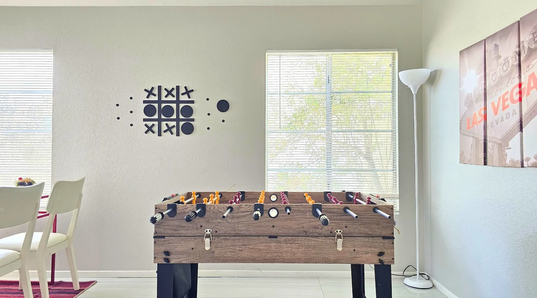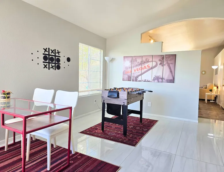 🏠 1 Story Home / 1,146 Sq Ft 🚗 Quick Freeway Drive to Airport & Strip 🅿️ Free Parking 📶 High Speed Wi-Fi ☕ Coffee (Drip and instant) 📺 Smart TVs 🧺 Washer/Dryer 🔑 Keypad Self Check-in The space ➡️ ENTERTAINMENT 🎱 Mini 2-in-1 Pool / Foosball table 📺 Smart TVs - Streaming ready (Login with YOUR OWN account) 📶 High Speed Wi-Fi ➡️ KITCHEN 👨🍳 Fully equipped with pots, pans, dishware, and cooking utensils ☕ Drip Coffee Machine ✨ We recommend checking what's available in the kitchen before doing groceries as prior guests may have left spices, cooking oil etc. ➡️ SLEEPING ARRANGEMENT 🛏️ 2 Bedrooms (1 Master) ✨ 2 Queen Beds ✨ 1 Queen Size Pullout Couch in Living Room ➡️ BATHROOMS ✨ Hair Dryer ✨ Essentials ✨ Washcloths are NOT provided, please BYO if needed ➡️ LAUNDRY 🧺 Washer/Dryer 🥌 Iron & Iron board Guest access 🏠 The whole house is yours to call home for the time of your stay. 🚙 DISTANCES 📌 Harry Reid Intl Airport: 4 miles / ≃ 6 mn driving 📌 Las Vegas Boulevard (Freeway Exit): 3 miles / ≃ 8 mn driving 📌 Downtown Fremont Street Experience: 12 miles 📌 Convention Center: 10 miles Registration Details Exempt