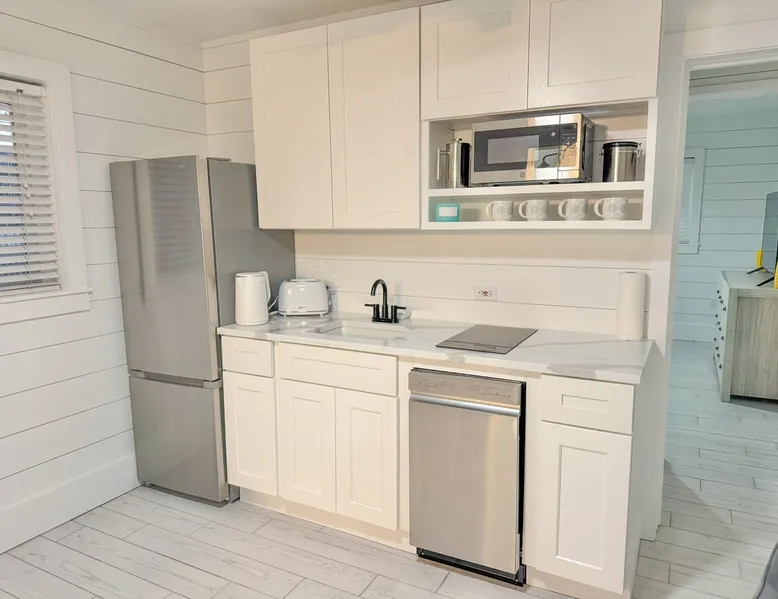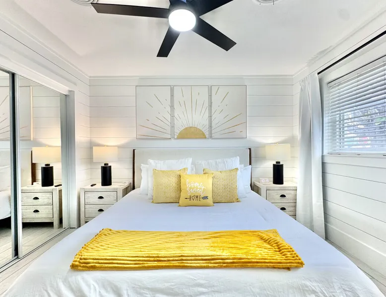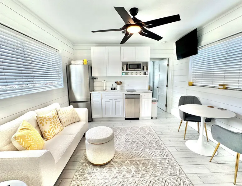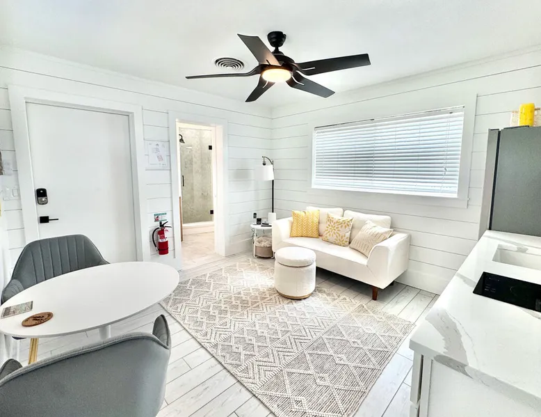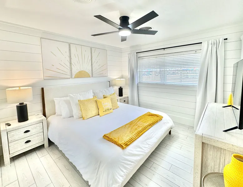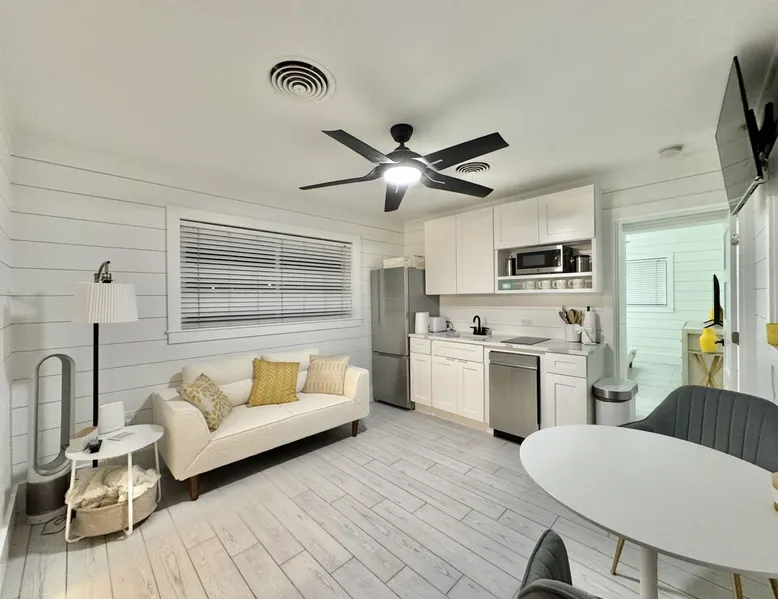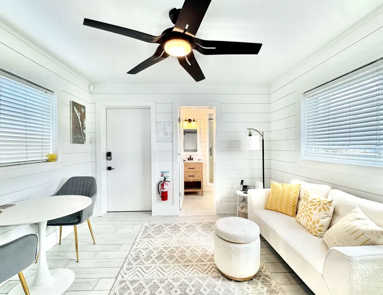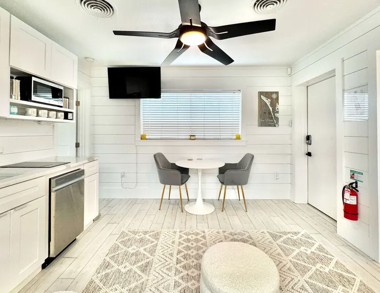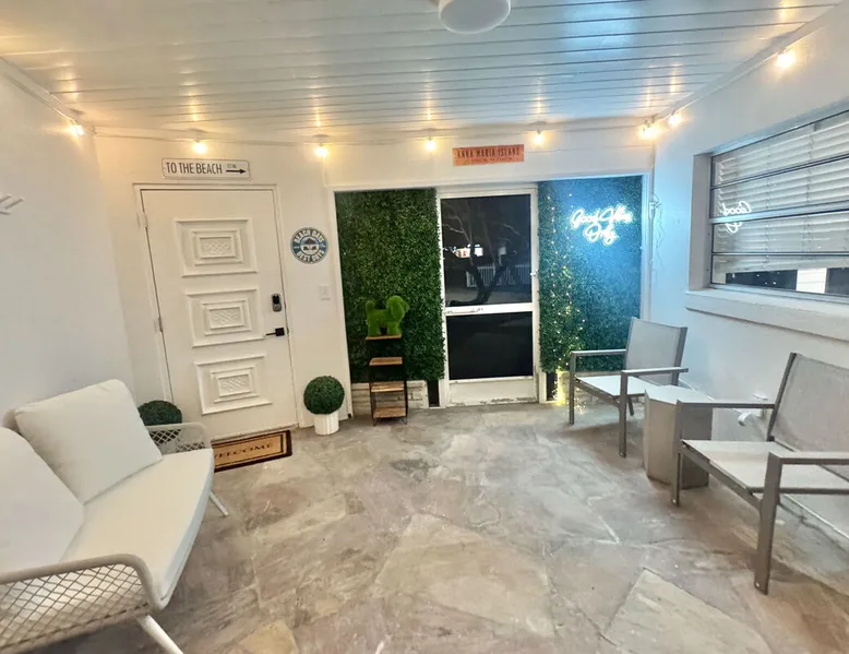 Cozy ground level one bed one bath studio is bright and has shiplap throughout after being recently updated. Amazing location, walk to many shops, restaurants & bars. Located just 0.4 miles from the white sandy beach. The kitchenette has fridge/freezer, hob, microwave and dishwasher. Garden with patio, 2 x sun loungers & BBQ. Screened in porch with seating. Bedroom has a smart TV and King bed. Property is duplex attached to another home with a pool that is not part of the rental. The space 7-minute walk to the beach. Close to restaurants and grocery stores. Welcome to Happy Place, a cozy ground level one bedroom one bathroom studio is bright and has shiplap throughout after being recently updated. Located just 0.4 miles from the white sandy beaches of the Gulf of Mexico. surrounded by tropical landscaping. This bungalow has all the essentials for a fabulous vacation. There is a kitchenette with stainless steel fridge, hob & microwave and dish-ware. There is a bistro table set for two guests. After a long day of fun at the beach and watch your favorite show on the large flat screen TV and fall asleep to the sound of the nearby palm trees swaying. The bedroom has a smart TV and King bed with Tuft & Needle mattress, the bathroom has a walk-in shower. Stroll to the beach each evening to watch the amazing Anna Maria Island sunsets. Everything you could want is in close proximity, including the beach, restaurants, and shopping centers, and up the street is an Anna Maria Island trolley stop that can take you and your guests anywhere you like on this coastal 7-mile island. If you would like to relax by a swimming pool day passes can be purchased for $20 (price may be subject to change) from Resort Pass for the "Waterline Villas & Marina" just a short walk away! The Chateau restaurant/bar is next to the pool where you can purchase food and drinks. Search the Resort Pass website for Holmes Beach to reserve the day pass or explore other close by resort pools. One of the best features of this home is the location, you can walk to restaurants such as The Ugly Grouper, The Chateau, Isola Bella Italian Eatery, Breakfast At Victoria's, Minnie's Beach Cafe, Pizzano's Pizza, AMI Mediterranean Express and more such as Blueberries Cafe, Anna Maria Island Coffee Shack, Scott's Deli and Small Town Creamer Ice Cream store. You can also walk to bars such as The Doctors Office, The Freckled Fin, D'Coy Ducks, Duffy's Tavern, Fifty Three Fifty The Pourhouse & Hurricane Hanks. Also within walking distance is AMI Health & Fitness Gym, the soccer field, playground, pickle ball and tennis courts, skate park and public boat ramp. There is a free shuttle and the Monkey Bus if you would like to check out bars and restaurant's outside of Holmes Beach. Seaside Laundromat is located within walking distance, just 0.2 of a mile away. Another option within driving distance are YoWash Laundromat in Bradenton 8.4 miles away. Please note this property is duplex that is attached to another home with a pool that is not part of the rental. General Complimentary high-speed wireless internet Smoke-free and pet-free for your comfort Towels and linens are provided Fully equipped kitchen Keyless entry 2 x Beach Chairs Living Area/Kitchen Smart TV Sofa Bed Table & 2 Chairs Fridge/Freezer, Hob, Dishwasher & Microwave Bedroom/Bed Sizes Bedroom 1 - King (Downstairs) Garden Patio With Seating 2 x Sun loungers BBQ Grill Professionally managed to offer you superior, personalized service. No hassle with key pick-up! Drive straight to your vacation rental!