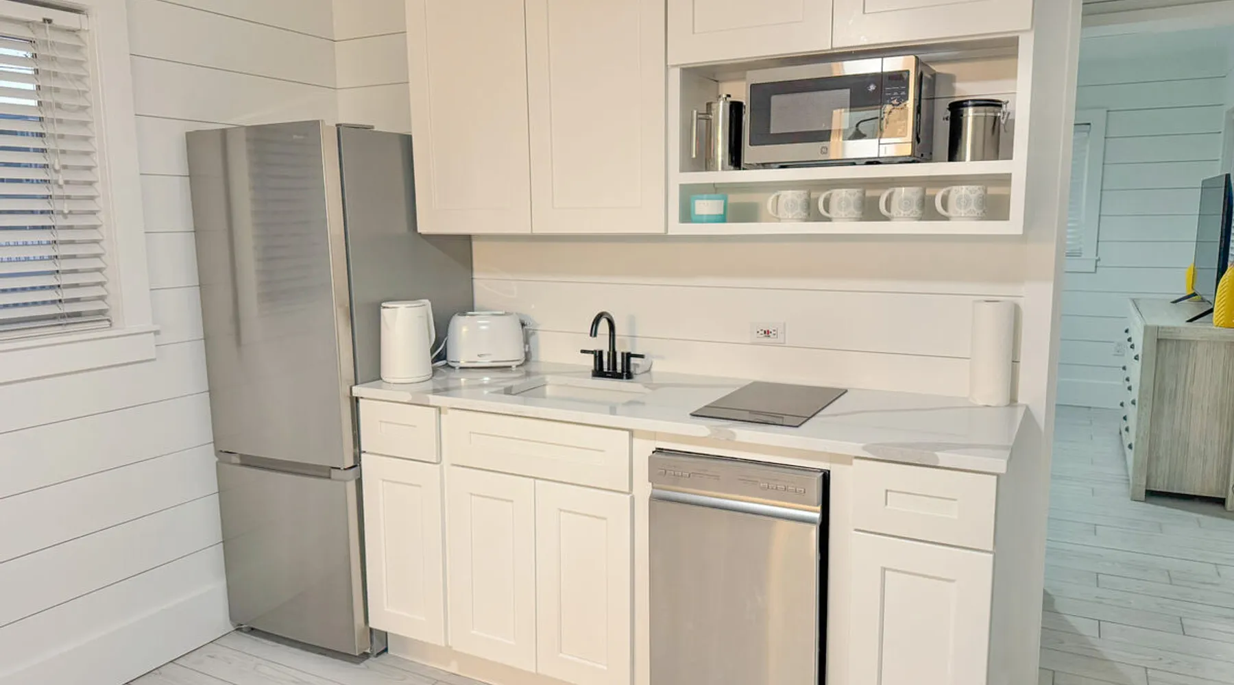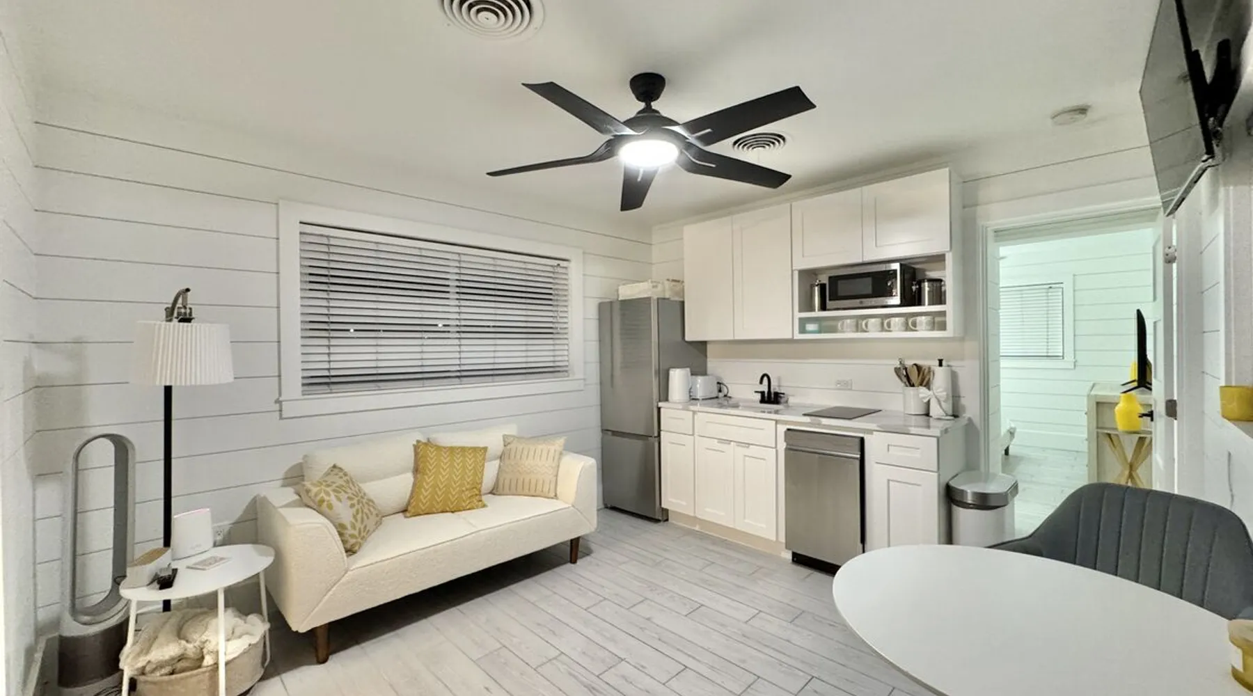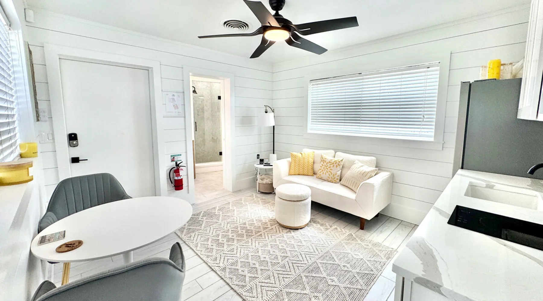 Cozy ground level one bed one bath studio is bright and has shiplap throughout after being recently updated. Amazing location, walk to many shops, restaurants & bars. Located just 0.4 miles from the white sandy beach. The kitchenette has fridge/freezer, hob, microwave and dishwasher. Garden with patio, 2 x sun loungers & BBQ. Screened in porch with seating. Bedroom has a smart TV and King bed. Property is duplex attached to another home with a pool that is not part of the rental. The space 7-minute walk to the beach. Close to restaurants and grocery stores. Welcome to Happy Place, a cozy ground level one bedroom one bathroom studio is bright and has shiplap throughout after being recently updated. Located just 0.4 miles from the white sandy beaches of the Gulf of Mexico. surrounded by tropical landscaping. This bungalow has all the essentials for a fabulous vacation. There is a kitchenette with stainless steel fridge, hob & microwave and dish-ware. There is a bistro table set for two guests. After a long day of fun at the beach and watch your favorite show on the large flat screen TV and fall asleep to the sound of the nearby palm trees swaying. The bedroom has a smart TV and King bed with Tuft & Needle mattress, the bathroom has a walk-in shower. Stroll to the beach each evening to watch the amazing Anna Maria Island sunsets. Everything you could want is in close proximity, including the beach, restaurants, and shopping centers, and up the street is an Anna Maria Island trolley stop that can take you and your guests anywhere you like on this coastal 7-mile island. If you would like to relax by a swimming pool day passes can be purchased for $20 (price may be subject to change) from Resort Pass for the "Waterline Villas & Marina" just a short walk away! The Chateau restaurant/bar is next to the pool where you can purchase food and drinks. Search the Resort Pass website for Holmes Beach to reserve the day pass or explore other close by resort pools. One of the best features of this home is the location, you can walk to restaurants such as The Ugly Grouper, The Chateau, Isola Bella Italian Eatery, Breakfast At Victoria's, Minnie's Beach Cafe, Pizzano's Pizza, AMI Mediterranean Express and more such as Blueberries Cafe, Anna Maria Island Coffee Shack, Scott's Deli and Small Town Creamer Ice Cream store. You can also walk to bars such as The Doctors Office, The Freckled Fin, D'Coy Ducks, Duffy's Tavern, Fifty Three Fifty The Pourhouse & Hurricane Hanks. Also within walking distance is AMI Health & Fitness Gym, the soccer field, playground, pickle ball and tennis courts, skate park and public boat ramp. There is a free shuttle and the Monkey Bus if you would like to check out bars and restaurant's outside of Holmes Beach. Seaside Laundromat is located within walking distance, just 0.2 of a mile away. Another option within driving distance are YoWash Laundromat in Bradenton 8.4 miles away. Please note this property is duplex that is attached to another home with a pool that is not part of the rental. General Complimentary high-speed wireless internet Smoke-free and pet-free for your comfort Towels and linens are provided Fully equipped kitchen Keyless entry 2 x Beach Chairs Living Area/Kitchen Smart TV Sofa Bed Table & 2 Chairs Fridge/Freezer, Hob, Dishwasher & Microwave Bedroom/Bed Sizes Bedroom 1 - King (Downstairs) Garden Patio With Seating 2 x Sun loungers BBQ Grill Professionally managed to offer you superior, personalized service. No hassle with key pick-up! Drive straight to your vacation rental!