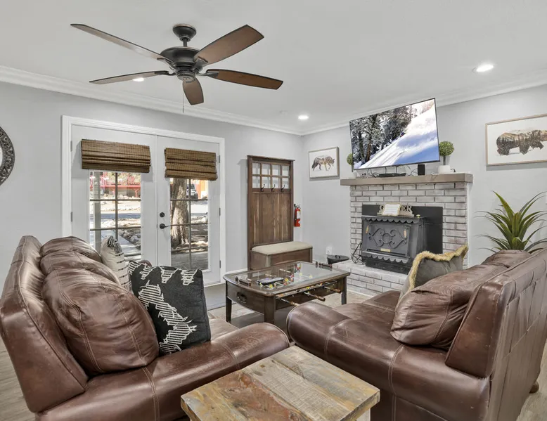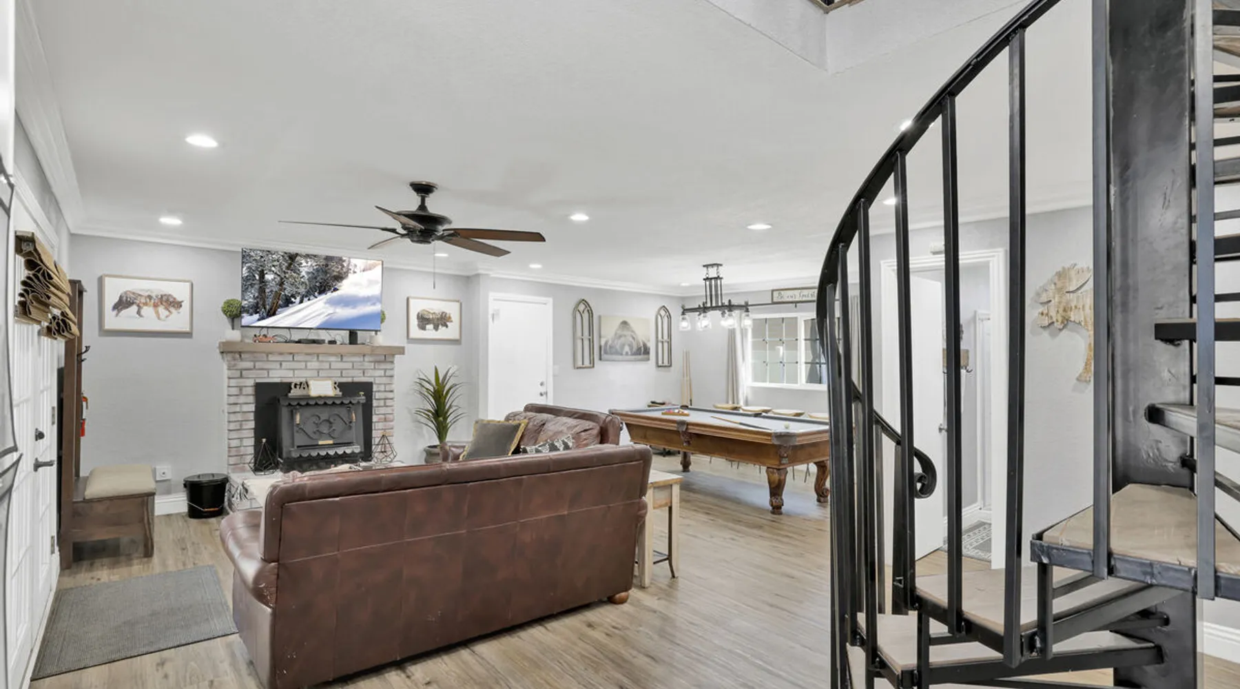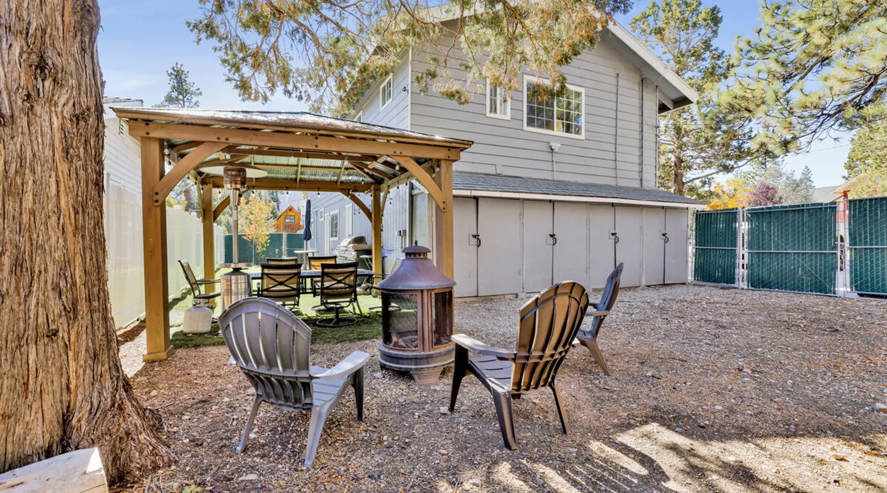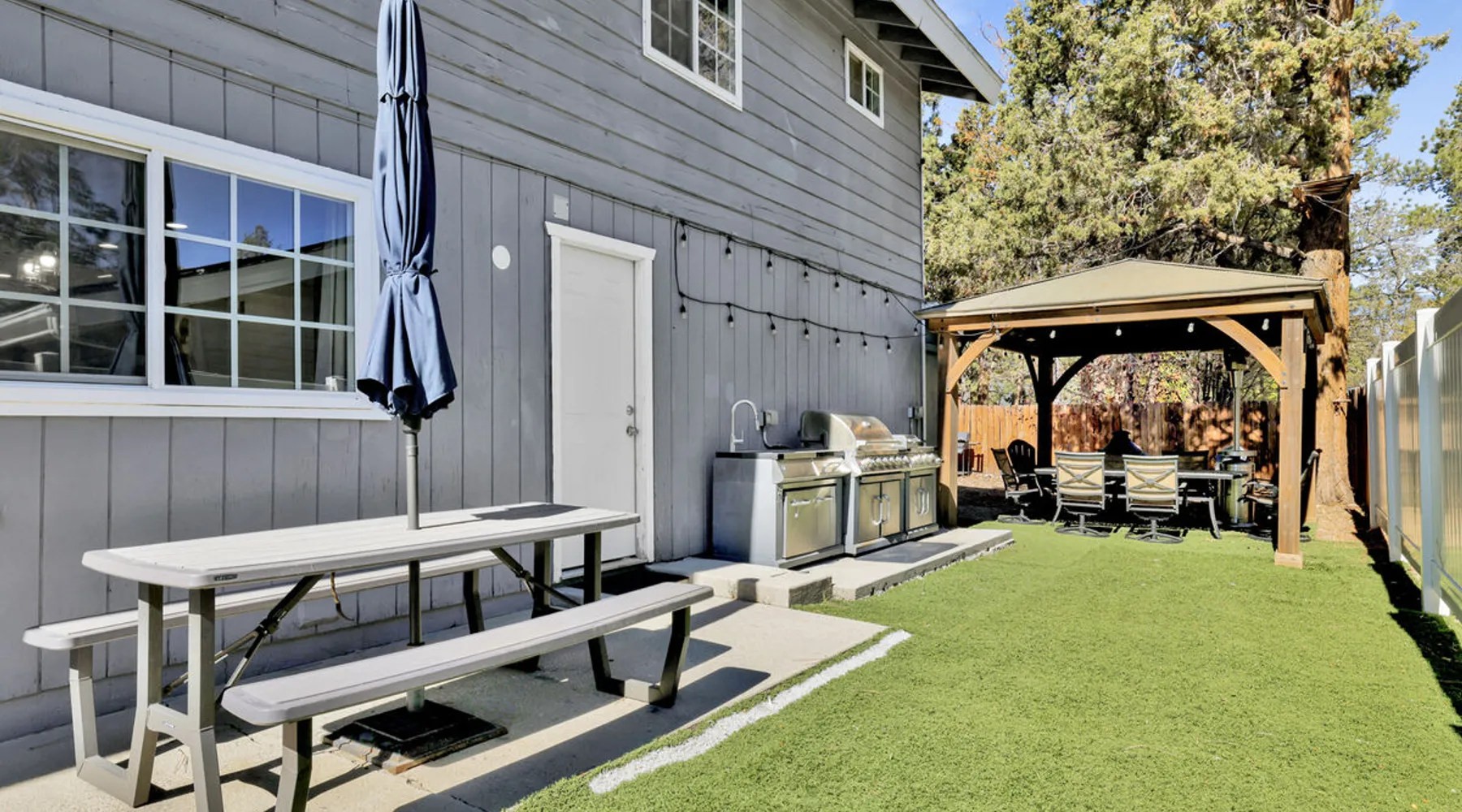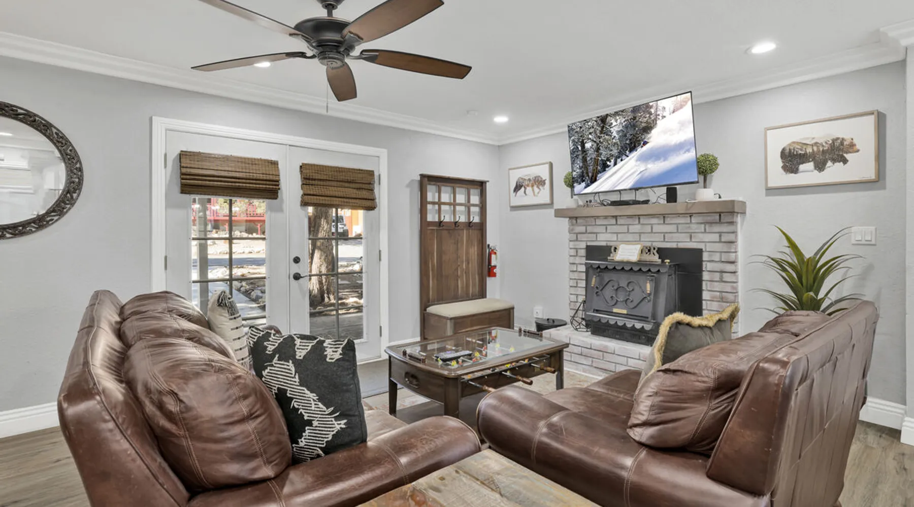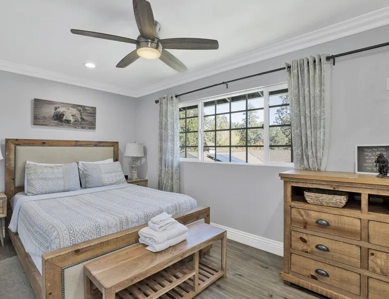 Brewer Escape ~ Modern, newly renovated escape with mountain views - five minutes to town Nestled on a corner lot 5 minutes from town and 7 minutes from the lake shore, this 5BR/3BA home presents mountain views, two alfresco dining options, and an outdoor kitchen. The 2,400 square foot interior offers a renovated kitchen, two living areas, each with a wood-burning stove. The slopes and trails at Snow Summit and Bear Mountain are both 15 minutes from home. The space LIVING AREA Two welcoming living areas each have ample seating, a wood-burning stove, and a smart TV. One of the rooms has a pool table and the other has a sleeper sofa. KITCHEN & DINING Detailed with a patterned backsplash and a full suite of stainless-steel appliances, the pristine kitchen is equipped with everything needed to create your favorite meals. When it's time to dine, the table seats six. OUTDOOR AREA & AMENITIES The charming outdoor space features an outdoor kitchen with a gas grill and sink. Dine alfresco under the covered pergola. In the evening, gather for conversation around the wood-burning firepit. A mountain-view balcony presents another gas grill and an additional table to dine alfresco. Sleeping Arrangements: Bedroom 1: Queen Bed, Streaming TV- Downstairs Entry Level Bedroom 2: Queen Bed, Streaming TV- Downstairs Entry Level Bedroom 3: Queen Bed, Streaming TV- Upstairs 2nd Level Bedroom 4: Twin Day Bed, Streaming TV- Upstairs 2nd Level Bedroom 5: King Bed, Streaming TV, Work Desk, Private Bath Living Room: Full Sleeper Sofa, Streaming TV, Fireplace- Downstairs Entry Level Bathroom Arrangements: Hallway 3/4 Bath (Shower Only)- Downstairs Entry Level Hallway 3/4 Bath (Shower Only)- Upstairs 2nd Level Private Bath w/ Walk-In Shower- Bedroom 5- Upstairs 2nd Level ~Sleeps 11 ~2 Car Driveway + 2 Car Garage Parking ~NO PETS ALLOWED ~2,400 Sqaure Feet ~County Permit #: CESTRP-2021-01426 Guest access Once checked in, guests can enjoy sole access to their private property for the duration of their booked dates. Registration Details CESTRP-2021-01426