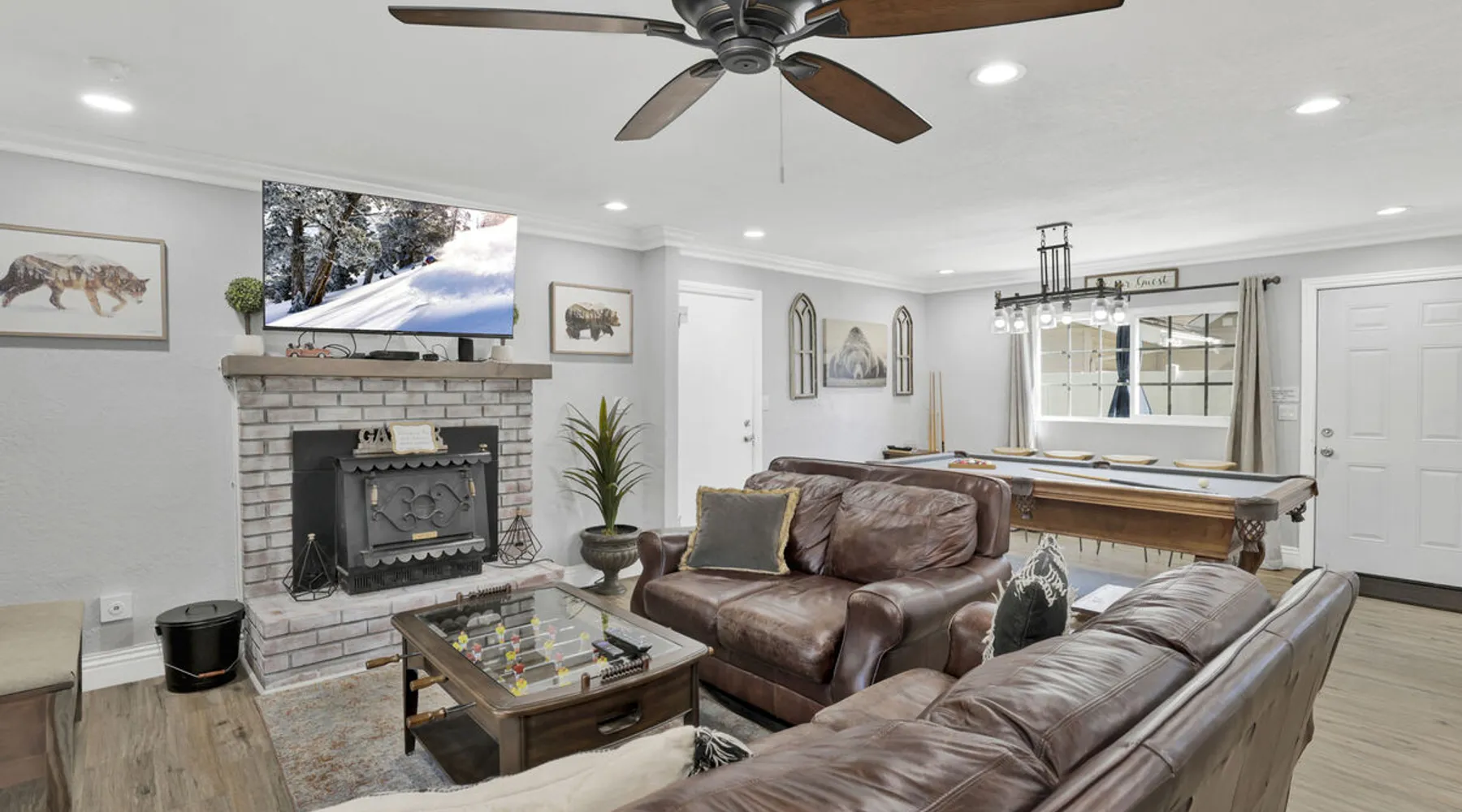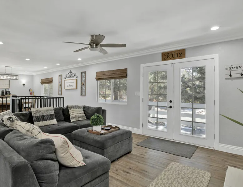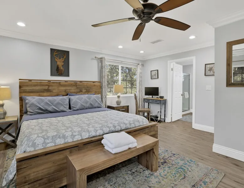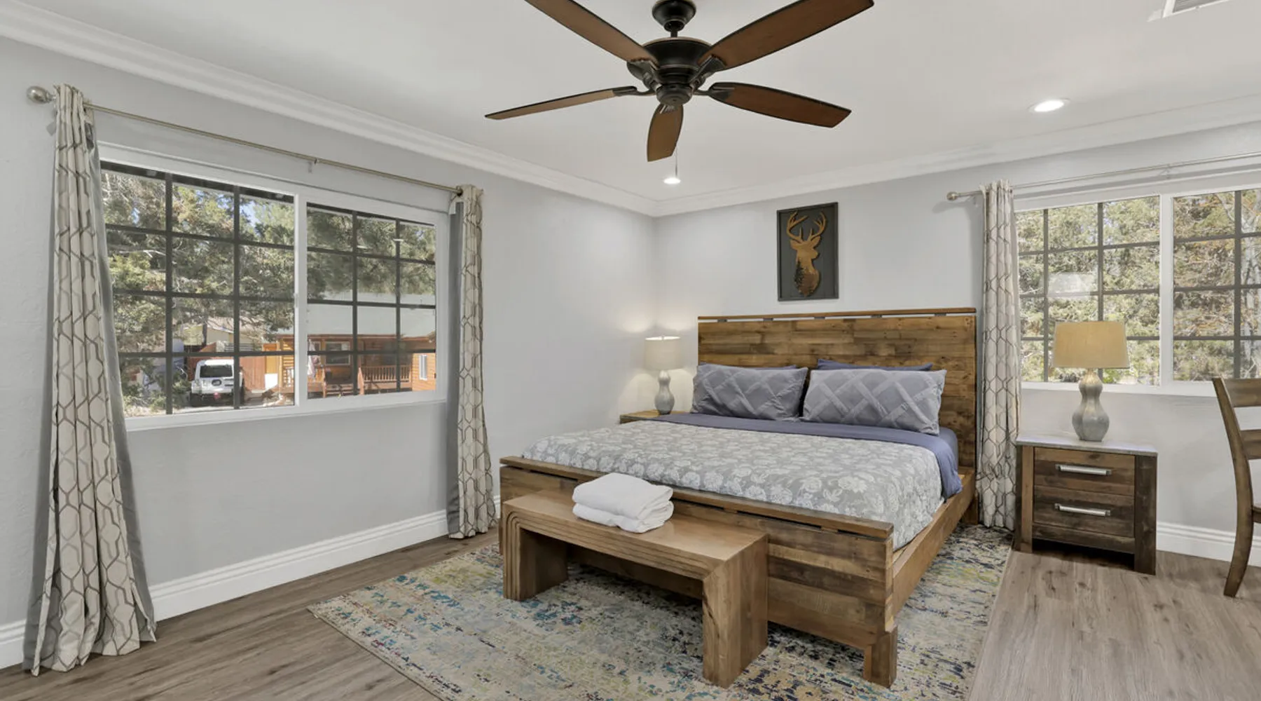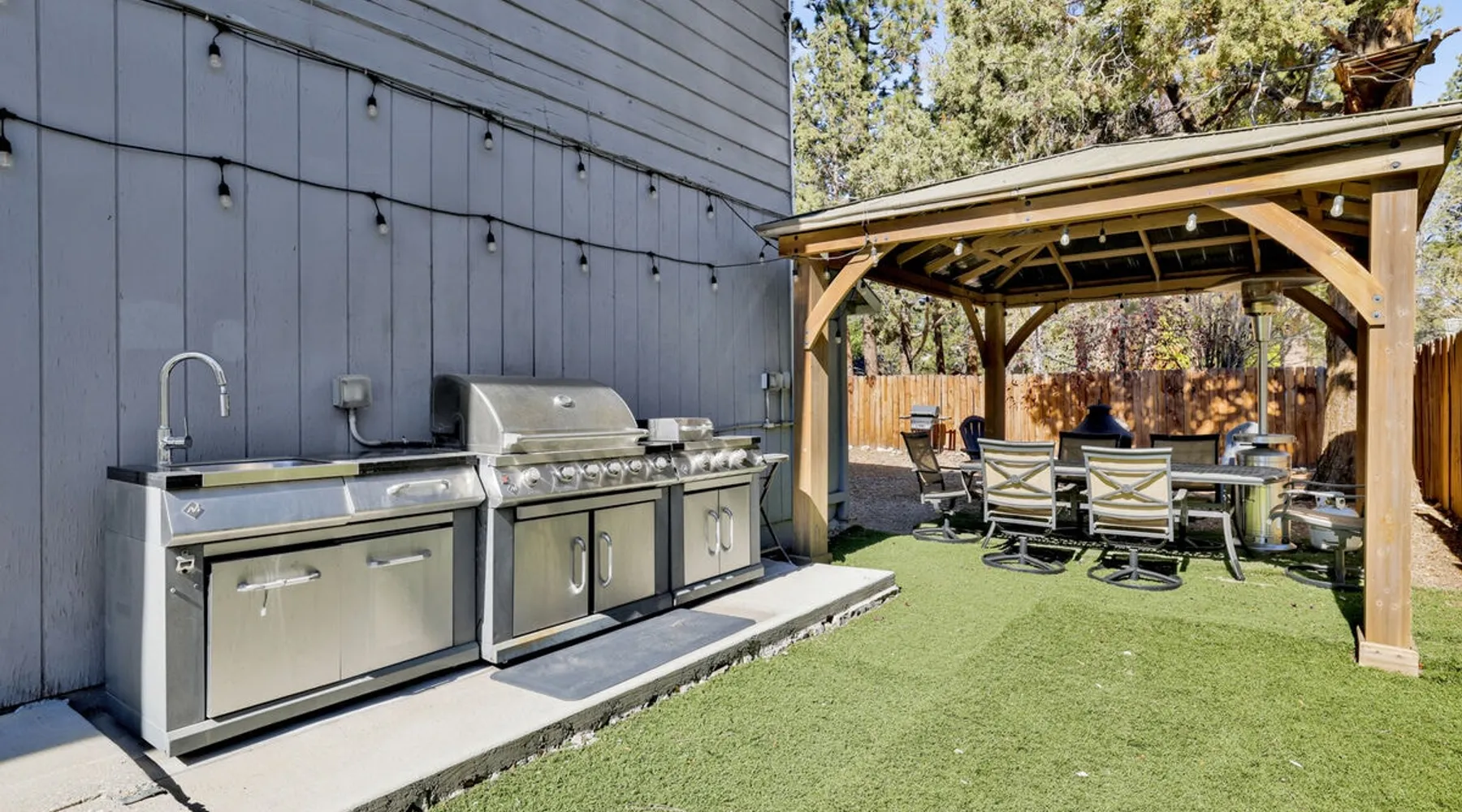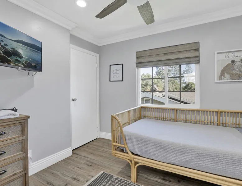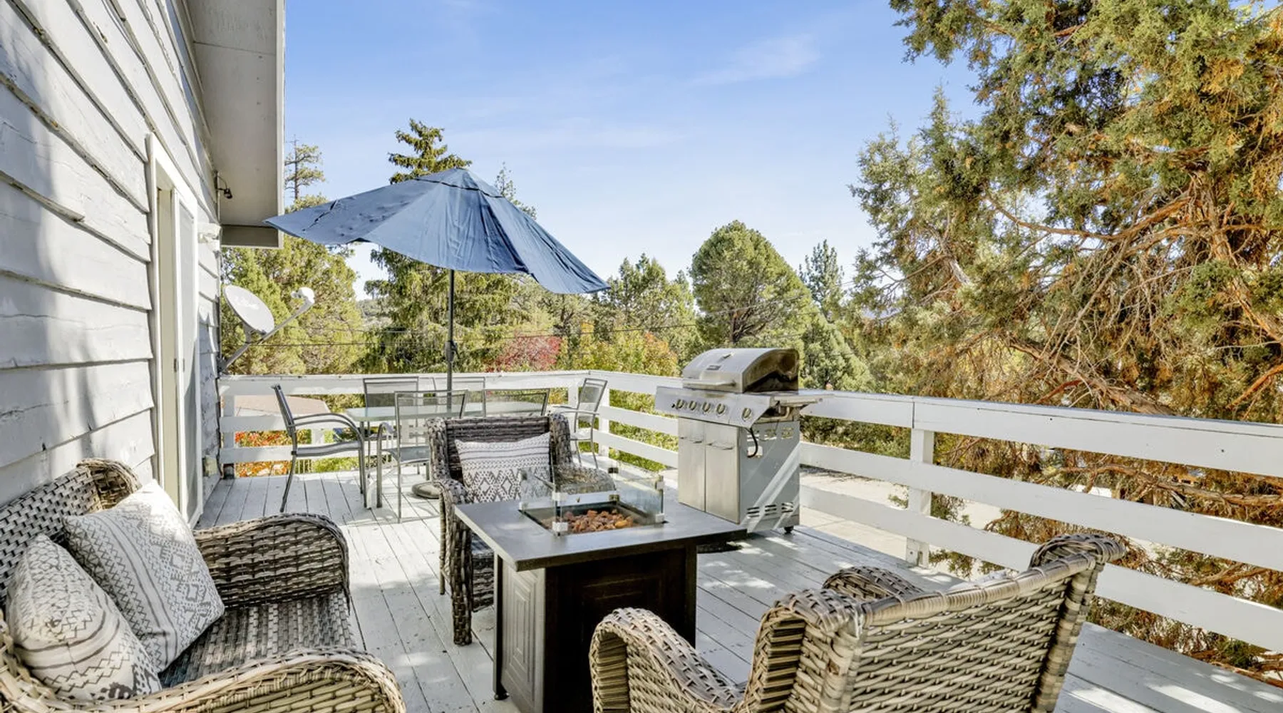 Brewer Escape ~ Modern, newly renovated escape with mountain views - five minutes to town Nestled on a corner lot 5 minutes from town and 7 minutes from the lake shore, this 5BR/3BA home presents mountain views, two alfresco dining options, and an outdoor kitchen. The 2,400 square foot interior offers a renovated kitchen, two living areas, each with a wood-burning stove. The slopes and trails at Snow Summit and Bear Mountain are both 15 minutes from home. The space LIVING AREA Two welcoming living areas each have ample seating, a wood-burning stove, and a smart TV. One of the rooms has a pool table and the other has a sleeper sofa. KITCHEN & DINING Detailed with a patterned backsplash and a full suite of stainless-steel appliances, the pristine kitchen is equipped with everything needed to create your favorite meals. When it's time to dine, the table seats six. OUTDOOR AREA & AMENITIES The charming outdoor space features an outdoor kitchen with a gas grill and sink. Dine alfresco under the covered pergola. In the evening, gather for conversation around the wood-burning firepit. A mountain-view balcony presents another gas grill and an additional table to dine alfresco. Sleeping Arrangements: Bedroom 1: Queen Bed, Streaming TV- Downstairs Entry Level Bedroom 2: Queen Bed, Streaming TV- Downstairs Entry Level Bedroom 3: Queen Bed, Streaming TV- Upstairs 2nd Level Bedroom 4: Twin Day Bed, Streaming TV- Upstairs 2nd Level Bedroom 5: King Bed, Streaming TV, Work Desk, Private Bath Living Room: Full Sleeper Sofa, Streaming TV, Fireplace- Downstairs Entry Level Bathroom Arrangements: Hallway 3/4 Bath (Shower Only)- Downstairs Entry Level Hallway 3/4 Bath (Shower Only)- Upstairs 2nd Level Private Bath w/ Walk-In Shower- Bedroom 5- Upstairs 2nd Level ~Sleeps 11 ~2 Car Driveway + 2 Car Garage Parking ~NO PETS ALLOWED ~2,400 Sqaure Feet ~County Permit #: CESTRP-2021-01426 Guest access Once checked in, guests can enjoy sole access to their private property for the duration of their booked dates. Registration Details CESTRP-2021-01426