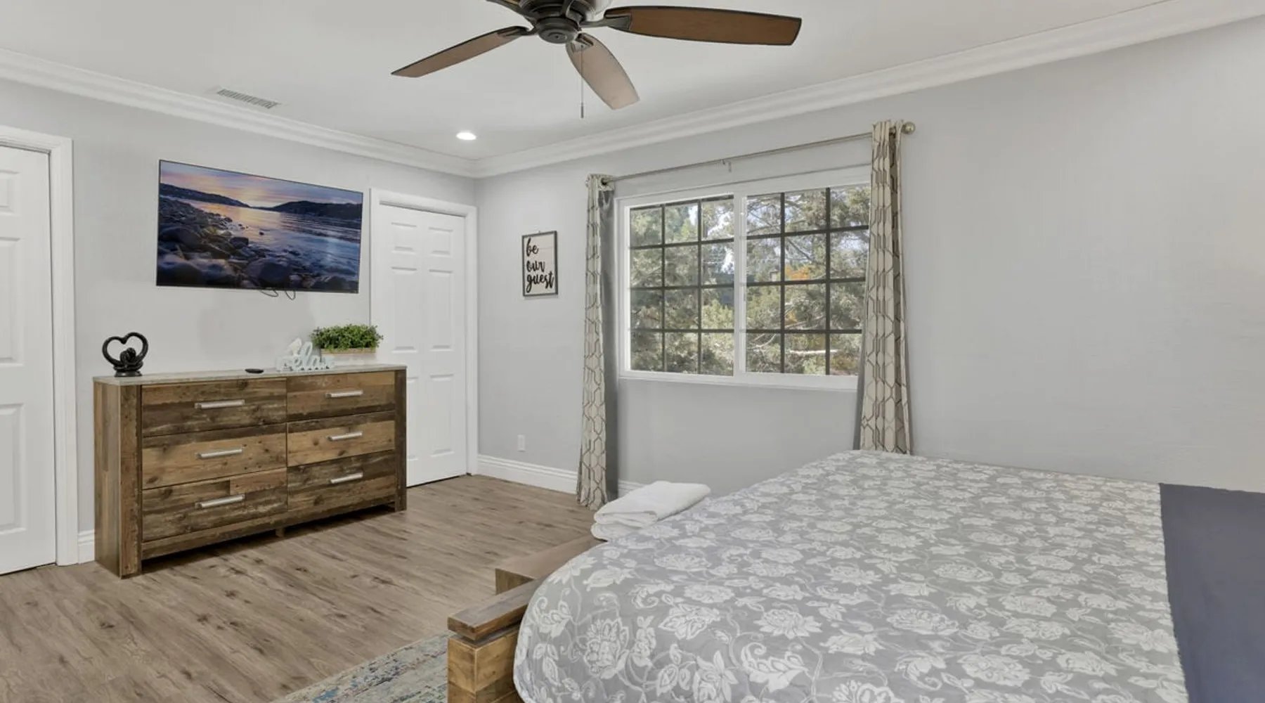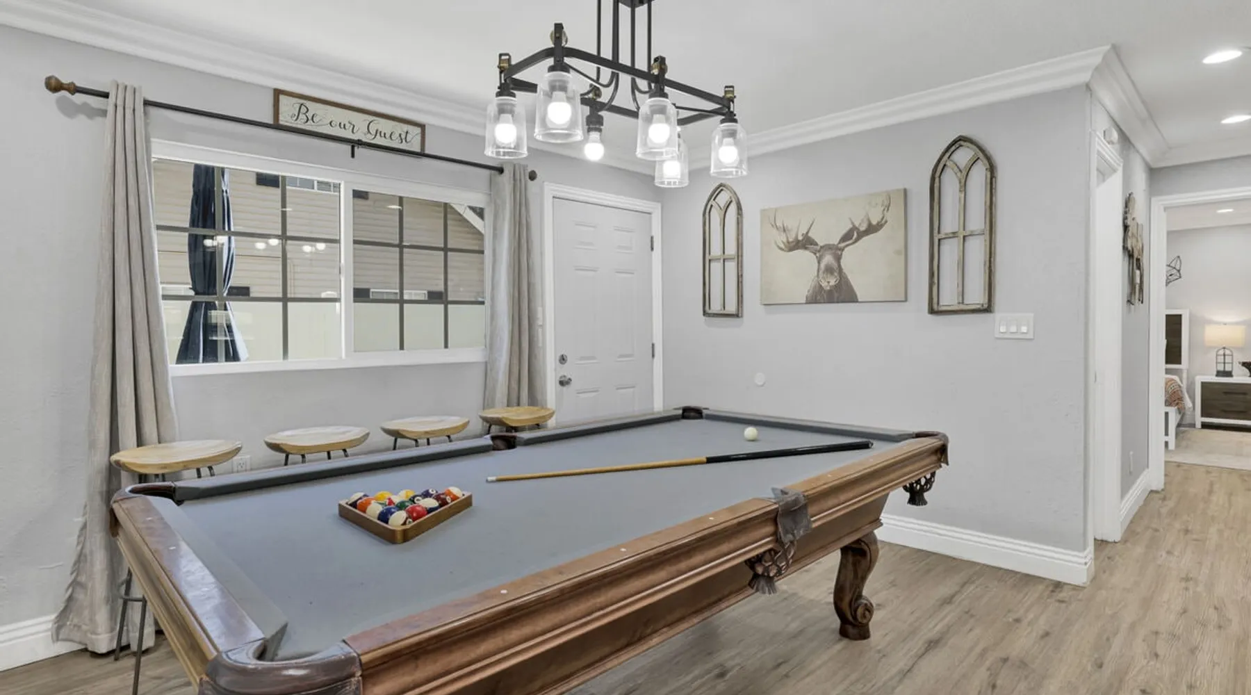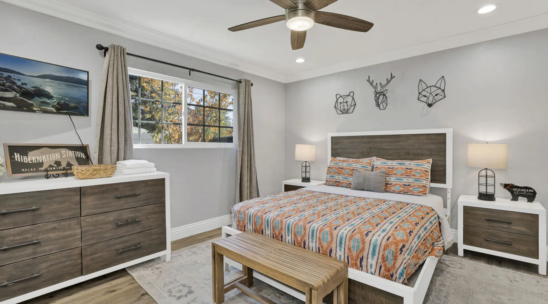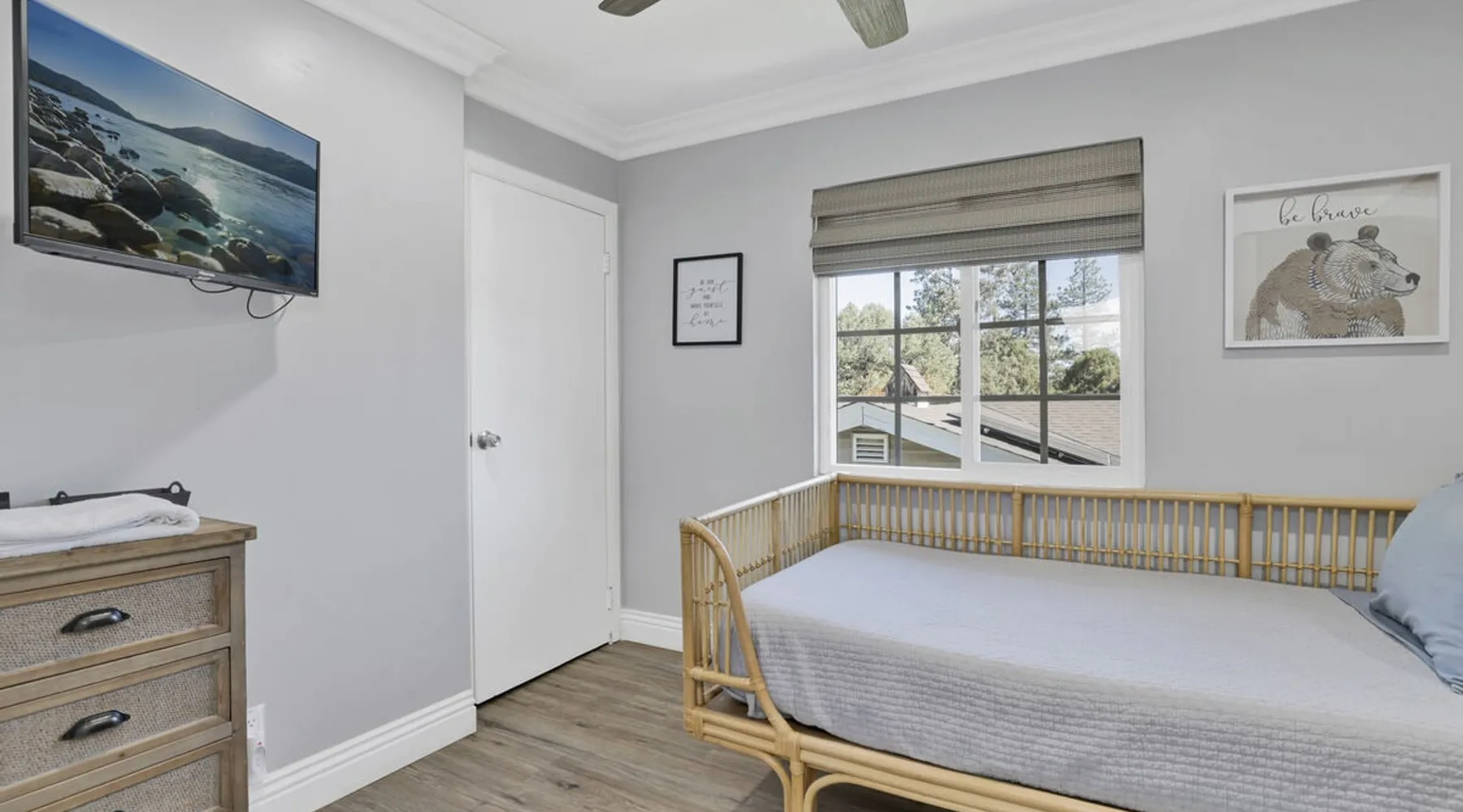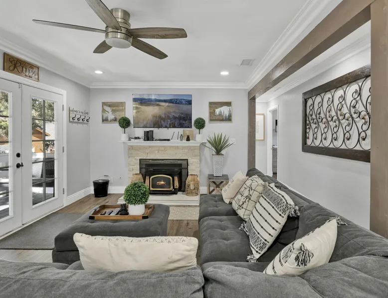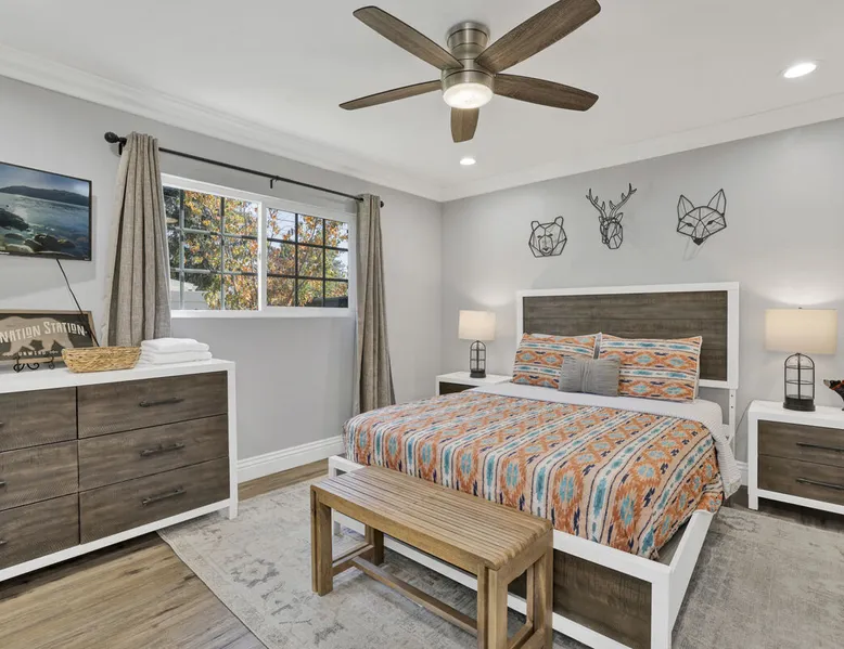 Brewer Escape ~ Modern, newly renovated escape with mountain views - five minutes to town Nestled on a corner lot 5 minutes from town and 7 minutes from the lake shore, this 5BR/3BA home presents mountain views, two alfresco dining options, and an outdoor kitchen. The 2,400 square foot interior offers a renovated kitchen, two living areas, each with a wood-burning stove. The slopes and trails at Snow Summit and Bear Mountain are both 15 minutes from home. The space LIVING AREA Two welcoming living areas each have ample seating, a wood-burning stove, and a smart TV. One of the rooms has a pool table and the other has a sleeper sofa. KITCHEN & DINING Detailed with a patterned backsplash and a full suite of stainless-steel appliances, the pristine kitchen is equipped with everything needed to create your favorite meals. When it's time to dine, the table seats six. OUTDOOR AREA & AMENITIES The charming outdoor space features an outdoor kitchen with a gas grill and sink. Dine alfresco under the covered pergola. In the evening, gather for conversation around the wood-burning firepit. A mountain-view balcony presents another gas grill and an additional table to dine alfresco. Sleeping Arrangements: Bedroom 1: Queen Bed, Streaming TV- Downstairs Entry Level Bedroom 2: Queen Bed, Streaming TV- Downstairs Entry Level Bedroom 3: Queen Bed, Streaming TV- Upstairs 2nd Level Bedroom 4: Twin Day Bed, Streaming TV- Upstairs 2nd Level Bedroom 5: King Bed, Streaming TV, Work Desk, Private Bath Living Room: Full Sleeper Sofa, Streaming TV, Fireplace- Downstairs Entry Level Bathroom Arrangements: Hallway 3/4 Bath (Shower Only)- Downstairs Entry Level Hallway 3/4 Bath (Shower Only)- Upstairs 2nd Level Private Bath w/ Walk-In Shower- Bedroom 5- Upstairs 2nd Level ~Sleeps 11 ~2 Car Driveway + 2 Car Garage Parking ~NO PETS ALLOWED ~2,400 Sqaure Feet ~County Permit #: CESTRP-2021-01426 Guest access Once checked in, guests can enjoy sole access to their private property for the duration of their booked dates. Registration Details CESTRP-2021-01426