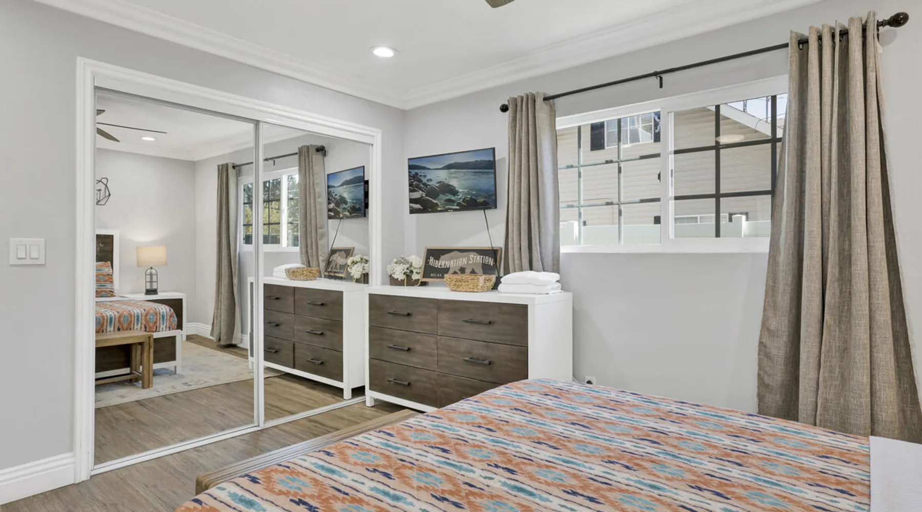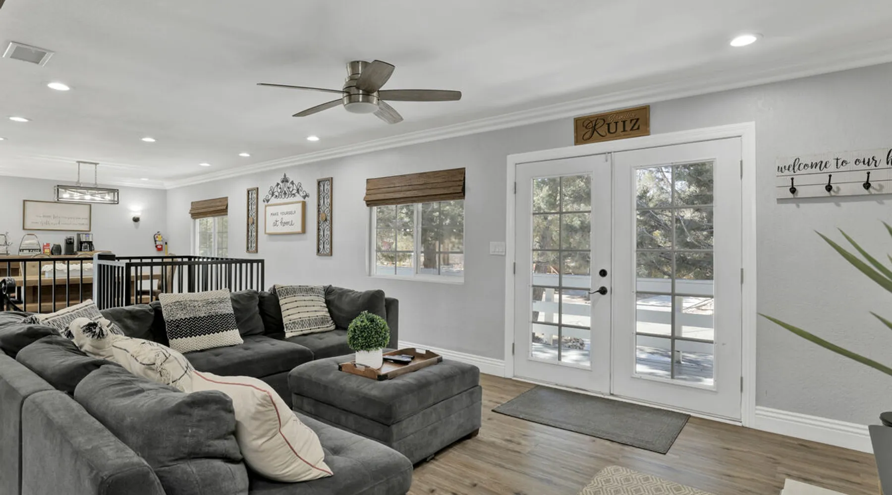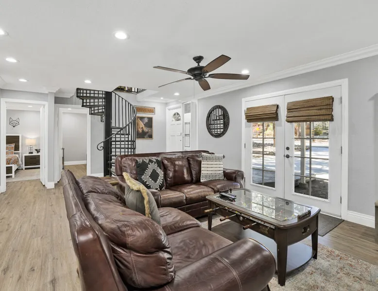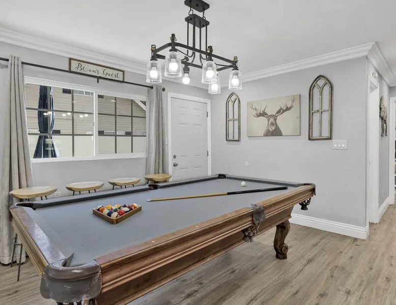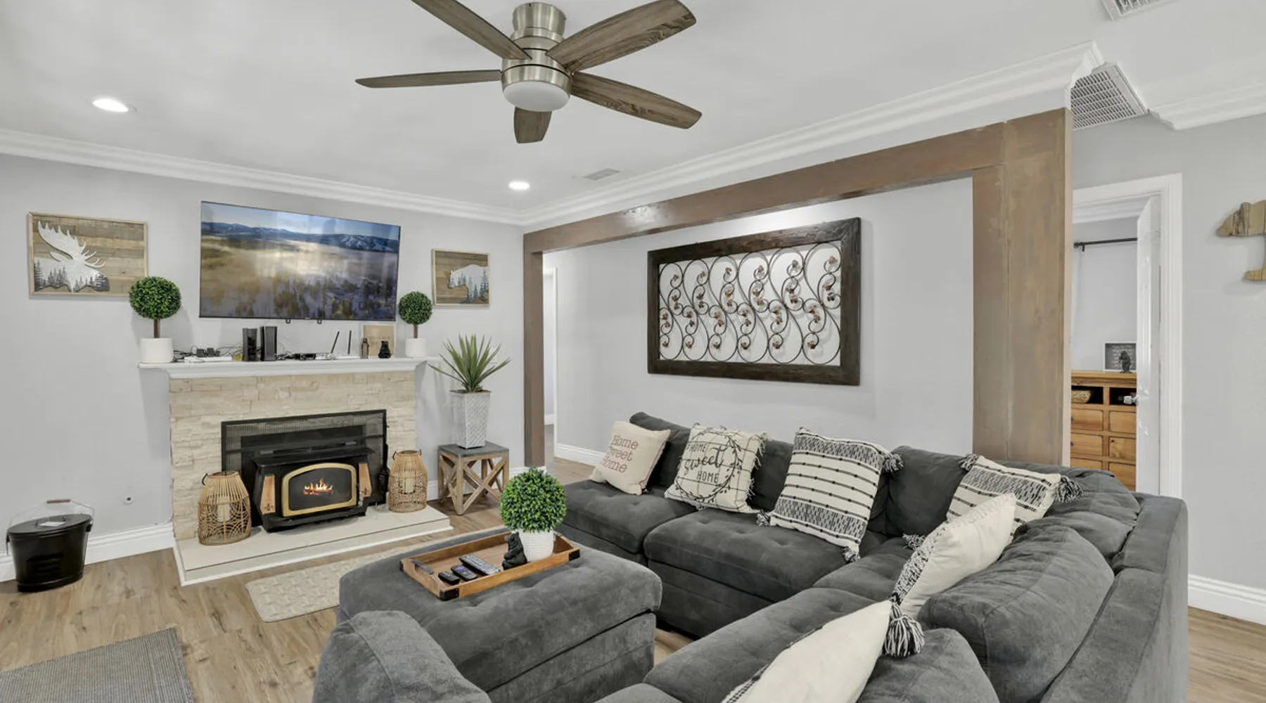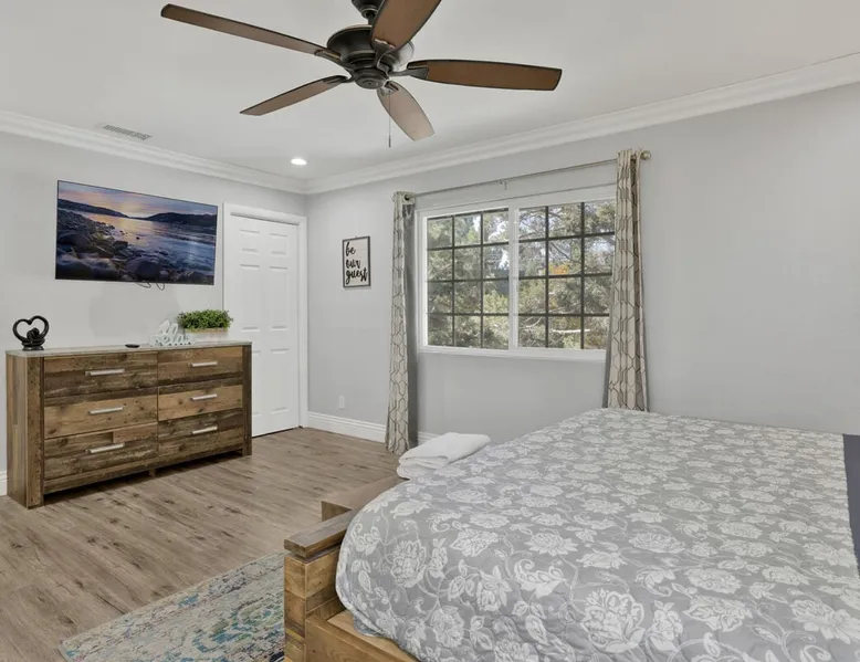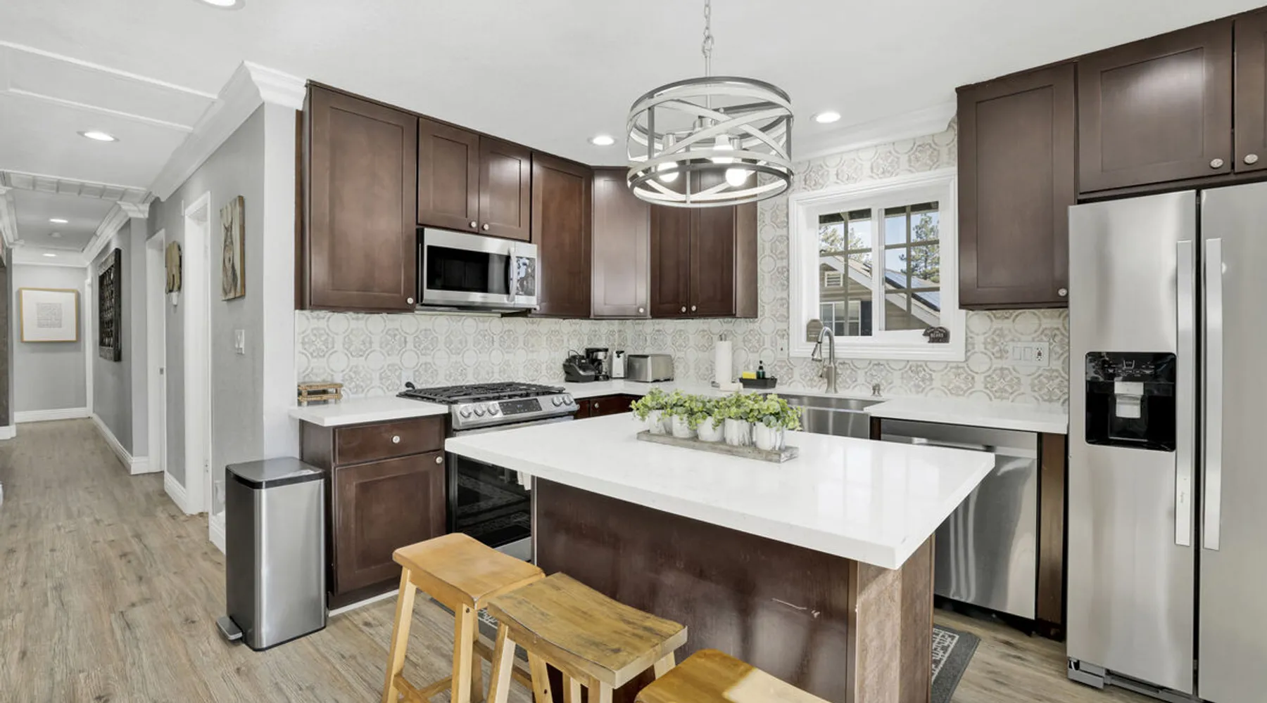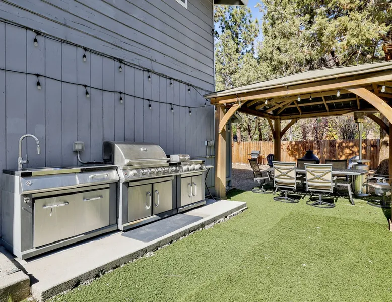 Brewer Escape ~ Modern, newly renovated escape with mountain views - five minutes to town Nestled on a corner lot 5 minutes from town and 7 minutes from the lake shore, this 5BR/3BA home presents mountain views, two alfresco dining options, and an outdoor kitchen. The 2,400 square foot interior offers a renovated kitchen, two living areas, each with a wood-burning stove. The slopes and trails at Snow Summit and Bear Mountain are both 15 minutes from home. The space LIVING AREA Two welcoming living areas each have ample seating, a wood-burning stove, and a smart TV. One of the rooms has a pool table and the other has a sleeper sofa. KITCHEN & DINING Detailed with a patterned backsplash and a full suite of stainless-steel appliances, the pristine kitchen is equipped with everything needed to create your favorite meals. When it's time to dine, the table seats six. OUTDOOR AREA & AMENITIES The charming outdoor space features an outdoor kitchen with a gas grill and sink. Dine alfresco under the covered pergola. In the evening, gather for conversation around the wood-burning firepit. A mountain-view balcony presents another gas grill and an additional table to dine alfresco. Sleeping Arrangements: Bedroom 1: Queen Bed, Streaming TV- Downstairs Entry Level Bedroom 2: Queen Bed, Streaming TV- Downstairs Entry Level Bedroom 3: Queen Bed, Streaming TV- Upstairs 2nd Level Bedroom 4: Twin Day Bed, Streaming TV- Upstairs 2nd Level Bedroom 5: King Bed, Streaming TV, Work Desk, Private Bath Living Room: Full Sleeper Sofa, Streaming TV, Fireplace- Downstairs Entry Level Bathroom Arrangements: Hallway 3/4 Bath (Shower Only)- Downstairs Entry Level Hallway 3/4 Bath (Shower Only)- Upstairs 2nd Level Private Bath w/ Walk-In Shower- Bedroom 5- Upstairs 2nd Level ~Sleeps 11 ~2 Car Driveway + 2 Car Garage Parking ~NO PETS ALLOWED ~2,400 Sqaure Feet ~County Permit #: CESTRP-2021-01426 Guest access Once checked in, guests can enjoy sole access to their private property for the duration of their booked dates. Registration Details CESTRP-2021-01426