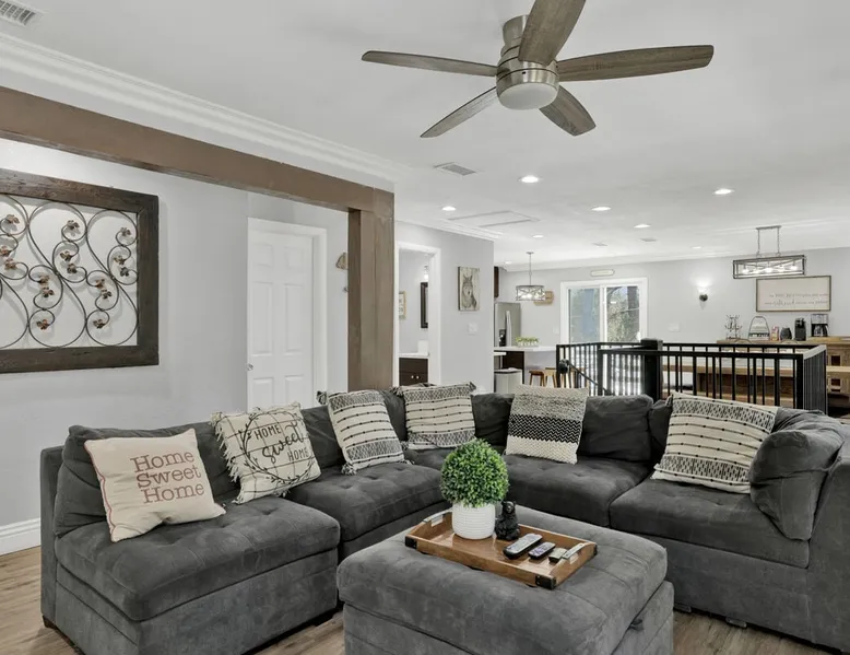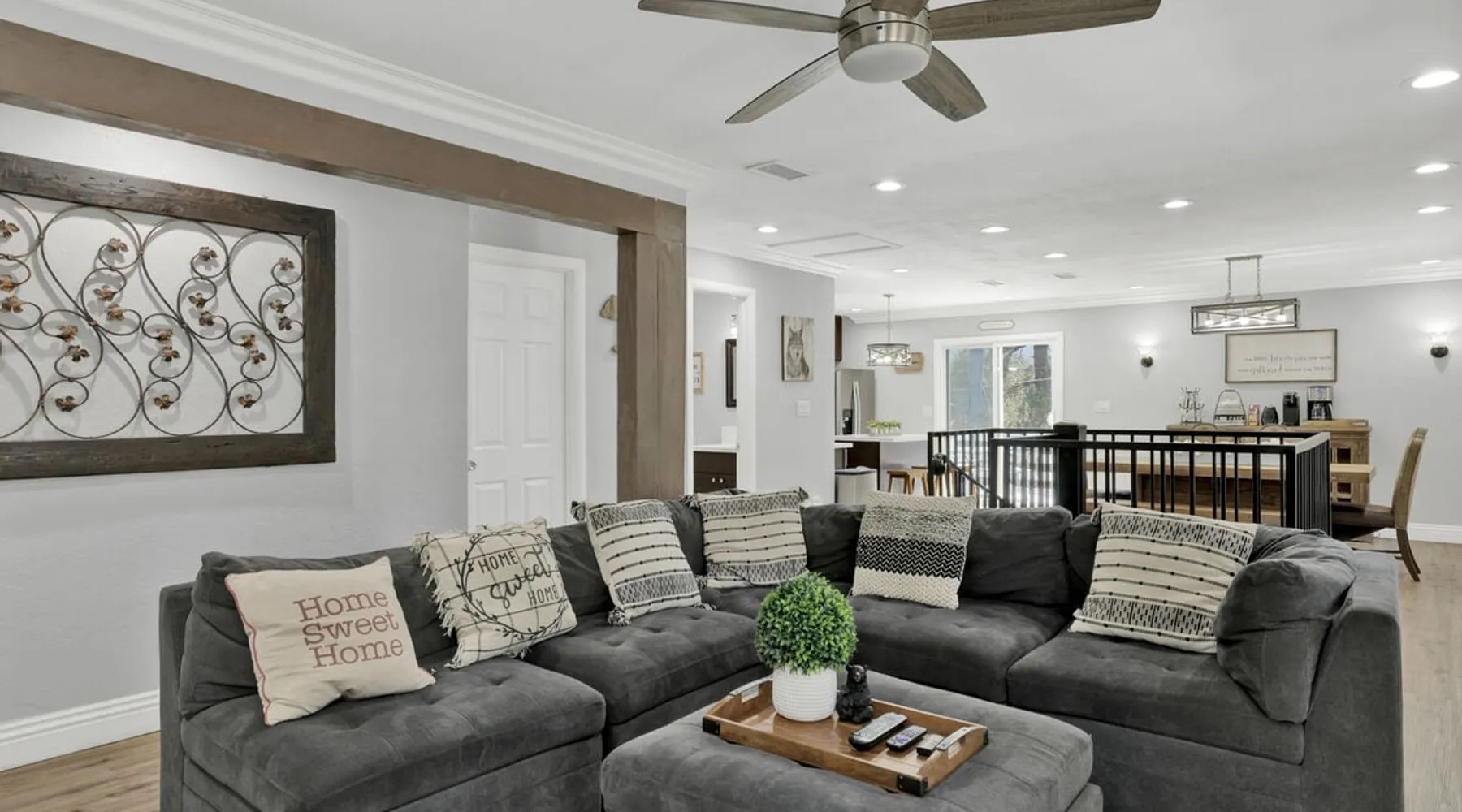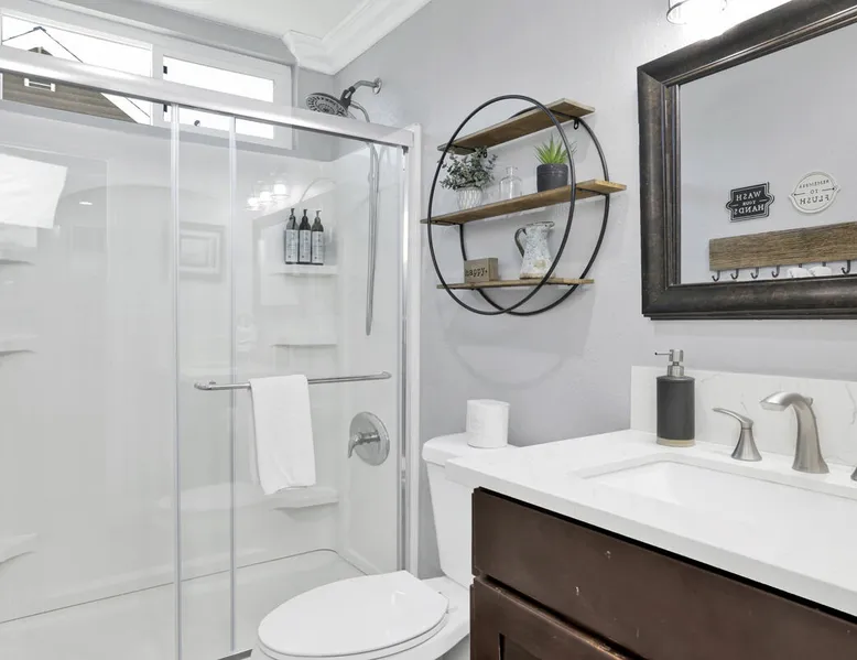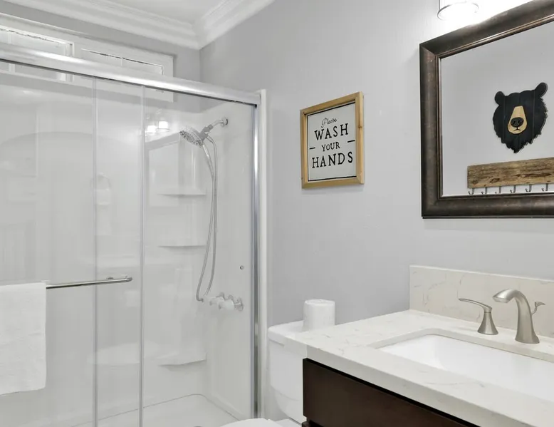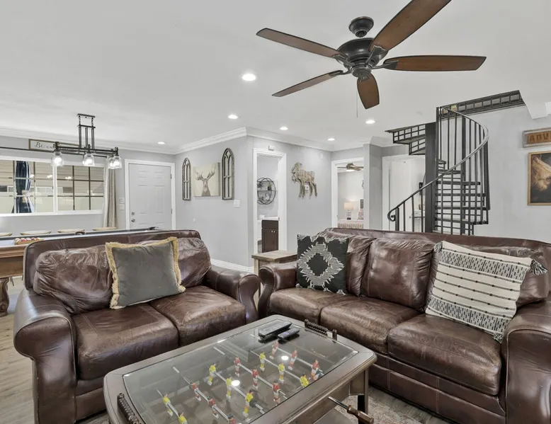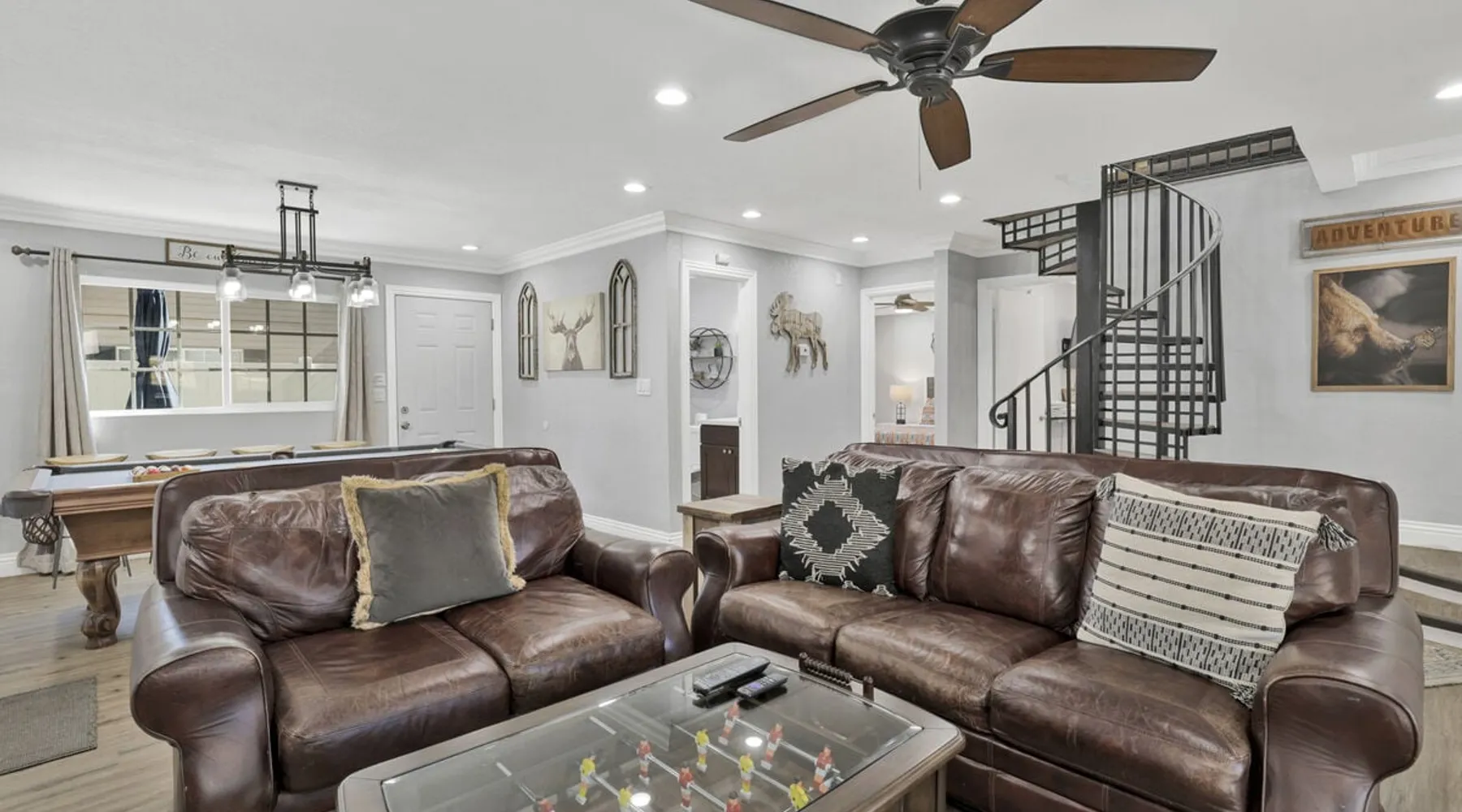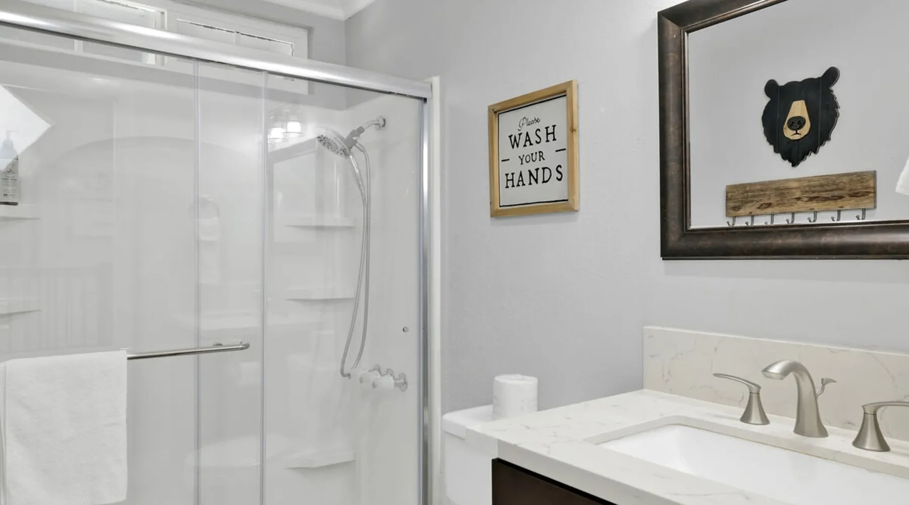 Brewer Escape ~ Modern, newly renovated escape with mountain views - five minutes to town Nestled on a corner lot 5 minutes from town and 7 minutes from the lake shore, this 5BR/3BA home presents mountain views, two alfresco dining options, and an outdoor kitchen. The 2,400 square foot interior offers a renovated kitchen, two living areas, each with a wood-burning stove. The slopes and trails at Snow Summit and Bear Mountain are both 15 minutes from home. The space LIVING AREA Two welcoming living areas each have ample seating, a wood-burning stove, and a smart TV. One of the rooms has a pool table and the other has a sleeper sofa. KITCHEN & DINING Detailed with a patterned backsplash and a full suite of stainless-steel appliances, the pristine kitchen is equipped with everything needed to create your favorite meals. When it's time to dine, the table seats six. OUTDOOR AREA & AMENITIES The charming outdoor space features an outdoor kitchen with a gas grill and sink. Dine alfresco under the covered pergola. In the evening, gather for conversation around the wood-burning firepit. A mountain-view balcony presents another gas grill and an additional table to dine alfresco. Sleeping Arrangements: Bedroom 1: Queen Bed, Streaming TV- Downstairs Entry Level Bedroom 2: Queen Bed, Streaming TV- Downstairs Entry Level Bedroom 3: Queen Bed, Streaming TV- Upstairs 2nd Level Bedroom 4: Twin Day Bed, Streaming TV- Upstairs 2nd Level Bedroom 5: King Bed, Streaming TV, Work Desk, Private Bath Living Room: Full Sleeper Sofa, Streaming TV, Fireplace- Downstairs Entry Level Bathroom Arrangements: Hallway 3/4 Bath (Shower Only)- Downstairs Entry Level Hallway 3/4 Bath (Shower Only)- Upstairs 2nd Level Private Bath w/ Walk-In Shower- Bedroom 5- Upstairs 2nd Level ~Sleeps 11 ~2 Car Driveway + 2 Car Garage Parking ~NO PETS ALLOWED ~2,400 Sqaure Feet ~County Permit #: CESTRP-2021-01426 Guest access Once checked in, guests can enjoy sole access to their private property for the duration of their booked dates. Registration Details CESTRP-2021-01426