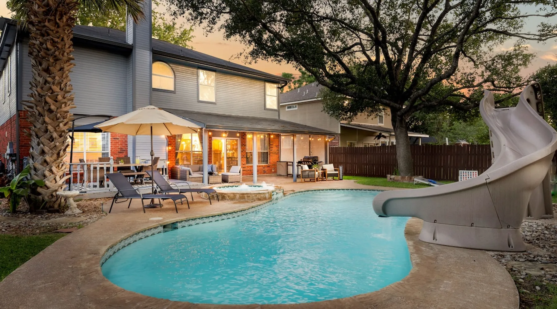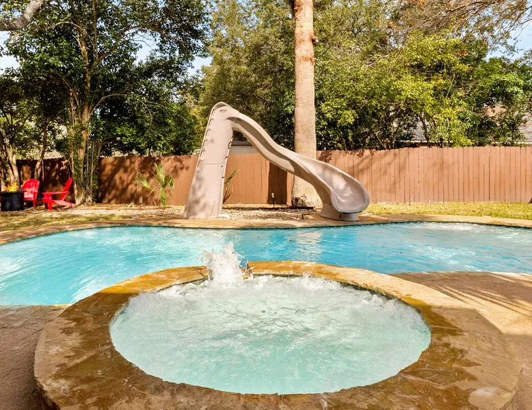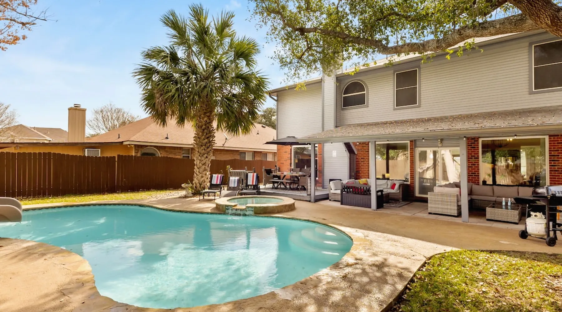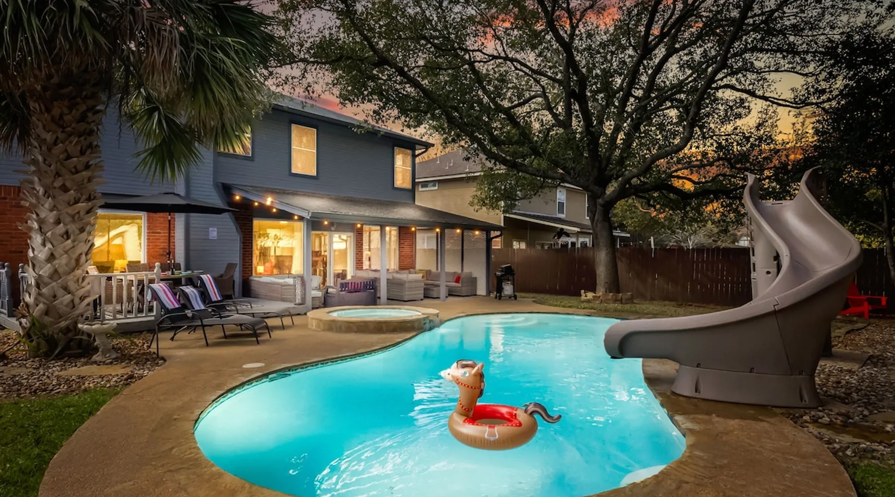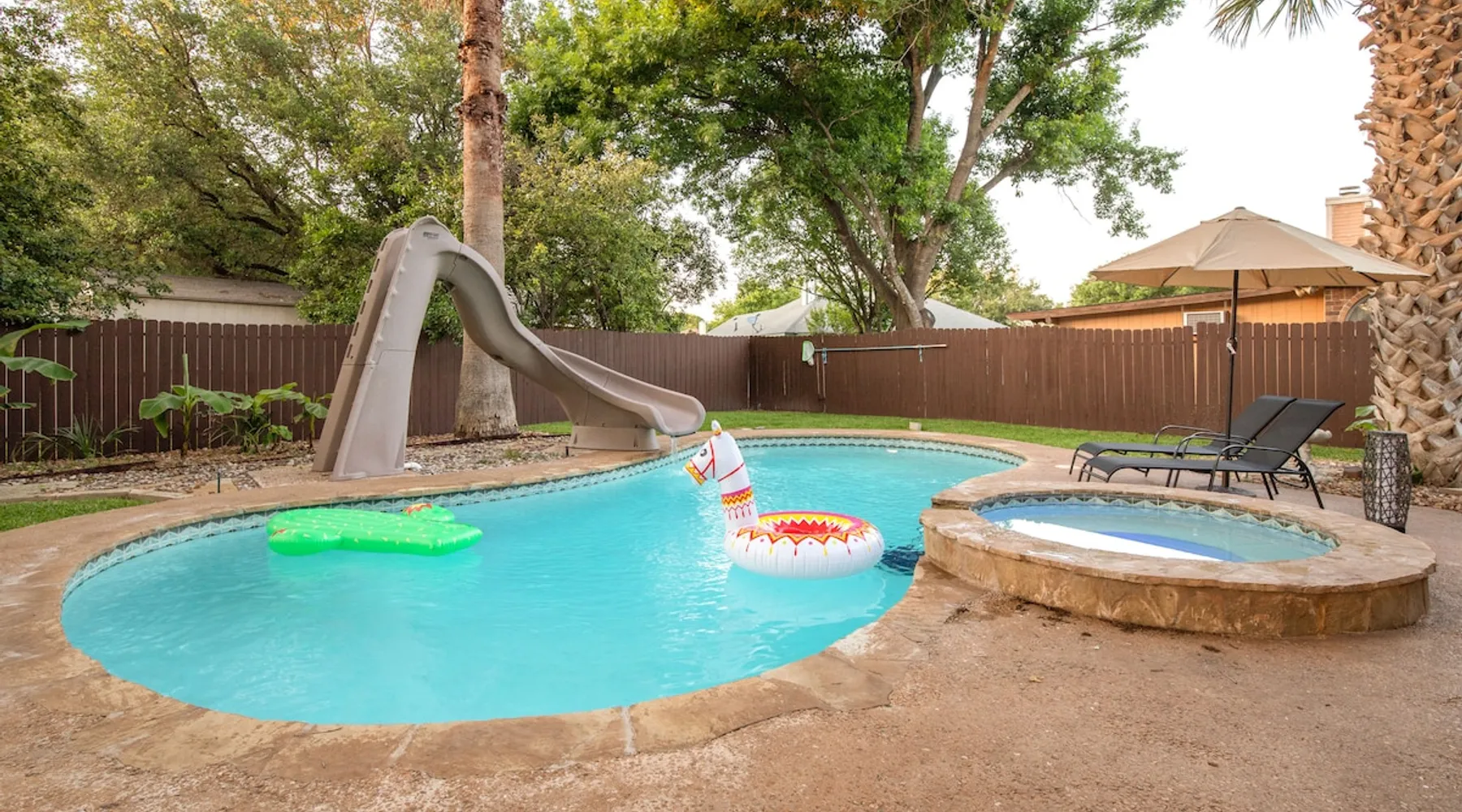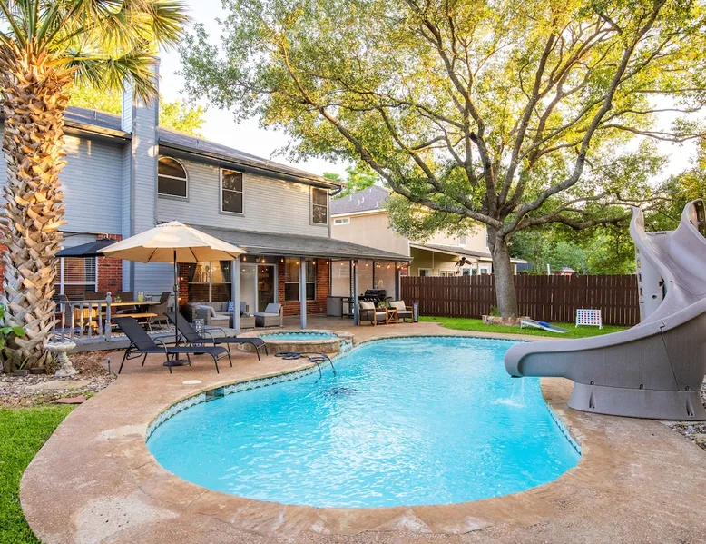 * Luxurious 4-bedroom home in gated community, sleeps 12 * Heated pool with slide, in-ground hot tub, an outdoor oasis *Brand-new Game room with Fussball, Air Hockey, Basketball * Spacious indoor living with 75" Smart TV, XBOX S and family board games * Fully LOADED kitchen for all your culinary needs * Family-friendly amenities: high chairs, pack-and-plays * Pet Friendly...bring your furry friends! * Sleep like a baby on mattresses praised by our guests! * Close to top San Antonio attractions The space Indoor Living Spaces Gather up the family and make yourself cozy in our expansive living room, complete with a wrap-around sectional sofa lined with plush chaise cushioning. Stream your favorite shows or excite the gamer in the group with the Xbox 5, all on a 75” Smart TV! For some friendly competition, there's an abundance of board games provided; Not into streaming? Challenge each other with classic board games or let the kids take over upstairs for their very own movie night. Cooking & Dining Are you a master of the kitchen? This fully-equipped kitchen has everything for your cooking adventures. Generously stocked with a spice rack, baking sheets, pots & pans galore – plus necessary tools like blenders, crockpots and a toaster – there won't be an ingredient or technique left unperfected in any dish. Afterwards, savor special meals in our spacious dining room seating up 8 lucky guests while overlooking your backyard oasis! Additional seating for 7 between the kitchen table and island. Or dine alfresco and soak in your outdoor paradise, complete with dining space and lounge area. Sleeping Accommodations and Bathrooms The home sleeps up to 12 people, making it an ideal space for family reunions, bachelor or bachelorette parties, wedding parties or traveling with friends! All of the bedrooms are outfitted with incredible mattresses that we regularly get compliments on. They're so good we bought one for our own house! The perfect abode for family and friends, the home is equipped with 4 spacious bedrooms perfectly situated on one level. Resting easy won't be a problem as 3 of these rooms offer luxurious king-sized beds while the 4th reveals its laid back vibes through an inviting twin over full bunk bed frameset that also includes a cozy trundle underneath. All of the bedrooms are equipped with 55in Smart TV's so you can wind down with a movie or your favorite show. Outdoor Living Spaces Get ready for luxury in your own backyard. Relax under the covered patio with a grill sizzling, dinner on the outdoor dining table, and cozy lounge chairs perfect for an evening spent star-gazing. And that's before you dive into the heated pool featuring its very own thrilling slide! An in-ground hot tub awaits to melt away any cares or worries of every day life - all just steps from your back door! **ABOUT OUR HEATED POOL** Our pool and spa can be heated year round, however depending on the outside temperatures during your stay, it could be more difficult to heat during January and February's coldest temperatures. Thank you for understanding. While the pool won’t reach hot-tub temperatures, the pool is consistently maintained at 86º degrees November to April/May. Our pool team comes to take care of the home on Mondays and Thursdays. On the coldest days of the year, our pool may not reach the set temperature due to the extreme cold. Most heat pumps do not function as well when outside temperature is less than 55 degrees. We’re happy to provide this added comfort at no extra charge, so you can focus on enjoying your stay. Please note that pool temperatures will vary slightly based on weather conditions. *** ✅ This property follows local compliance standards and uses a simple, secure platform called Happy Guest to streamline the check-in process. You don’t need to download an app or create an account — it’s just a quick and secure website that gives you everything you need for a smooth arrival. You’ll also get access to your personalized guest portal, where you can find all the info about the home and some of our favorite local spots. The portal also offers optional upgrades to help you customize your stay: • Extra Guest – $50 • Late Checkout – $50 • Stock the Fridge – $100 ★☆ Book Today & Let Us Take Care Of You In San Antonio! ☆★ Guest access Guests will have access to the entire home, completely private to themselves. Initial access is provided using a wifi digital keypad. Guests will be provided a unique code and can check in as late as they may need, providing the ultimate convenience. Easy Check-In Process🏡 It’s just like when you check in at a hotel and give your ID to the front desk, except our front desk is online! It's super easy to complete on your phone! We use a web-based system called Happy Guest, and you’ll receive a personalized rental agreement to sign in order to receive your arrival instructions. It’s simple: finish these steps, and you’re all set to enjoy your stay! Note: arrival info won’t be sent without completing these steps, and refunds aren’t possible if skipped. Your personalized guidebook will give you all the info about the home, our favorite local spots, automatic early check-in notifications, and sometimes even late checkout! You can even share it with friends and family! Got questions? Just message us anytime! Other things to note This listing has an additional Agreement that applies to all guests staying at the Premises. As part of the booking process, Guest(s) may be required to complete a guest verification process prior to receiving any check-in information pertaining to the Premises. Guest(s) will be required to review and sign an Agreement with the Host. This is a pet friendly property. Mailing packages to the Premises is not permitted. We use Minut noise monitoring devices in our homes. These are decibel monitoring systems that we use to keep in accordance with local noise regulations. Registration Details STR-23-13
