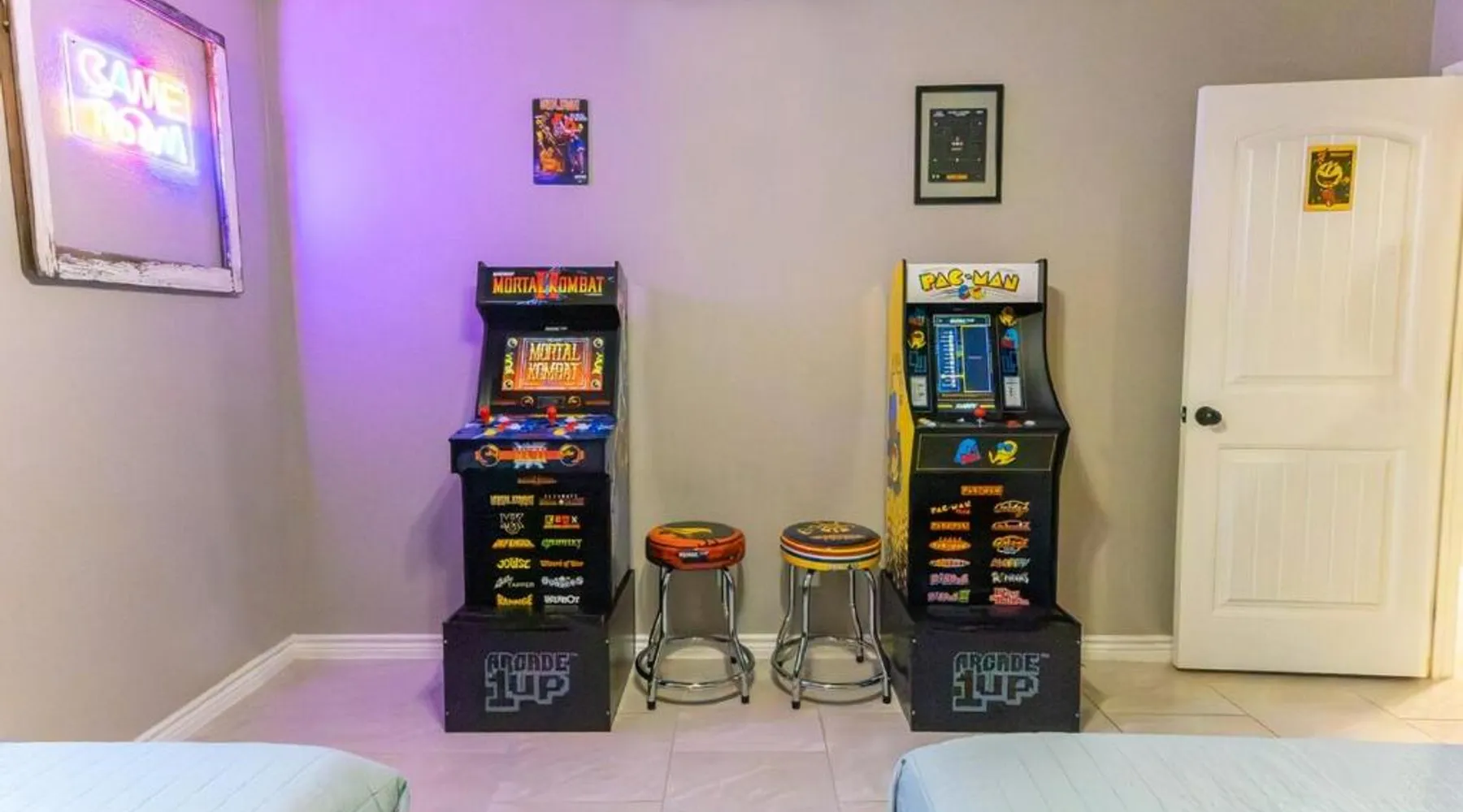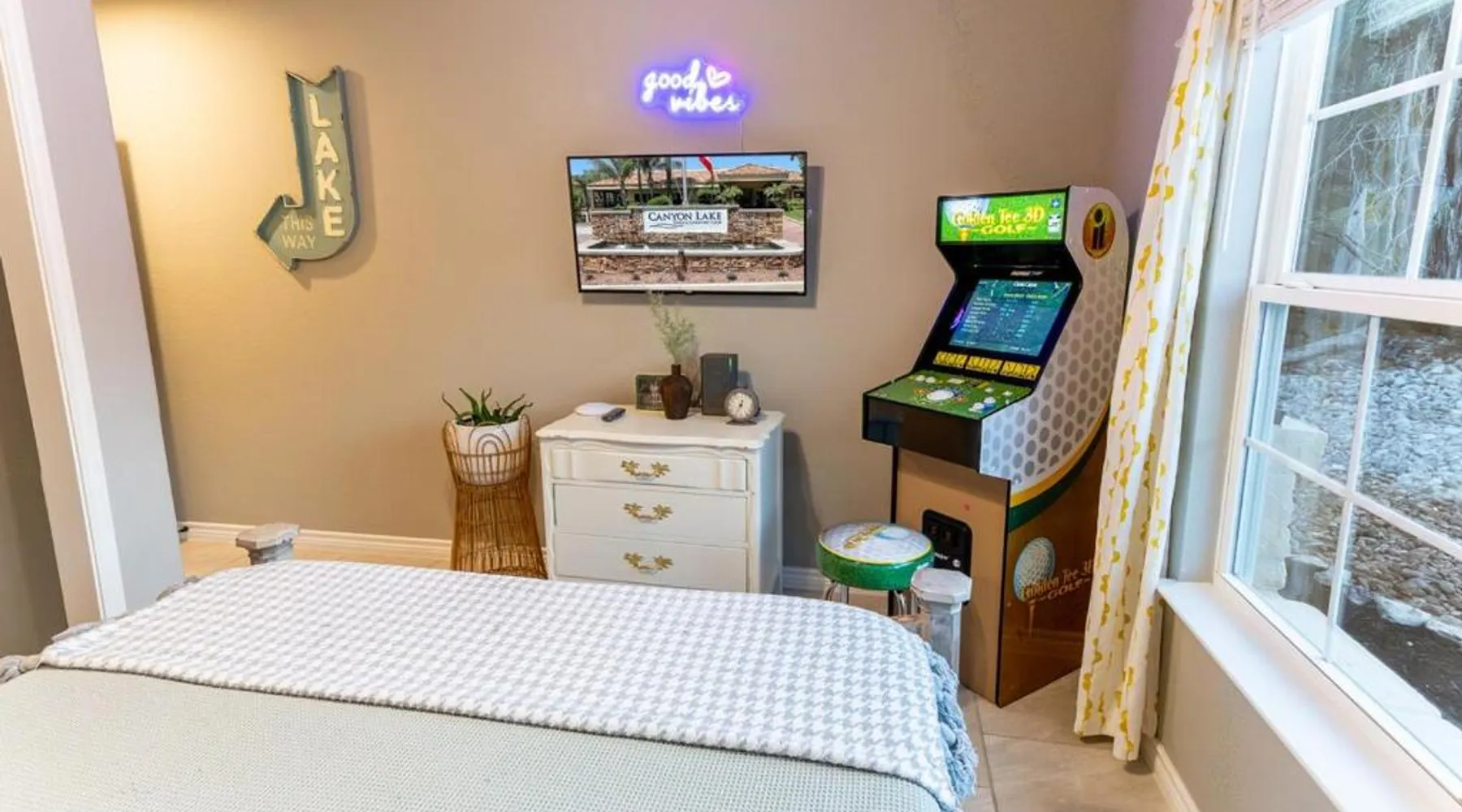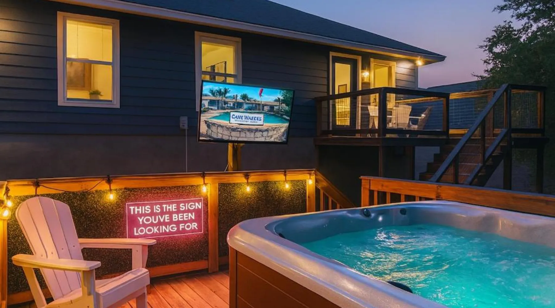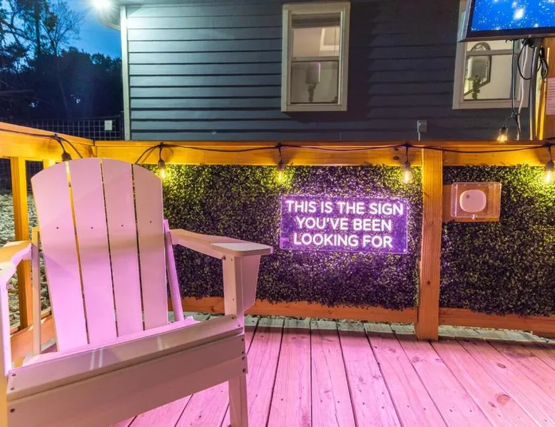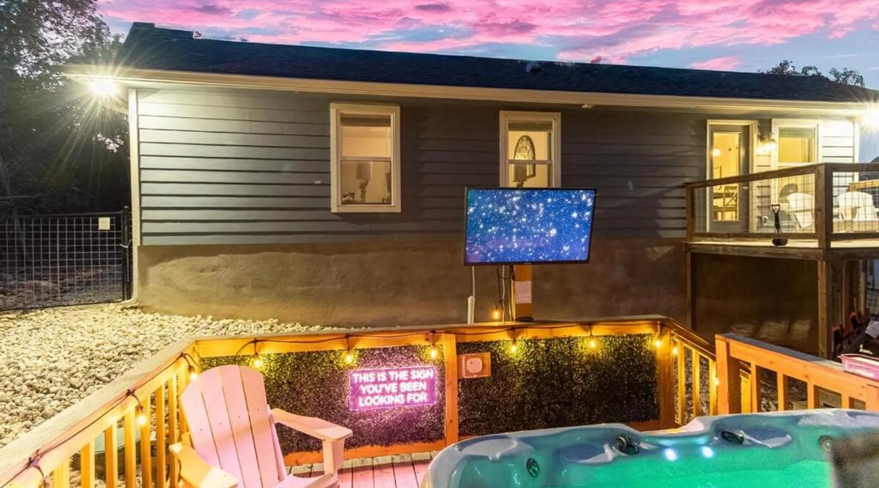 Neon Vibes Outdoor TV Hot Tub Arcade Room
