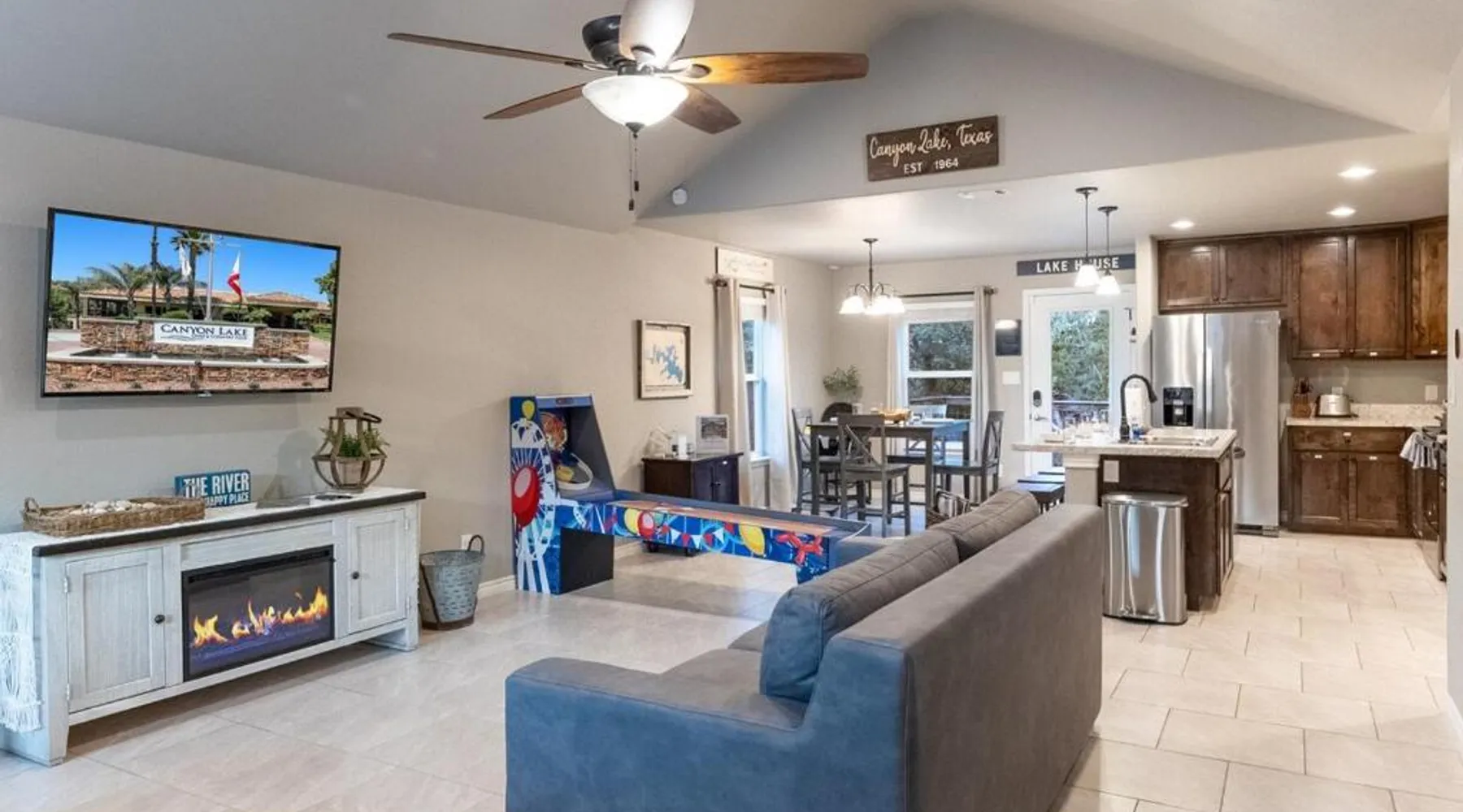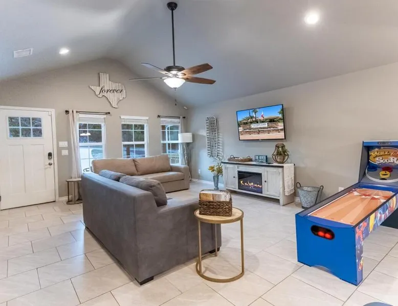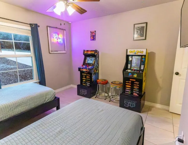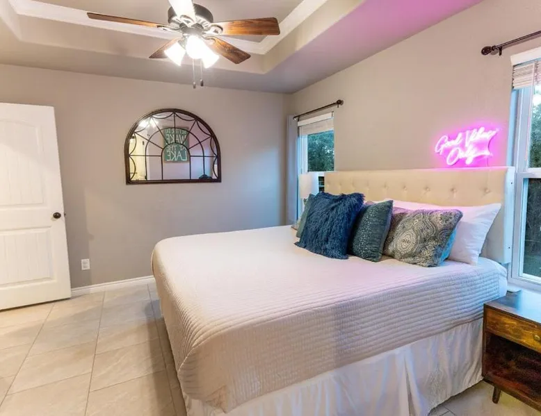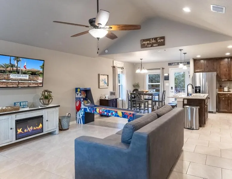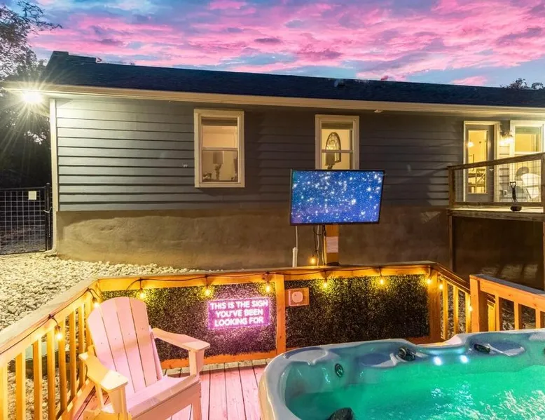Spacious Holiday Home: Neon Vibes Outdoor TV Hot Tub Arcade Room in Canyon Lake offers a spacious layout with one bedroom and two bathrooms. The property features a garden and free WiFi, ensuring a comfortable stay. Modern Amenities: Guests can enjoy air-conditioning, a hot tub, washing machine, fully equipped kitchen, and TV. Additional facilities include an electric vehicle charging station and free on-site private parking. Convenient Location: Located 30 mi from San Antonio International Airport, the holiday home is 6.2 mi from Canyon Lake, 16 mi from Comal River, and 17 mi from Schlitterbahn Waterpark Resort. Nearby attractions include Comal Park and Texas State University. This holiday home's special feature is the hot tub. The holiday home's kitchen is available for cooking and storing food. The spacious holiday home provides air conditioning, a washing machine, heating and a flat-screen TV. The unit offers 2 beds.
