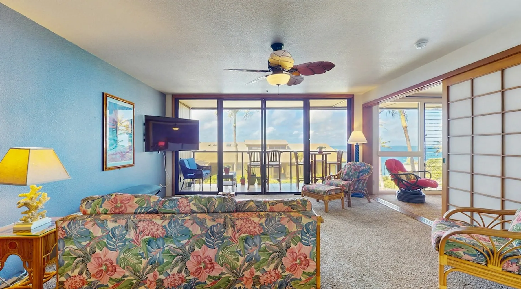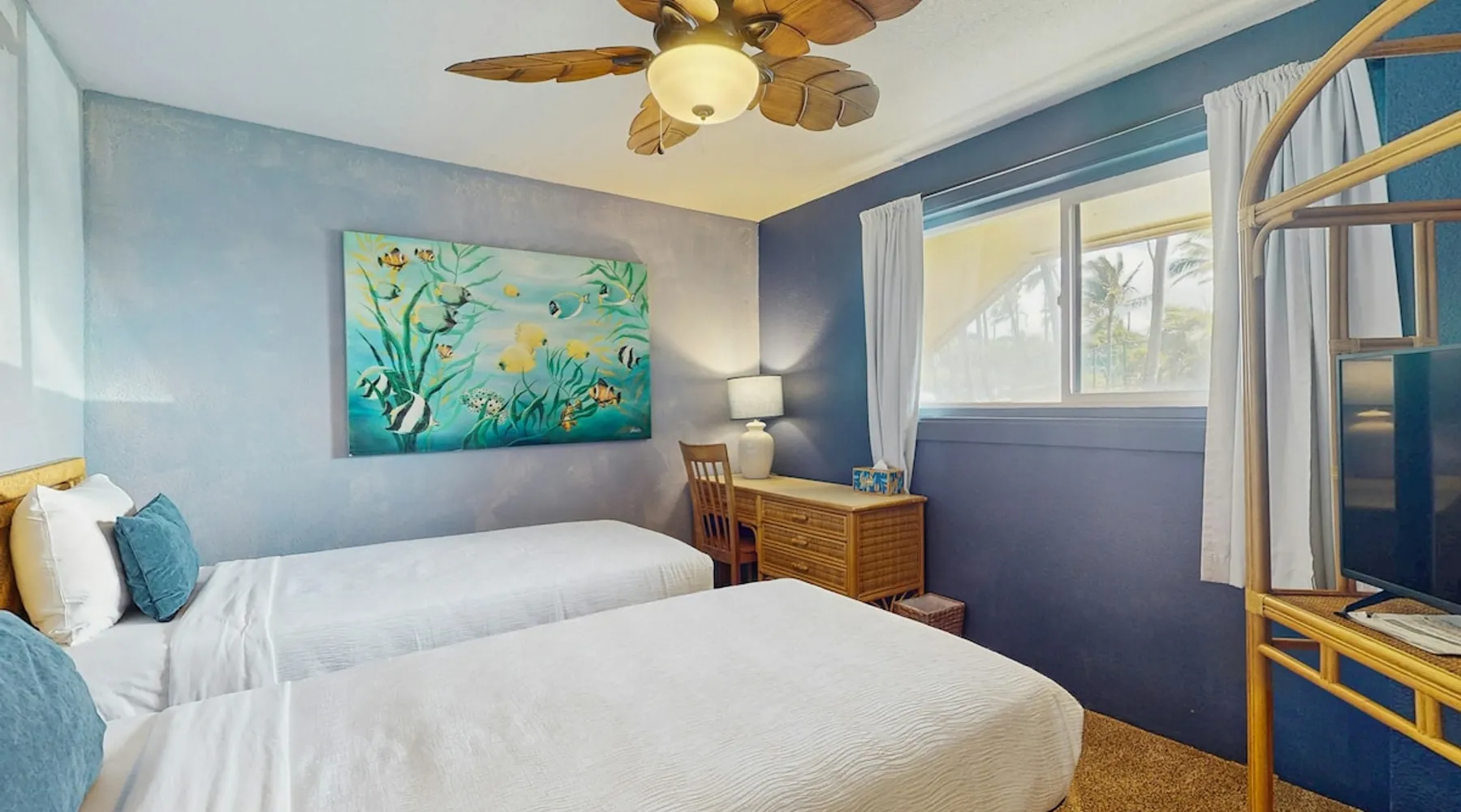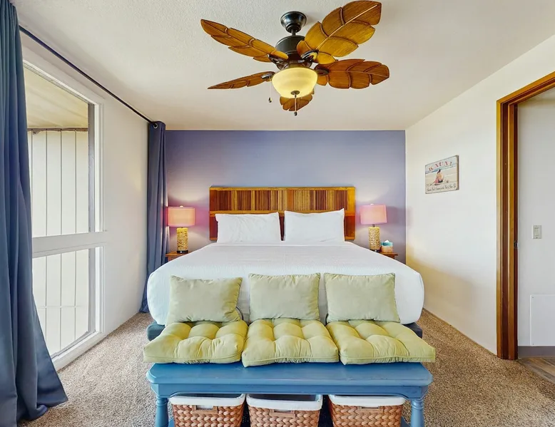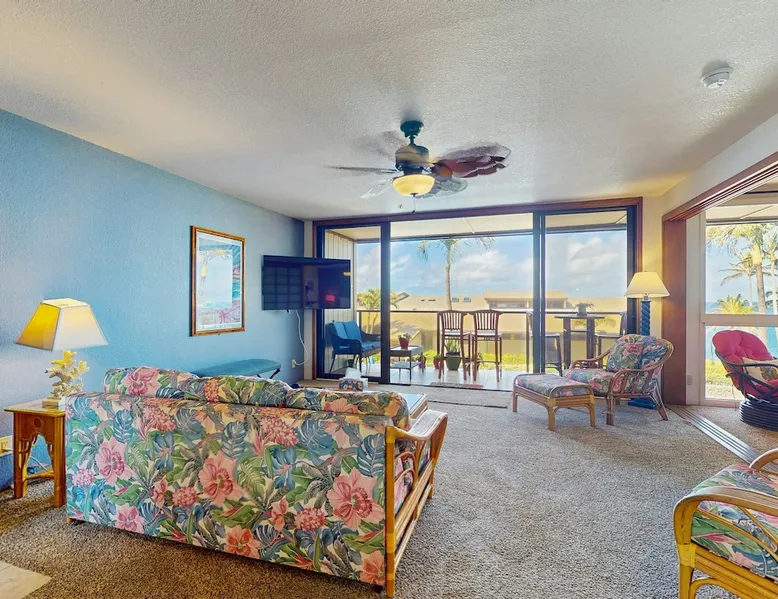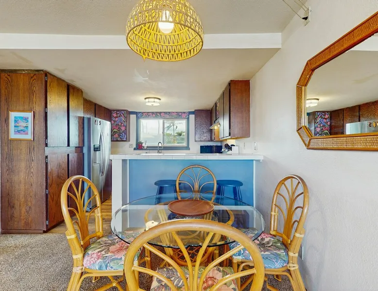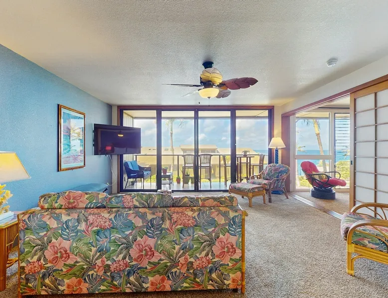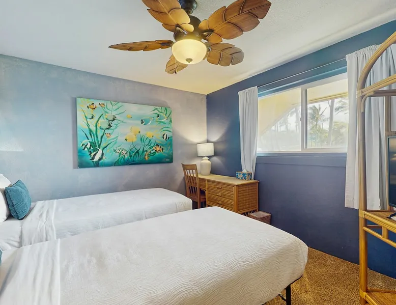 The space Making Makahuena Memories in 2204 Welcome to Makahuena at Poipu Unit #2204, a gorgeous second-floor condo in Koloa, Hawai‘i, where panoramic ocean views and tropical breezes set the tone for an unforgettable escape. This thoughtfully designed retreat features a seamless flow between the living room, dining area, and fully equipped kitchen, all offering front-row views of the sparkling Pacific. Adding to the condo’s unique charm is the touch of beloved local artist Marionette Taboniar, whose creative spirit played a key role in the recent refresh of the space. Her signature style, inspired by old Hawai‘i, is featured on hand-painted kitchen cabinets, a custom window valance, and framed artwork throughout the unit. Her vision and artistry helped shape the soul of this home—and it shows in every thoughtful detail. Ceiling fans in every room keep the island air moving, adding to the relaxed comfort of this breezy home. The primary suite is a true sanctuary, with a king bed positioned to take full advantage of the ocean view from the moment you wake. Two swivel chairs and a small table offer the perfect nook for your morning coffee or a front-row seat to a fiery Kaua‘i sunset. Floor-to-ceiling curtains were specially chosen to fold completely back, ensuring that nothing stands between you and the sea. You’ll also enjoy a private en suite bathroom with a tub and vanity, along with a spacious walk-in closet for all your island attire. The second bedroom is ideal for kids, friends, or additional guests, with two twin beds that can be converted into a king. A hallway bathroom with a tub adds convenience and privacy for everyone. Plan to enjoy exceptional snorkeling at the award-winning Poipu Beach within walking distance where you can see sea turtles, monk seals, and other native wildlife. Whether you're sipping a cool drink or settling in for a movie night with the flat-screen TV, the soothing ambiance of the sea is never far away. Slide open the lanai doors and step outside to feel the trade winds on your skin and watch the waves roll in. This is island living at its best. When you're not relaxing at home, take a dip in the community pool, play a round of golf nearby, or explore the beaches, shops, and restaurants just moments away. Unwind, adventure, or simply take in the beauty of Kaua‘i, with Makahuena #2204 as your perfect home base. Book your stay today and discover why guests return year after year! Please note: This rental unit is located on floor 2. This building is not equipped with an elevator; stair access only. No dog(s) are welcome in this home. No other animals are allowed without specific Vacasa approval. This rental is located on floor 2. Parking notes: There is free parking available for 2 vehicles. Damage waiver: The total cost of your reservation for this Property includes a damage waiver fee which covers you for up to $3,000 of accidental damage to the Property or its contents (such as furniture, fixtures, and appliances) as long as you report the incident to the host prior to checking out. More information can be found from the "Additional rules" on the checkout page. Due to local laws or HOA requirements, guests must be at least 21 years of age to book. Guests under 21 must be accompanied by a parent or legal guardian for the duration of the reservation. Registration Details 280200030030, TA-078-461-0816-01