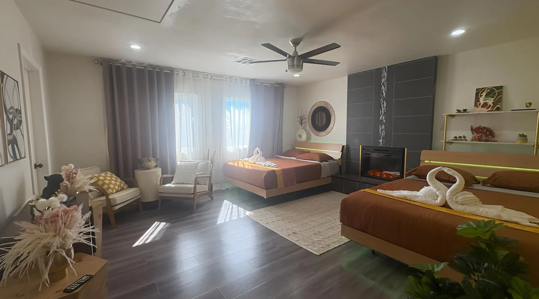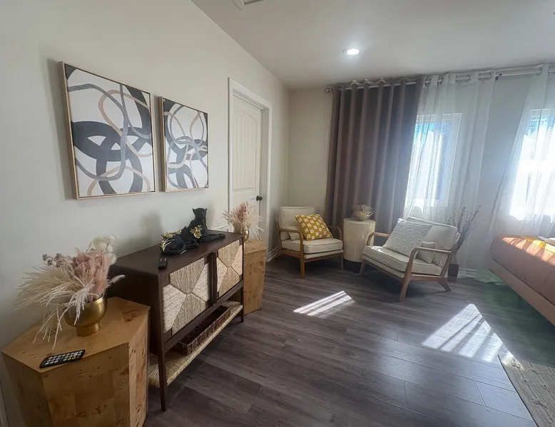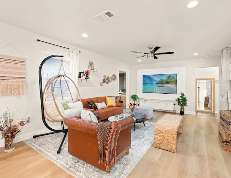Welcome to Swing Homes — a newly renovated 3BR Boho-modern retreat on a quiet 8,000 sq ft lot. Enjoy a King adjustable bed, stylish decor, and a relaxing porch swing. Perfect for families, couples, or business travelers. Just minutes from Ontario Mills, Victoria Gardens, Mt. Baldy & Disneyland. Clean, bright, and comfortable — your home away from home in Rancho Cucamonga. We look forward to hosting you! The space 📍 Prime Location · Near Top Attractions Just a short drive to major shopping, nature, and entertainment destinations: ⛳ 1 mile – Red Hill Park & Golf Club 🏢 4 miles – Ontario Convention Center 🛍️ 5 miles – Victoria Gardens Outdoor Shopping Center 🛍️ 6 miles – Ontario Mills Premium Outlets (CA’s Largest Indoor Mall) 🏔️ 12 miles – Mount Baldy & San Antonio Mountains 🎠 35 miles – Disneyland 🎿 42 miles – Mountain High Resort & Lake Arrowhead 🎬 46 miles – Universal Studios Hollywood ✈️ 50 miles – LAX & Pacific Beaches 🐻 59 miles – Big Bear Lake Ski Resort 🛏 Rooms & Features • Master Suite 🛏️ King-size adjustable electric bed for elevated comfort, soft lighting, spacious closet • Bedroom 2 & 3 🎨 Individually themed designs with cozy full or queen beds — perfect for couples, friends, or kids • Chef’s Kitchen 🍽️ Fully equipped with stainless steel appliances, center island, coffee maker, pots, pans & tableware — ready for cooking & dining • Living Room 📺 75” Smart TV + 🎵 premium sound system — ideal for movie nights or binge-watching your favorite shows • Front Porch 🌅 Enjoy peaceful mornings or sunsets on the cozy swing chair • Backyard 🌿 Open and private — a great place to relax, read, or simply breathe ⸻ 🛠️ Amenities Highlights • Central A/C & heating • High-speed Wi-Fi + streaming access • In-unit washer & dryer • Free driveway parking (fits 2–3 cars) • Keyless self check-in 🔒 Note: For privacy and safety reasons, the listing address is approximate. Exact location will be shared after booking confirmation. Other things to note 📝 House Rules & Guest Notes 🐾 No Pets As much as we love furry friends, this home has a strict no-pets policy to accommodate guests with allergies. Thanks for understanding! 🐜 Ant Awareness This home is located in a natural SoCal environment. You may occasionally spot an ant. To help prevent them, please seal your food and wipe up any spills. We appreciate your help in keeping the space clean and pleasant! 🚭 Smoke-Free Property This is a non-smoking home, including e-cigarettes and vapes. Please respect this rule to maintain a clean and healthy environment for all guests.