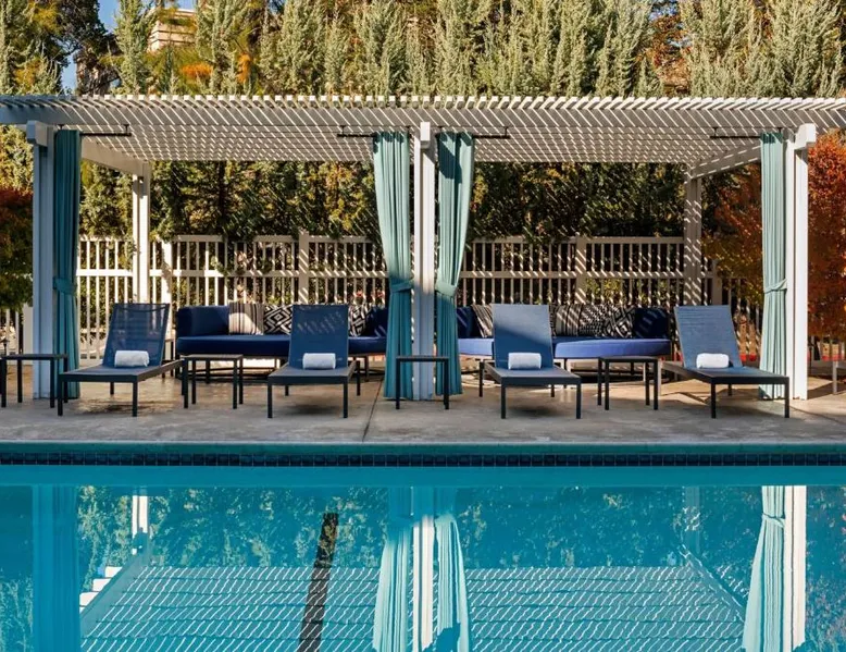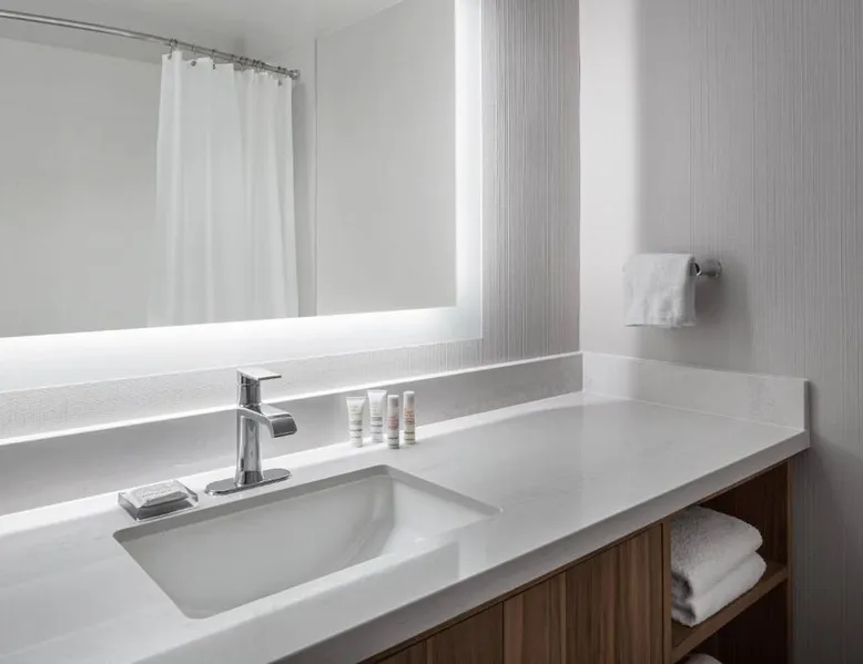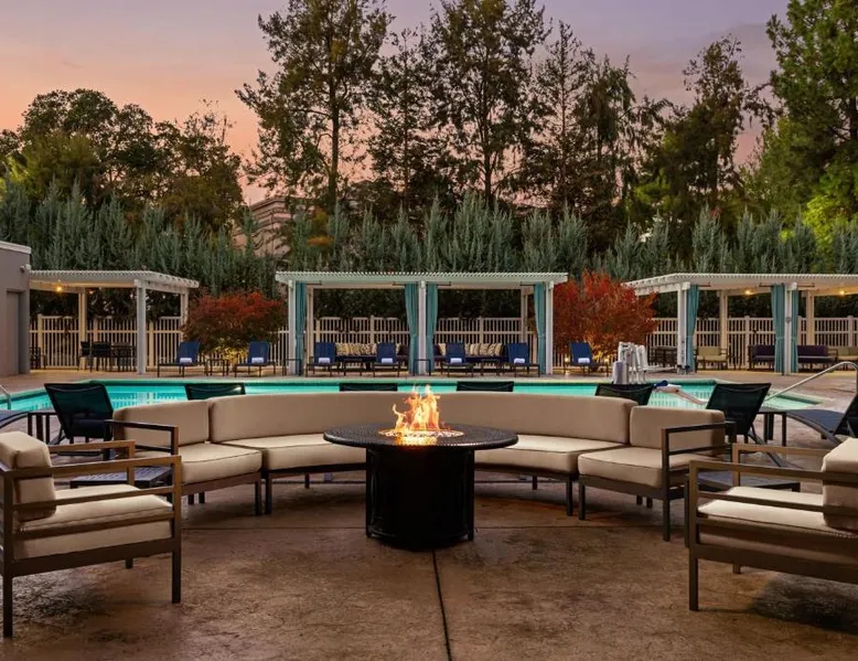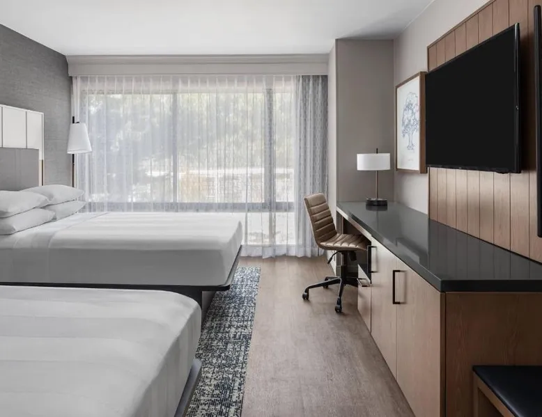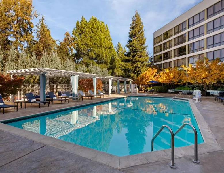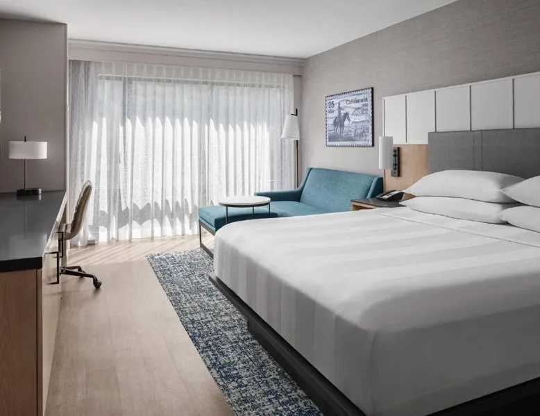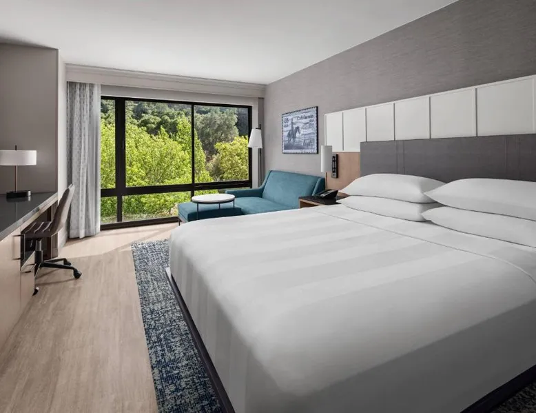 The Pleasanton Marriott is located in Silicon Valley, one mile from the Dublin Heritage Museum. It has a heated outdoor pool, and offers spacious rooms with LCD TV and cable channels. Marriott rooms include a well-lit work desk, and ergonomic chair. Rooms come equipped with Nintendo video games, a coffee maker, and ironing facilities. The Lone Oak Kitchen & Bar is an on-site restaurant that serves regional northern California cuisine. A local restaurant dinner delivery service is also available. Guests of the Pleasanton Marriott can relax in the whirlpool, or visit the fitness center that includes free weights and cardiovascular equipment. The Dublin Ranch Golf Course is located 5 miles from the hotel. The unit offers 2 beds.