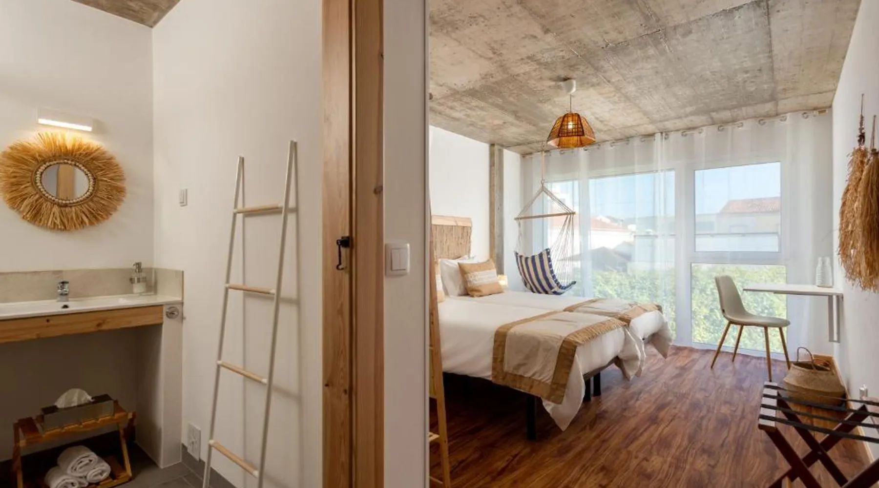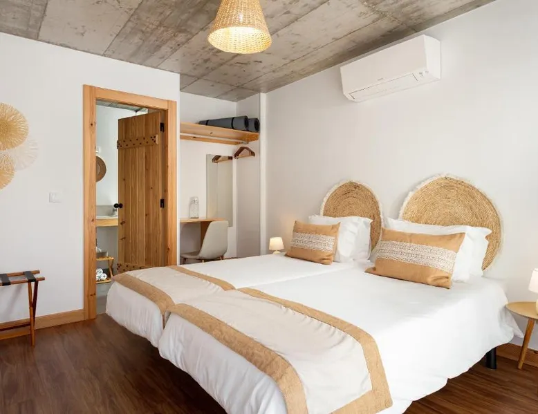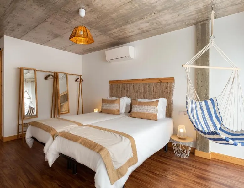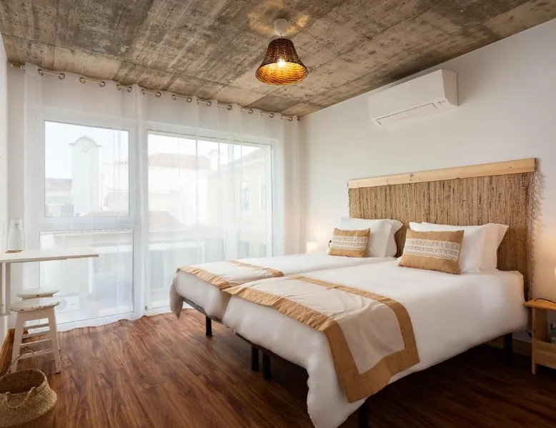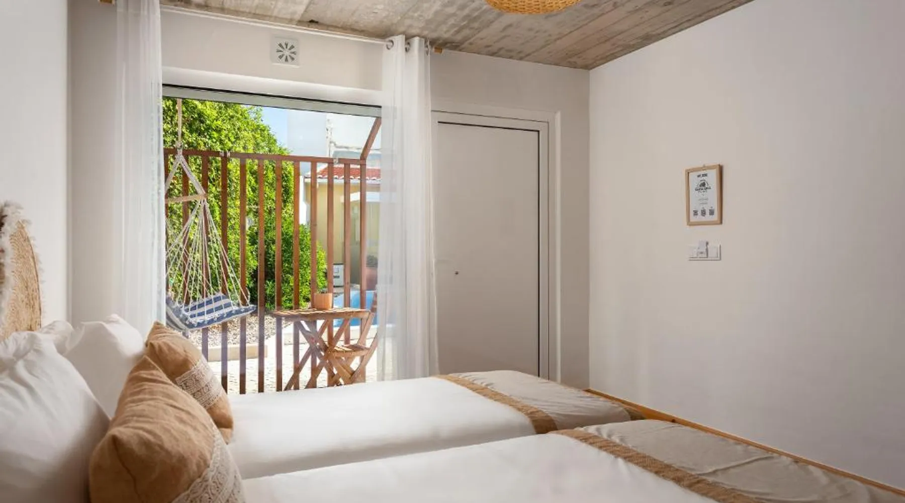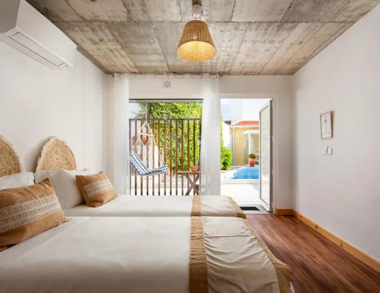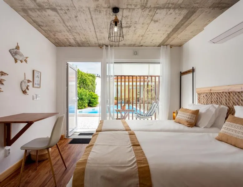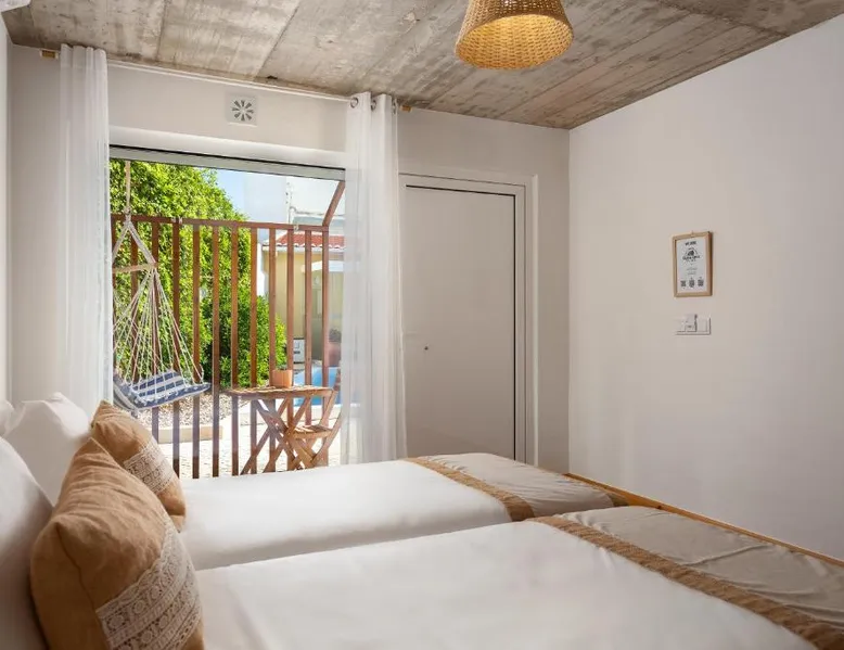 Beachfront Location: Santa Cruz Dove House - PADI Center in Santa Cruz offers direct beachfront access and stunning views. Guests can relax by the swimming pool or sun terrace, while the lush garden provides a tranquil setting. Comfortable Accommodations: Rooms feature air-conditioning, private bathrooms, and modern amenities such as free WiFi, flat-screen TVs, and soundproofing. Additional facilities include a coffee shop, outdoor seating area, and family rooms. Dining and Activities: A continental breakfast is served daily, and yoga classes and walking tours are available. The property also provides a tour desk and luggage storage, ensuring a comfortable and enjoyable stay. Nearby Attractions: Praia de Santa Helena is a 2-minute walk away, while Baleal lies 21 mi from the resort. Other points of interest include Obidos Castle (27 mi) and Sintra National Palace (31 mi). Humberto Delgado Airport is 35 mi distant. The twin room provides air conditioning, a private entrance, a terrace with pool views as well as a private bathroom featuring a walk-in shower. The unit offers 2 beds.