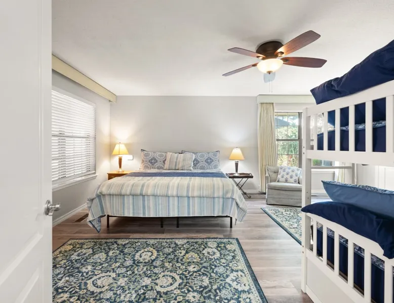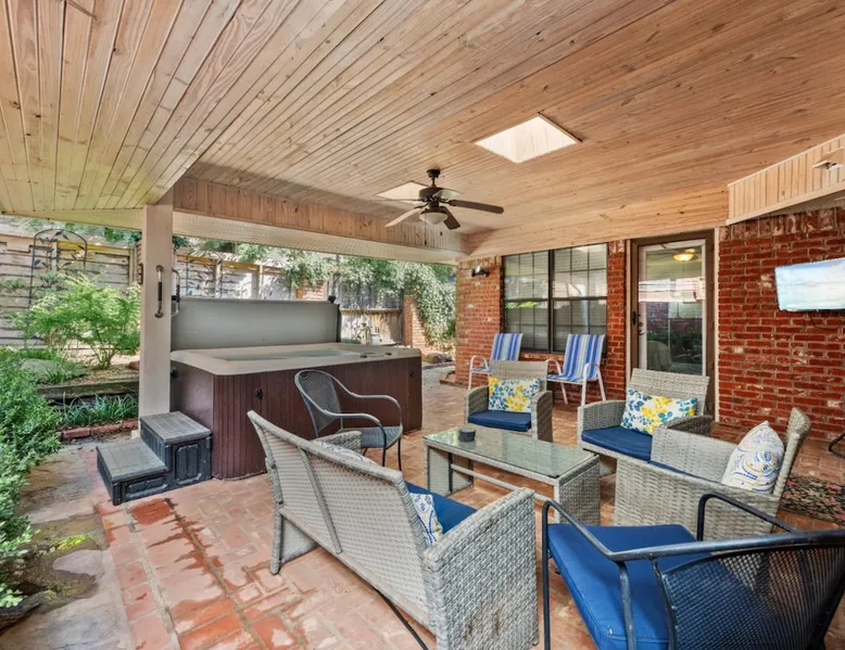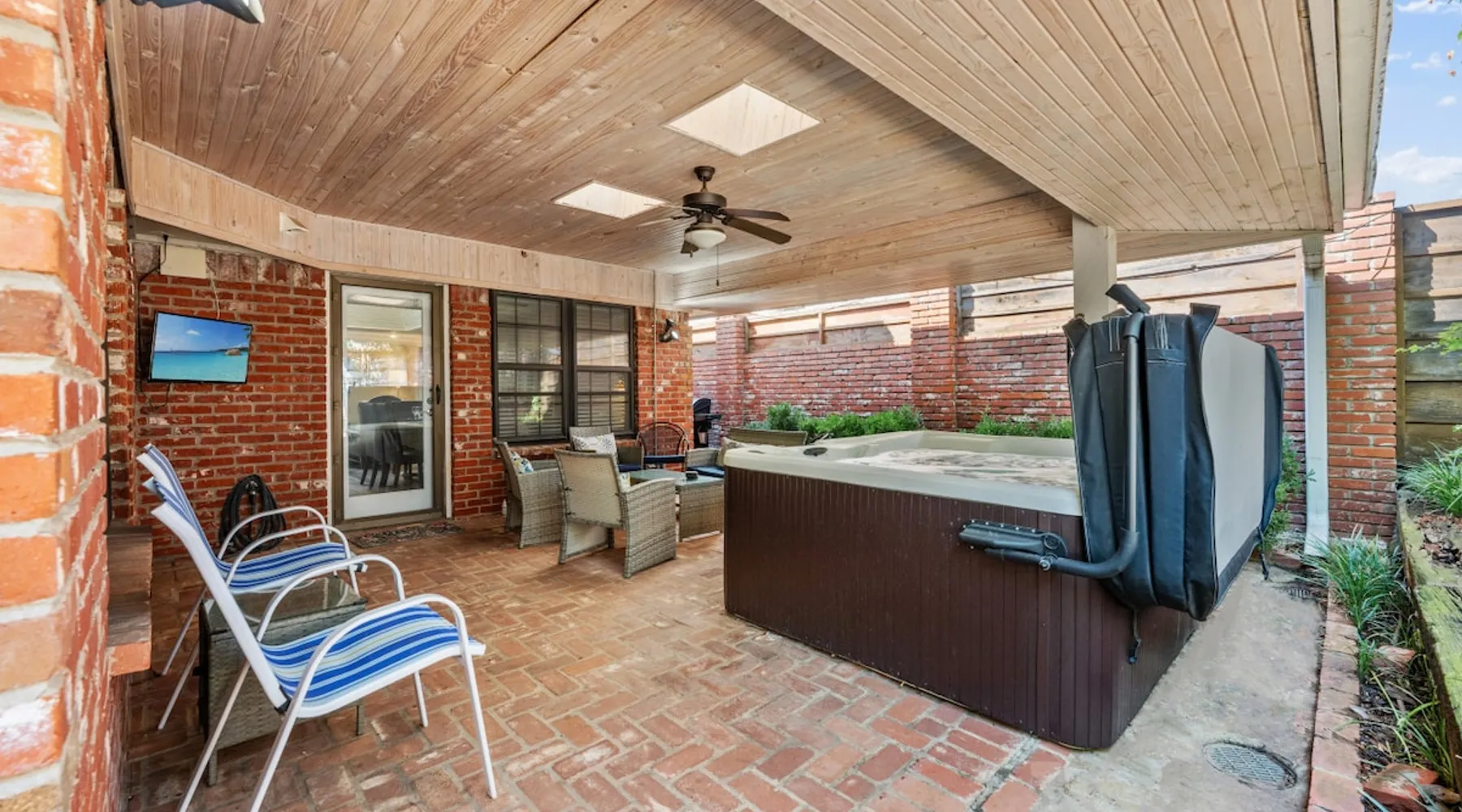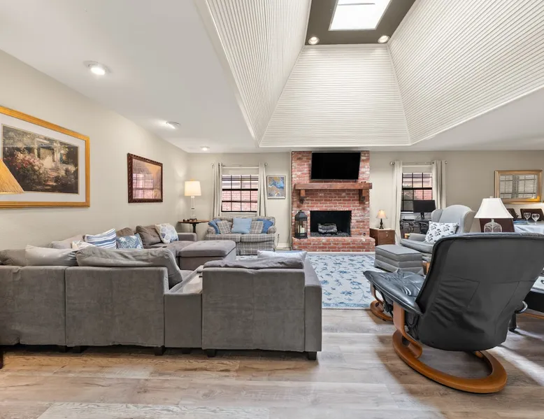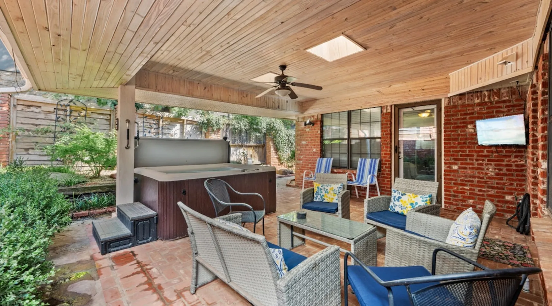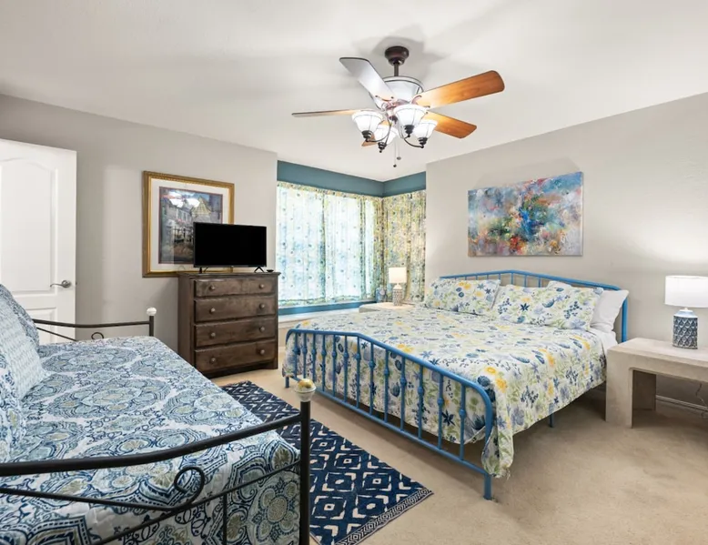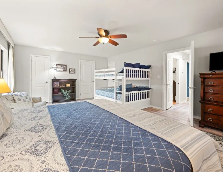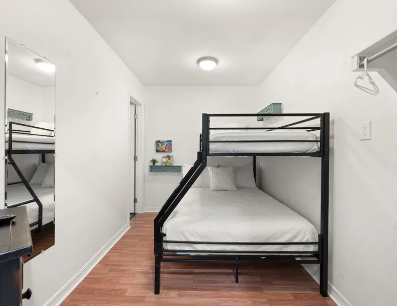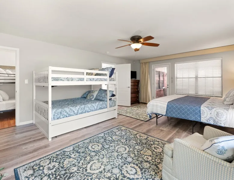 Escape to comfort and character in this 4-bedroom, 3-bath Oklahoma City home, perfect for families and group getaways. Enjoy cozy evenings by the gas fireplace, relax in the private hot tub on the covered patio, or whip up meals in the fully stocked kitchen. Just 15 miles from downtown and close to parks, shopping, and medical centers, this pet-friendly retreat is your ideal base for both city exploration and quiet nights in. The space Highlights: Outdoor Relaxation: Covered patio with private hot tub, outdoor seating, and yard games for family fun Fully Equipped Kitchen: Includes dishwasher, microwave, drip coffee maker, blender, spices, cooking basics, children’s dishware, and more Entertainment Galore: 6 Smart TVs, board games, and a cozy gas fireplace Family-Ready Comforts: High chair, portable crib, work desk, and washer/dryer Extras: Single-story with grab rails in shower Pet-friendly with $150 fee (2 pets max) Sleeping Arrangements: Bedroom 1: King Bed, Full Bunk Bed with Twin Trundle Bedroom 2: Twin/Full Bunk Bed Bedroom 3: King Bed Bedroom 4: King Bed, Twin Daybed with Twin Trundle Additional: 1 Portable Crib Parking: 5 (2 in garage, 3 in driveway) Additional street parking available on first-come, first-served basis. No RV/trailer parking allowed. Other things to note House Rules: •No Smoking •No events, parties, or large gatherings •Must be at least 25 years old to book •ID may be required •Please report any damages that occur to both the Guest Contact and Triad Vacation Rentals Additional Information: Single-story home, 1 step to enter. Exterior security cameras in place. Guests must be 25+ to book. No smoking or parties allowed.