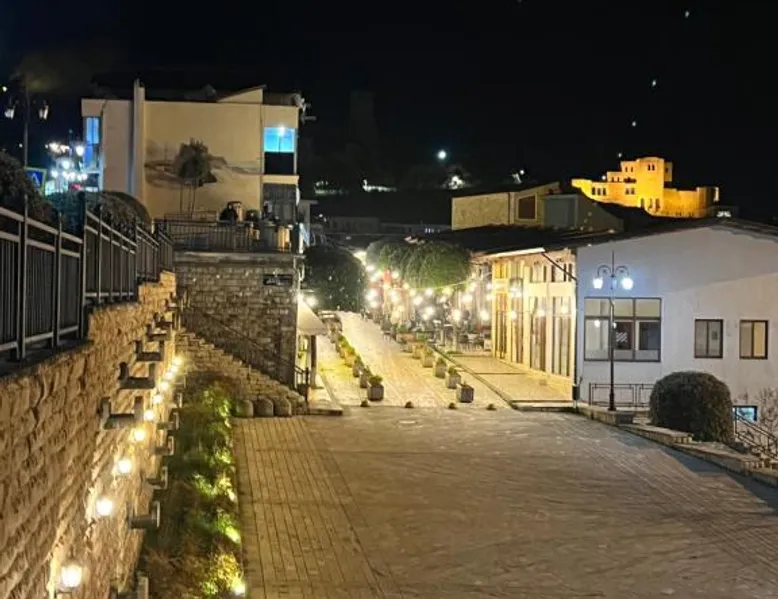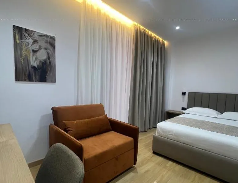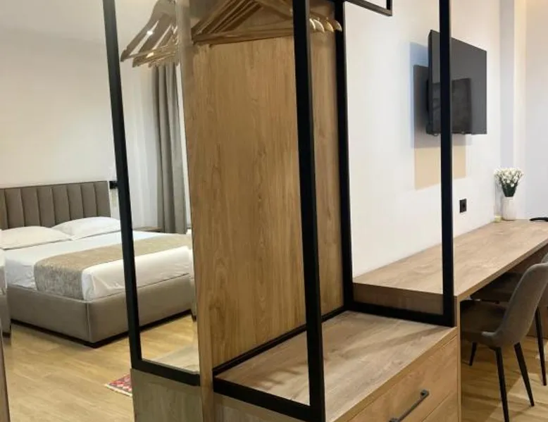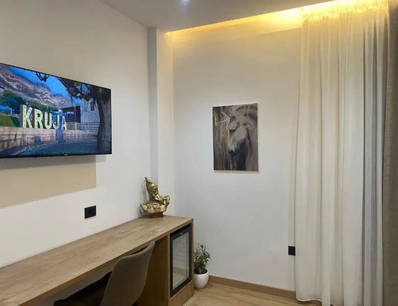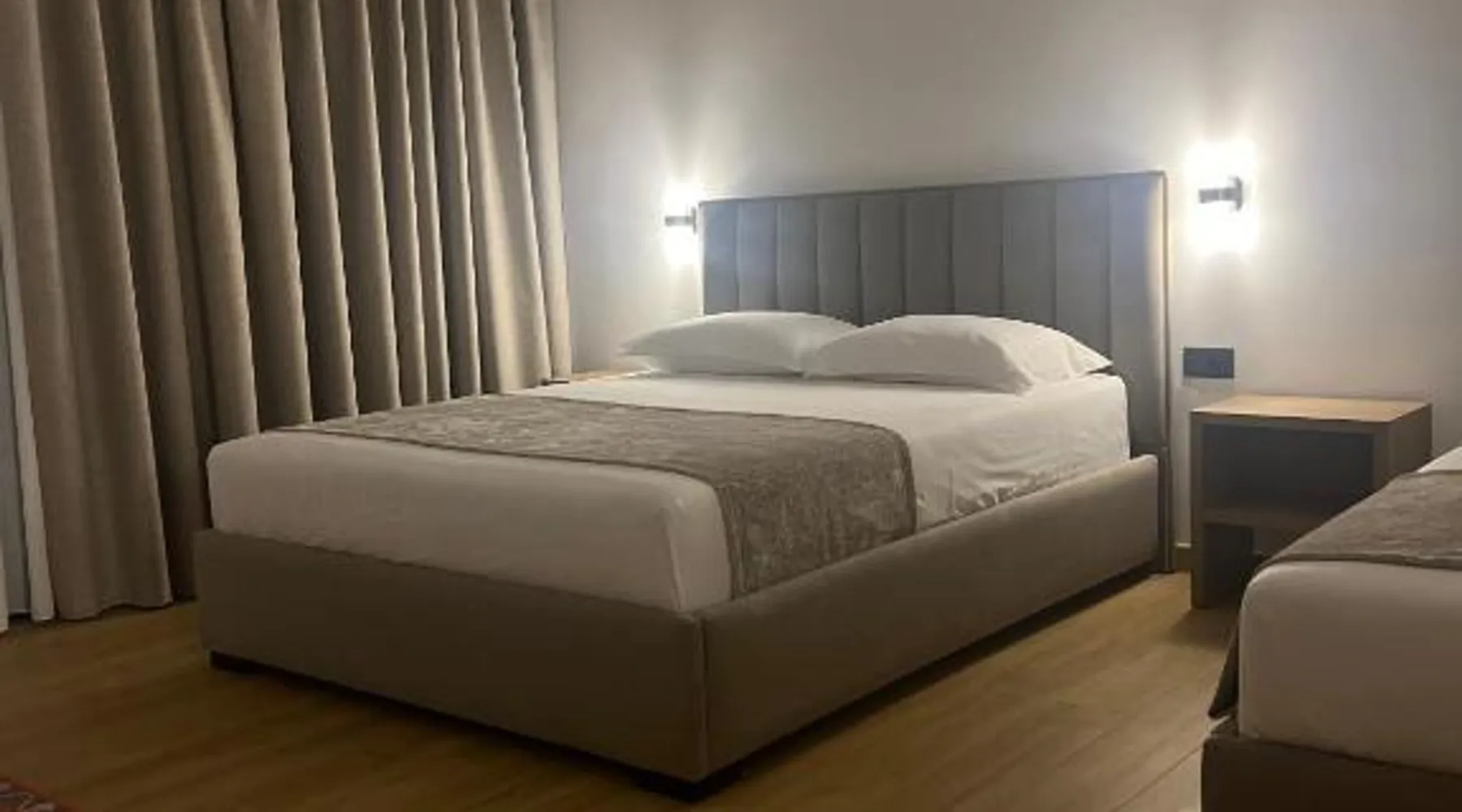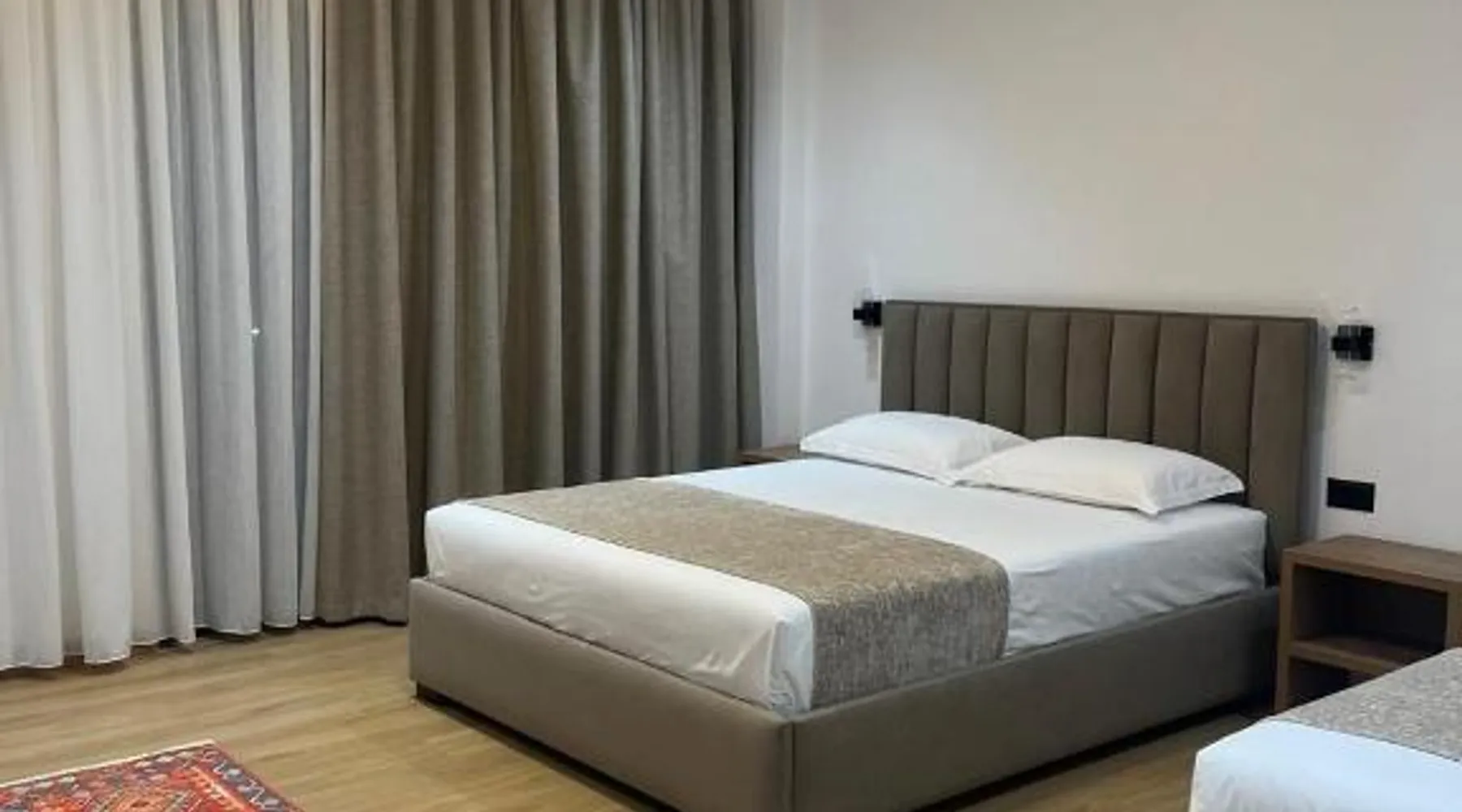 Comfortable Accommodations: Skanderbeg Hotel in Kruje offers family rooms with air-conditioning, balconies, and private bathrooms. Each room includes a bath, bidet, and free toiletries. Mountain and city views enhance the stay. Exceptional Facilities: Guests can relax in the garden or bar, enjoy free WiFi, and take advantage of the outdoor seating area. Additional amenities include a paid shuttle service, 24-hour front desk, and free on-site private parking. Delicious Breakfast: A variety of breakfast options are available, including continental, American, Italian, and vegetarian. Local specialties, juice, pancakes, cheese, and fruits are served daily. Prime Location: Located 11 mi from Tirana International Mother Teresa Airport, the hotel is near attractions such as Skanderbeg Square (20 mi) and Dajti Ekspres Cable Car (22 mi). The triple room offers air conditioning, a seating area, a balcony with mountain views as well as a private bathroom boasting a bath. The unit has 2 beds.