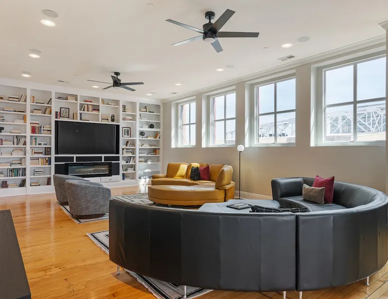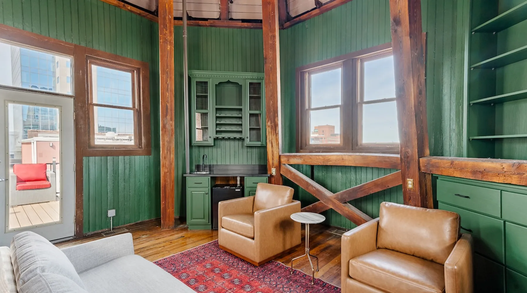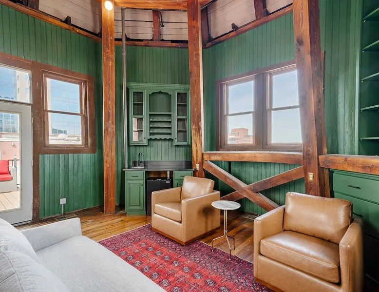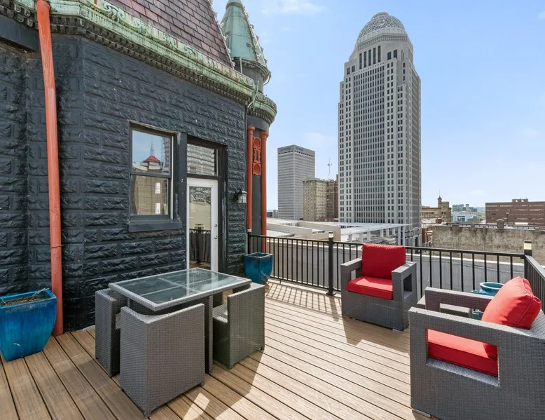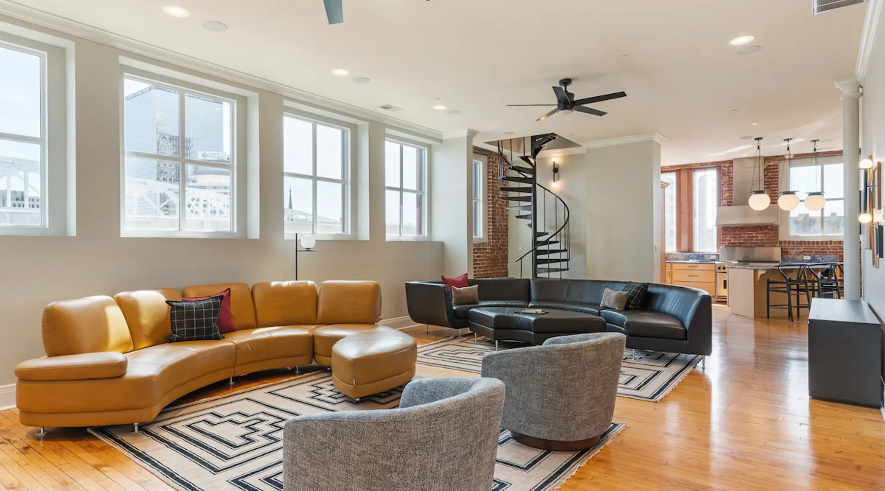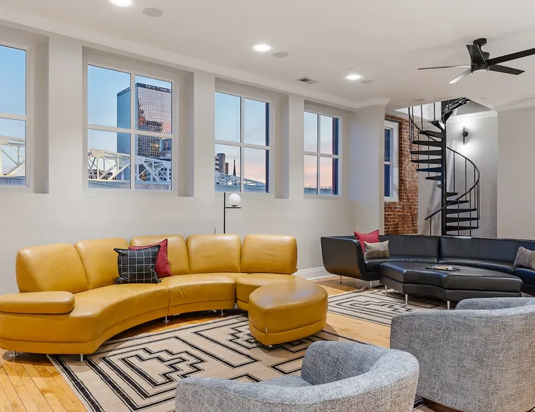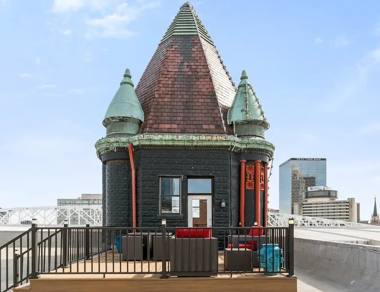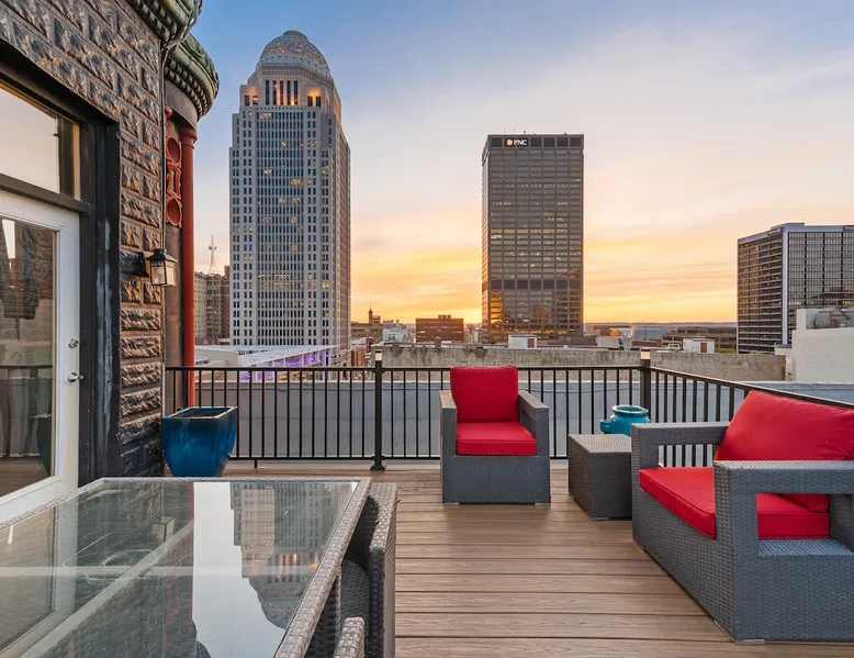Stay at this stunning 5-bedroom, 4-bathroom penthouse atop the iconic Levy Building in downtown Louisville. Perfect for groups up to 12—featuring a rooftop turret turned private bourbon tasting room with skyline views from a private deck. Enjoy a fully equipped kitchen, spacious living areas, and elegant details throughout. Walk to top restaurants, bars, museums, the convention center, and the riverfront—then unwind with a nightcap under the stars. The space The unit has 5 full bedrooms and sleeps up to 12 guests (3 king beds, 1 queen, 2 twins, and 1 pull out couch with queen sized bed located in the primary suite), with 4 full bathrooms. The Levy Building is centrally located to many of Louisville's popular attractions and amenities: - Kentucky Int'l Convention Center: 100 feet - Yum! Center: 500 feet - Derby City Gaming: 500 feet - Whiskey Row: .2 miles - Actor's Theater: 500 feet - Churchill Downs: 4.1 miles - Kentucky Expo/Fairgrounds: 4 miles - Louisville Slugger Field: .9 miles - Louisville Int'l Airport: 5.8 miles - Lynn Family Stadium: 1.6 miles - Waterfront Park: 1 mile - Angels' Envy Distillery: .6 miles - Old Forrester Distillery: .3 miles - Michter's Fort Nelson Distillery: .4 miles - Kentucky Peerless Distillery: 1 mile Guest access Guests that have access to the entire unit plus common spaces within the Levy building. Common spaces include a well equipped gym. Two (2) parking passes are included with the stay. Other things to note - The maximum number of occupants for this short term rental may not exceed 12 guests. - Guests are prohibited from allowing more individuals than the maximum occupancy allows. - Guests are prohibited from having parties or other events. - Quiet time hours (10:00 PM - 8:00 AM) are strictly enforced. Registration Details LIC-STL-24-01088