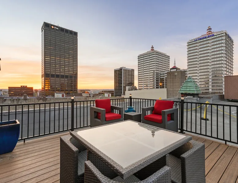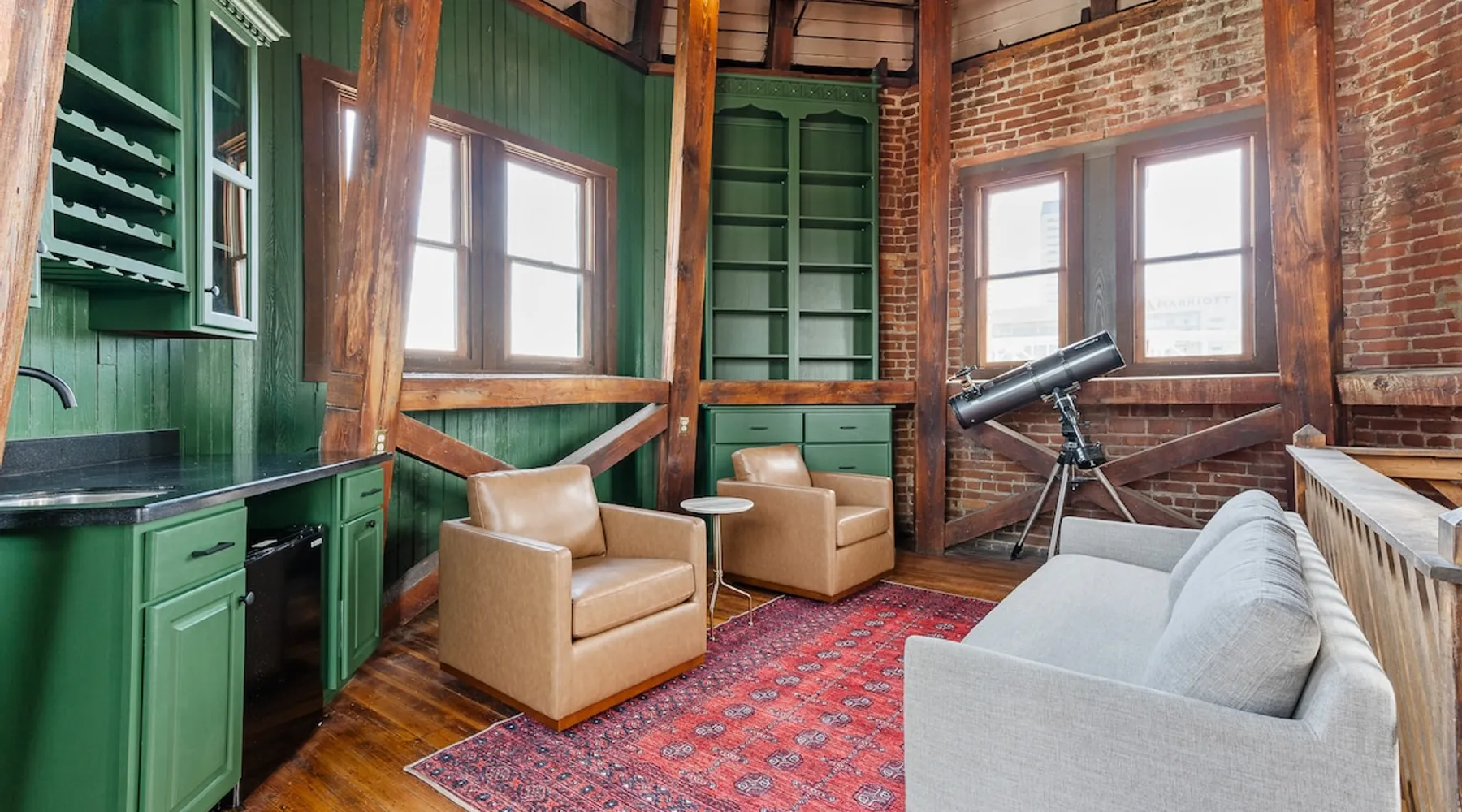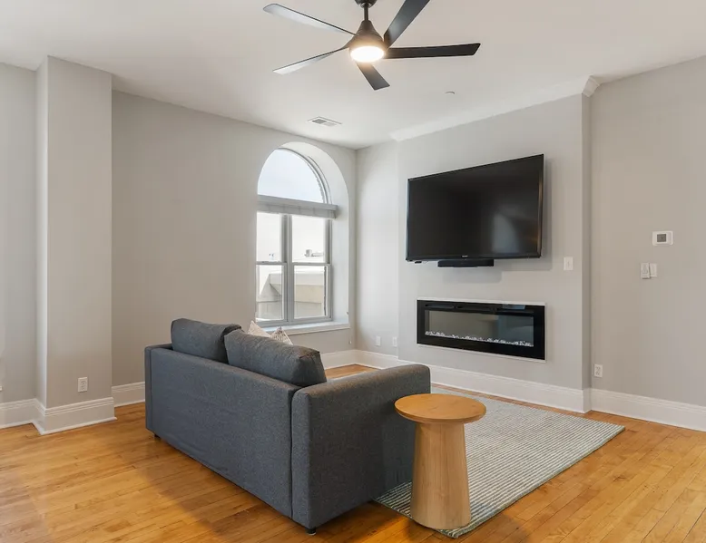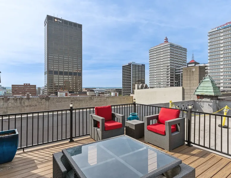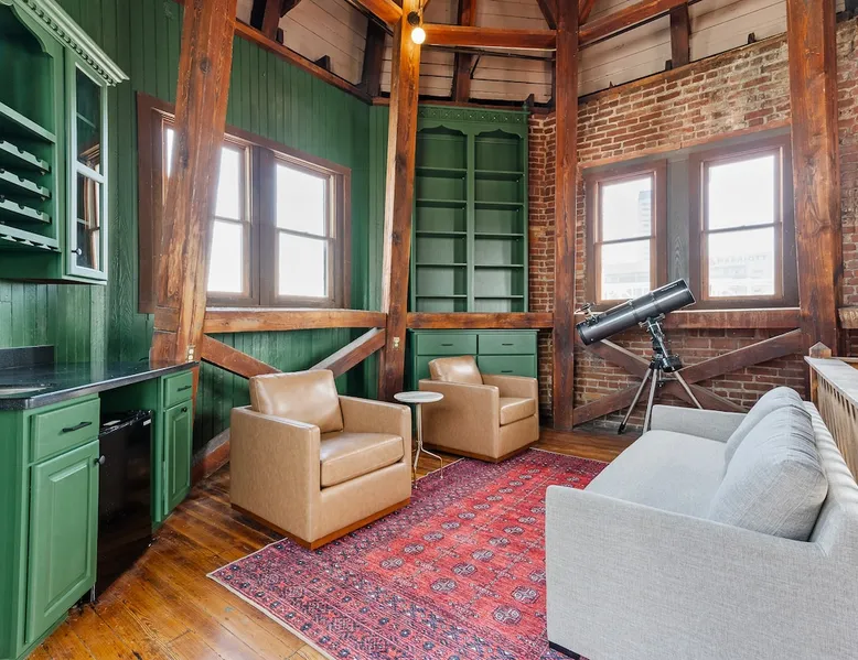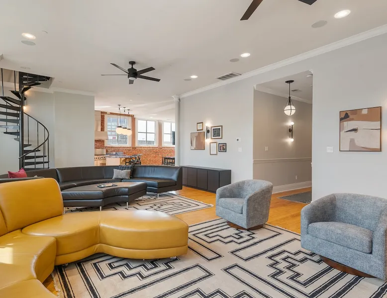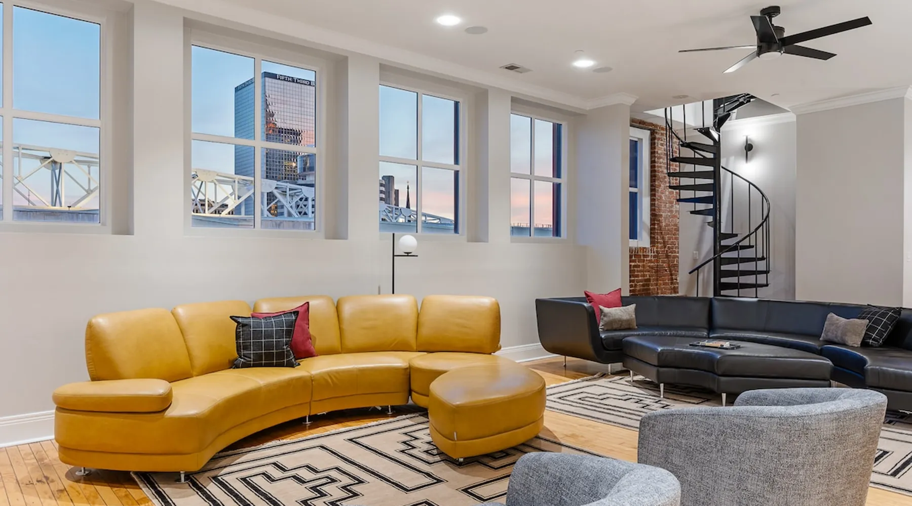 Stay at this stunning 5-bedroom, 4-bathroom penthouse atop the iconic Levy Building in downtown Louisville. Perfect for groups up to 12—featuring a rooftop turret turned private bourbon tasting room with skyline views from a private deck. Enjoy a fully equipped kitchen, spacious living areas, and elegant details throughout. Walk to top restaurants, bars, museums, the convention center, and the riverfront—then unwind with a nightcap under the stars. The space The unit has 5 full bedrooms and sleeps up to 12 guests (3 king beds, 1 queen, 2 twins, and 1 pull out couch with queen sized bed located in the primary suite), with 4 full bathrooms. The Levy Building is centrally located to many of Louisville's popular attractions and amenities: - Kentucky Int'l Convention Center: 100 feet - Yum! Center: 500 feet - Derby City Gaming: 500 feet - Whiskey Row: .2 miles - Actor's Theater: 500 feet - Churchill Downs: 4.1 miles - Kentucky Expo/Fairgrounds: 4 miles - Louisville Slugger Field: .9 miles - Louisville Int'l Airport: 5.8 miles - Lynn Family Stadium: 1.6 miles - Waterfront Park: 1 mile - Angels' Envy Distillery: .6 miles - Old Forrester Distillery: .3 miles - Michter's Fort Nelson Distillery: .4 miles - Kentucky Peerless Distillery: 1 mile Guest access Guests that have access to the entire unit plus common spaces within the Levy building. Common spaces include a well equipped gym. Two (2) parking passes are included with the stay. Other things to note - The maximum number of occupants for this short term rental may not exceed 12 guests. - Guests are prohibited from allowing more individuals than the maximum occupancy allows. - Guests are prohibited from having parties or other events. - Quiet time hours (10:00 PM - 8:00 AM) are strictly enforced. Registration Details LIC-STL-24-01088