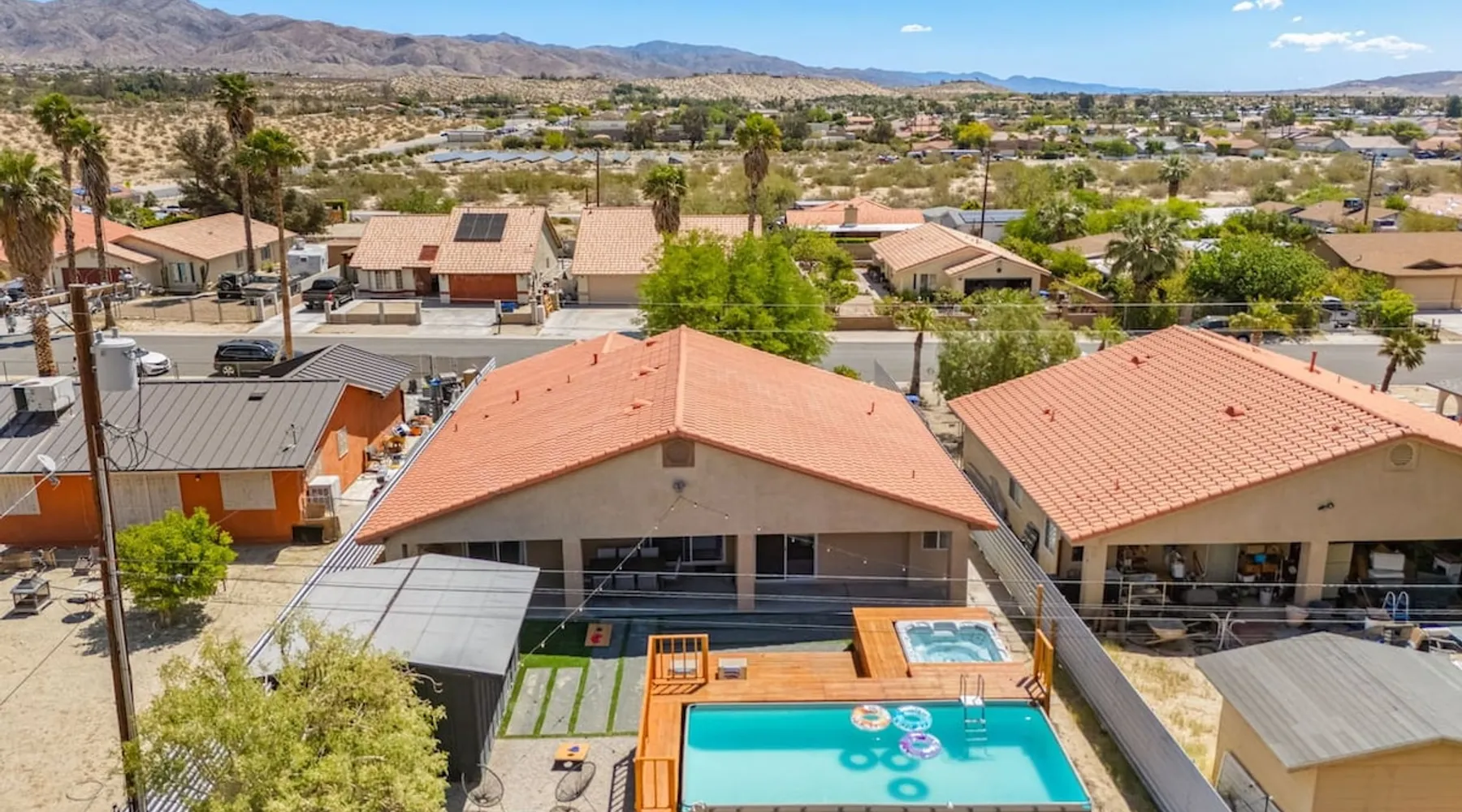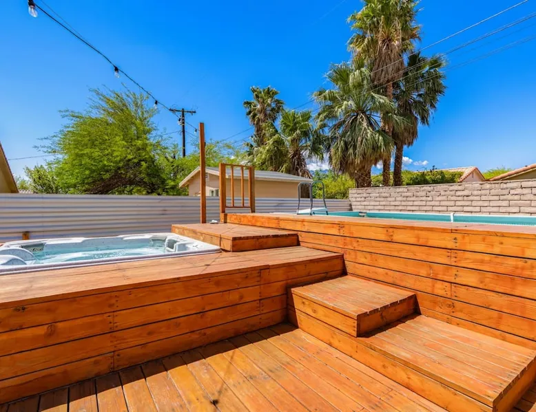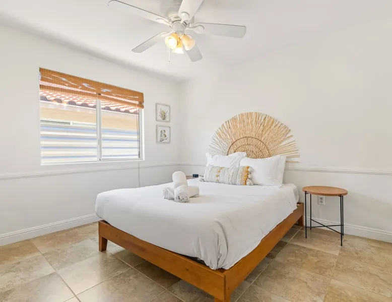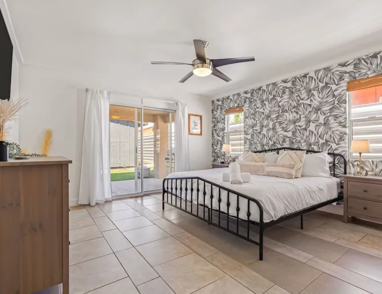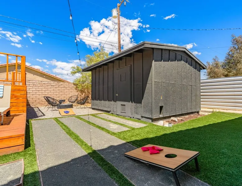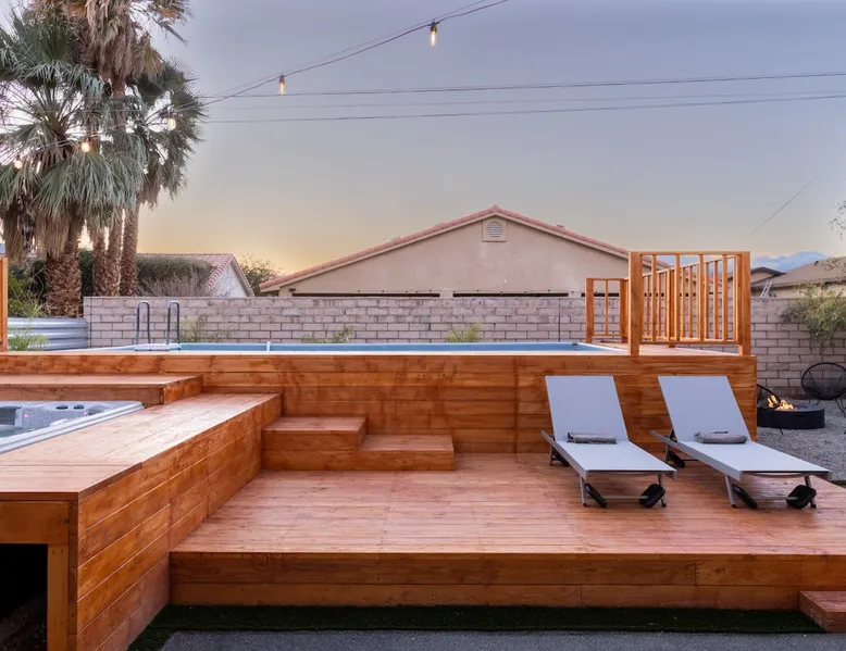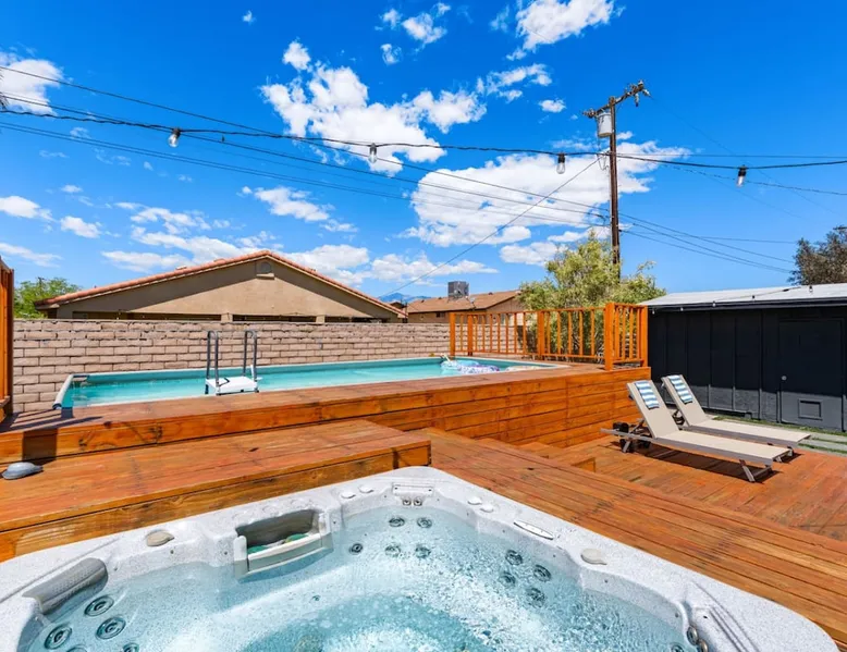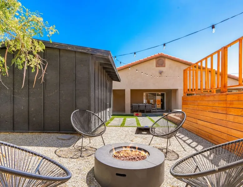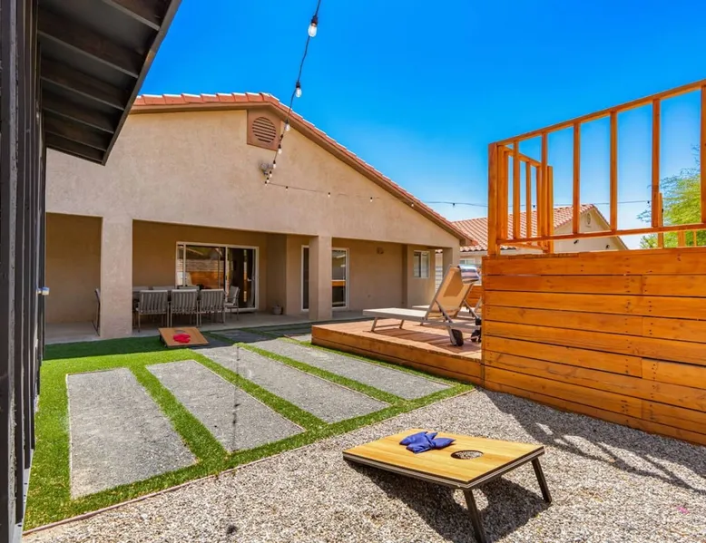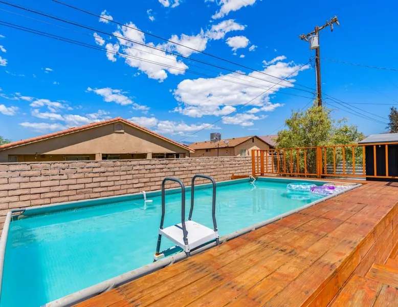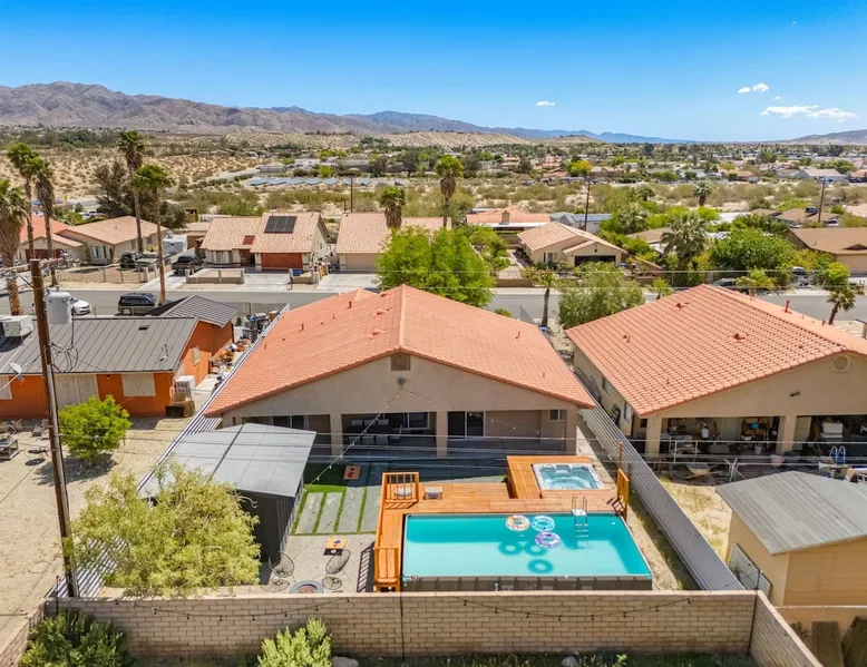 Welcome to Boho Bungalow—your private desert escape in Desert Hot Springs! Just 15 minutes from Palm Springs and 30 minutes from Joshua Tree, this modern 4-bedroom home is perfect for families, groups, or remote work retreats. Enjoy the above-ground pool and hot tub with a wrap-around deck, spacious interiors, and a fully fenced yard designed for comfort, fun, and unforgettable memories. The space ☆ Outdoor Amenities for Year-Round Enjoyment. Unwind in your private backyard oasis: • Above-ground pool and separate hot tub with wrap-around deck • Fire pit for cozy evenings under the stars • Propane BBQ grill • Corn hole & lawn games for group fun • Fully fenced yard – perfect for both play and pets ☆ Living Room • Stylish, spacious interior • Vaulted ceilings, leather sectional, accent chair • 65” Smart TV with sound bar • Article dining table seats 8 comfortably • Board games, puzzles & reading nook • Record player ☆Kitchen • Fully stocked with cookware, dinnerware for everyone • Perfect for group meals or light snacks • Modern appliances & spacious layout ☆4 Bedrooms | Sleeps 8 Comfortably ~ Primary Suite: King bed, Smart TV, black out curtains, walk-in closet and ensuite bathroom ~ Bedroom 2: Queen bed ~ Bedroom 3: Queen bed ~ Bedroom 4: Daybed with twin trundle, desk and office chair All bedrooms have sound machines, clothing storage and mirrors. ☆Bathrooms: Stocked with shampoo, conditioner, body wash, and hair dryer ☆ Laundry: Washer and dryer located in the garage for guest use ☆ Parking: The home includes a 1-car garage and space for up to 3 additional vehicles in the driveway, providing a total of 4 dedicated parking spots for your group’s convenience. Guest access ☆ Full & Private Access: As our guest, you’ll enjoy full access to every corner of Boho Bungalow, including the vibrant living spaces, fully fenced backyard, and private outdoor amenities like the pool, hot tub, fire pit, and BBQ. ☆ Contactless, 24/7 Check-In: We value your convenience and safety, which is why we offer a completely contactless check-in process. Regardless of your arrival time, you'll be able to access the property at your leisure, day or night. ☆ Digital House Manual: To make your stay as seamless as possible, you will receive a digital house manual filled with useful information about the property and local recommendations. Other things to note ☆ Family-Friendly Comfort: As parents ourselves, we know how important it is to have a space that makes traveling with little ones easier. Boho Bungalow is thoughtfully equipped for young families with a Pack 'n Play (crib sheets, sound machine and baby monitor included) and a high chair for added convenience. You'll also find a variety of books, games, and puzzles to enjoy together, plus kid-friendly dishware—including plastic plates, bowls, cups, sippy cups, and utensils—to make mealtime stress-free. ☆ Pet-Friendly Accommodations: We welcome one dog only (up to 60 lbs) for a fee of $150 per stay. This fee helps cover the additional cleaning required for pet hair. If any waste beyond hair (such as urine or feces) is found, an additional $200 cleaning fee will be charged. Guests are responsible for cleaning up after their pet, and dogs should not be left unattended in the home, as barking may disturb neighbors. Please note: Dogs are not allowed in the pool. Please let us know if you are traveling with a dog ☆ Desert Living: Our home is nestled in the beautiful Coachella Valley desert, where wind can occasionally blow sand or leaves into the pool. While our pool cleaners visit only Monday and Thursday to keep the water sparkling, we’ve also provided skimmers for your convenience if you'd like to clear any debris in between. Our gardener visits weekly on Mondays to maintain the yard. STR Permit #003584