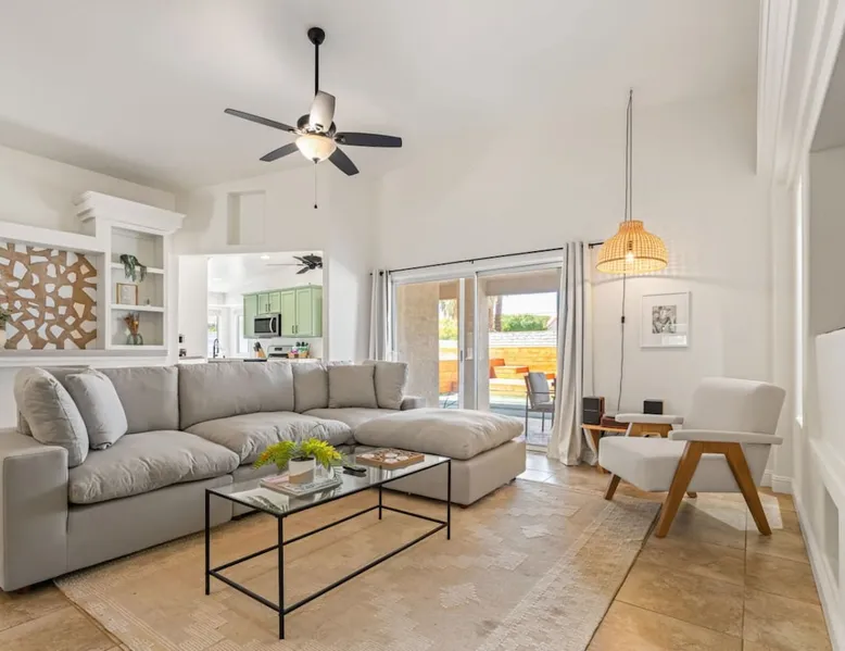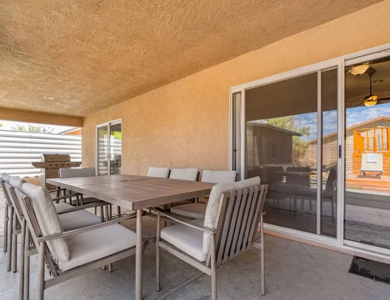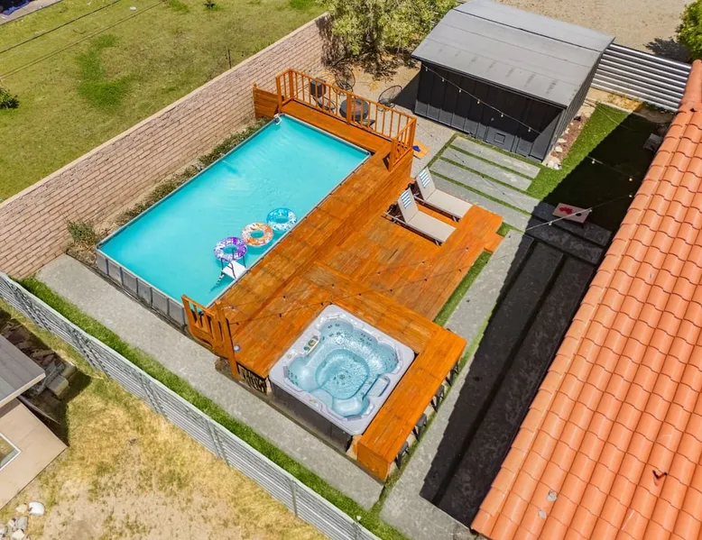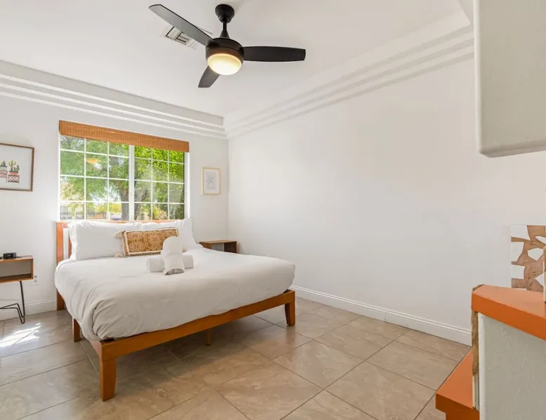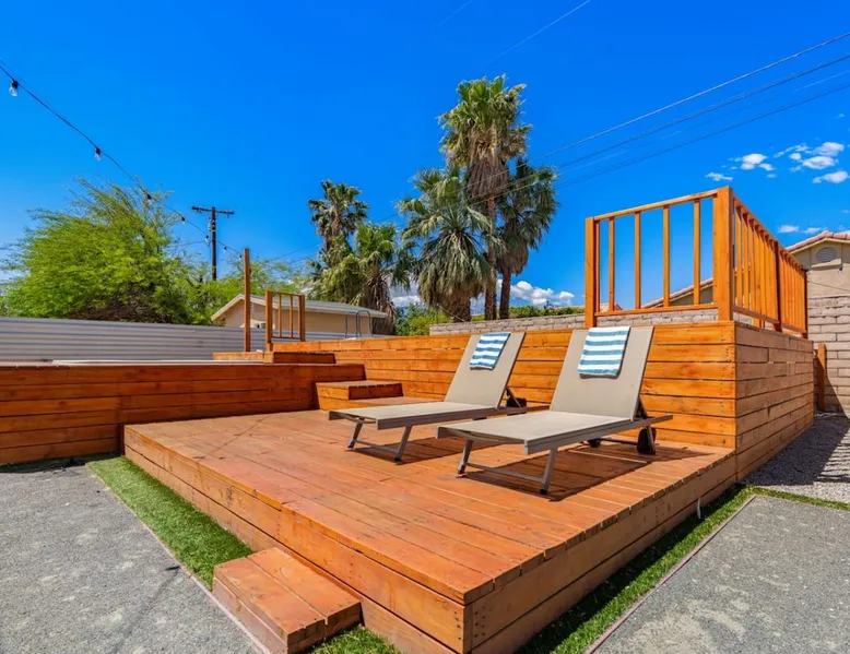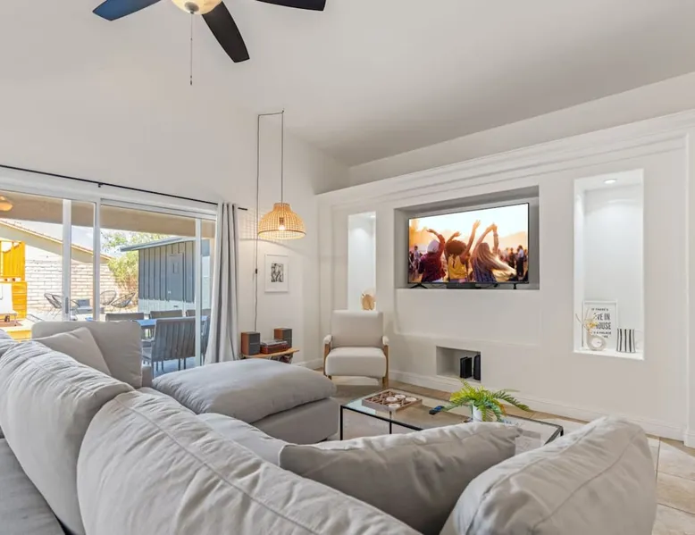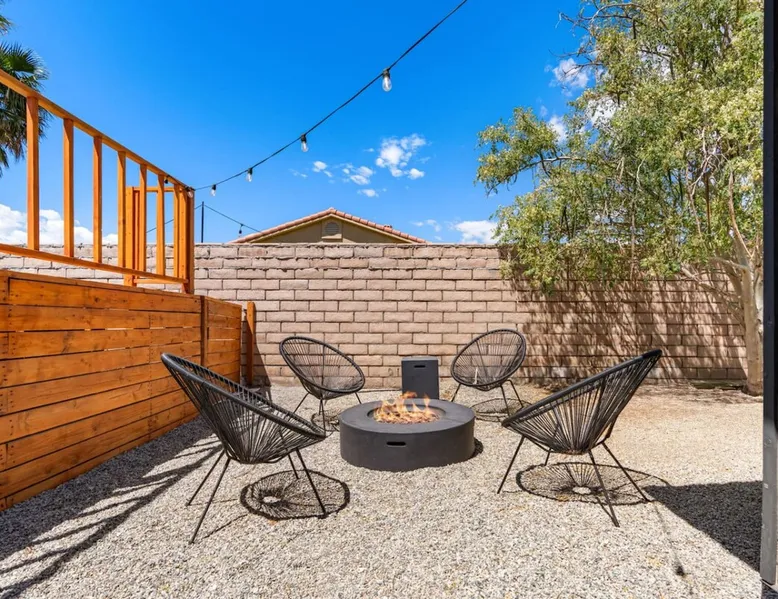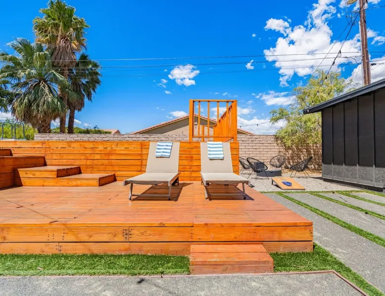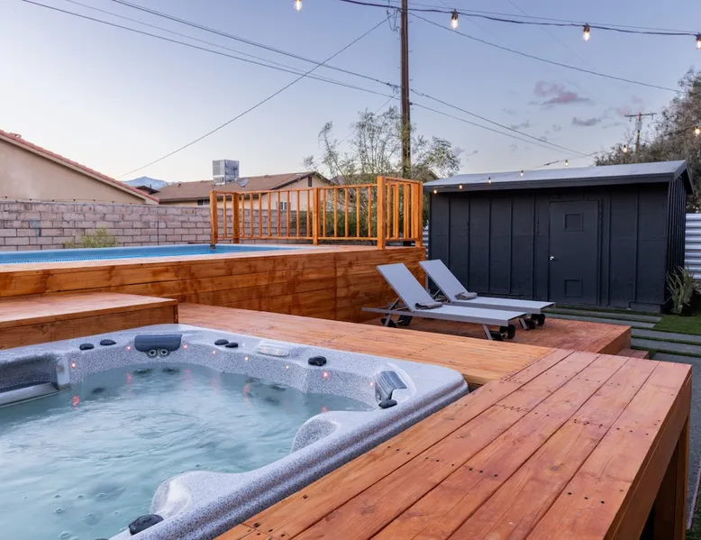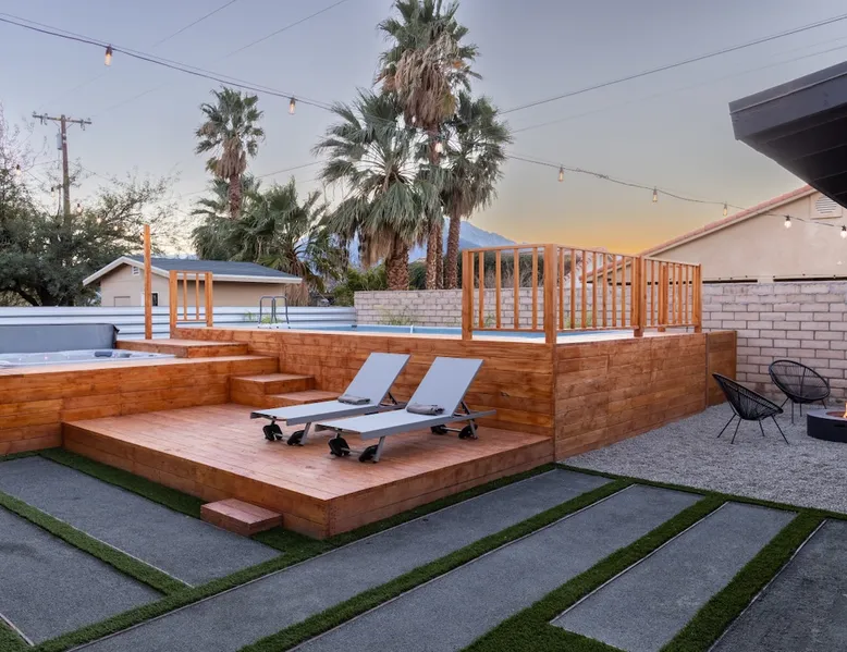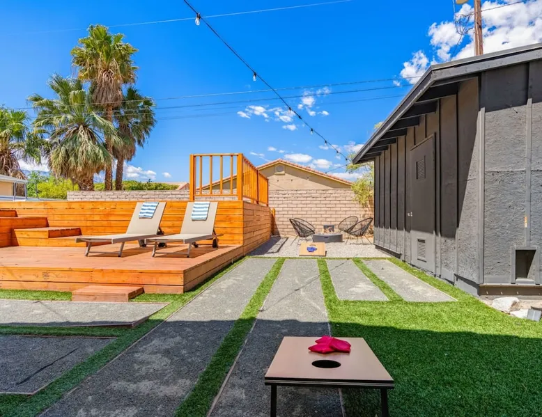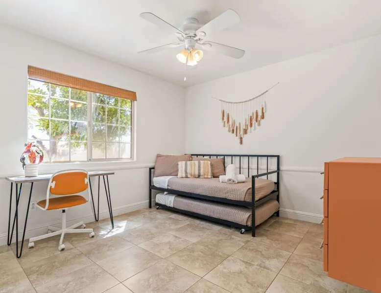 Welcome to Boho Bungalow—your private desert escape in Desert Hot Springs! Just 15 minutes from Palm Springs and 30 minutes from Joshua Tree, this modern 4-bedroom home is perfect for families, groups, or remote work retreats. Enjoy the above-ground pool and hot tub with a wrap-around deck, spacious interiors, and a fully fenced yard designed for comfort, fun, and unforgettable memories. The space ☆ Outdoor Amenities for Year-Round Enjoyment. Unwind in your private backyard oasis: • Above-ground pool and separate hot tub with wrap-around deck • Fire pit for cozy evenings under the stars • Propane BBQ grill • Corn hole & lawn games for group fun • Fully fenced yard – perfect for both play and pets ☆ Living Room • Stylish, spacious interior • Vaulted ceilings, leather sectional, accent chair • 65” Smart TV with sound bar • Article dining table seats 8 comfortably • Board games, puzzles & reading nook • Record player ☆Kitchen • Fully stocked with cookware, dinnerware for everyone • Perfect for group meals or light snacks • Modern appliances & spacious layout ☆4 Bedrooms | Sleeps 8 Comfortably ~ Primary Suite: King bed, Smart TV, black out curtains, walk-in closet and ensuite bathroom ~ Bedroom 2: Queen bed ~ Bedroom 3: Queen bed ~ Bedroom 4: Daybed with twin trundle, desk and office chair All bedrooms have sound machines, clothing storage and mirrors. ☆Bathrooms: Stocked with shampoo, conditioner, body wash, and hair dryer ☆ Laundry: Washer and dryer located in the garage for guest use ☆ Parking: The home includes a 1-car garage and space for up to 3 additional vehicles in the driveway, providing a total of 4 dedicated parking spots for your group’s convenience. Guest access ☆ Full & Private Access: As our guest, you’ll enjoy full access to every corner of Boho Bungalow, including the vibrant living spaces, fully fenced backyard, and private outdoor amenities like the pool, hot tub, fire pit, and BBQ. ☆ Contactless, 24/7 Check-In: We value your convenience and safety, which is why we offer a completely contactless check-in process. Regardless of your arrival time, you'll be able to access the property at your leisure, day or night. ☆ Digital House Manual: To make your stay as seamless as possible, you will receive a digital house manual filled with useful information about the property and local recommendations. Other things to note ☆ Family-Friendly Comfort: As parents ourselves, we know how important it is to have a space that makes traveling with little ones easier. Boho Bungalow is thoughtfully equipped for young families with a Pack 'n Play (crib sheets, sound machine and baby monitor included) and a high chair for added convenience. You'll also find a variety of books, games, and puzzles to enjoy together, plus kid-friendly dishware—including plastic plates, bowls, cups, sippy cups, and utensils—to make mealtime stress-free. ☆ Pet-Friendly Accommodations: We welcome one dog only (up to 60 lbs) for a fee of $150 per stay. This fee helps cover the additional cleaning required for pet hair. If any waste beyond hair (such as urine or feces) is found, an additional $200 cleaning fee will be charged. Guests are responsible for cleaning up after their pet, and dogs should not be left unattended in the home, as barking may disturb neighbors. Please note: Dogs are not allowed in the pool. Please let us know if you are traveling with a dog ☆ Desert Living: Our home is nestled in the beautiful Coachella Valley desert, where wind can occasionally blow sand or leaves into the pool. While our pool cleaners visit only Monday and Thursday to keep the water sparkling, we’ve also provided skimmers for your convenience if you'd like to clear any debris in between. Our gardener visits weekly on Mondays to maintain the yard. STR Permit #003584