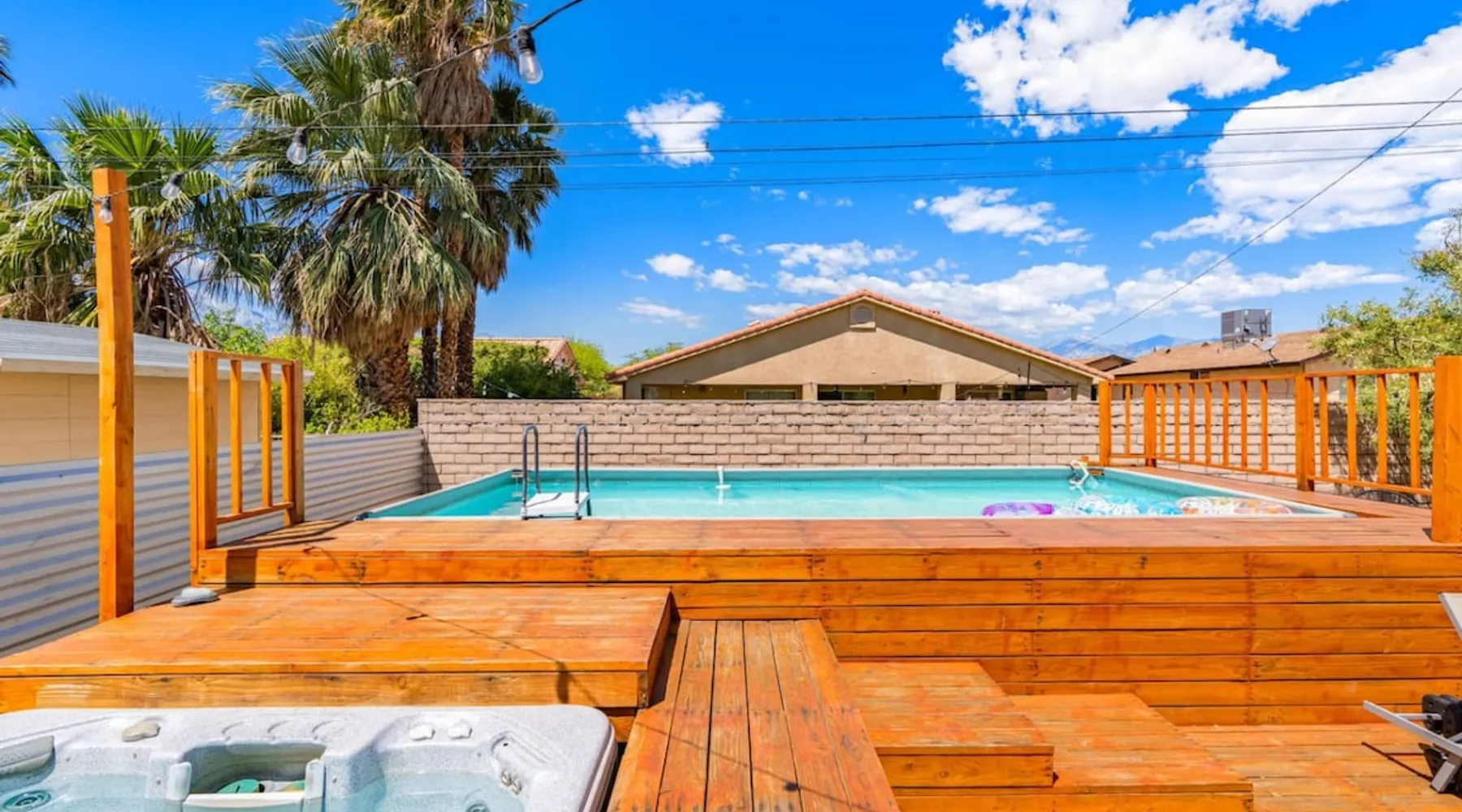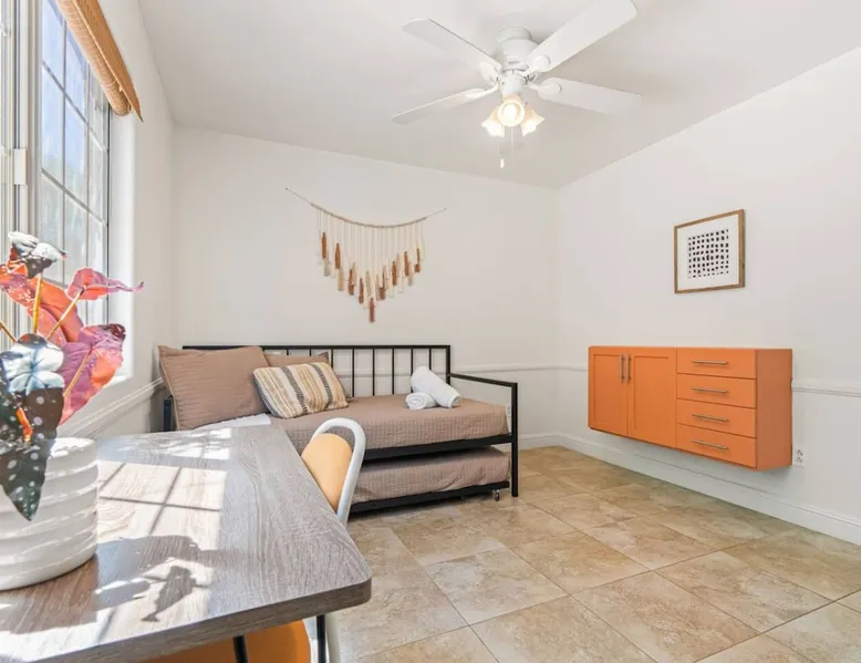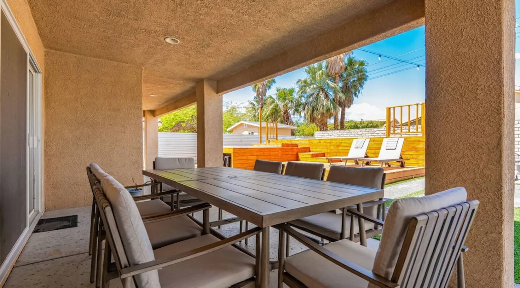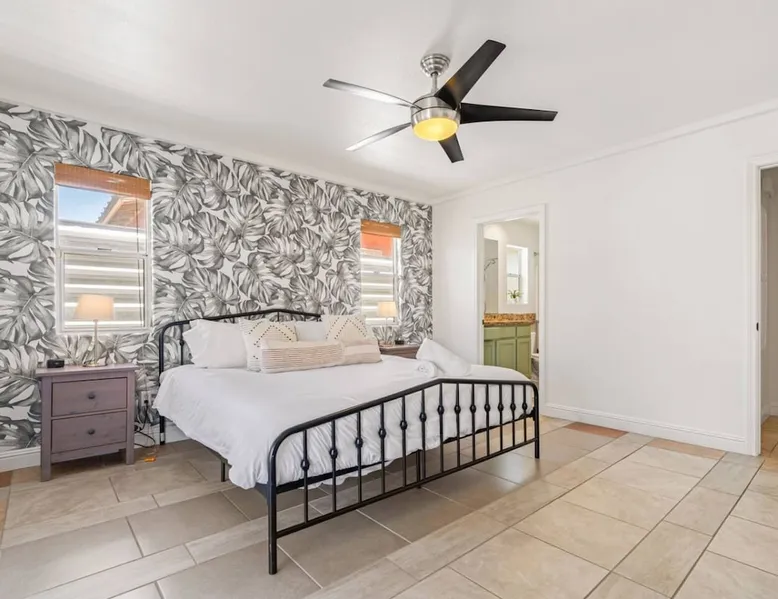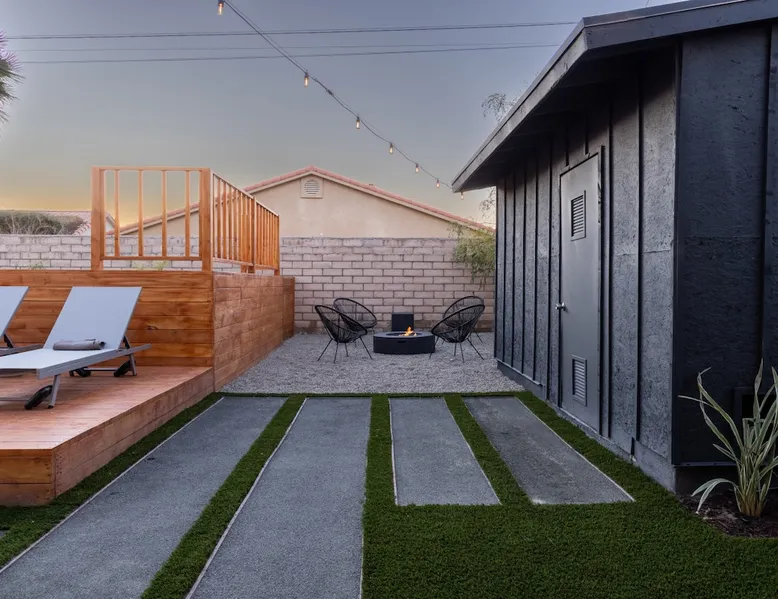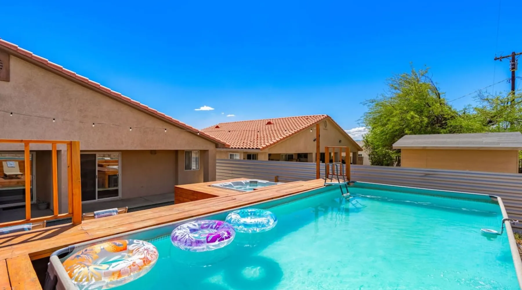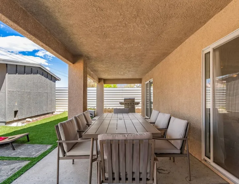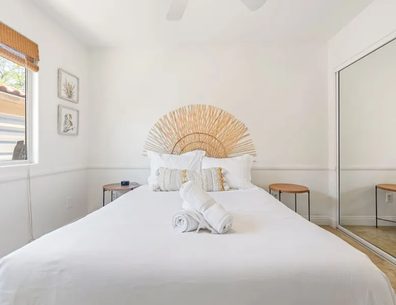 Welcome to Boho Bungalow—your private desert escape in Desert Hot Springs! Just 15 minutes from Palm Springs and 30 minutes from Joshua Tree, this modern 4-bedroom home is perfect for families, groups, or remote work retreats. Enjoy the above-ground pool and hot tub with a wrap-around deck, spacious interiors, and a fully fenced yard designed for comfort, fun, and unforgettable memories. The space ☆ Outdoor Amenities for Year-Round Enjoyment. Unwind in your private backyard oasis: • Above-ground pool and separate hot tub with wrap-around deck • Fire pit for cozy evenings under the stars • Propane BBQ grill • Corn hole & lawn games for group fun • Fully fenced yard – perfect for both play and pets ☆ Living Room • Stylish, spacious interior • Vaulted ceilings, leather sectional, accent chair • 65” Smart TV with sound bar • Article dining table seats 8 comfortably • Board games, puzzles & reading nook • Record player ☆Kitchen • Fully stocked with cookware, dinnerware for everyone • Perfect for group meals or light snacks • Modern appliances & spacious layout ☆4 Bedrooms | Sleeps 8 Comfortably ~ Primary Suite: King bed, Smart TV, black out curtains, walk-in closet and ensuite bathroom ~ Bedroom 2: Queen bed ~ Bedroom 3: Queen bed ~ Bedroom 4: Daybed with twin trundle, desk and office chair All bedrooms have sound machines, clothing storage and mirrors. ☆Bathrooms: Stocked with shampoo, conditioner, body wash, and hair dryer ☆ Laundry: Washer and dryer located in the garage for guest use ☆ Parking: The home includes a 1-car garage and space for up to 3 additional vehicles in the driveway, providing a total of 4 dedicated parking spots for your group’s convenience. Guest access ☆ Full & Private Access: As our guest, you’ll enjoy full access to every corner of Boho Bungalow, including the vibrant living spaces, fully fenced backyard, and private outdoor amenities like the pool, hot tub, fire pit, and BBQ. ☆ Contactless, 24/7 Check-In: We value your convenience and safety, which is why we offer a completely contactless check-in process. Regardless of your arrival time, you'll be able to access the property at your leisure, day or night. ☆ Digital House Manual: To make your stay as seamless as possible, you will receive a digital house manual filled with useful information about the property and local recommendations. Other things to note ☆ Family-Friendly Comfort: As parents ourselves, we know how important it is to have a space that makes traveling with little ones easier. Boho Bungalow is thoughtfully equipped for young families with a Pack 'n Play (crib sheets, sound machine and baby monitor included) and a high chair for added convenience. You'll also find a variety of books, games, and puzzles to enjoy together, plus kid-friendly dishware—including plastic plates, bowls, cups, sippy cups, and utensils—to make mealtime stress-free. ☆ Pet-Friendly Accommodations: We welcome one dog only (up to 60 lbs) for a fee of $150 per stay. This fee helps cover the additional cleaning required for pet hair. If any waste beyond hair (such as urine or feces) is found, an additional $200 cleaning fee will be charged. Guests are responsible for cleaning up after their pet, and dogs should not be left unattended in the home, as barking may disturb neighbors. Please note: Dogs are not allowed in the pool. Please let us know if you are traveling with a dog ☆ Desert Living: Our home is nestled in the beautiful Coachella Valley desert, where wind can occasionally blow sand or leaves into the pool. While our pool cleaners visit only Monday and Thursday to keep the water sparkling, we’ve also provided skimmers for your convenience if you'd like to clear any debris in between. Our gardener visits weekly on Mondays to maintain the yard. STR Permit #003584