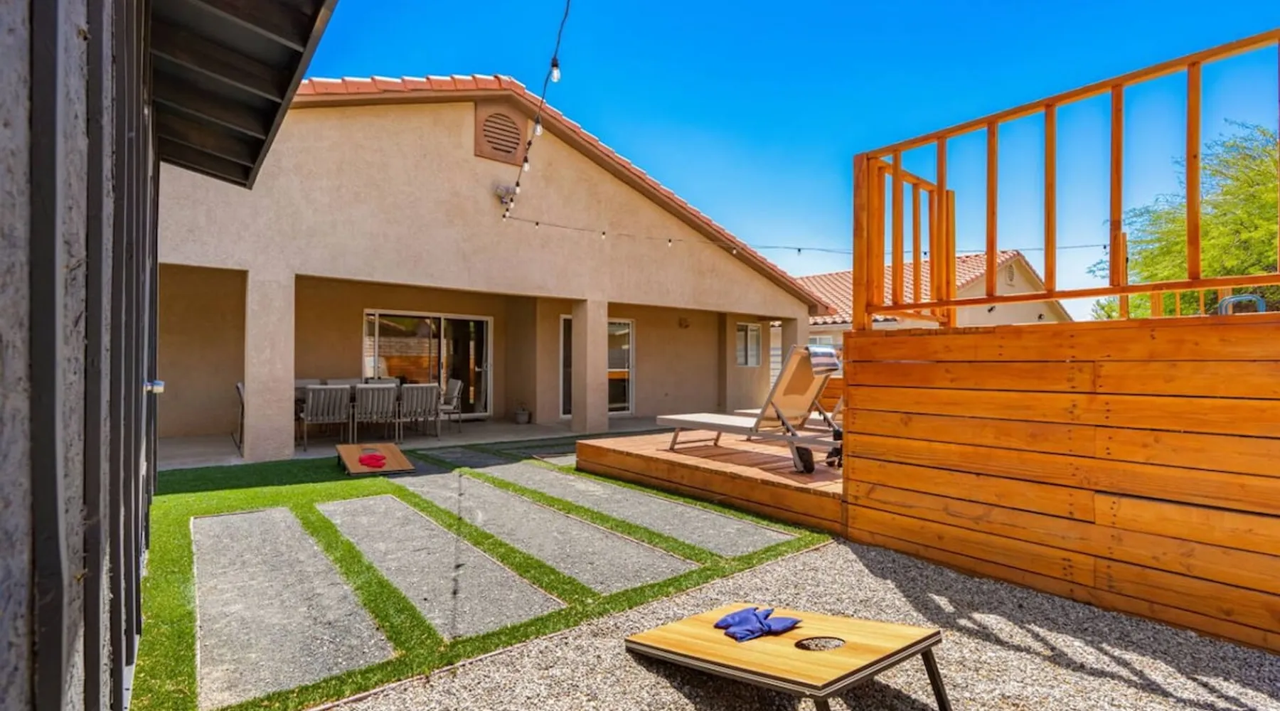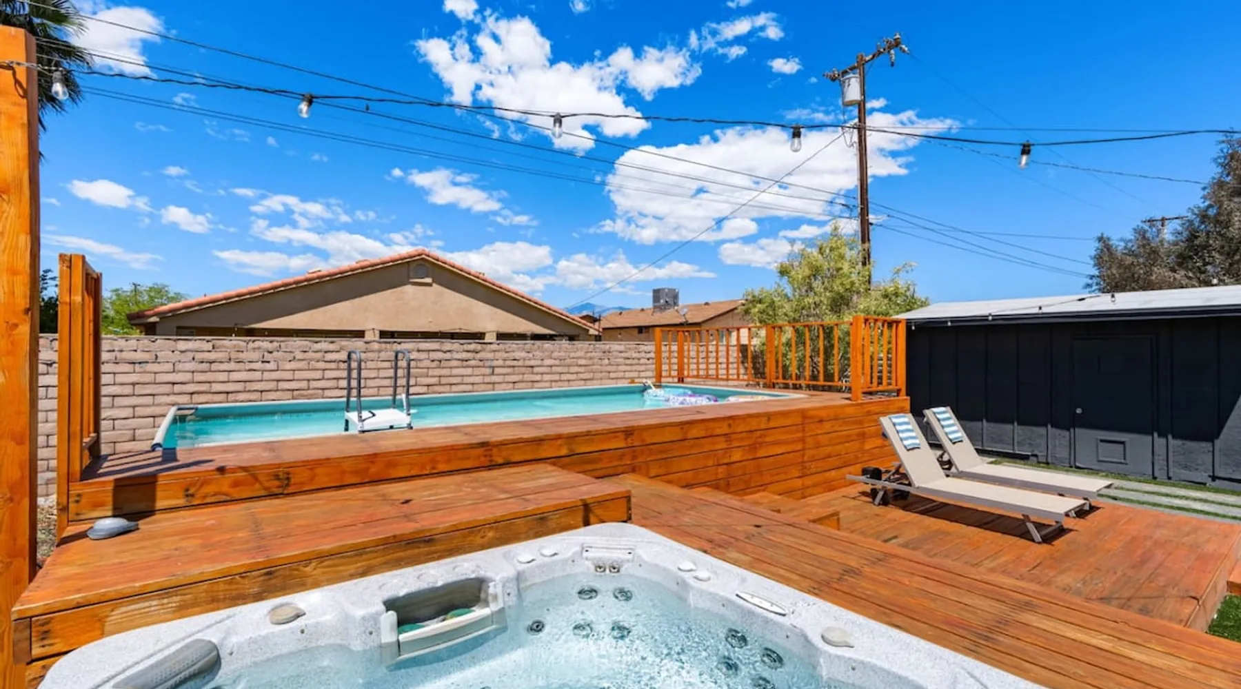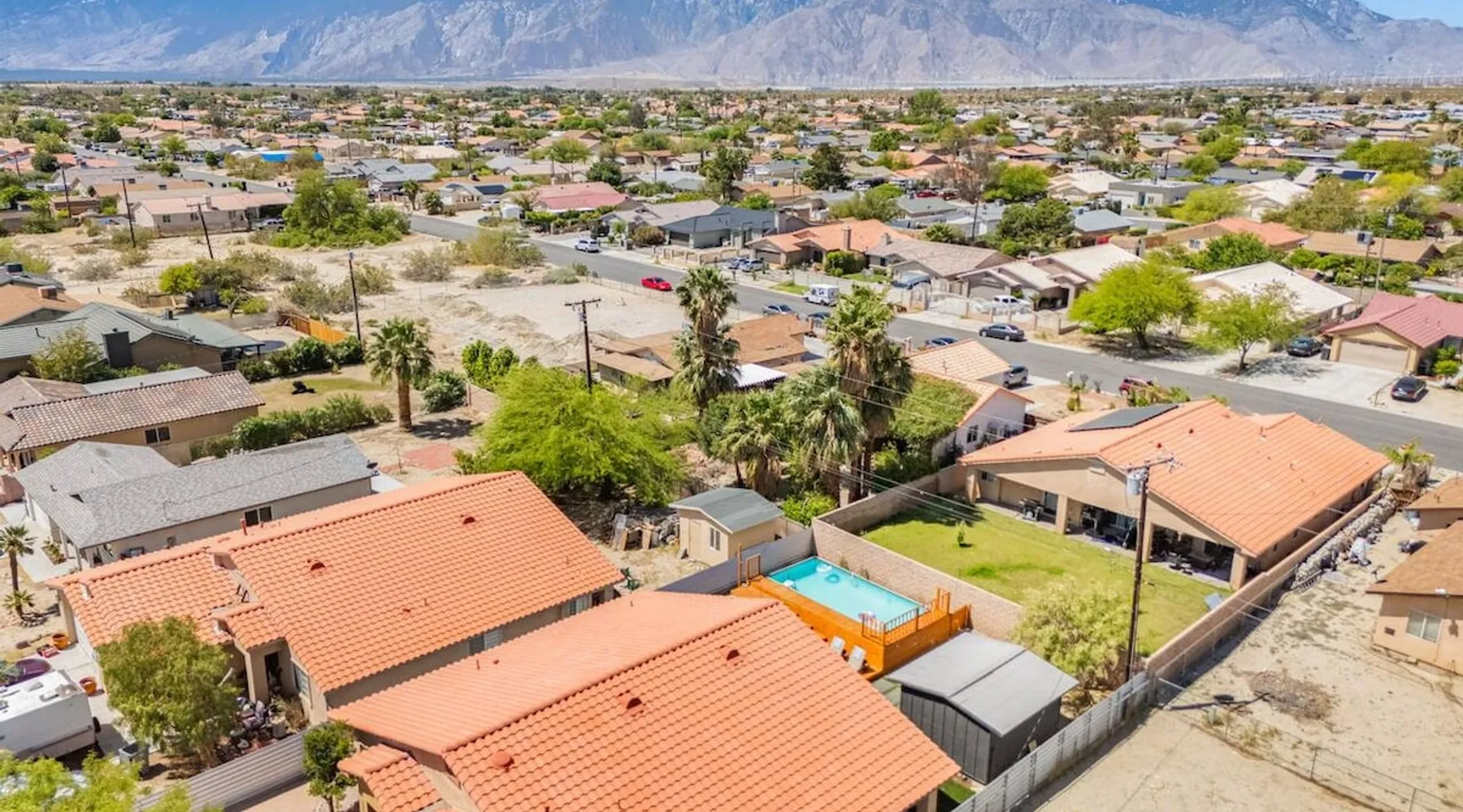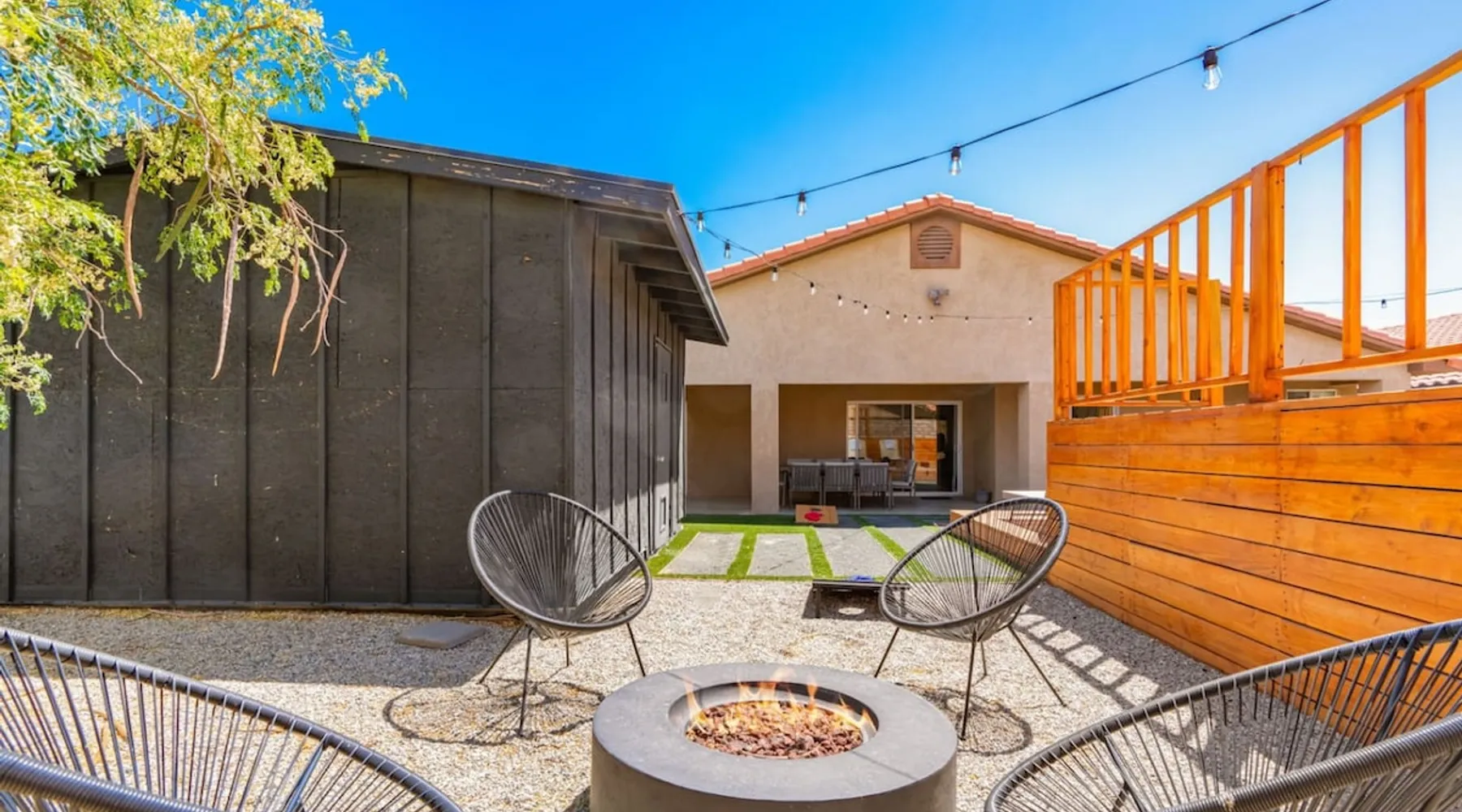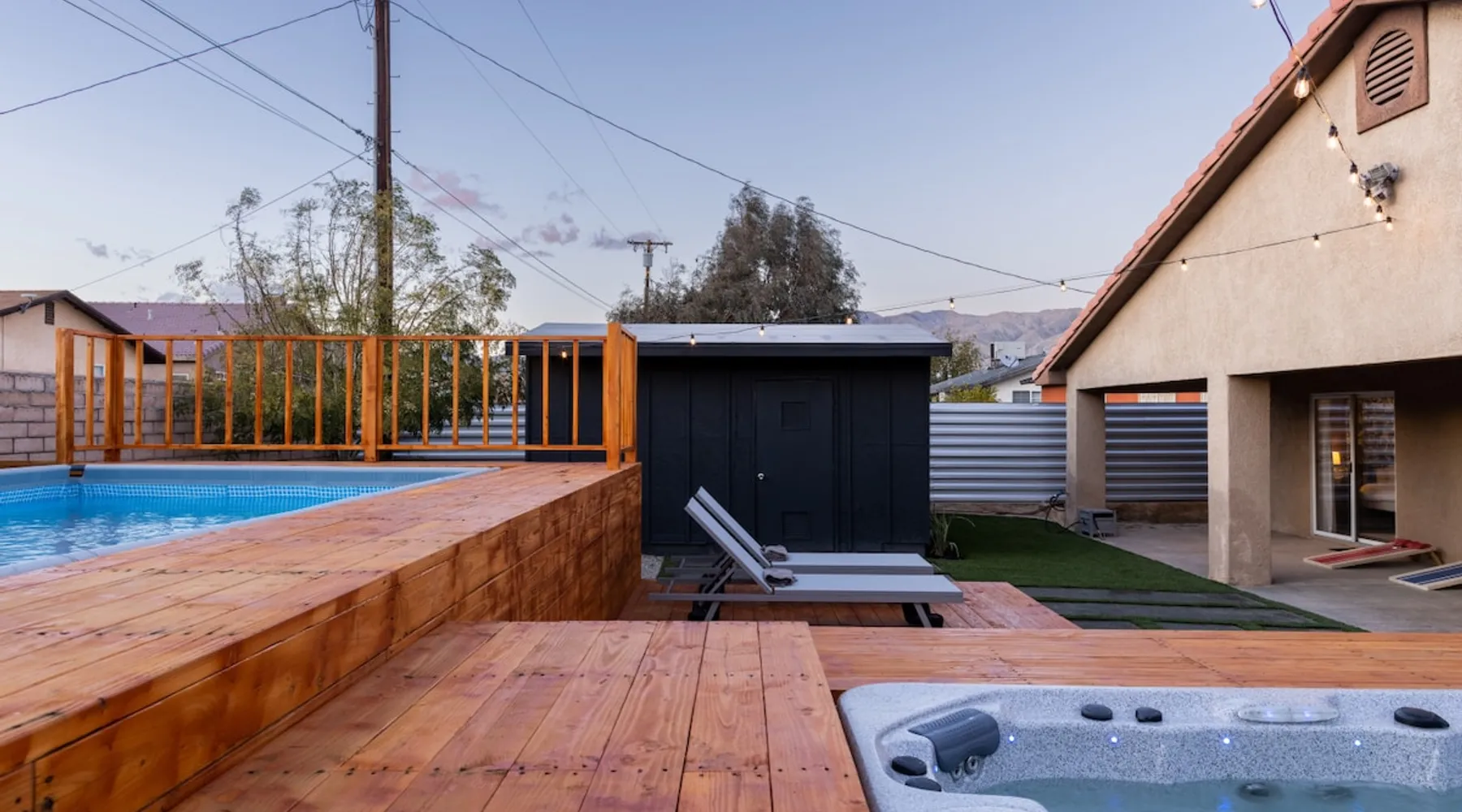 Welcome to Boho Bungalow—your private desert escape in Desert Hot Springs! Just 15 minutes from Palm Springs and 30 minutes from Joshua Tree, this modern 4-bedroom home is perfect for families, groups, or remote work retreats. Enjoy the above-ground pool and hot tub with a wrap-around deck, spacious interiors, and a fully fenced yard designed for comfort, fun, and unforgettable memories. The space ☆ Outdoor Amenities for Year-Round Enjoyment. Unwind in your private backyard oasis: • Above-ground pool and separate hot tub with wrap-around deck • Fire pit for cozy evenings under the stars • Propane BBQ grill • Corn hole & lawn games for group fun • Fully fenced yard – perfect for both play and pets ☆ Living Room • Stylish, spacious interior • Vaulted ceilings, leather sectional, accent chair • 65” Smart TV with sound bar • Article dining table seats 8 comfortably • Board games, puzzles & reading nook • Record player ☆Kitchen • Fully stocked with cookware, dinnerware for everyone • Perfect for group meals or light snacks • Modern appliances & spacious layout ☆4 Bedrooms | Sleeps 8 Comfortably ~ Primary Suite: King bed, Smart TV, black out curtains, walk-in closet and ensuite bathroom ~ Bedroom 2: Queen bed ~ Bedroom 3: Queen bed ~ Bedroom 4: Daybed with twin trundle, desk and office chair All bedrooms have sound machines, clothing storage and mirrors. ☆Bathrooms: Stocked with shampoo, conditioner, body wash, and hair dryer ☆ Laundry: Washer and dryer located in the garage for guest use ☆ Parking: The home includes a 1-car garage and space for up to 3 additional vehicles in the driveway, providing a total of 4 dedicated parking spots for your group’s convenience. Guest access ☆ Full & Private Access: As our guest, you’ll enjoy full access to every corner of Boho Bungalow, including the vibrant living spaces, fully fenced backyard, and private outdoor amenities like the pool, hot tub, fire pit, and BBQ. ☆ Contactless, 24/7 Check-In: We value your convenience and safety, which is why we offer a completely contactless check-in process. Regardless of your arrival time, you'll be able to access the property at your leisure, day or night. ☆ Digital House Manual: To make your stay as seamless as possible, you will receive a digital house manual filled with useful information about the property and local recommendations. Other things to note ☆ Family-Friendly Comfort: As parents ourselves, we know how important it is to have a space that makes traveling with little ones easier. Boho Bungalow is thoughtfully equipped for young families with a Pack 'n Play (crib sheets, sound machine and baby monitor included) and a high chair for added convenience. You'll also find a variety of books, games, and puzzles to enjoy together, plus kid-friendly dishware—including plastic plates, bowls, cups, sippy cups, and utensils—to make mealtime stress-free. ☆ Pet-Friendly Accommodations: We welcome one dog only (up to 60 lbs) for a fee of $150 per stay. This fee helps cover the additional cleaning required for pet hair. If any waste beyond hair (such as urine or feces) is found, an additional $200 cleaning fee will be charged. Guests are responsible for cleaning up after their pet, and dogs should not be left unattended in the home, as barking may disturb neighbors. Please note: Dogs are not allowed in the pool. Please let us know if you are traveling with a dog ☆ Desert Living: Our home is nestled in the beautiful Coachella Valley desert, where wind can occasionally blow sand or leaves into the pool. While our pool cleaners visit only Monday and Thursday to keep the water sparkling, we’ve also provided skimmers for your convenience if you'd like to clear any debris in between. Our gardener visits weekly on Mondays to maintain the yard. STR Permit #003584