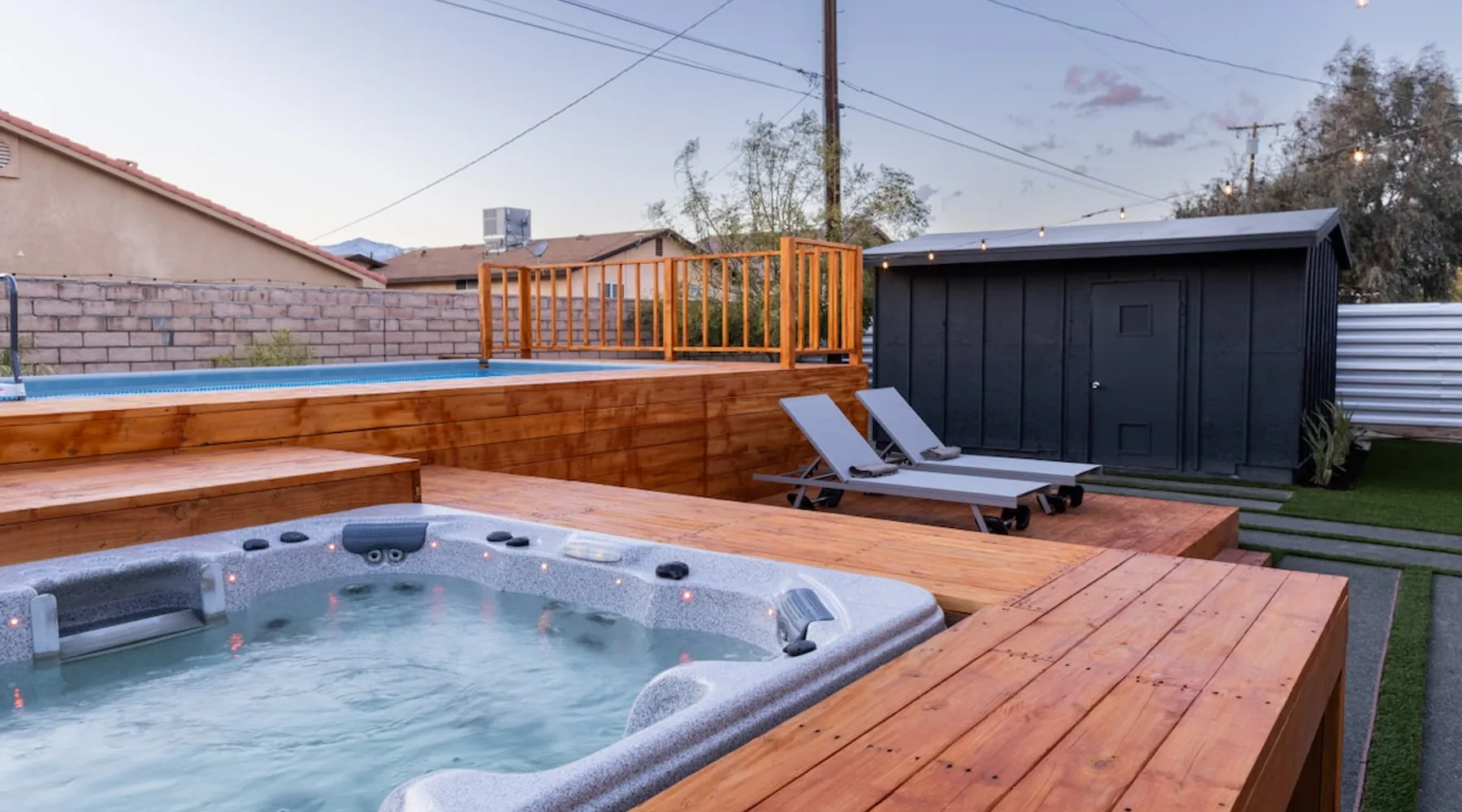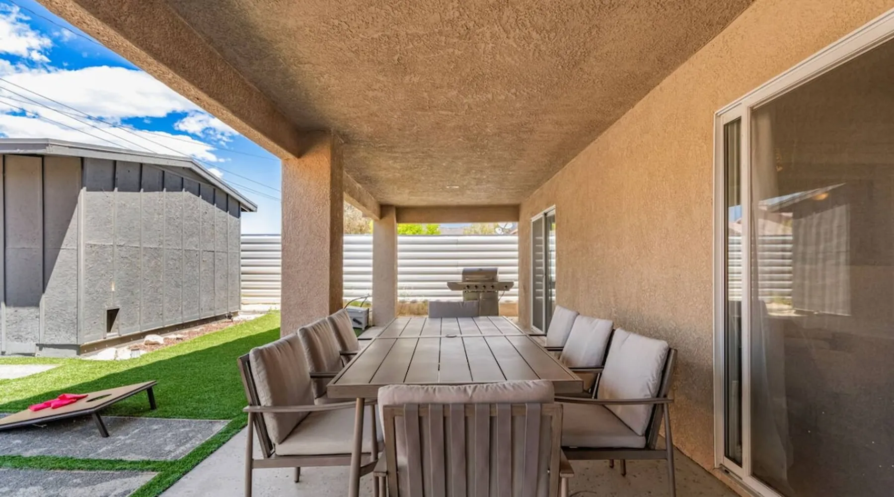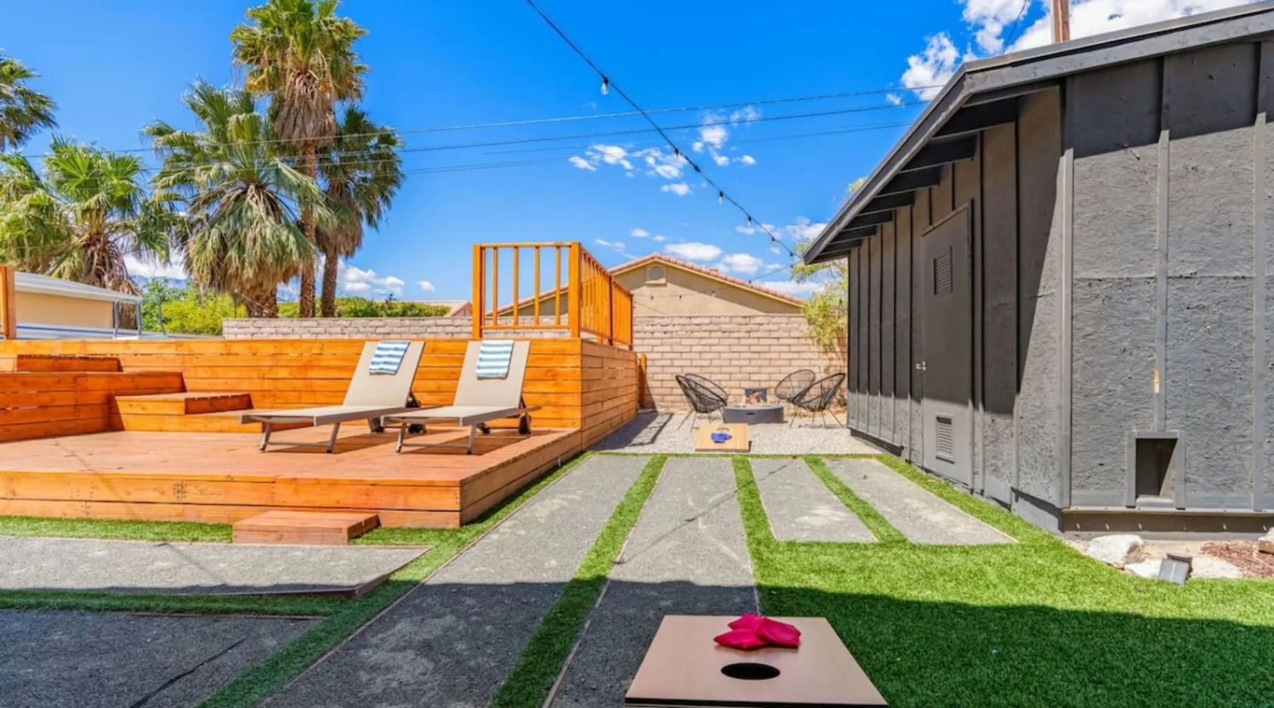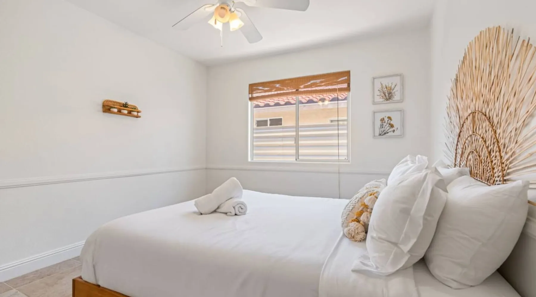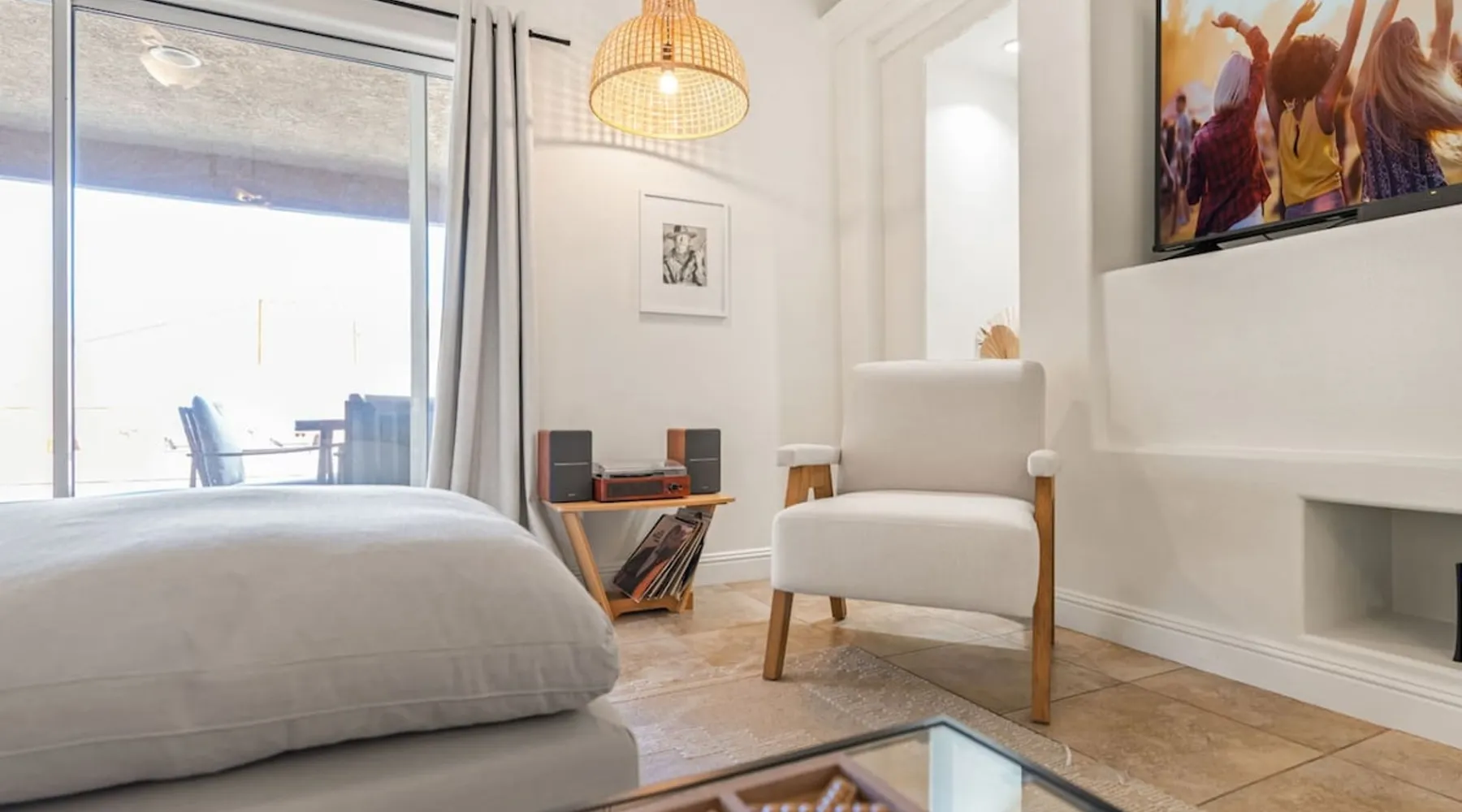 Welcome to Boho Bungalow—your private desert escape in Desert Hot Springs! Just 15 minutes from Palm Springs and 30 minutes from Joshua Tree, this modern 4-bedroom home is perfect for families, groups, or remote work retreats. Enjoy the above-ground pool and hot tub with a wrap-around deck, spacious interiors, and a fully fenced yard designed for comfort, fun, and unforgettable memories. The space ☆ Outdoor Amenities for Year-Round Enjoyment. Unwind in your private backyard oasis: • Above-ground pool and separate hot tub with wrap-around deck • Fire pit for cozy evenings under the stars • Propane BBQ grill • Corn hole & lawn games for group fun • Fully fenced yard – perfect for both play and pets ☆ Living Room • Stylish, spacious interior • Vaulted ceilings, leather sectional, accent chair • 65” Smart TV with sound bar • Article dining table seats 8 comfortably • Board games, puzzles & reading nook • Record player ☆Kitchen • Fully stocked with cookware, dinnerware for everyone • Perfect for group meals or light snacks • Modern appliances & spacious layout ☆4 Bedrooms | Sleeps 8 Comfortably ~ Primary Suite: King bed, Smart TV, black out curtains, walk-in closet and ensuite bathroom ~ Bedroom 2: Queen bed ~ Bedroom 3: Queen bed ~ Bedroom 4: Daybed with twin trundle, desk and office chair All bedrooms have sound machines, clothing storage and mirrors. ☆Bathrooms: Stocked with shampoo, conditioner, body wash, and hair dryer ☆ Laundry: Washer and dryer located in the garage for guest use ☆ Parking: The home includes a 1-car garage and space for up to 3 additional vehicles in the driveway, providing a total of 4 dedicated parking spots for your group’s convenience. Guest access ☆ Full & Private Access: As our guest, you’ll enjoy full access to every corner of Boho Bungalow, including the vibrant living spaces, fully fenced backyard, and private outdoor amenities like the pool, hot tub, fire pit, and BBQ. ☆ Contactless, 24/7 Check-In: We value your convenience and safety, which is why we offer a completely contactless check-in process. Regardless of your arrival time, you'll be able to access the property at your leisure, day or night. ☆ Digital House Manual: To make your stay as seamless as possible, you will receive a digital house manual filled with useful information about the property and local recommendations. Other things to note ☆ Family-Friendly Comfort: As parents ourselves, we know how important it is to have a space that makes traveling with little ones easier. Boho Bungalow is thoughtfully equipped for young families with a Pack 'n Play (crib sheets, sound machine and baby monitor included) and a high chair for added convenience. You'll also find a variety of books, games, and puzzles to enjoy together, plus kid-friendly dishware—including plastic plates, bowls, cups, sippy cups, and utensils—to make mealtime stress-free. ☆ Pet-Friendly Accommodations: We welcome one dog only (up to 60 lbs) for a fee of $150 per stay. This fee helps cover the additional cleaning required for pet hair. If any waste beyond hair (such as urine or feces) is found, an additional $200 cleaning fee will be charged. Guests are responsible for cleaning up after their pet, and dogs should not be left unattended in the home, as barking may disturb neighbors. Please note: Dogs are not allowed in the pool. Please let us know if you are traveling with a dog ☆ Desert Living: Our home is nestled in the beautiful Coachella Valley desert, where wind can occasionally blow sand or leaves into the pool. While our pool cleaners visit only Monday and Thursday to keep the water sparkling, we’ve also provided skimmers for your convenience if you'd like to clear any debris in between. Our gardener visits weekly on Mondays to maintain the yard. STR Permit #003584