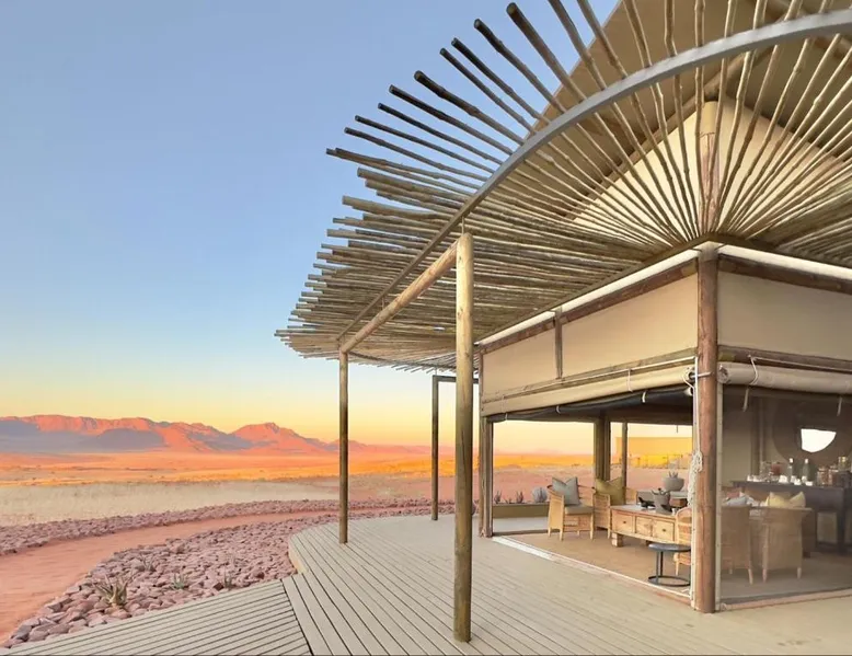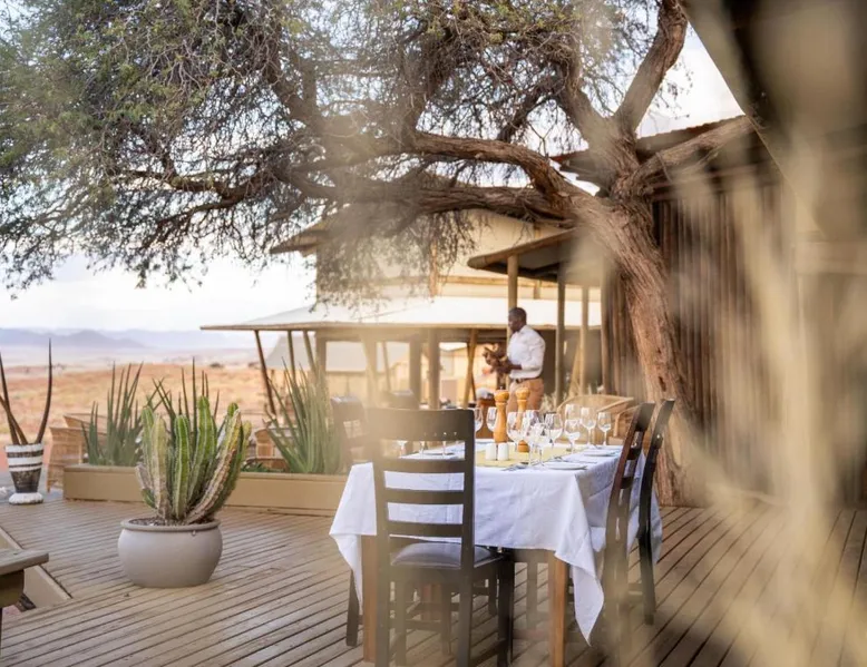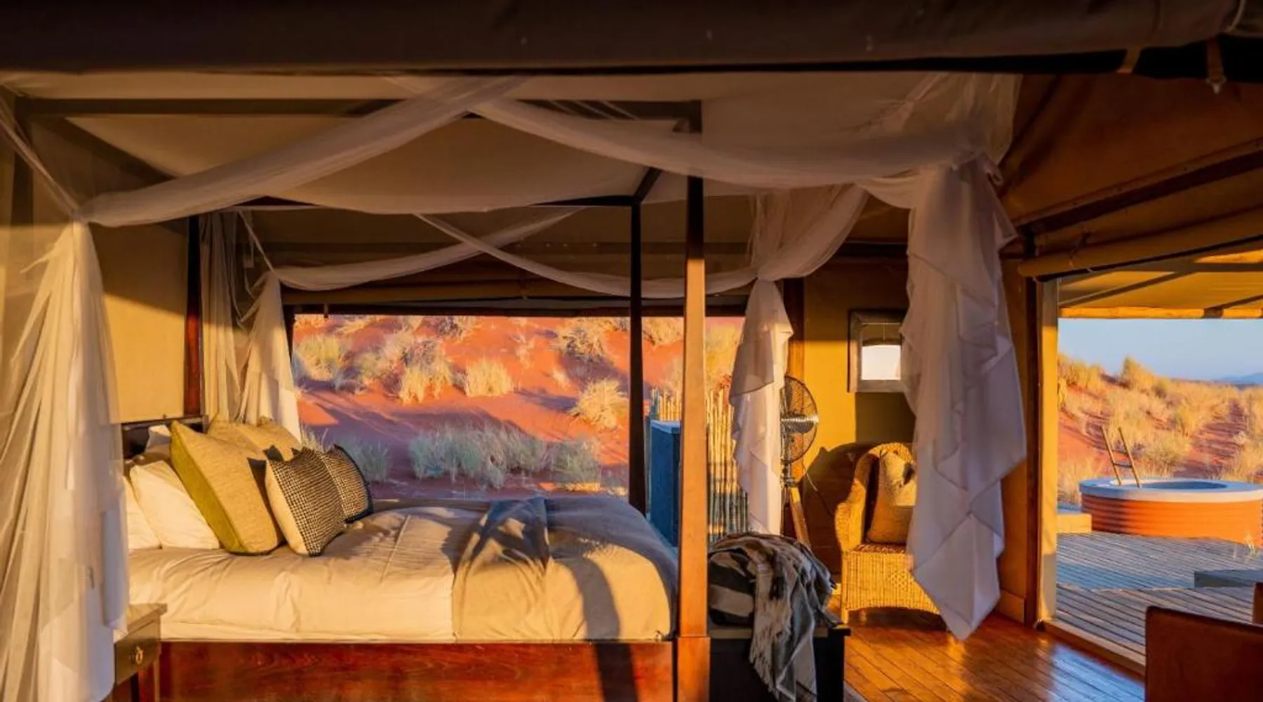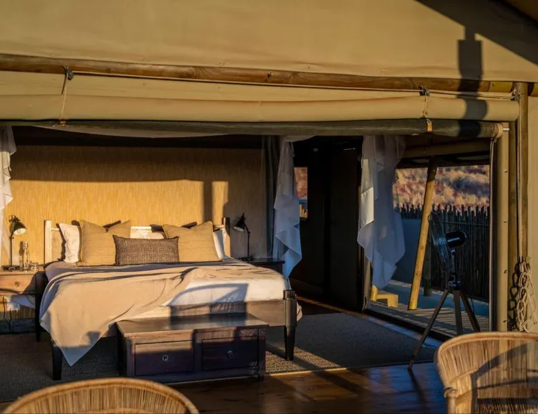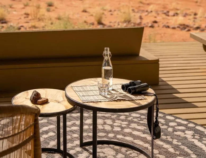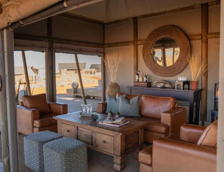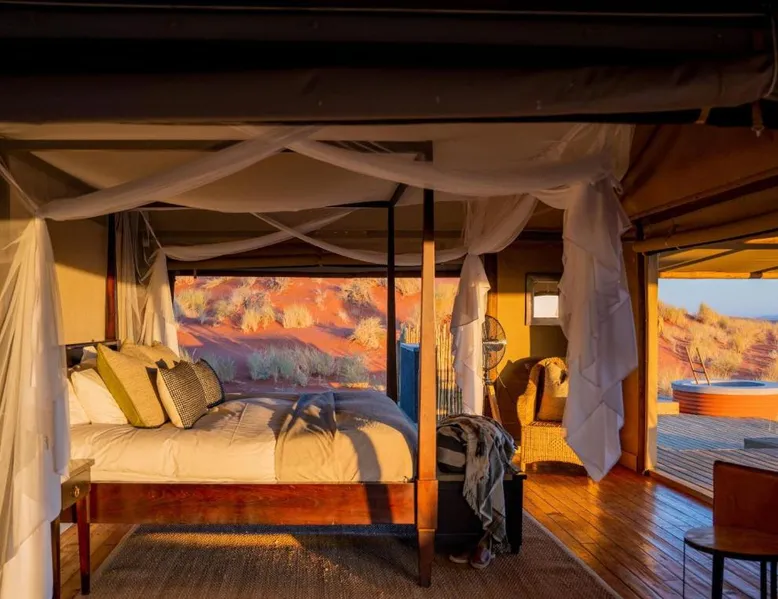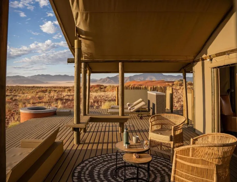 Elegant Accommodations: Wolwedans Dune Camp in NamibRand offers a lodge experience with a terrace and free WiFi. Guests can relax in the outdoor dining area or enjoy the pool and mountain views. Comfortable Amenities: The lodge features a terrace, patio, tea and coffee maker, and a work desk. Free toiletries and a shower enhance the stay. Delicious Breakfast: A continental breakfast is served each morning, providing a perfect start to the day. Convenient Location: Located in Namibrand, the lodge is surrounded by stunning landscapes, offering a unique and memorable experience. A seating area, a desk, a terrace and a tea and coffee maker are offered in this tent. The unit has 2 beds.