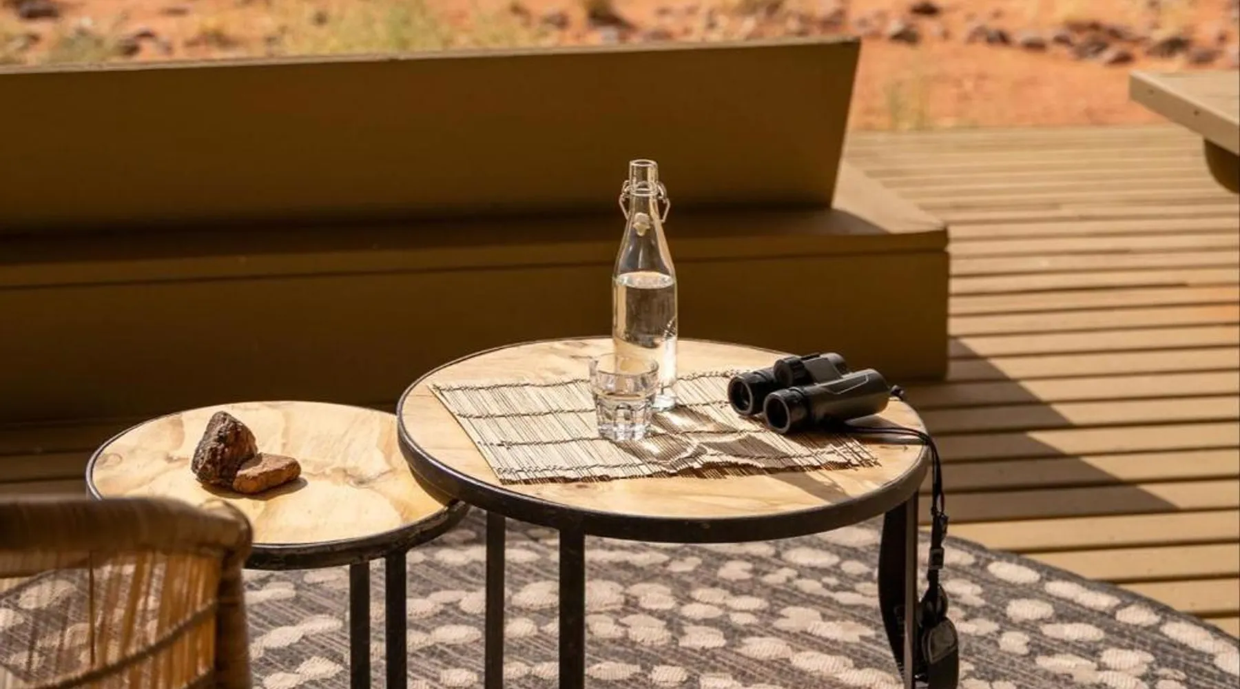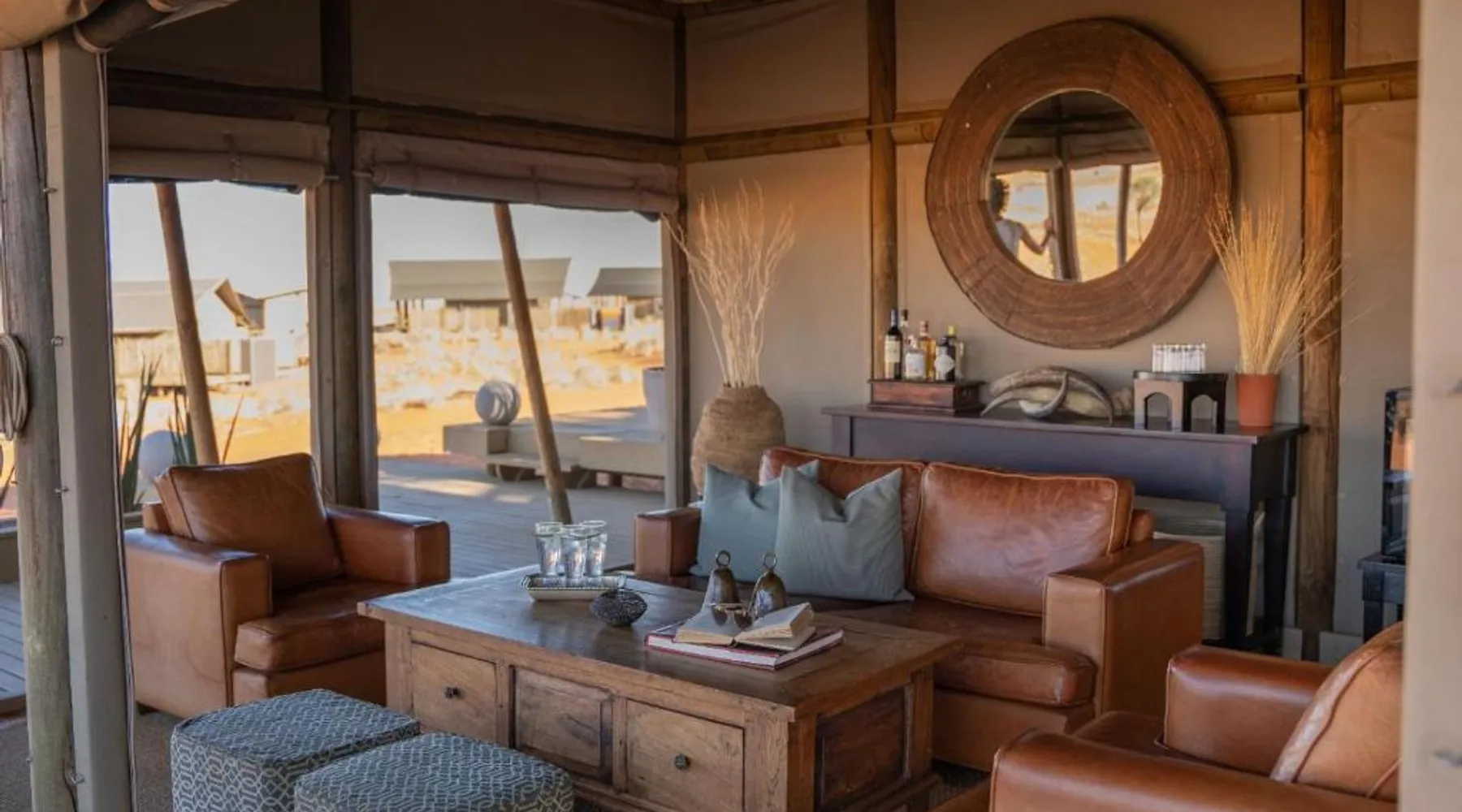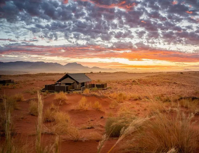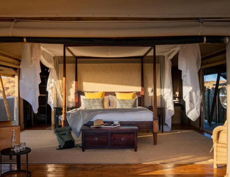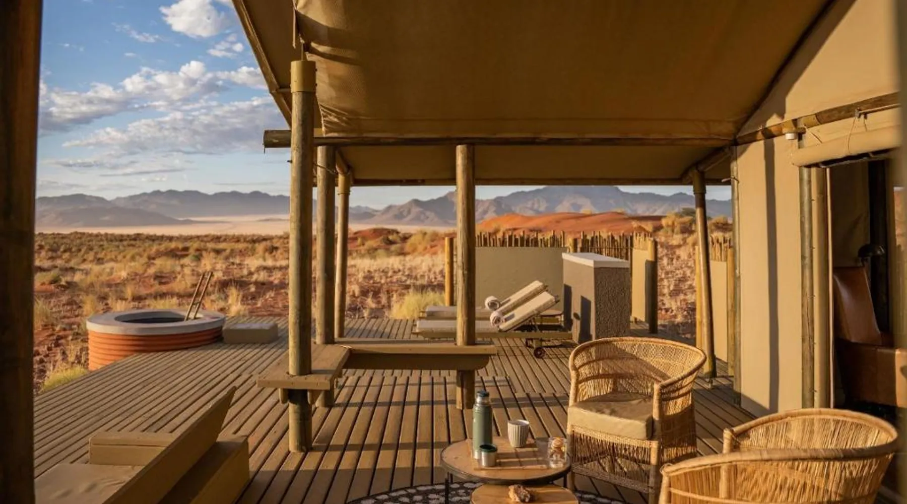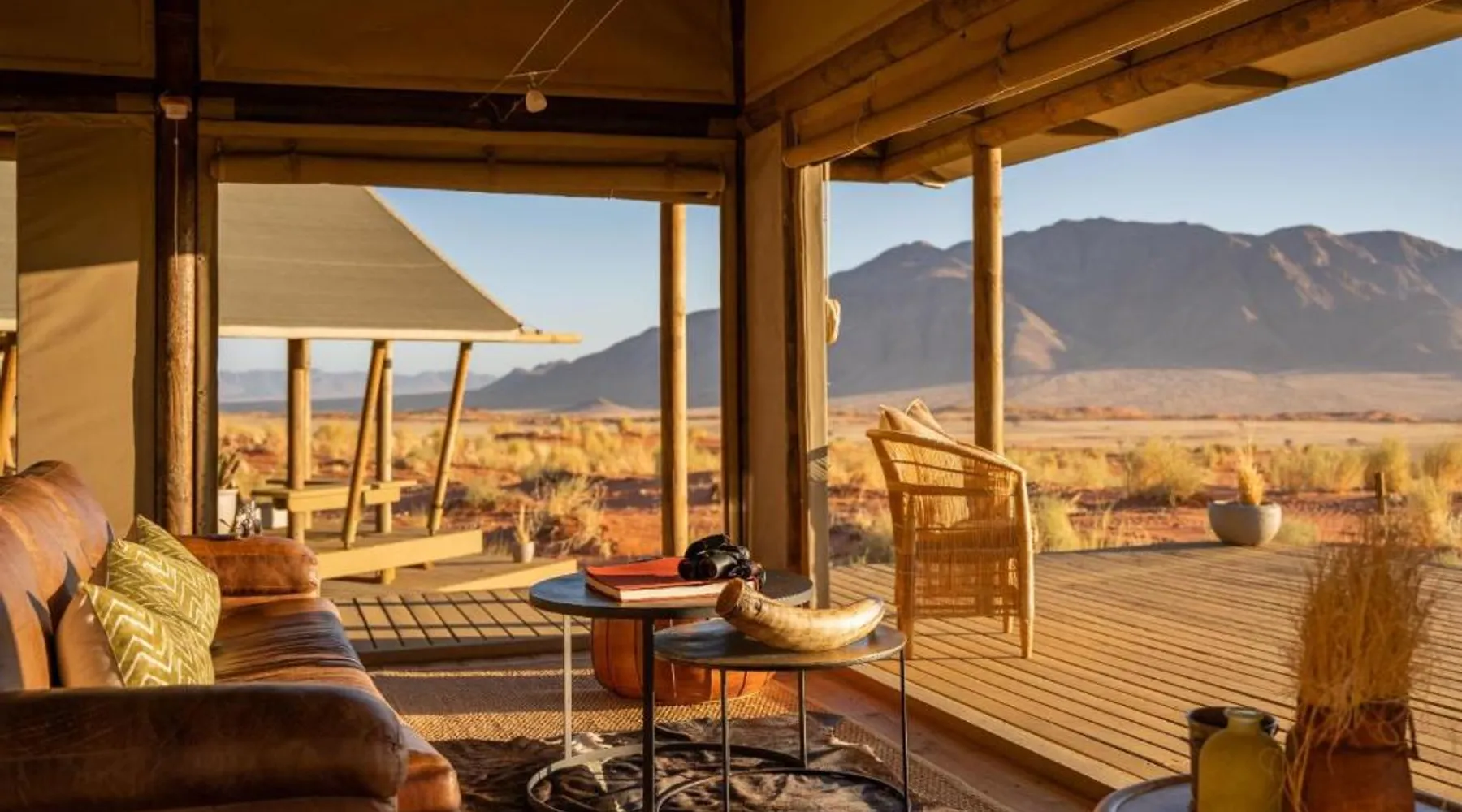 Elegant Accommodations: Wolwedans Dune Camp in NamibRand offers a lodge experience with a terrace and free WiFi. Guests can relax in the outdoor dining area or enjoy the pool and mountain views. Comfortable Amenities: The lodge features a terrace, patio, tea and coffee maker, and a work desk. Free toiletries and a shower enhance the stay. Delicious Breakfast: A continental breakfast is served each morning, providing a perfect start to the day. Convenient Location: Located in Namibrand, the lodge is surrounded by stunning landscapes, offering a unique and memorable experience. A seating area, a desk, a terrace and a tea and coffee maker are offered in this tent. The unit has 2 beds.
