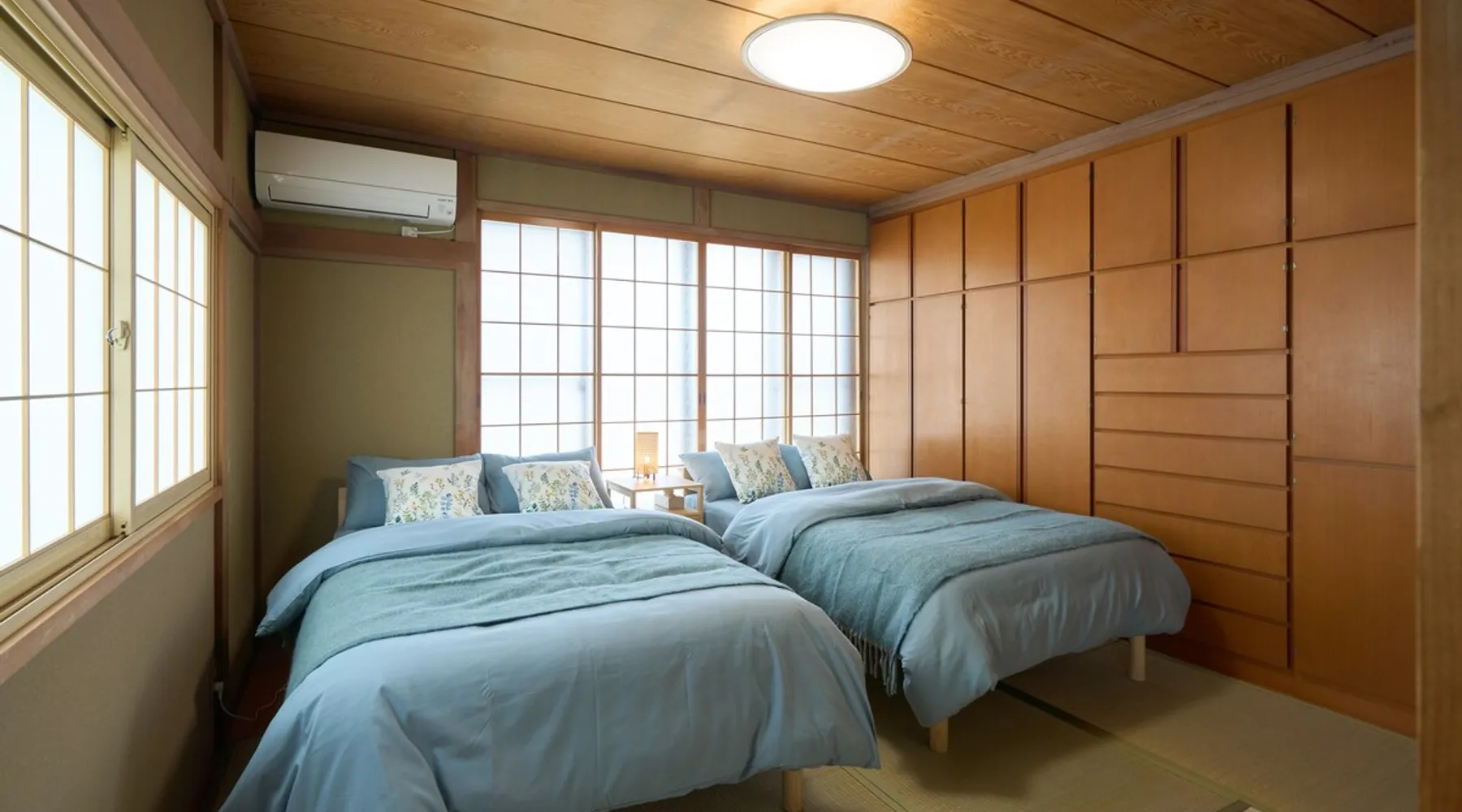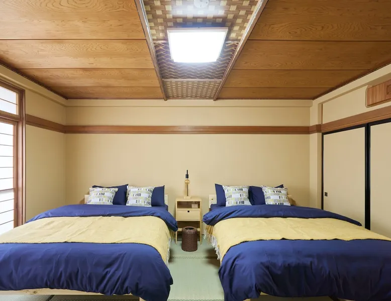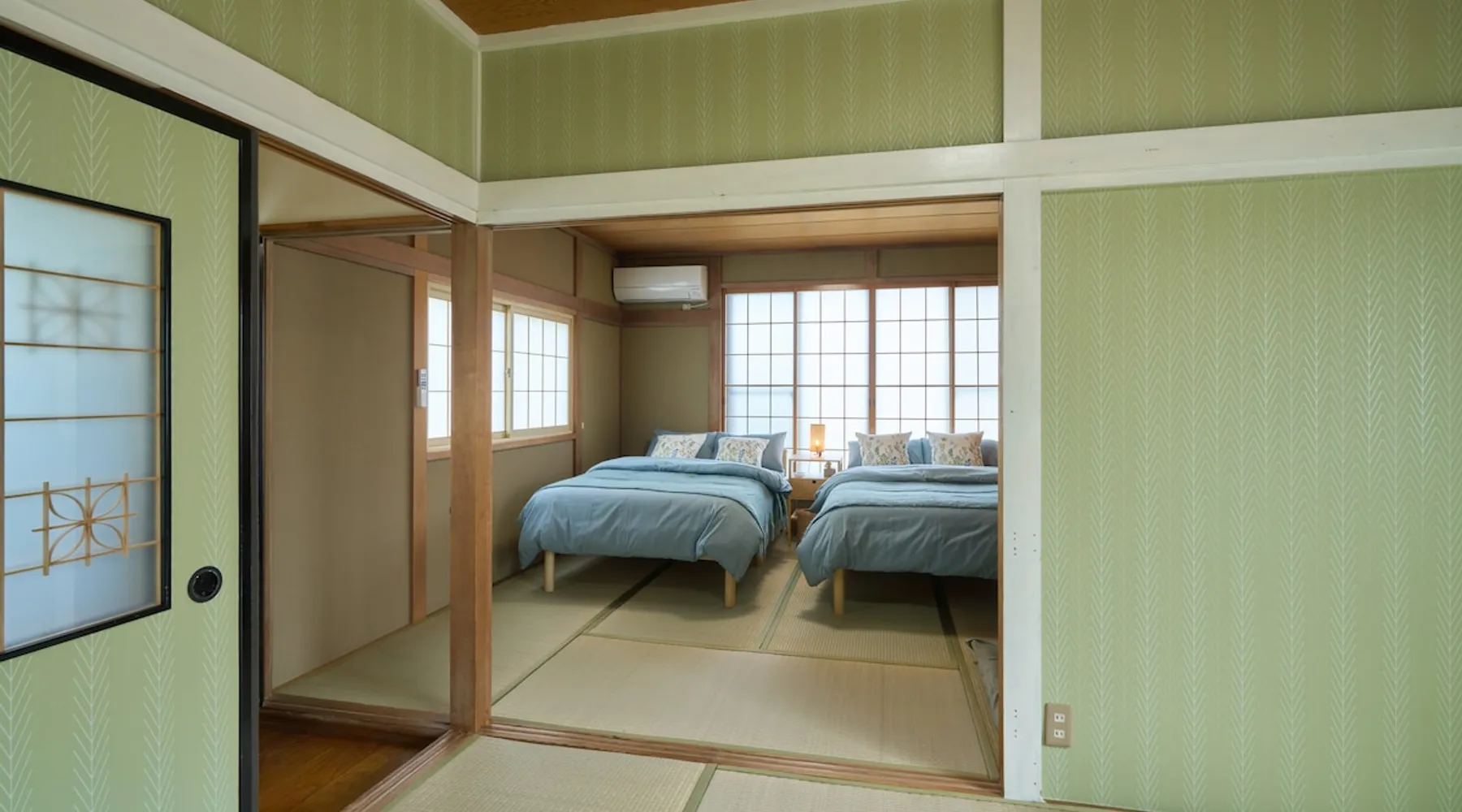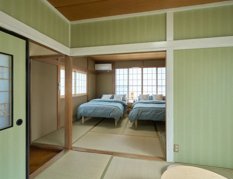 Located in the heart of Hachinohe, this large-capacity accommodation can be used by friends, families, or relatives. Close to the center of the city, convenient to get anywhere.There are 2 rooms with 2 gently connected bedrooms, and 1 separate room, so 3 families can stay at the same time. You can cook yourself in the large dining kitchen.Aladdin's projector is installed in the large Japanese-style room on the ground floor.You can enjoy your favorite content, such as TV, Netflix, YouTube, and games, on a large screen. It is a 5-minute walk to the center of the city and a 7-minute walk to the famous Miroku Yokocho.Shinmeigu, where the floats of the Hachinohe Sansha Taisai, a summer tradition, are located diagonally in front. It can be used for large groups, such as class reunions, gatherings of close friends, families, relatives, and training camps.Please use it for sightseeing in Aomori, based in Hachinohe. The space This is a rental house in one building. There is a 12-tatami Japanese-style room (Akane) in front of you from the large dirt room, and you can use it as a gathering room or as a bedroom.There is a lighting and projector, so you can enjoy video and games on the large screen. At the end of the long hallway, there is a large dining kitchen (oven).There is also a refrigerator, rice cooker, dishes, cooking utensils, etc., so please feel free to use them. On the first floor, there is a bath, washroom, and a toilet with a washlet.It is also fully equipped with a washing machine and clothes drying hangers. There are four rooms on the second floor. There are two Japanese-style rooms with 10 tatami mats (Yamabuki) and 8 tatami mats (kogane). This room has two Japanese-style rooms with 8 tatami mats (Toawa) and 6 tatami mats. Yamabuki (10 tatami mats) has 2 double beds, and Kogane (8 tatami mats) has 5 single futon sets. There are 2 semi-double beds in Tokiwa (8 tatami mats) and 4 single futon sets in Matsuba (6 tatami mats). There are also 3 sets of single futons in the ground floor room (12 tatami mats). Depending on the number of guests and the room, please move the futon, etc. * If a large car passes on the road in front of you, the house may vibrate, but please rest assured it is not an earthquake. ===== 1st floor [Akane] 12 tatami mat Japanese-style room with projector 2 sets of single futons [Kamado] 12.5 tatami dining kitchen 2nd floor [Yamabuki] 10 tatami Japanese-style room · 2 double beds [Kogane] 8 tatami mat Japanese-style room · 2 sets of single futons [Tokiwa] Japanese-style room with 8 tatami mats and 2 semi-double beds [Matsubo] 6 tatami mat Japanese-style room · 2 sets of single futons Guest access You can use all rooms on the 1st and 2nd floors. Please refrain from entering the first floor courtyard from the back door of the dining kitchen. Other things to note All rooms are non-smoking🚭 Please smoke outdoors with your own ashtray. If we find out that you smoked, we will charge you a cleaning fee of 20,000 yen. Registration Details Hotels and Inns Business Act | 八戸市保健所 | 八戸市保健指令第144号
