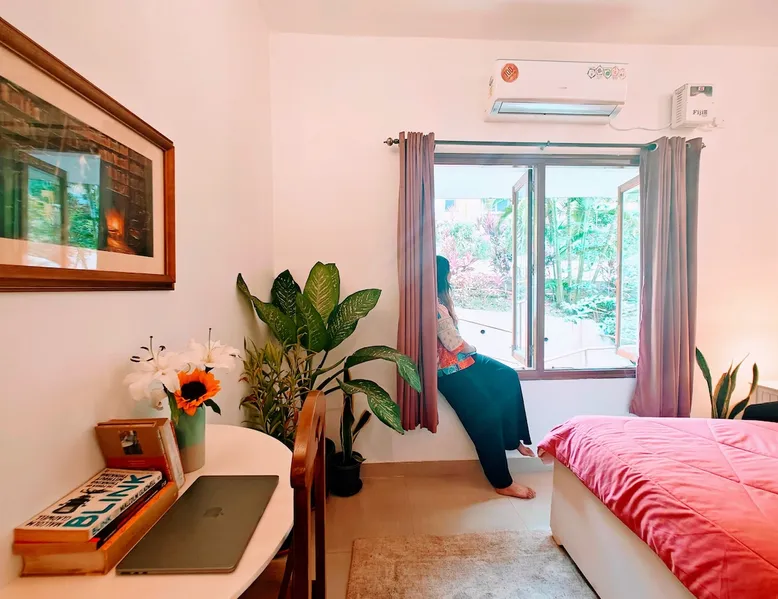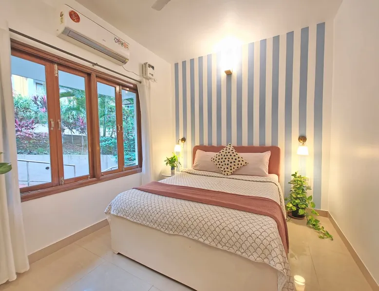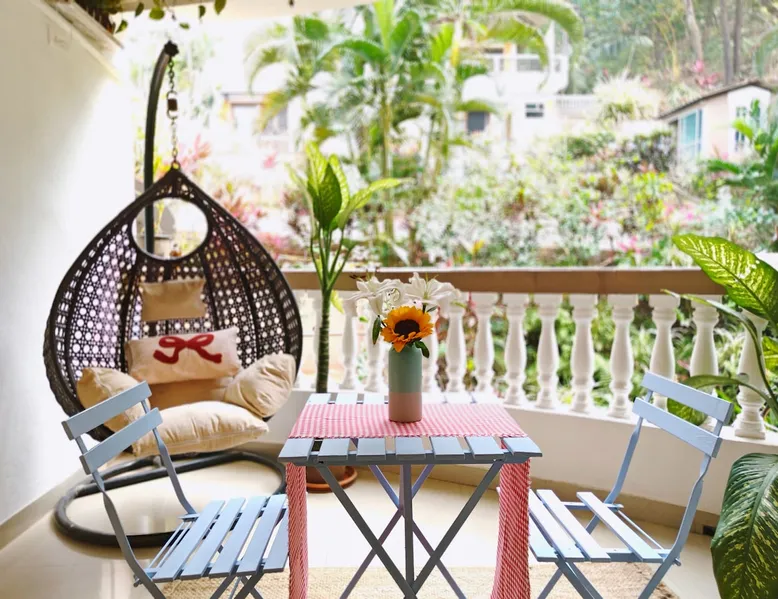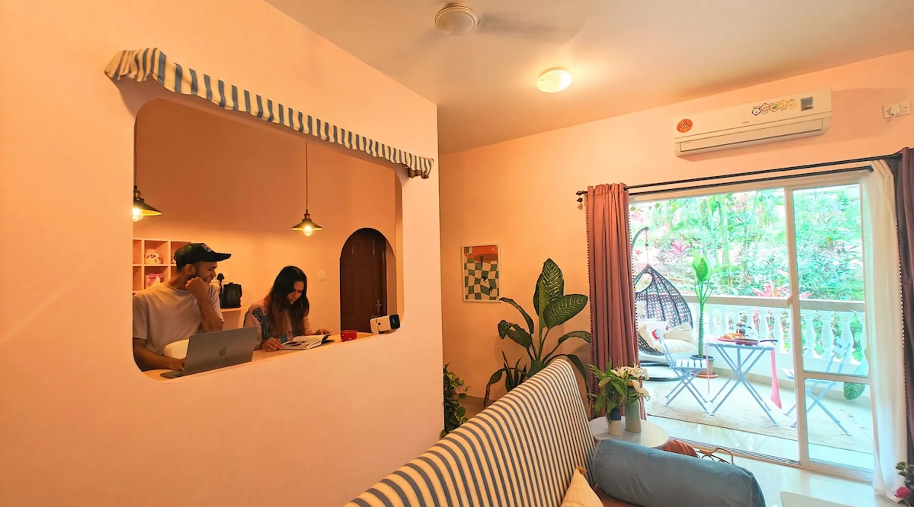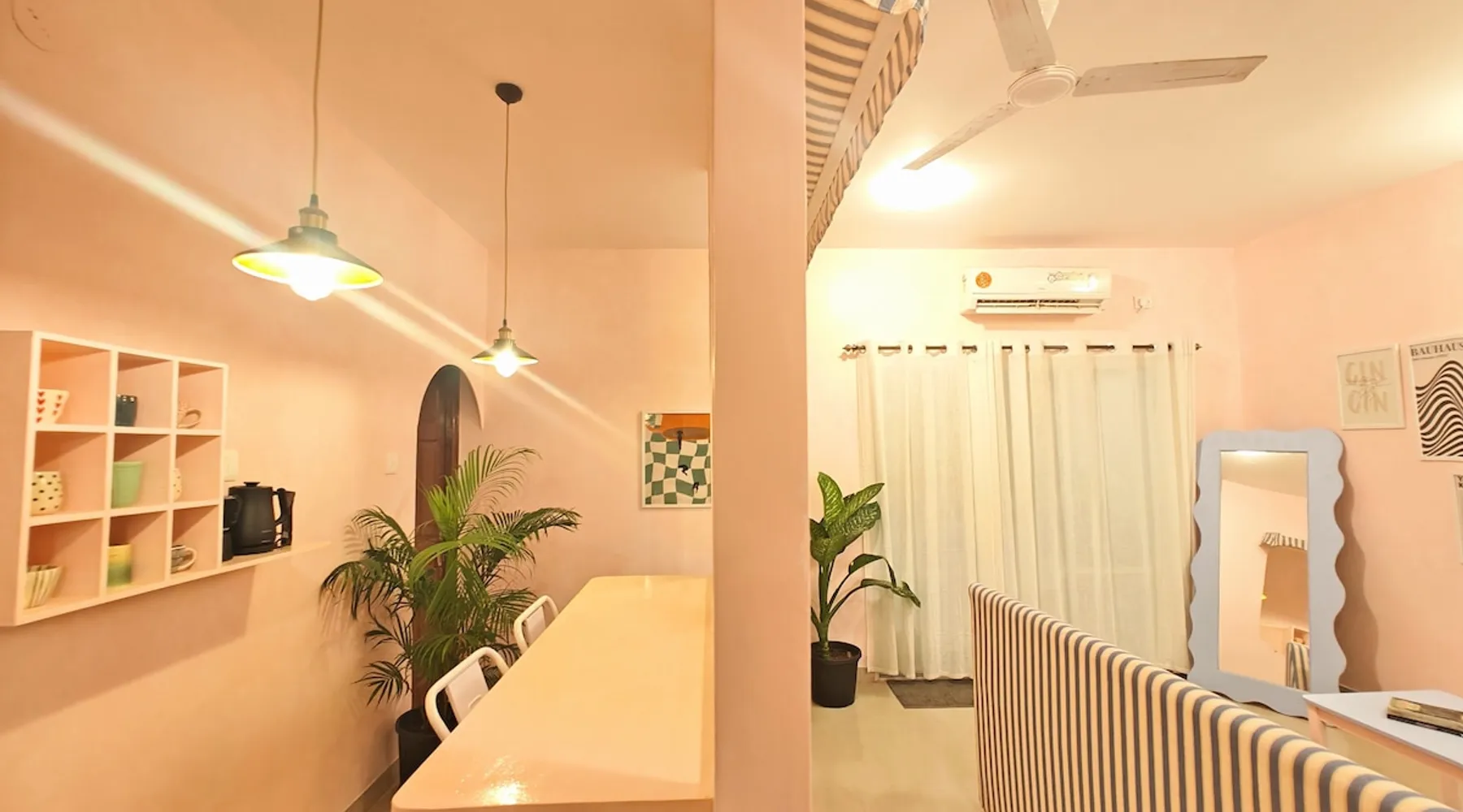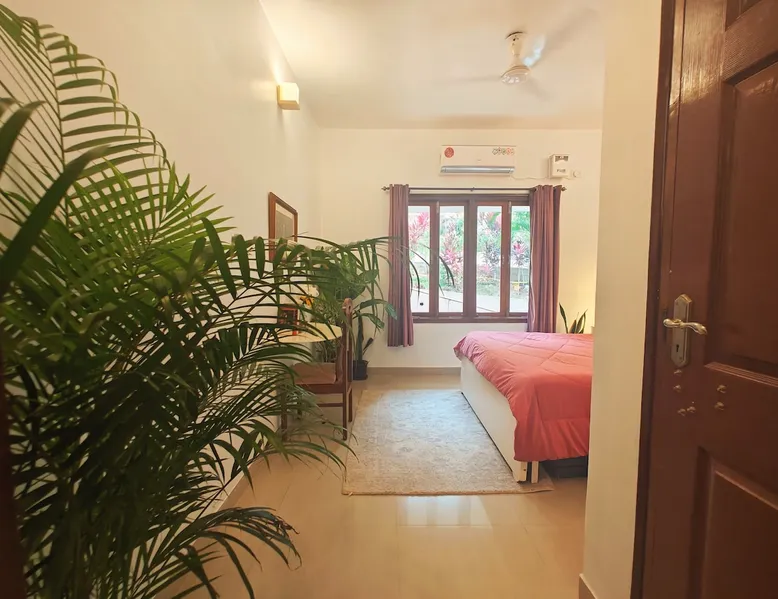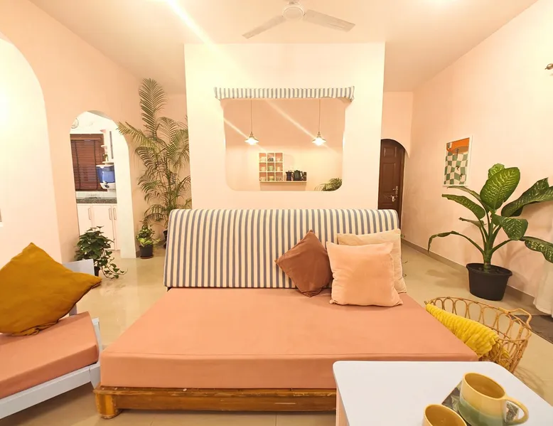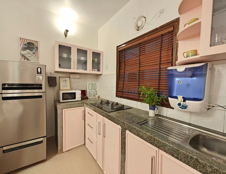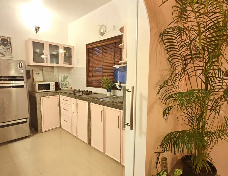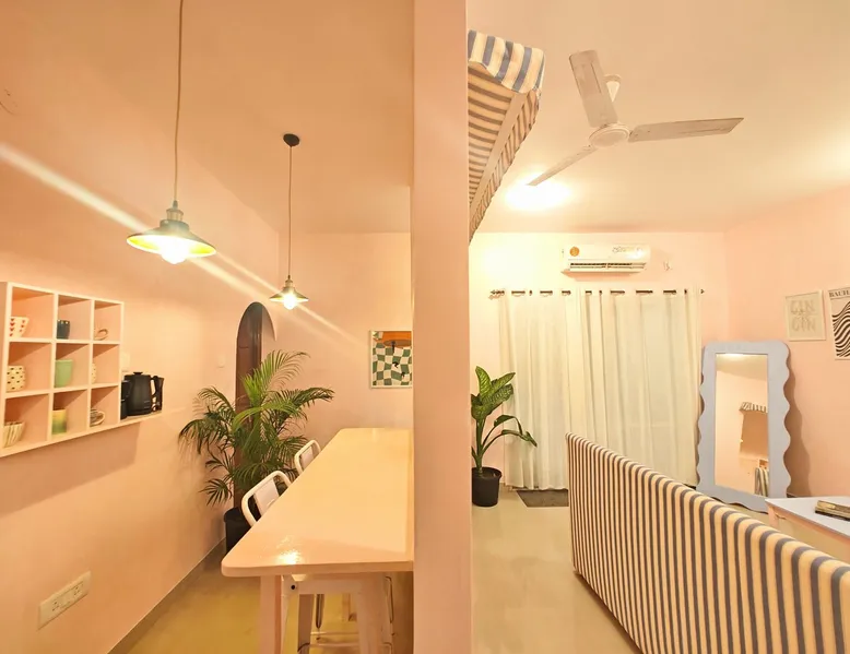 Nestled in the lush hills of Vadi, Siolim, Mocha is a spacious 1 BHK designed for comfort. With glass windows overlooking greenery, a cozy bedroom, en-suite bathroom, and a living room with a sofa-cum-bed & projector for OTT movie nights, Mocha is the perfect blend of style and relaxation. The cafe-inspired nook, with a work/dining table, makes it ideal for staycations. Explore Siolim's cafes bars, with Anjuna, Vagator, Assagao & Morjim, Mandrem beaches 15-20 min away & 35 min from MOPA airport. The space As you step inside Mocha, you’ll find a cozy little nook reminiscent of a cafe at home. Sip on freshly brewed coffee from a collection of cute mugs, get some work done at the cafe-inspired space, or just enjoy the laid-back vibe. The living room features a low, comfy sofa-cum-bed, perfect for lounging or enjoying movie nights on the king-sized wall projection, complete with a smart projector equipped with all OTT platforms. The bedroom is warm and inviting, featuring a full-sized storage cupboard and a cozy en-suite bathroom. The kitchen is fully equipped with a 4-burner hob, oven, fridge, and RO system for fresh water, ensuring you can whip up a snack or meal with ease. The balcony offers breathtaking views of the lush green hill behind the apartment, making it an ideal spot to unwind. Other things to note Local Gems @ Walking Distance: The Blue Wagon Cafe & Sabr Coffee: Great food, cozy vibes, 5 minutes walk away Boiler Maker: Amazing cocktails & fresh beers (5 pm–12 am), 6 minutes walk away Rare Republic: Great cafe open till 8 pm (closed Wednesdays) just downstairs in the same building Coastal Spice: Delicious Goan thali & elaborate menu Thalassa, Summerhouse, Kiki & C’est la Vie: Perfect for sundowners with stunning views. Moto Cafe: Great dive bar for nostalgic rock vibe For Groceries/Daily Needs: Swiggy Instamart & Blinkit deliver in 15 mins round the clock Nearby supermarkets: AJ’s, Jimmy’s supermarket in Siolim are a 10 min drive away, and Kavita Super market in Siolim (open till midnight). Distance to Beaches & Airports (Drive Time): Vagator Beach: 10 mins Morjim Beach: 15 mins Chapora Fort & Street: 7 mins GOI Airport (Dabolim): 1.5 hours GOX Airport (Mopa): 1 hour Important Note: Minor electricity fluctuations may occur during the rains, a common occurrence in Goa. Mocha has an internal power backup for WiFi, fans, bedside sockets, and essential lights. However, the AC, geyser, and some lights won’t work on backup. Rest assured, we’re always in touch with the electricity department for speedy resolutions! Order food via Swiggy/Zomato, grab beers from the wine shop outside, or explore countless dining and sunset spots nearby. Mocha is your perfect retreat for a memorable staycation in Goa! 🌿✨ You said: Registration Details HOT24NI2778