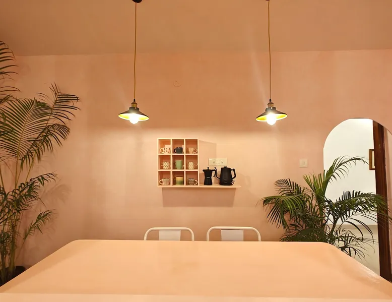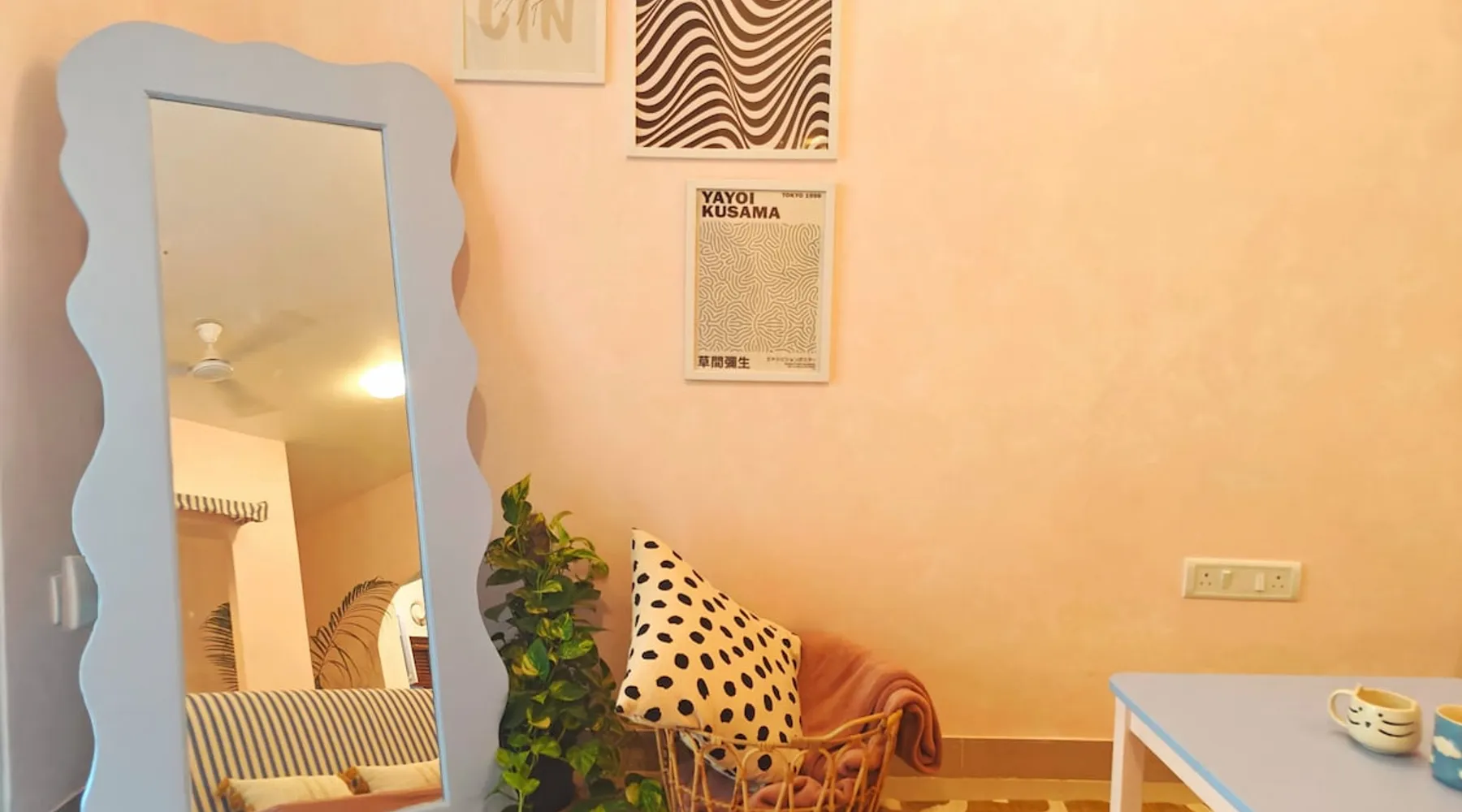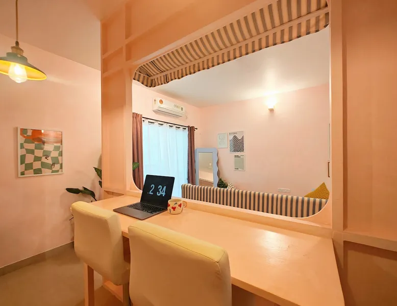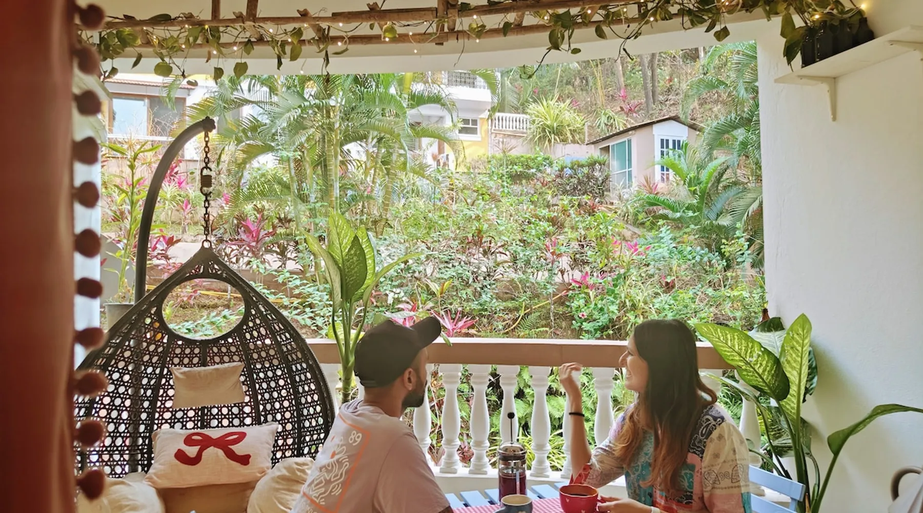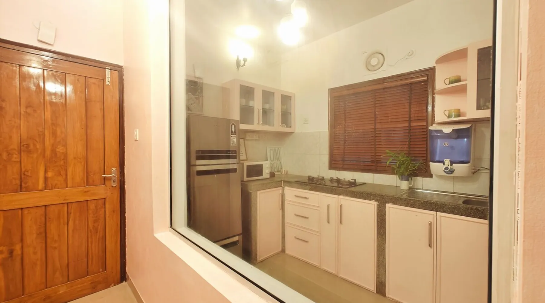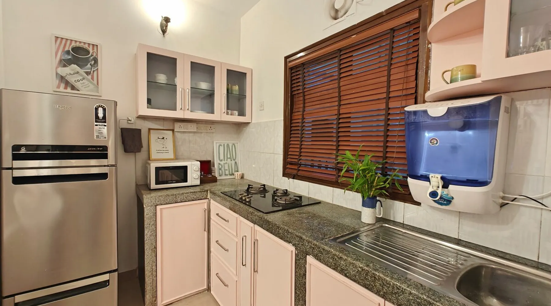 Nestled in the lush hills of Vadi, Siolim, Mocha is a spacious 1 BHK designed for comfort. With glass windows overlooking greenery, a cozy bedroom, en-suite bathroom, and a living room with a sofa-cum-bed & projector for OTT movie nights, Mocha is the perfect blend of style and relaxation. The cafe-inspired nook, with a work/dining table, makes it ideal for staycations. Explore Siolim's cafes bars, with Anjuna, Vagator, Assagao & Morjim, Mandrem beaches 15-20 min away & 35 min from MOPA airport. The space As you step inside Mocha, you’ll find a cozy little nook reminiscent of a cafe at home. Sip on freshly brewed coffee from a collection of cute mugs, get some work done at the cafe-inspired space, or just enjoy the laid-back vibe. The living room features a low, comfy sofa-cum-bed, perfect for lounging or enjoying movie nights on the king-sized wall projection, complete with a smart projector equipped with all OTT platforms. The bedroom is warm and inviting, featuring a full-sized storage cupboard and a cozy en-suite bathroom. The kitchen is fully equipped with a 4-burner hob, oven, fridge, and RO system for fresh water, ensuring you can whip up a snack or meal with ease. The balcony offers breathtaking views of the lush green hill behind the apartment, making it an ideal spot to unwind. Other things to note Local Gems @ Walking Distance: The Blue Wagon Cafe & Sabr Coffee: Great food, cozy vibes, 5 minutes walk away Boiler Maker: Amazing cocktails & fresh beers (5 pm–12 am), 6 minutes walk away Rare Republic: Great cafe open till 8 pm (closed Wednesdays) just downstairs in the same building Coastal Spice: Delicious Goan thali & elaborate menu Thalassa, Summerhouse, Kiki & C’est la Vie: Perfect for sundowners with stunning views. Moto Cafe: Great dive bar for nostalgic rock vibe For Groceries/Daily Needs: Swiggy Instamart & Blinkit deliver in 15 mins round the clock Nearby supermarkets: AJ’s, Jimmy’s supermarket in Siolim are a 10 min drive away, and Kavita Super market in Siolim (open till midnight). Distance to Beaches & Airports (Drive Time): Vagator Beach: 10 mins Morjim Beach: 15 mins Chapora Fort & Street: 7 mins GOI Airport (Dabolim): 1.5 hours GOX Airport (Mopa): 1 hour Important Note: Minor electricity fluctuations may occur during the rains, a common occurrence in Goa. Mocha has an internal power backup for WiFi, fans, bedside sockets, and essential lights. However, the AC, geyser, and some lights won’t work on backup. Rest assured, we’re always in touch with the electricity department for speedy resolutions! Order food via Swiggy/Zomato, grab beers from the wine shop outside, or explore countless dining and sunset spots nearby. Mocha is your perfect retreat for a memorable staycation in Goa! 🌿✨ You said: Registration Details HOT24NI2778