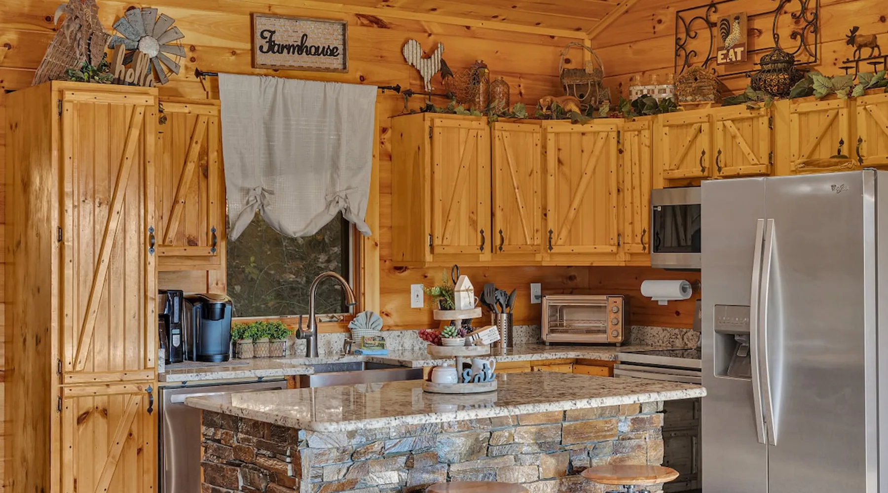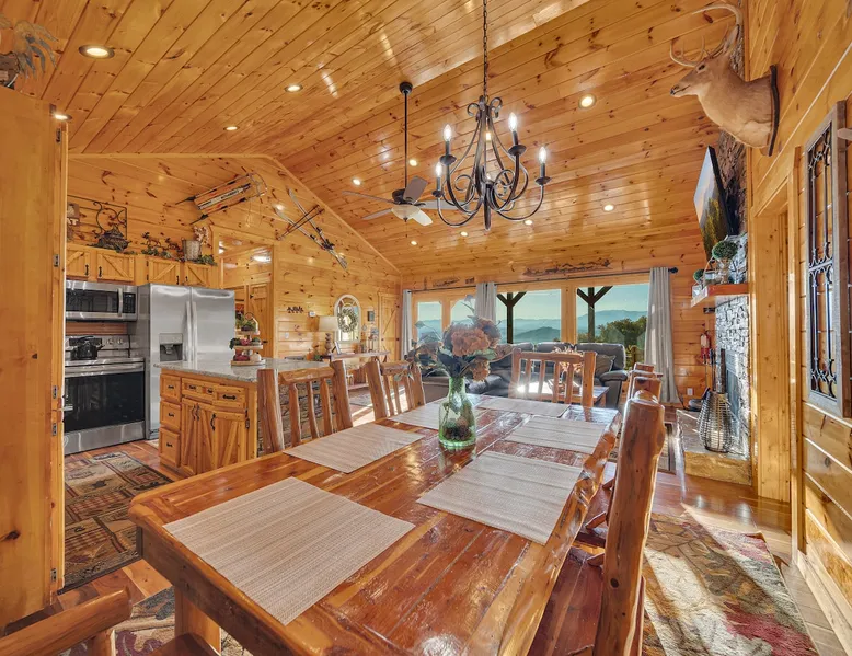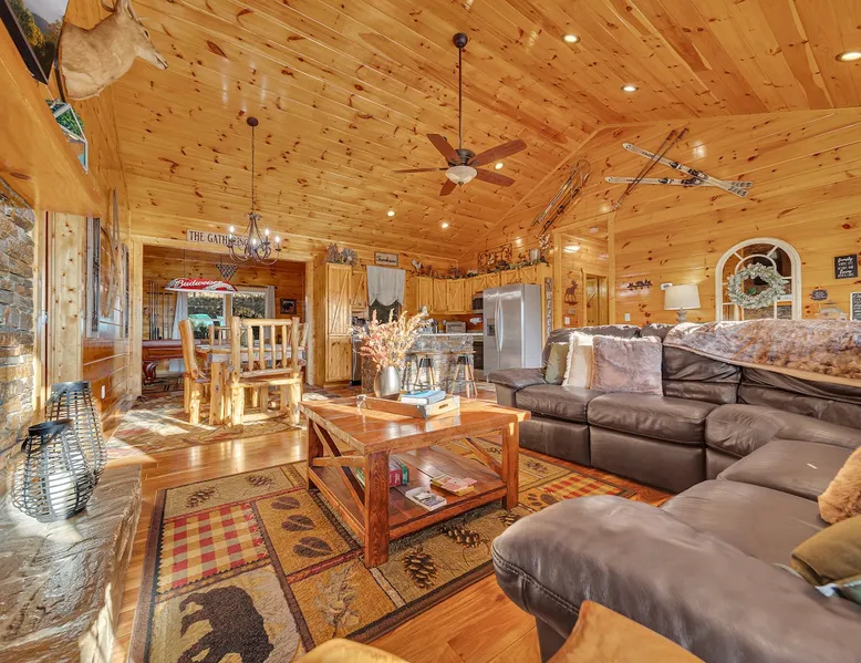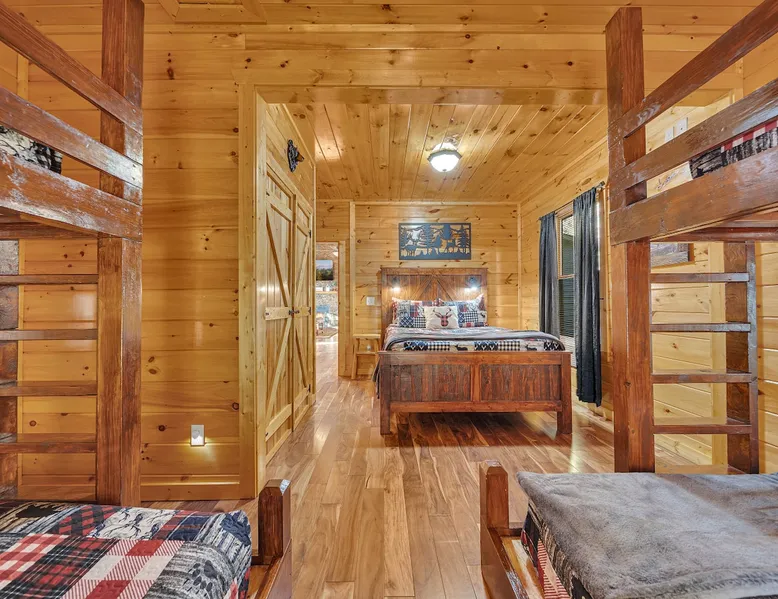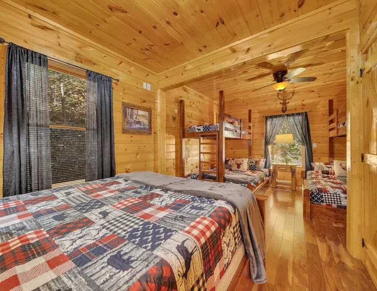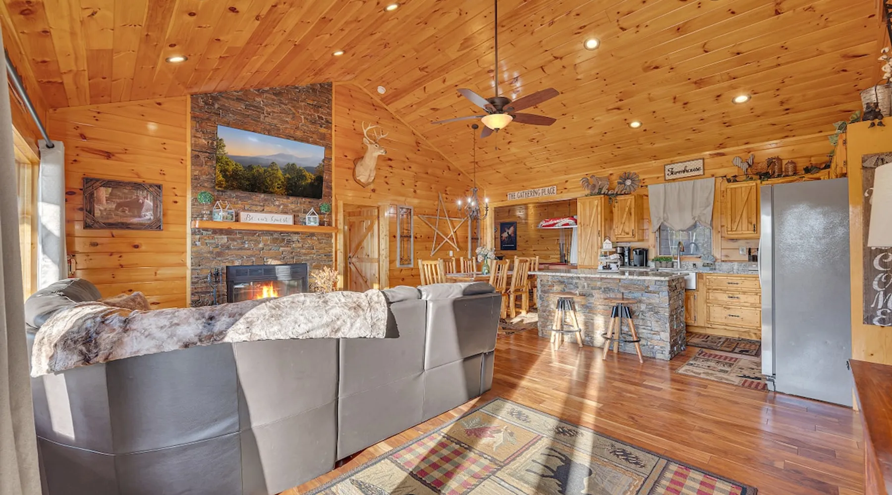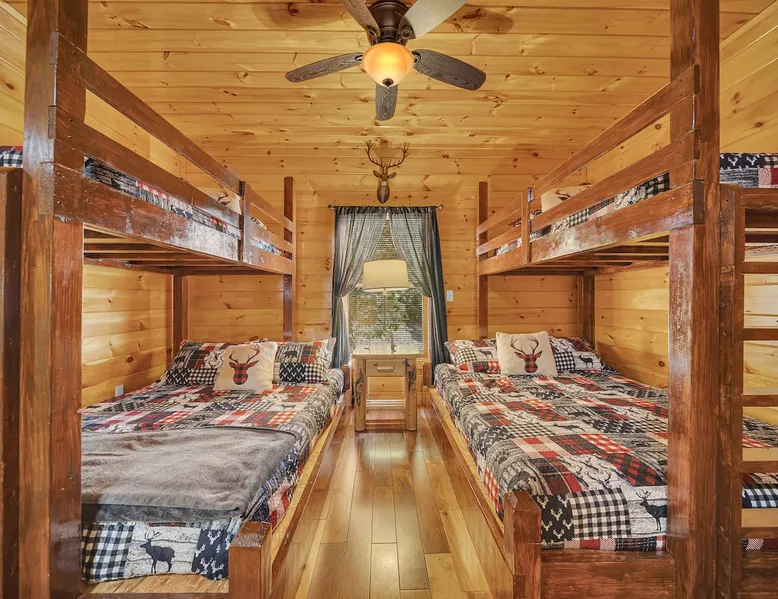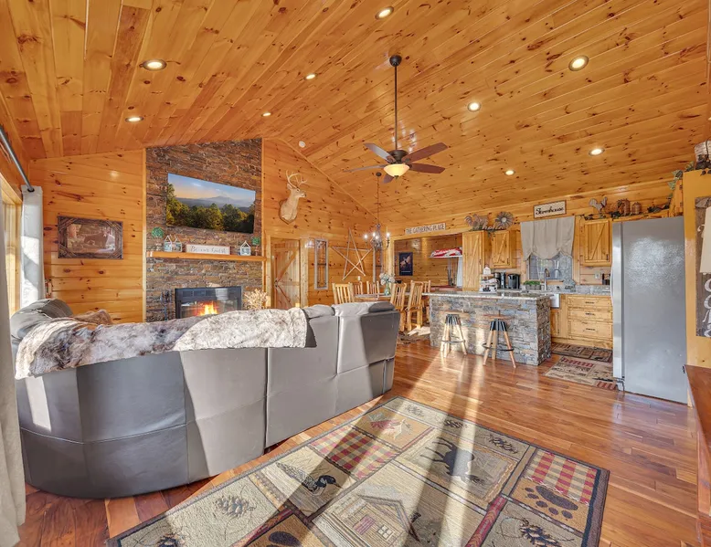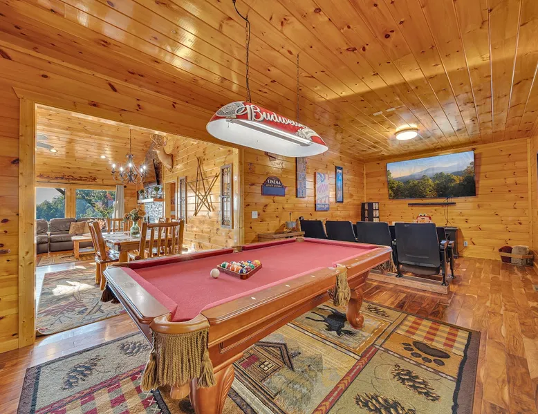 Tucked into 60 private acres in the Smoky Mountains, this Sevierville retreat combines rustic charm with modern luxury for unforgettable group escapes. 🌲 Private 60-acre mountain setting 🔥 Hot tub, fire pit & barnwood bar 🎱 Game room + media room 🍳 Outdoor kitchen & stocked indoor kitchen 🛏 Sleeps 12 across 3 bedrooms 📶 Fast WiFi & smart TVs throughout Perfect for families, couples, or friends reconnecting. The space Highlights: Outdoor Living: Hot tub, fire pit, charcoal grill, outdoor bar, furnished deck with forest views Kitchen Features: Stainless steel appliances, Keurig & drip coffee makers, Crockpot, island seating Living & Entertainment: Pool table, media room, vaulted ceilings, smart TVs, DVD player Convenience & Comfort: Ceiling fans, washer/dryer, complimentary toiletries, linens & towels Extras: Mile-long gravel road to the cabin—4WD recommended for winter or non-local drivers Single-story layout after entry stairs Starter amounts of essentials provided Sleeping Arrangements: Bedroom 1: King Bed Bedroom 2: Queen Bed Bedroom 3: Queen Bed, 2 Bunk Beds (Twin over Queen = 4 beds) Parking: Gravel driveway; 4WD required in winter/snow; not suitable for compact/sport vehicles Other things to note House Rules: •No Smoking •No events, parties, or large gatherings •Must be at least 25 years old to book •You must submit ID within 48 hours of booking. •Please report any damages that occur to both the Guest Contact and Triad Vacation Rentals