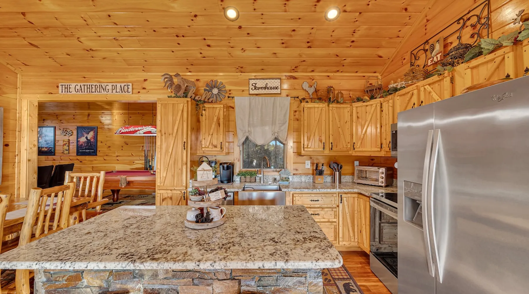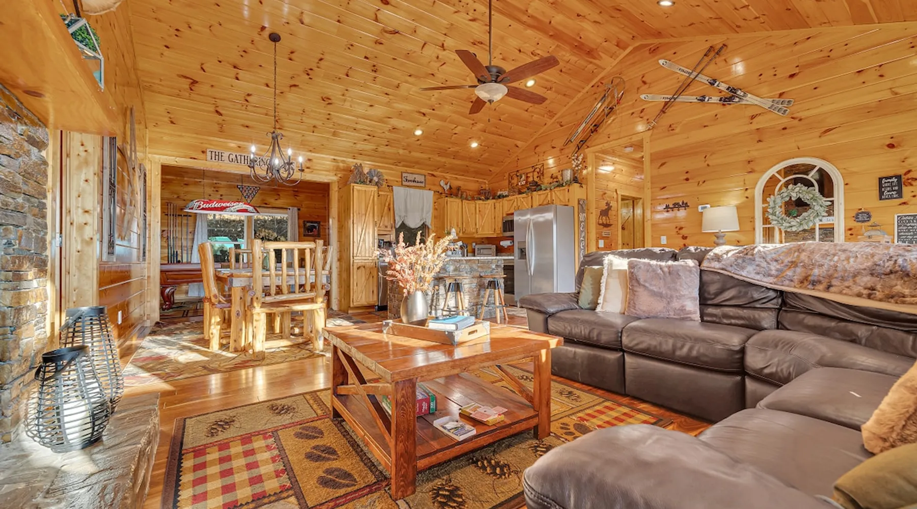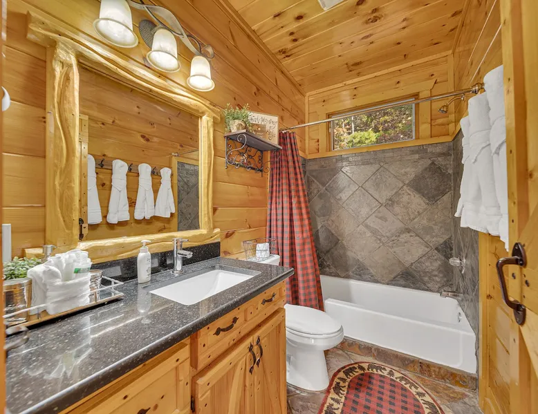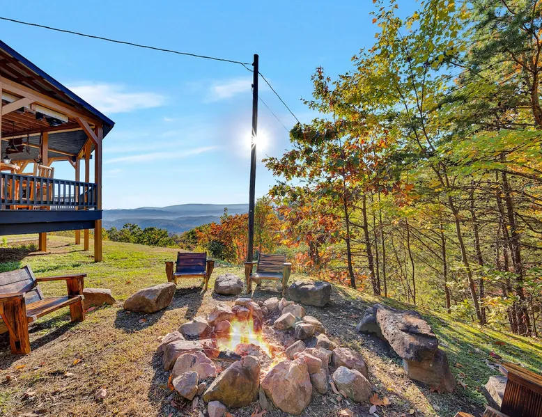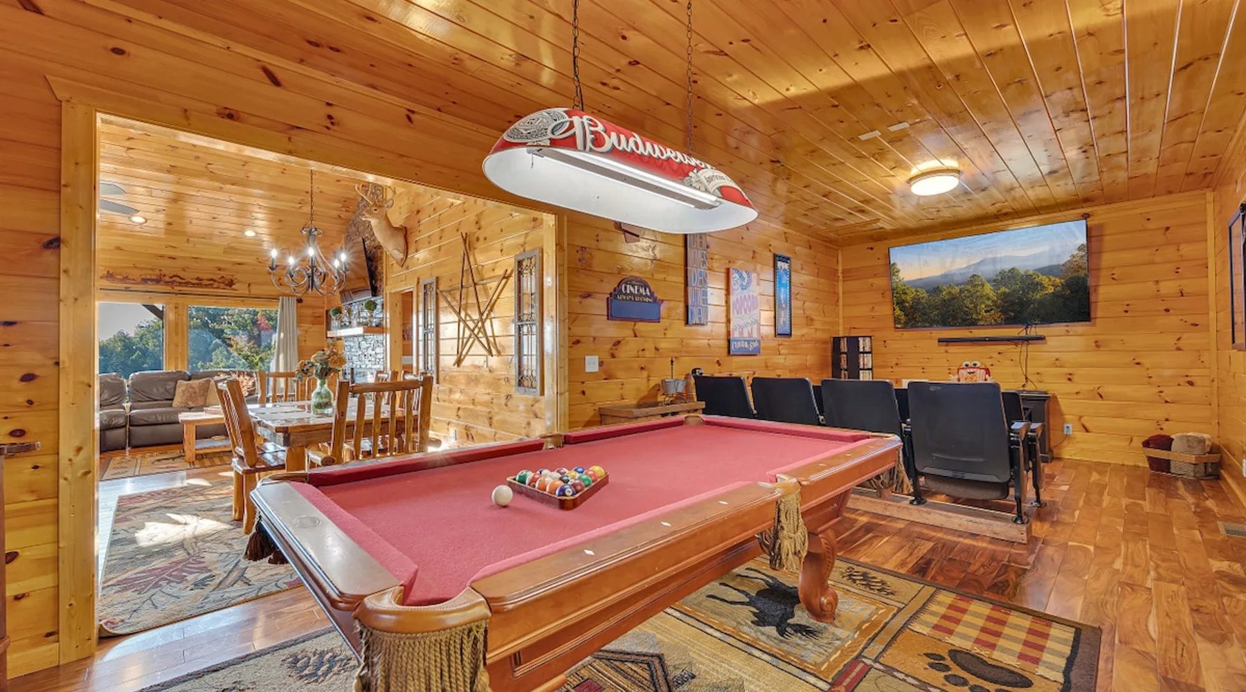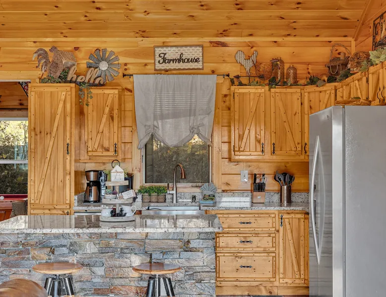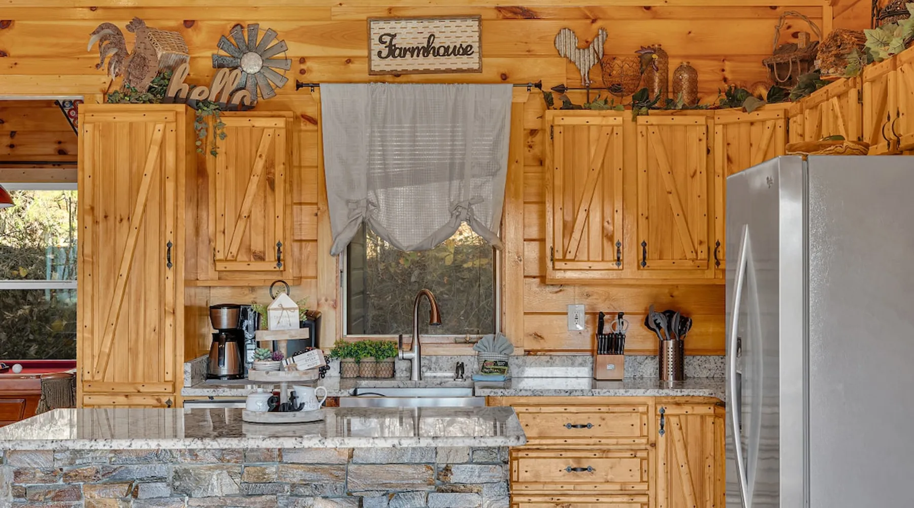 Tucked into 60 private acres in the Smoky Mountains, this Sevierville retreat combines rustic charm with modern luxury for unforgettable group escapes. 🌲 Private 60-acre mountain setting 🔥 Hot tub, fire pit & barnwood bar 🎱 Game room + media room 🍳 Outdoor kitchen & stocked indoor kitchen 🛏 Sleeps 12 across 3 bedrooms 📶 Fast WiFi & smart TVs throughout Perfect for families, couples, or friends reconnecting. The space Highlights: Outdoor Living: Hot tub, fire pit, charcoal grill, outdoor bar, furnished deck with forest views Kitchen Features: Stainless steel appliances, Keurig & drip coffee makers, Crockpot, island seating Living & Entertainment: Pool table, media room, vaulted ceilings, smart TVs, DVD player Convenience & Comfort: Ceiling fans, washer/dryer, complimentary toiletries, linens & towels Extras: Mile-long gravel road to the cabin—4WD recommended for winter or non-local drivers Single-story layout after entry stairs Starter amounts of essentials provided Sleeping Arrangements: Bedroom 1: King Bed Bedroom 2: Queen Bed Bedroom 3: Queen Bed, 2 Bunk Beds (Twin over Queen = 4 beds) Parking: Gravel driveway; 4WD required in winter/snow; not suitable for compact/sport vehicles Other things to note House Rules: •No Smoking •No events, parties, or large gatherings •Must be at least 25 years old to book •You must submit ID within 48 hours of booking. •Please report any damages that occur to both the Guest Contact and Triad Vacation Rentals