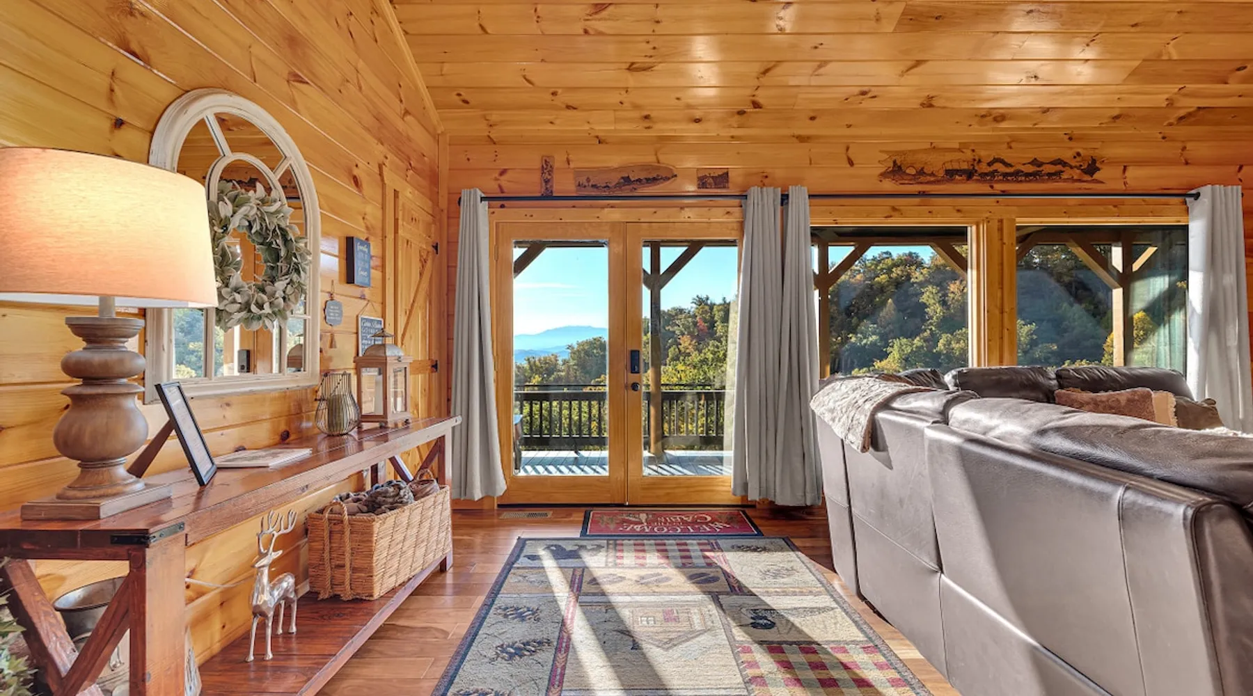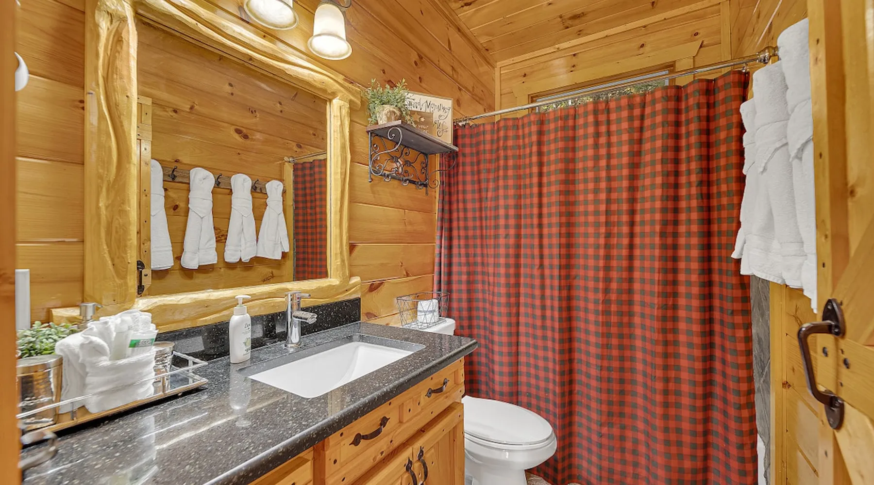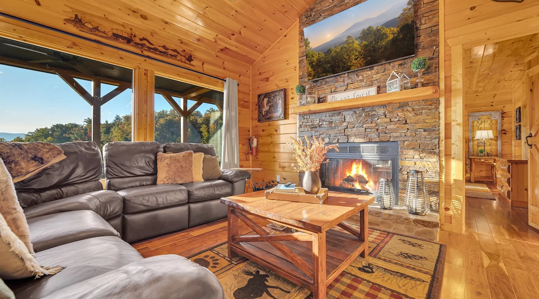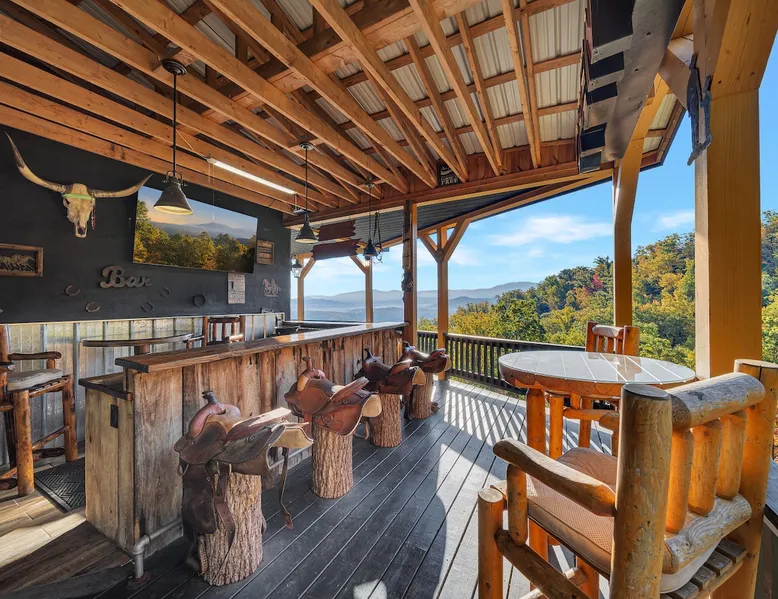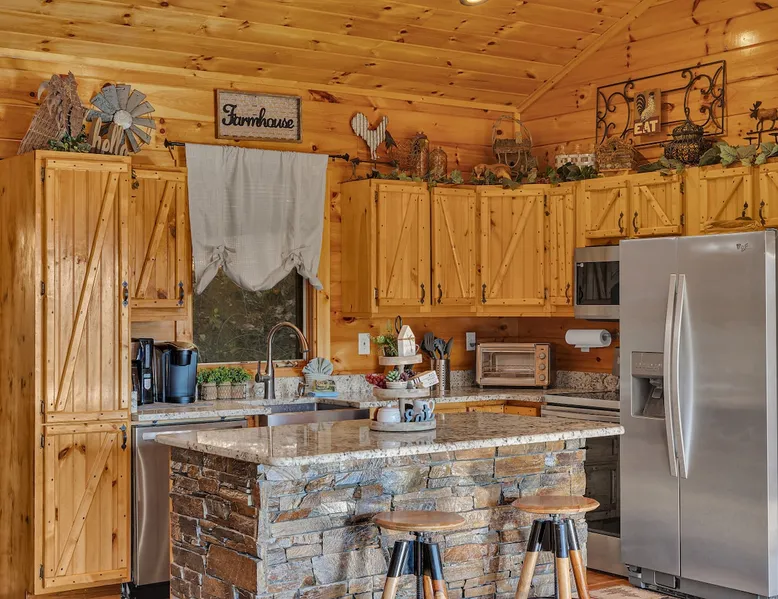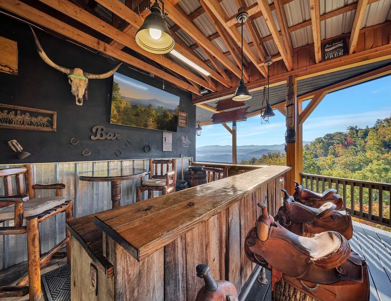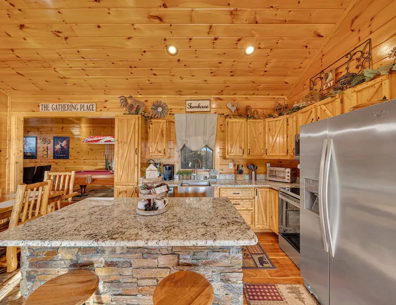 Tucked into 60 private acres in the Smoky Mountains, this Sevierville retreat combines rustic charm with modern luxury for unforgettable group escapes. 🌲 Private 60-acre mountain setting 🔥 Hot tub, fire pit & barnwood bar 🎱 Game room + media room 🍳 Outdoor kitchen & stocked indoor kitchen 🛏 Sleeps 12 across 3 bedrooms 📶 Fast WiFi & smart TVs throughout Perfect for families, couples, or friends reconnecting. The space Highlights: Outdoor Living: Hot tub, fire pit, charcoal grill, outdoor bar, furnished deck with forest views Kitchen Features: Stainless steel appliances, Keurig & drip coffee makers, Crockpot, island seating Living & Entertainment: Pool table, media room, vaulted ceilings, smart TVs, DVD player Convenience & Comfort: Ceiling fans, washer/dryer, complimentary toiletries, linens & towels Extras: Mile-long gravel road to the cabin—4WD recommended for winter or non-local drivers Single-story layout after entry stairs Starter amounts of essentials provided Sleeping Arrangements: Bedroom 1: King Bed Bedroom 2: Queen Bed Bedroom 3: Queen Bed, 2 Bunk Beds (Twin over Queen = 4 beds) Parking: Gravel driveway; 4WD required in winter/snow; not suitable for compact/sport vehicles Other things to note House Rules: •No Smoking •No events, parties, or large gatherings •Must be at least 25 years old to book •You must submit ID within 48 hours of booking. •Please report any damages that occur to both the Guest Contact and Triad Vacation Rentals