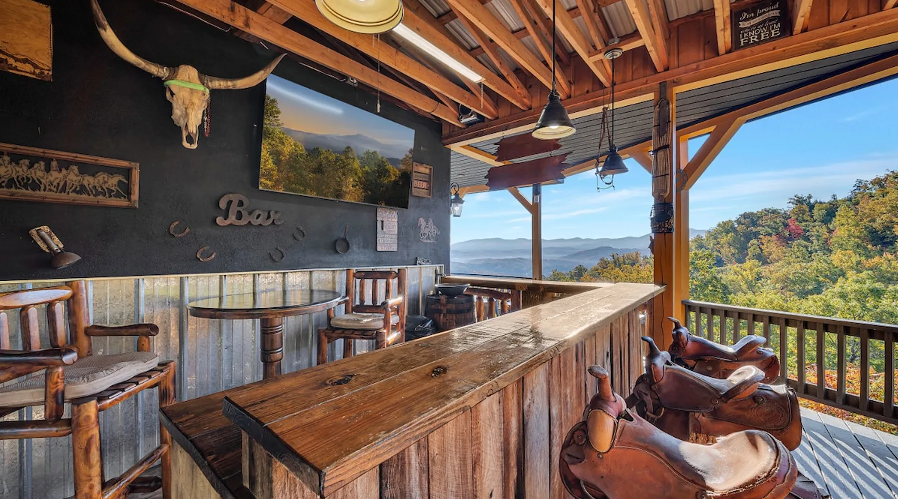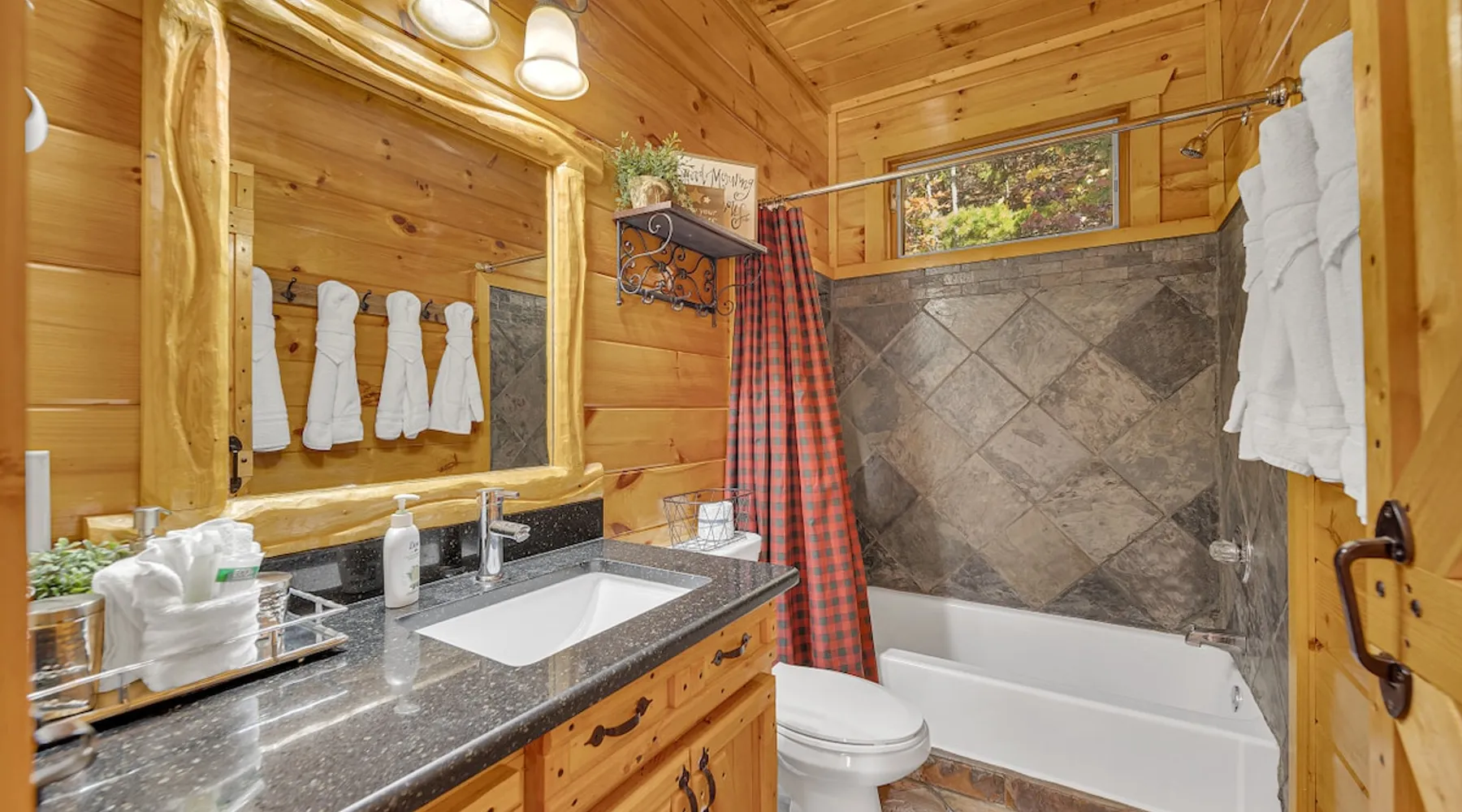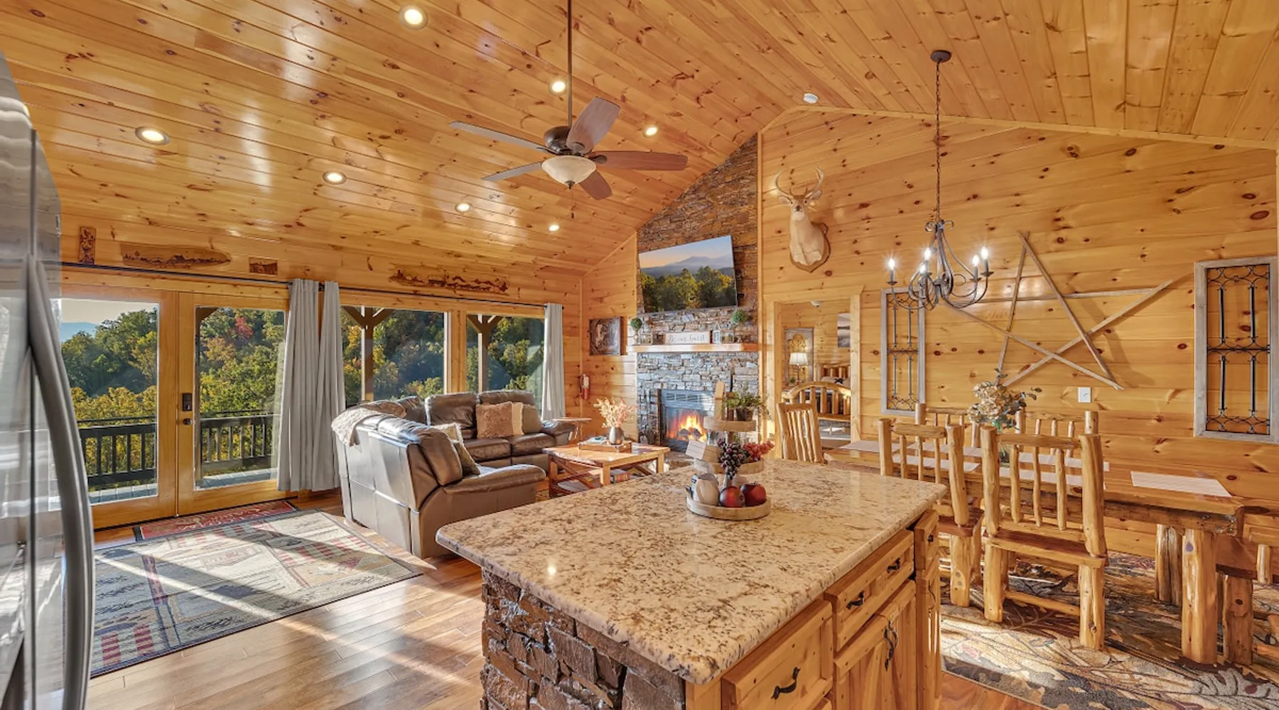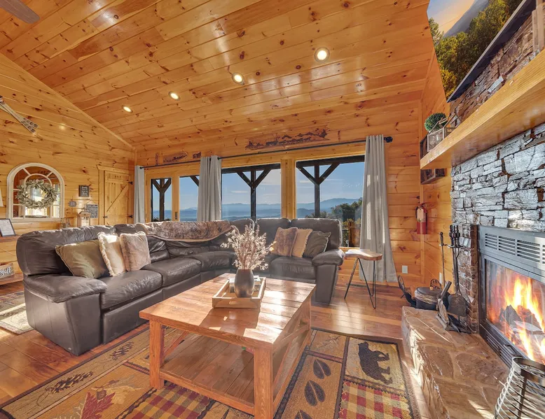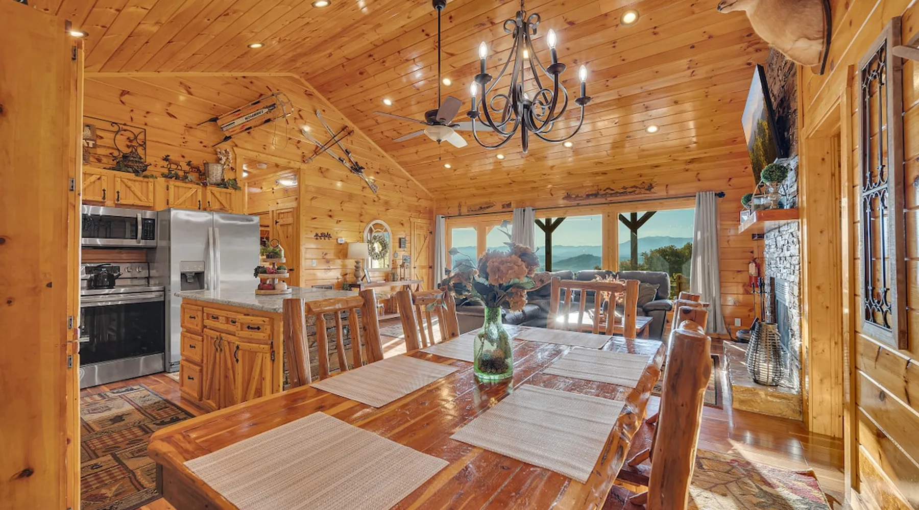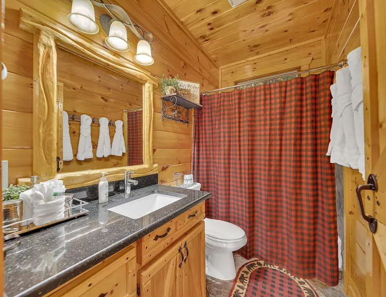 Tucked into 60 private acres in the Smoky Mountains, this Sevierville retreat combines rustic charm with modern luxury for unforgettable group escapes. 🌲 Private 60-acre mountain setting 🔥 Hot tub, fire pit & barnwood bar 🎱 Game room + media room 🍳 Outdoor kitchen & stocked indoor kitchen 🛏 Sleeps 12 across 3 bedrooms 📶 Fast WiFi & smart TVs throughout Perfect for families, couples, or friends reconnecting. The space Highlights: Outdoor Living: Hot tub, fire pit, charcoal grill, outdoor bar, furnished deck with forest views Kitchen Features: Stainless steel appliances, Keurig & drip coffee makers, Crockpot, island seating Living & Entertainment: Pool table, media room, vaulted ceilings, smart TVs, DVD player Convenience & Comfort: Ceiling fans, washer/dryer, complimentary toiletries, linens & towels Extras: Mile-long gravel road to the cabin—4WD recommended for winter or non-local drivers Single-story layout after entry stairs Starter amounts of essentials provided Sleeping Arrangements: Bedroom 1: King Bed Bedroom 2: Queen Bed Bedroom 3: Queen Bed, 2 Bunk Beds (Twin over Queen = 4 beds) Parking: Gravel driveway; 4WD required in winter/snow; not suitable for compact/sport vehicles Other things to note House Rules: •No Smoking •No events, parties, or large gatherings •Must be at least 25 years old to book •You must submit ID within 48 hours of booking. •Please report any damages that occur to both the Guest Contact and Triad Vacation Rentals