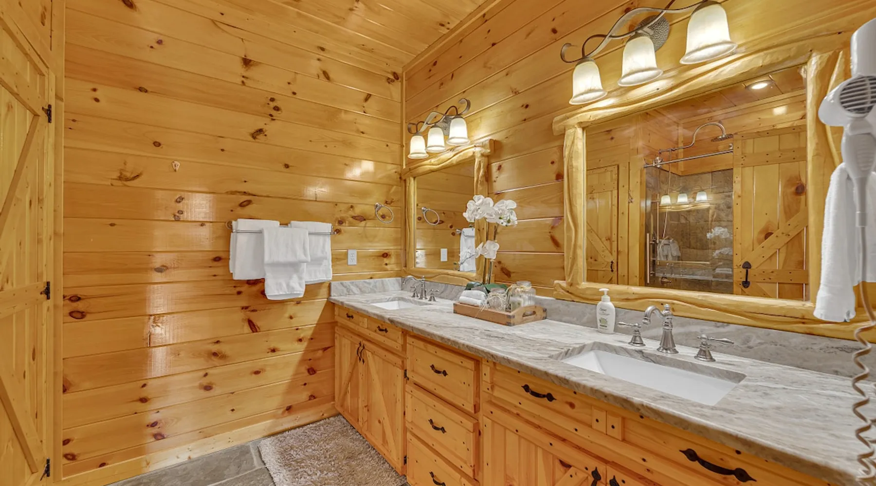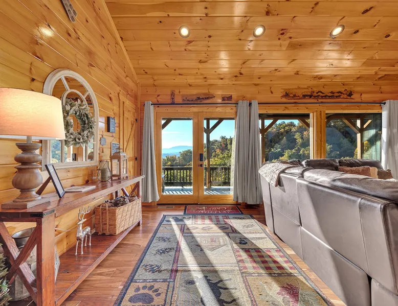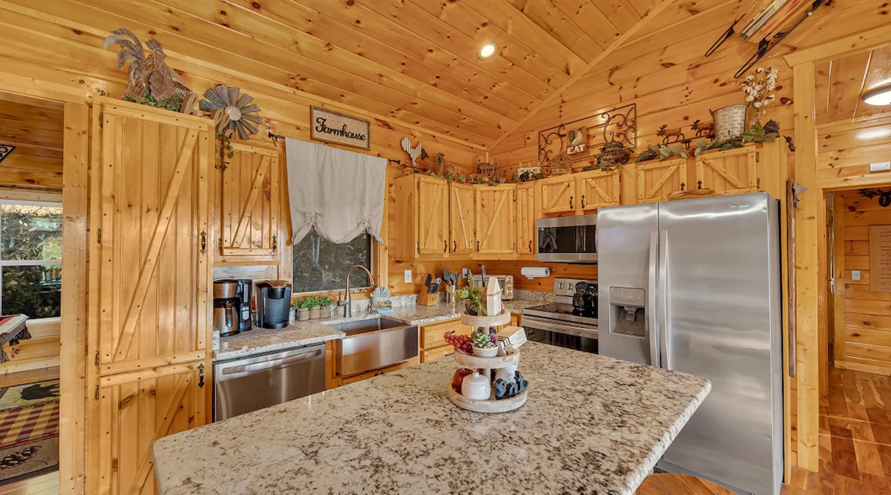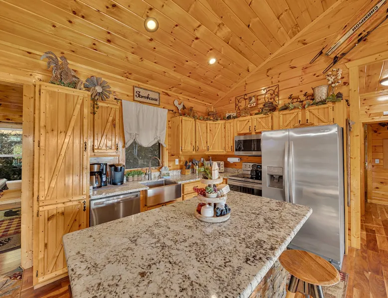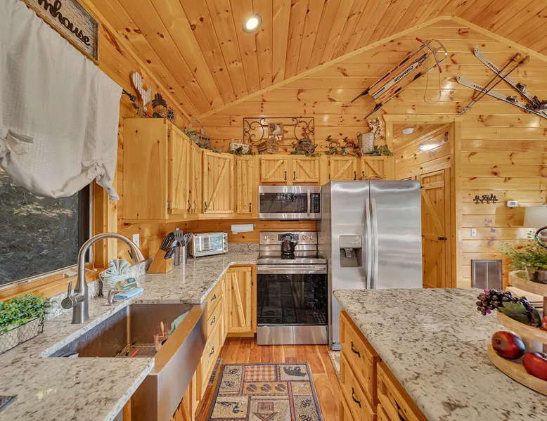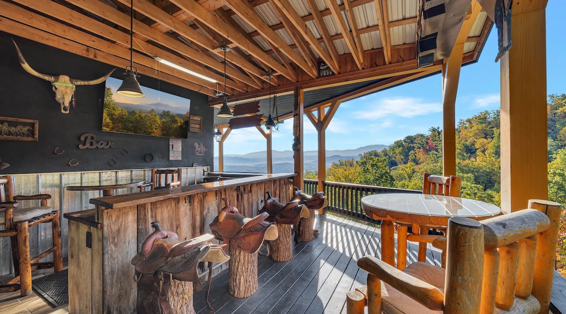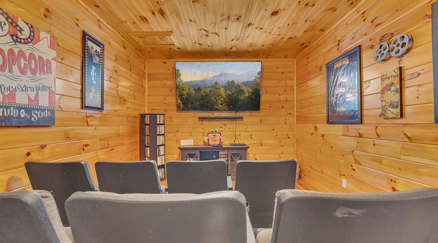 Tucked into 60 private acres in the Smoky Mountains, this Sevierville retreat combines rustic charm with modern luxury for unforgettable group escapes. 🌲 Private 60-acre mountain setting 🔥 Hot tub, fire pit & barnwood bar 🎱 Game room + media room 🍳 Outdoor kitchen & stocked indoor kitchen 🛏 Sleeps 12 across 3 bedrooms 📶 Fast WiFi & smart TVs throughout Perfect for families, couples, or friends reconnecting. The space Highlights: Outdoor Living: Hot tub, fire pit, charcoal grill, outdoor bar, furnished deck with forest views Kitchen Features: Stainless steel appliances, Keurig & drip coffee makers, Crockpot, island seating Living & Entertainment: Pool table, media room, vaulted ceilings, smart TVs, DVD player Convenience & Comfort: Ceiling fans, washer/dryer, complimentary toiletries, linens & towels Extras: Mile-long gravel road to the cabin—4WD recommended for winter or non-local drivers Single-story layout after entry stairs Starter amounts of essentials provided Sleeping Arrangements: Bedroom 1: King Bed Bedroom 2: Queen Bed Bedroom 3: Queen Bed, 2 Bunk Beds (Twin over Queen = 4 beds) Parking: Gravel driveway; 4WD required in winter/snow; not suitable for compact/sport vehicles Other things to note House Rules: •No Smoking •No events, parties, or large gatherings •Must be at least 25 years old to book •You must submit ID within 48 hours of booking. •Please report any damages that occur to both the Guest Contact and Triad Vacation Rentals