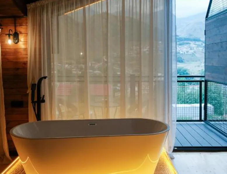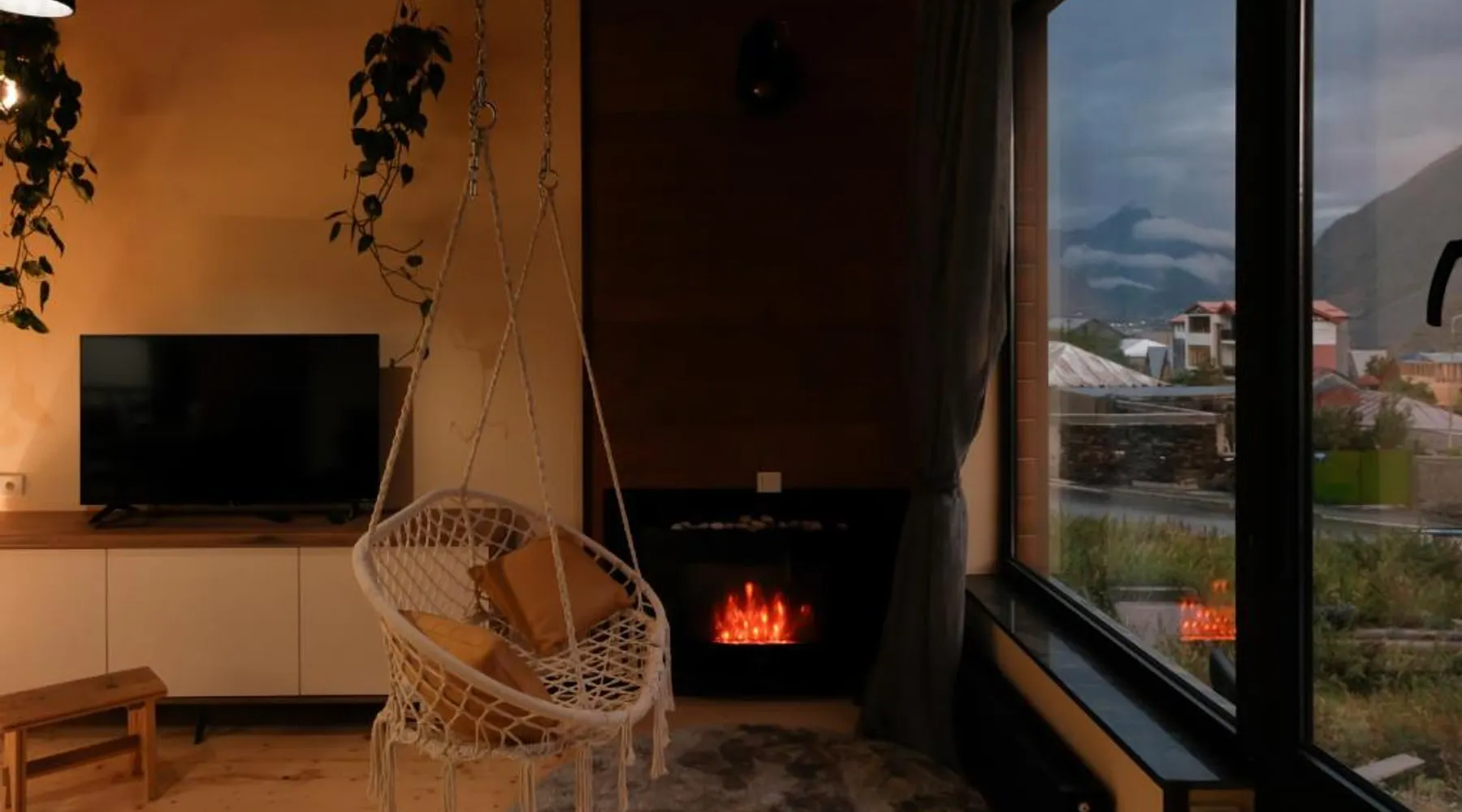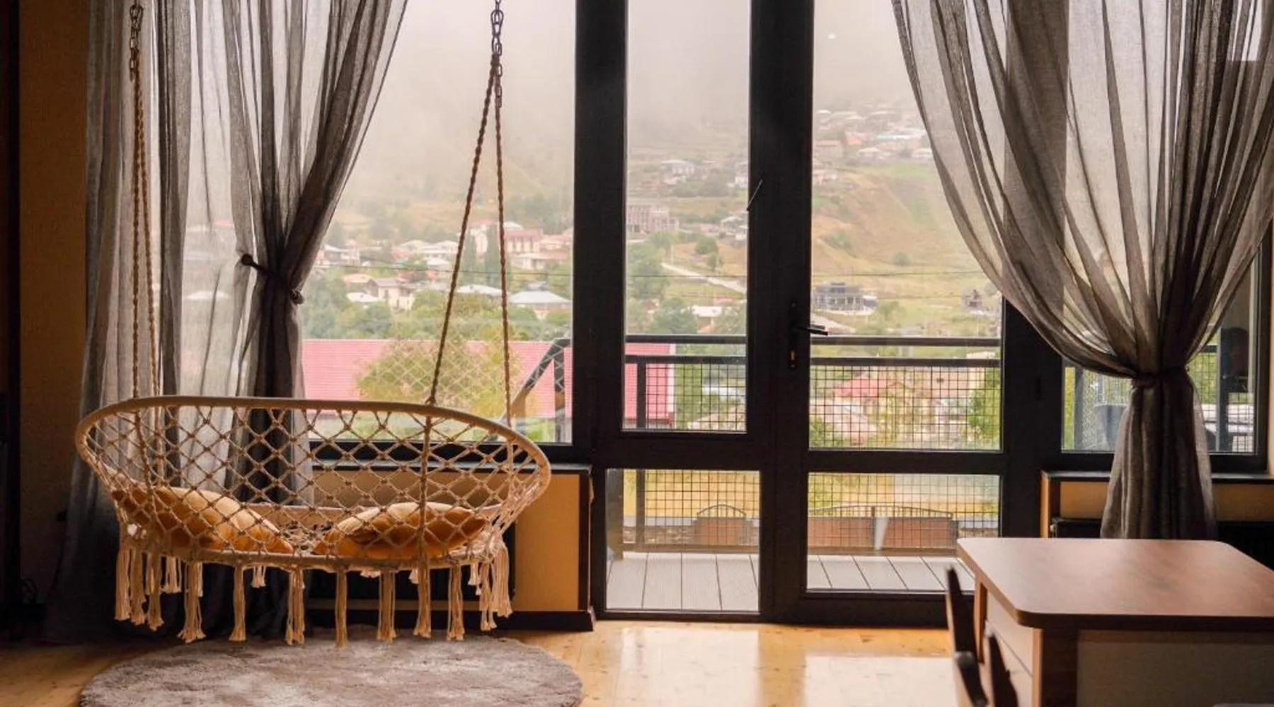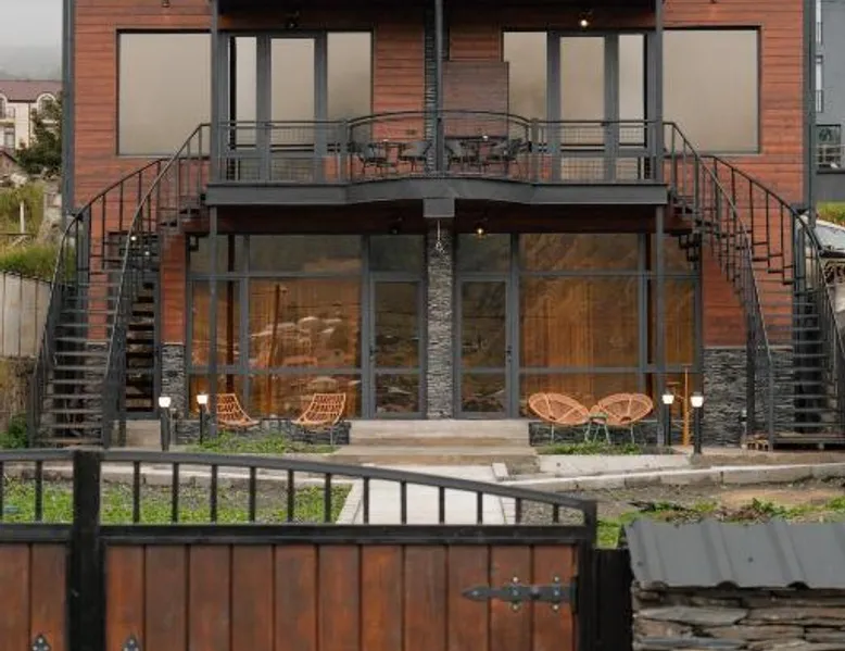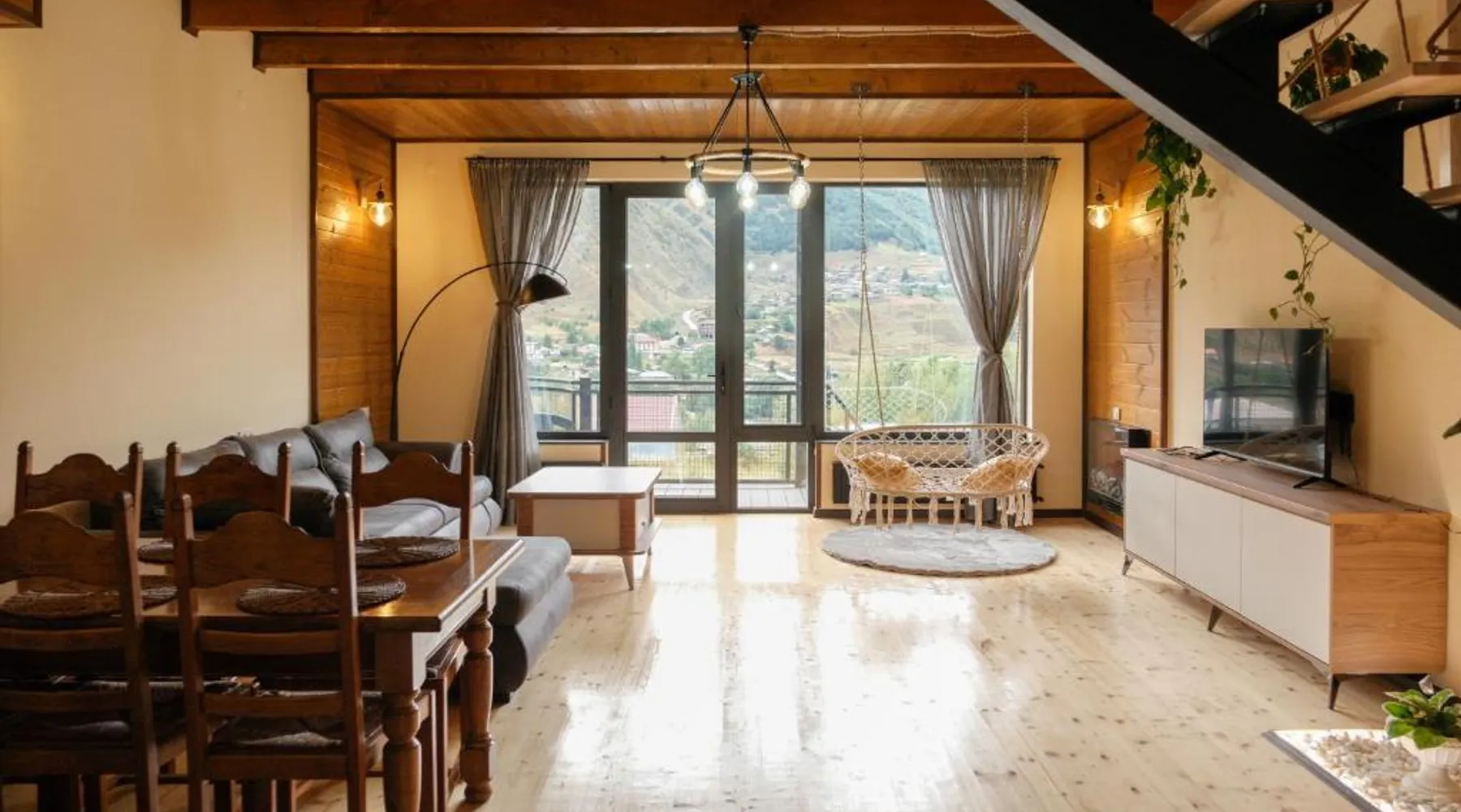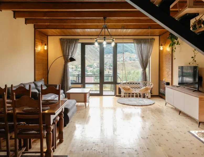 Elegant Accommodations: Rookhe Kazbegi in Stepantsminda offers a comfortable apartment with a sun terrace, garden, and free WiFi. Guests can relax in the outdoor fireplace or hot tub, enjoy mountain views, and utilize the indoor play area. Modern Amenities: The apartment features a kitchenette, balcony, and private bathroom with bathrobes. Additional amenities include a washing machine, dining area, and soundproofing. Free on-site private parking is available. Convenient Services: Private check-in and check-out, paid shuttle service, and room service enhance the stay. The property also offers bicycle parking, outdoor seating, and free toiletries. Local Attractions: Republican Spartak Stadium is 29 mi away, providing easy access to local landmarks. The hot tub is a top feature of this apartment. This spacious apartment comes with 1 living room, 2 separate bedrooms and 1 bathroom with a bath and free toiletries. In the fully equipped kitchen, guests will find a stovetop, a refrigerator, kitchenware and a microwave. The apartment features a washing machine, a private entrance, soundproof walls as well as a terrace with garden views. The unit has 3 beds.