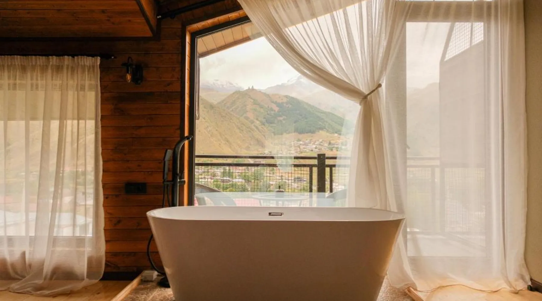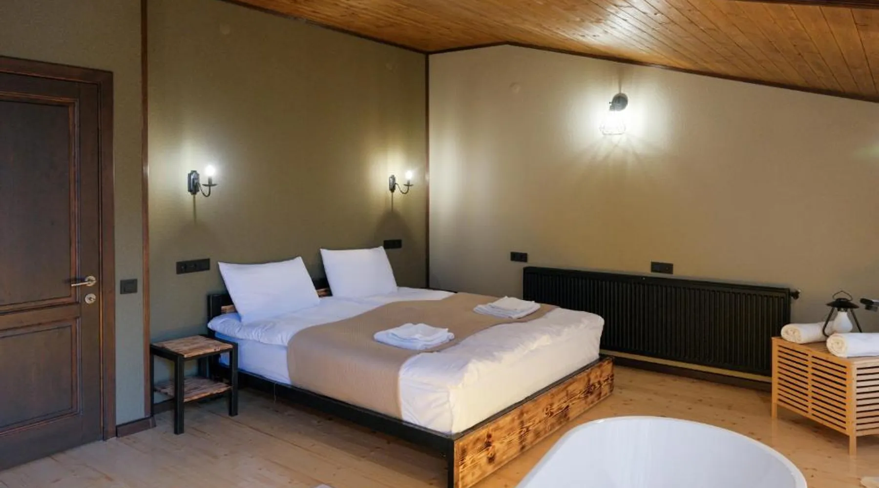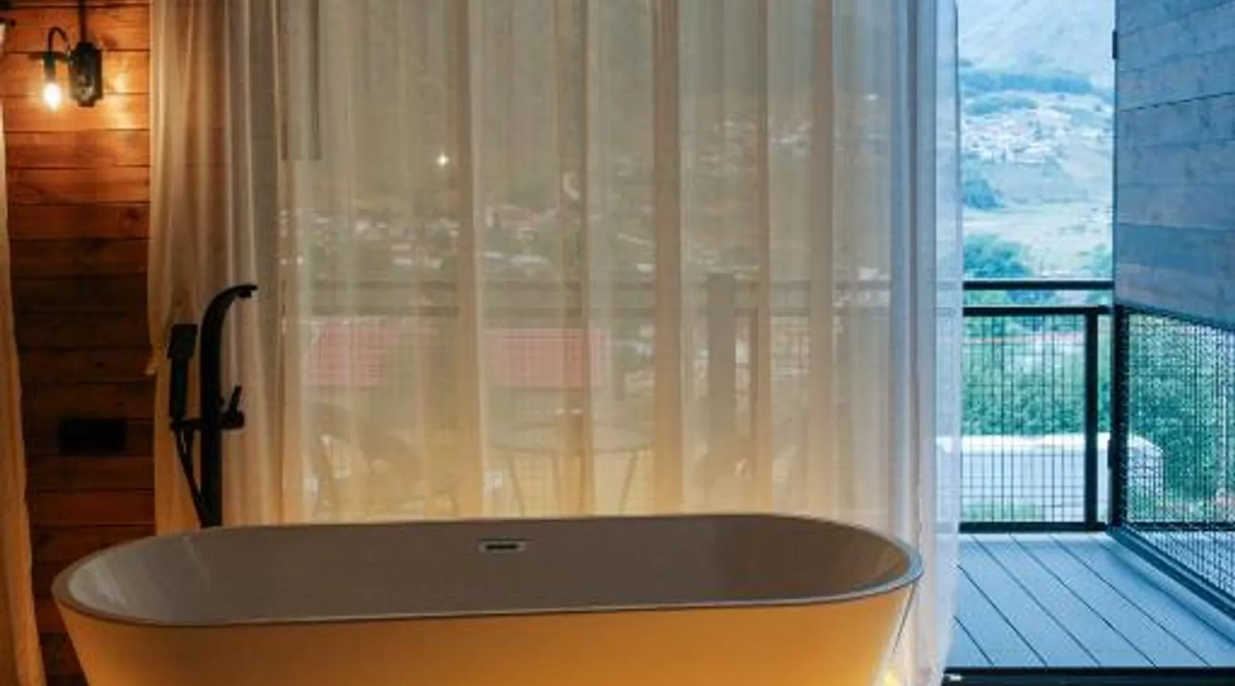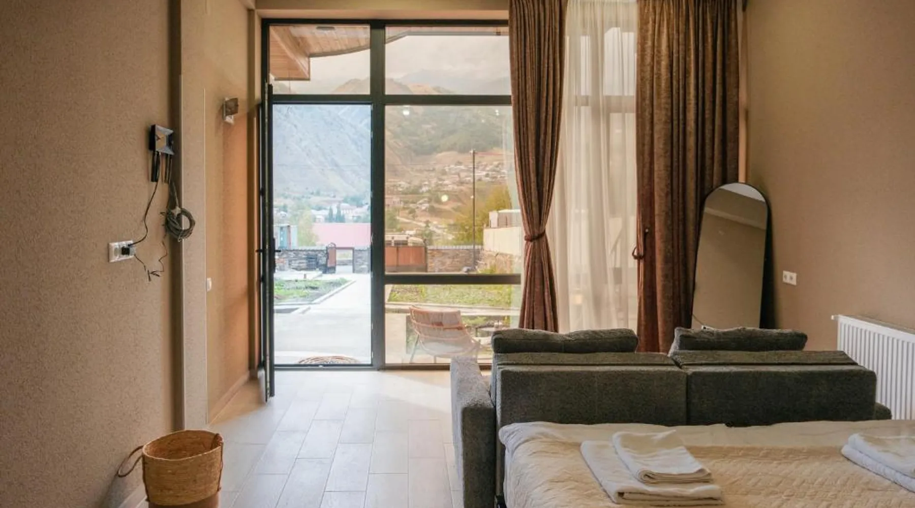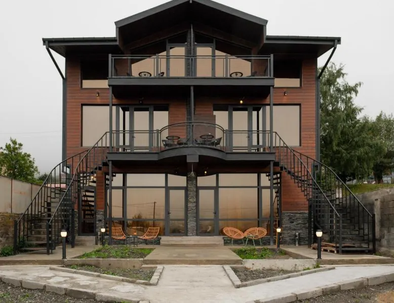 Elegant Accommodations: Rookhe Kazbegi in Stepantsminda offers a comfortable apartment with a sun terrace, garden, and free WiFi. Guests can relax in the outdoor fireplace or hot tub, enjoy mountain views, and utilize the indoor play area. Modern Amenities: The apartment features a kitchenette, balcony, and private bathroom with bathrobes. Additional amenities include a washing machine, dining area, and soundproofing. Free on-site private parking is available. Convenient Services: Private check-in and check-out, paid shuttle service, and room service enhance the stay. The property also offers bicycle parking, outdoor seating, and free toiletries. Local Attractions: Republican Spartak Stadium is 29 mi away, providing easy access to local landmarks. The hot tub is a top feature of this apartment. This spacious apartment comes with 1 living room, 2 separate bedrooms and 1 bathroom with a bath and free toiletries. In the fully equipped kitchen, guests will find a stovetop, a refrigerator, kitchenware and a microwave. The apartment features a washing machine, a private entrance, soundproof walls as well as a terrace with garden views. The unit has 3 beds.