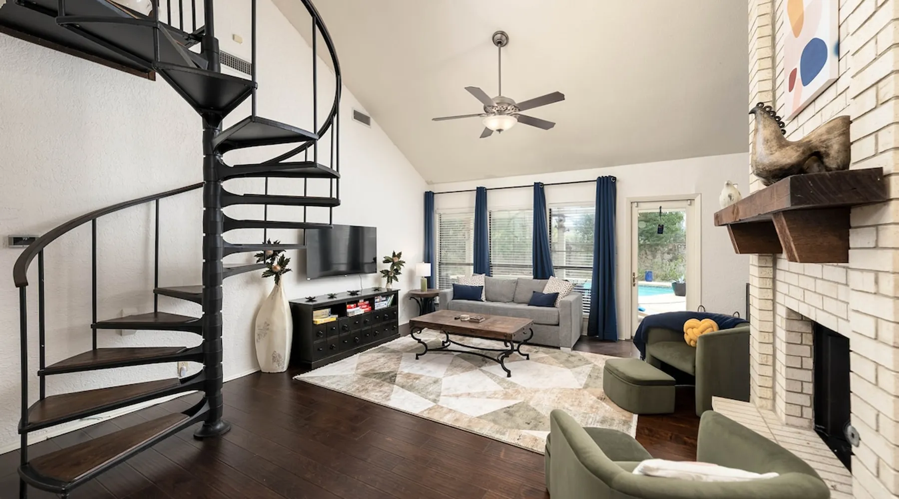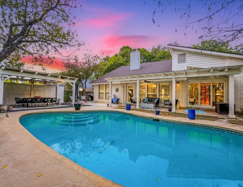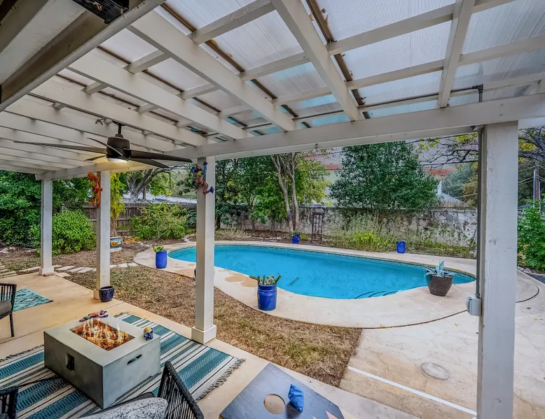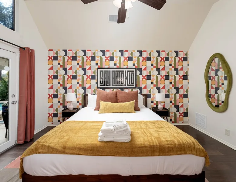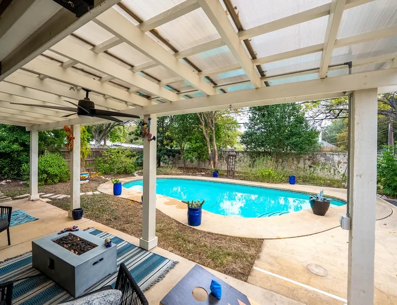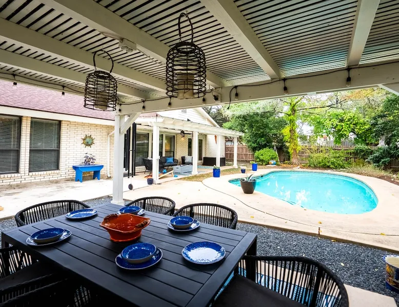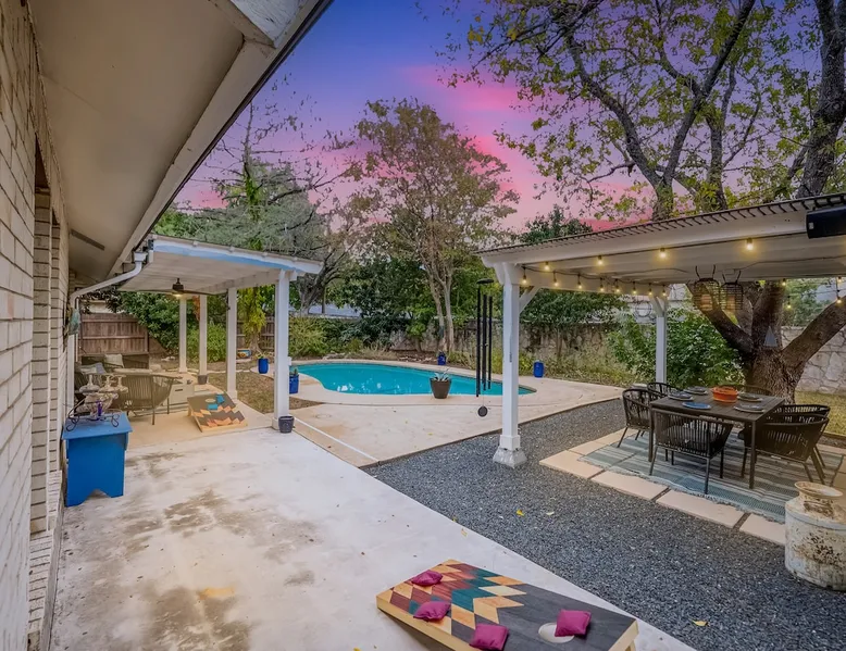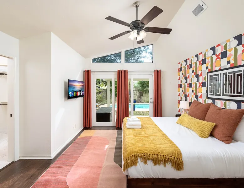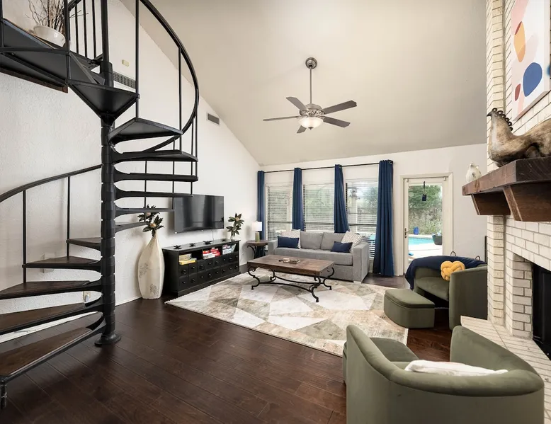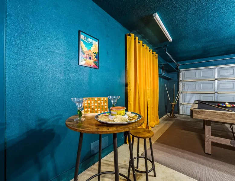 ☆☆ Be among the first to stay! ☆☆ This professionally designed San Antonio retreat sleeps 10 and features: • Private saltwater pool & outdoor dining • Garage game lounge with pool table, arcade & Xbox • Spacious living areas & full kitchen • Stylish bedrooms with TVs & mini-fridges • Family-friendly with pack ’n play & high chair • Free parking & great location near top attractions, shops & dining! • Super fast wifi The space ☆☆ KEY FEATURES ☆☆ ☀ Sleeps up to 10 guests comfortably ☀ 4 bedrooms, 2 full bathrooms ☀ Private salt water pool, outdoor dining & fire table lounge ☀ Garage game room with pool table, arcade, Xbox & TV ☀ Fully equipped kitchen + coffee bar ☀ TVs in every bedroom ☀ Loft with wet bar & king bed ☀ Family-friendly: high chair & pack ’n play ☀ Free parking in driveway and street ☀ Quiet, safe neighborhood near major attractions ☀ Super fast WiFi throughout ☆☆ BEDROOMS ☆☆ Each bedroom has its own personality and thoughtful design touches that make every guest feel right at home. Primary Suite (Main Level) – King bed, en suite bathroom, private access to the pool, and bold, modern décor that balances color and calm. Perfect for parents or couples wanting privacy. Bedroom 2 (Main Level) – King bed with soft textures, bright accents, and nearby access to the shared hall bath. Bedroom 3 (Main Level) – Queen bed, cozy ambiance, and curated art that ties into the home’s cheerful color palette. Loft Bedroom (Upstairs) – A retreat all its own, featuring a king bed, TV, wet bar, and extra seating area—ideal for a second couple or grandparents. Living Room Pull-Out Sofa – Full-size mattress, comfortable enough for kids or extra guests. Every room includes a TV, ceiling fan, and clothing storage. ☆☆ BATHROOMS ☆☆ Two full bathrooms make morning routines easy for everyone. The en suite primary bath features modern fixtures, fresh white tile, and a spacious shower. The shared hall bath serves the other bedrooms and loft with the same clean, updated design. Both bathrooms come stocked with shampoo, conditioner, body wash, plush towels, and all essentials—so you can pack light and relax more. ☆☆ KITCHEN & RELAXING AREAS ☆☆ The open-concept kitchen and living area are the heart of the home, designed for connection and comfort. The kitchen features plenty of counter space, a large side-by-side fridge/freezer, electric range, microwave, and all cookware. Brew your favorite morning drink at the full coffee bar with Keurig Duo, flavored creamers and syrups, and assorted pods. A bistro table for four makes casual breakfasts easy, while the main dining area comfortably seats your group for family-style dinners or celebrations. In the living room, gather around for movie nights or casual conversations. The décor is colorful and inviting, with art pieces that pop against warm wood tones. Natural light fills the space, and the spiral staircase adds an architectural focal point leading up to the loft. For even more fun, head to the garage game room, transformed into a playful escape with a pool table, arcade cabinet, Xbox, and TV. It’s the perfect spot for kids and adults to unwind together after a day exploring San Antonio. ☆☆ OUTSIDE SPACE ☆☆ Step into your private backyard oasis—this is where Phantom Valley truly shines. The sparkling swimming pool takes center stage, surrounded by a privacy fence and lush greenery. Enjoy outdoor meals under the covered dining area for six, complete with Bluetooth speakers, ceiling fan, and soft string lights that glow after sunset. Unwind by the fire table with a glass of wine, or keep cozy near the propane heater during cool evenings. Comfortable lounge seating makes it easy to spend the entire day outdoors, from morning coffee to evening stargazing. Fire up the propane BBQ grill for easy family cookouts. Whether it’s poolside fun, family dinners, or quiet nights under the lights, this space was designed for togetherness. While the pool isn’t heated, guests love it for sunny-day swims and relaxing afternoons nearly all year long in San Antonio’s mild climate. ☆☆ FAMILY-FRIENDLY COMFORTS ☆☆ Phantom Valley was built with families in mind. You’ll find a high chair, pack ’n play, and board games for little ones. Every bedroom has blackout curtains and ceiling fans for comfortable sleep. Fast Wi-Fi, Smart TVs, and multiple seating areas mean everyone can enjoy their own rhythm—whether it’s streaming a show, reading a book, or playing a round of pool. Laundry is available on-site with washer and dryer access, so extended stays feel as seamless as short weekend getaways. ★☆ BOOK NOW & BE AMONG OUR FIRST GUESTS ☆★ Be among the first to experience this brand-new San Antonio retreat. We’ve created a space designed for families, comfort, and unforgettable moments. From morning swims and afternoon games to late-night conversations by the fire table, Phantom Valley Retreat is ready to host your next chapter of memories. Reserve your stay today and take advantage of this exclusive launch offer before it’s gone! Guest access Guests will have full access to the entire home and all amenities during their stay. Feel free to enjoy all indoor and outdoor spaces, including the pool, backyard games, and lounge areas. The only locked spaces are the supply closets. Easy Check-In Process🏡 It’s just like when you check in at a hotel and give your ID to the front desk, except our front desk is online! It's super easy to complete on your phone! We use a web-based system called Happy Guest, and you’ll receive a personalized rental agreement to sign in order to receive your arrival instructions. It’s simple: finish these steps, and you’re all set to enjoy your stay! Note: arrival info won’t be sent without completing these steps, and refunds aren’t possible if skipped. Your personalized guidebook will give you all the info about the