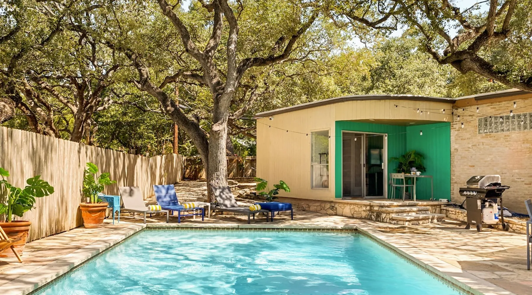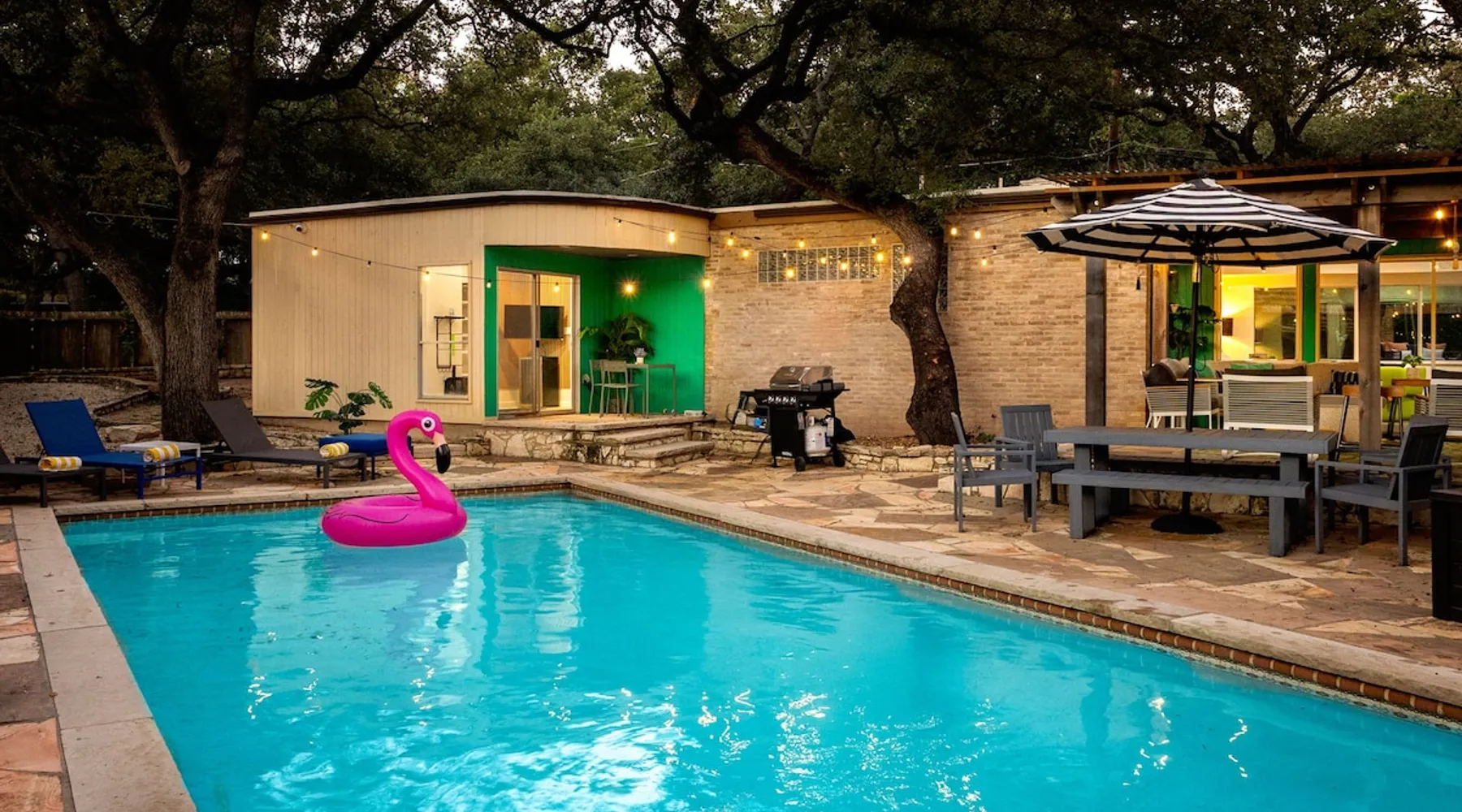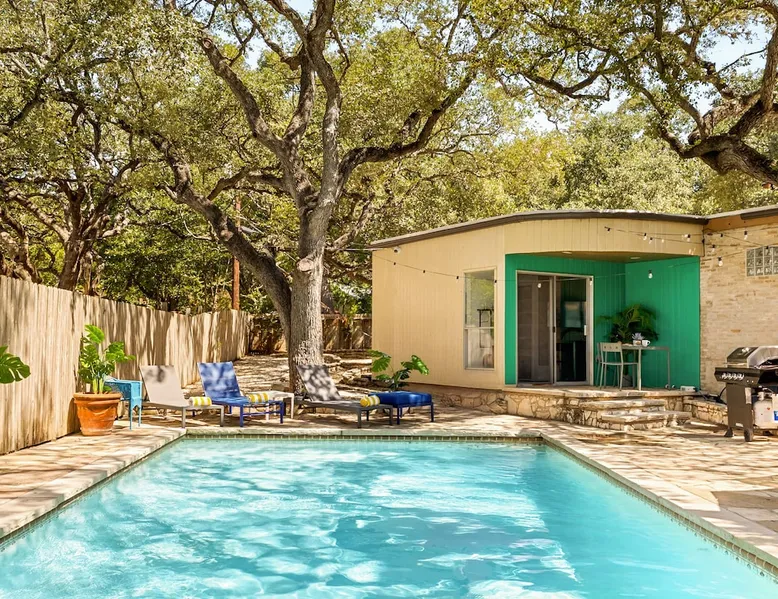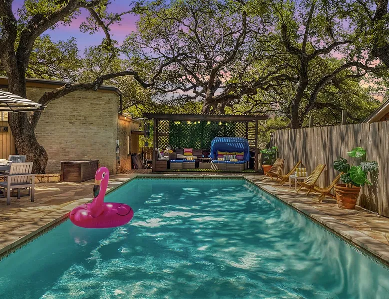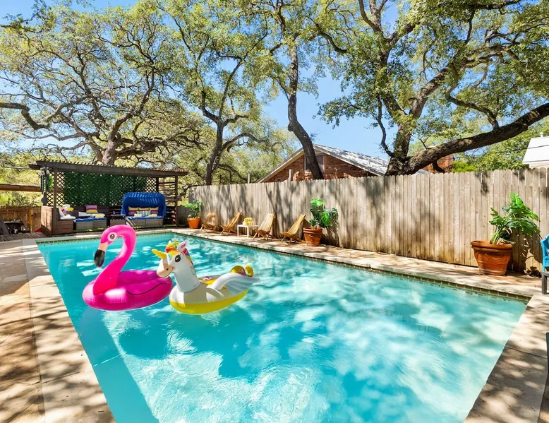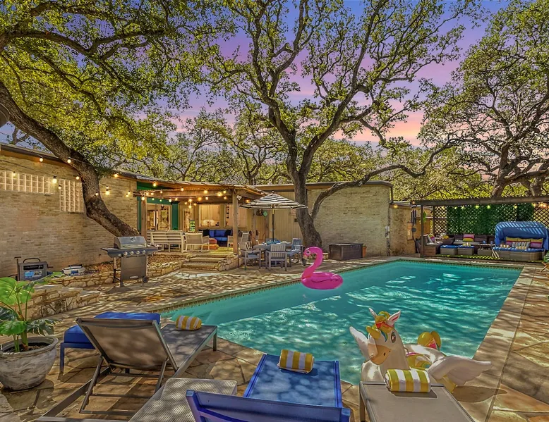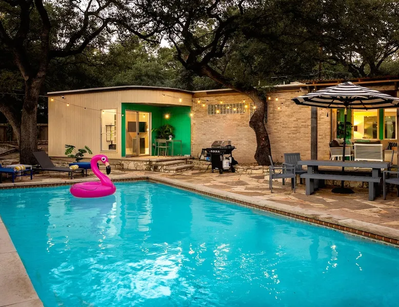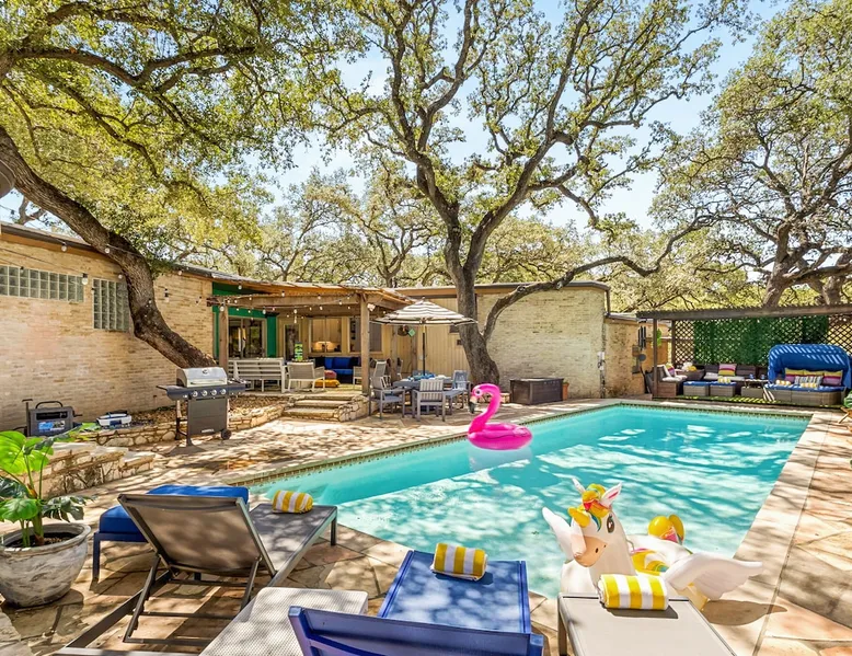 Experience the ultimate San Antonio getaway where designer style meets comfort and privacy. Unwind poolside, recharge in the gym, or gather in gorgeous living areas. This professionally designed home offers effortless luxury for every guest. -Private heated pool & cabana -Private gym with pool views, TV & fridge -Multiple spacious living & dining areas -Four bedrooms, two with en suite bathrooms -Quiet neighborhood, no backyard neighbors -Ideal for multi-generational stays & Lackland AFB visits The space Welcome to your professionally designed San Antonio haven expertly crafted for families, multi-generational groups, and friends to gather, relax, and make unforgettable memories. Every space fuses luxury, style, and comfort for the ultimate retreat, just minutes from top city attractions, dining, and Lackland AFB. 🏡Why You’ll Love This Home Sleeps 12 comfortably – 4 private bedrooms (2 with en suite baths) ✨Sparkling heated pool with large shaded cabana, fans, and loungers 🏋️♂️Private gym with poolside access – work out, then cool off! 🎮Multiple indoor living rooms: entertainment, games, quiet retreats 🍽️Expansive dining spaces – indoor and outdoor for all-group meals 👨🍳Chef-inspired kitchen, coffee bar, and all cookware provided 🤫Quiet, family-friendly neighborhood 🖼️Designer touches throughout: art, custom furniture, plush bedding 💻Free high-speed WiFi, Smart TVs, dedicated workspaces 🛁Laundry room with washer & dryer, all linens and towels included 👶Premium amenities: board games, pool toys, crib/high chair 🅿️Ample parking in driveway and street ☆☆☆ LIVING & GATHERING SPACES ☆☆☆ Step into a vibrant, welcoming living room with bright windows and carefully curated décor. Sink into plush sofas for movie nights, lively games, or quiet family chats. Find a second lounge for cozy reading or late-night conversations. Natural light pours in, highlighting bold art and striking design. ☆☆☆ KITCHEN & DINING ☆☆☆ Fuel adventure and togetherness in your chef’s kitchen: Sleek appliances, spacious counters, and all cookware Breakfast bar and coffee nook - breeze through mornings Elegant indoor dining for up to 12 - perfect for big meals and celebrations Al fresco dining on the patio under ceiling fans and string lights ☆☆☆ BEDROOMS ☆☆☆ Rest easy in four uniquely styled bedrooms: Two primary suites feature en suite baths and luxury bedding Guest rooms offer flexible setups for kids, teens, or couples Each room has curtains, fans, premium linens, and thoughtful touches Need more space? Versatile sleeping options accommodate extra guests or kids ☆☆☆ OUTDOOR OASIS ☆☆☆ Your private spacious backyard is a Texas dream: Heated pool for year-round fun Spacious cabana for shade & lounging, outdoor fans keep you cool Poolside dining & patio furniture for cocktails, BBQs, or game days Ultra-quiet yard - mature oaks and birdsong Private gym opens right to the patio just steps to your swim! ☆☆☆ FAMILY-FOCUSED AMENITIES ☆☆☆ Board games, books, high chair, crib, and children’s dishes Multiple TVs with streaming for movie nights Fast WiFi for work or entertainment Laundry on-site ☆☆☆ OUTDOOR FIRE PIT & RELAXATION GROVE ☆☆☆ Enjoy evenings under grand oak trees draped in string lights around the inviting fire pit, with chairs for your group to gather and relax. Nearby, unwind by the soothing fountain in a quiet nook with extra chairs and a cozy bench ideal for morning coffee or peaceful evenings. Whether roasting s’mores or stargazing, this backyard retreat sets the vibe for memorable moments outdoors. ☆☆☆ NEIGHBORHOOD & LOCATION ☆☆☆ Enjoy absolute tranquility in a beautiful, safe San Antonio suburb close to everything, but worlds away from the bustle. Minutes to Lackland AFB - ideal for BMT graduation families Short easy drive to Riverwalk, downtown, and top SA attractions Groceries, parks, cafés, and essentials nearby ✅ Stress-Free Stays Easy Check-In: Smart lock for self check-in anytime Personalized Guest Portal: Local tips, recommendations, and upgrade options Local Compliance Standards: Fully licensed and insured Ready to Book Your Stay? From sunrise coffees on the patio to nighttime chats by the fire pit, this home is ready to host your next getaway. Whether it’s family bonding, celebrating milestones, or just relaxing, everything you need for a memorable trip is here. **ABOUT OUR HEATED POOL** Our pool can be heated year round, however depending on the outside temperatures during your stay, it could be more difficult to heat during January and February's coldest temperatures. Thank you for understanding. While the pool won’t reach hot-tub temperatures, the pool is consistently maintained at 86º degrees November to April/May. Our pool team comes to take care of the home on Thursday or Friday. On the coldest days of the year our pool may not reach set temperature due to the extreme cold. Most heat pumps do not function as well when outside temperature is less than 55 degrees. We’re happy to provide this added comfort at no extra charge, so you can focus on enjoying your stay. Please note that pool temperatures will vary slightly based on weather conditions. 🔑 Book Now and Start Making Memories! Guest access Guests will have full access to the entire home and all amenities during their stay. Feel free to enjoy all indoor and outdoor spaces, including the pool, backyard games, and lounge areas. The only locked spaces are the garage and supply closets. Easy Check-In Process🏡 It’s just like when you check in at a hotel and give your ID to the front desk, except our front desk is online! It's super easy to complete on your phone! We use a web-based system called Happy Guest, and you’ll receive a personalized rental agreement to sign in order to receive your arrival instructions. It’s simple: finish these steps, and you’re all set to enjoy your stay