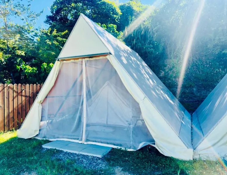 Comfortable Accommodations: Donato Glamping in Renai offers family rooms with private bathrooms, air-conditioning, and mountain views. Each unit includes a kitchenette, dining area, and outdoor patio. Convenient Facilities: Guests benefit from private check-in and check-out, a 24-hour front desk, concierge service, and free on-site parking. Additional amenities include a shared kitchen, daily housekeeping, and bicycle parking. Local Attractions: Small Swiss Garden is a 6-minute walk away, while Mona Rudo Resistance Monument lies 4.3 mi from the property. Hiking trails surround the area, providing ample opportunities for outdoor activities. Accessibility: Taichung International Airport is 59 mi from Donato Glamping, offering convenient travel options. The fully equipped kitchenette has a refrigerator, kitchenware, a microwave and a tea and coffee maker. This air-conditioned tent features a seating area, a patio, mountain views and a shared bathroom. The unit offers 2 beds.
