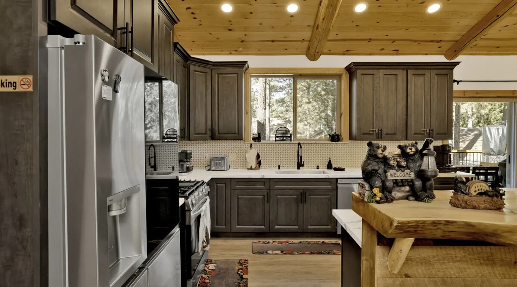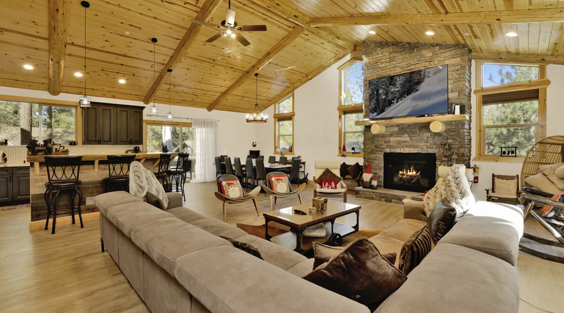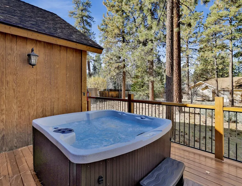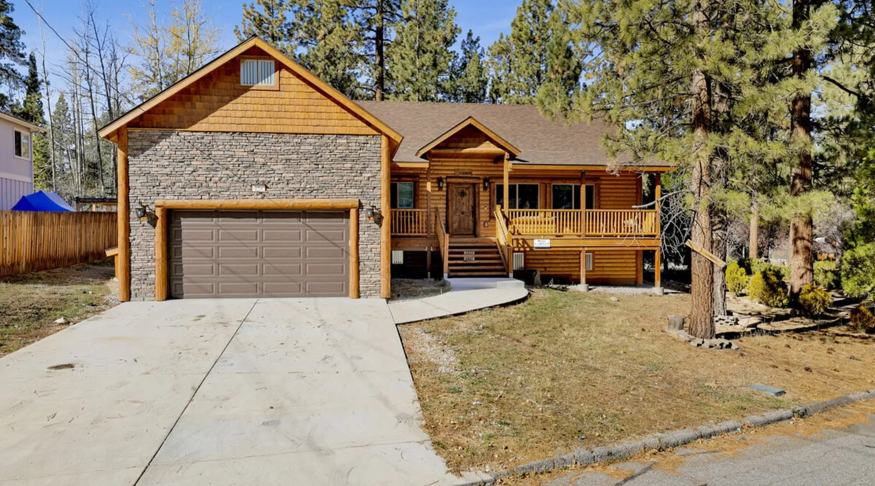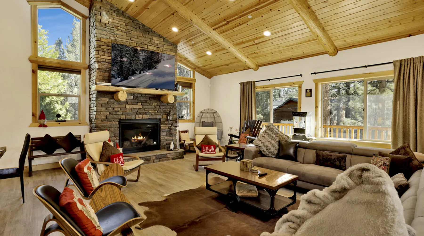 Whispering Pines Big Bear Lake - Ultra-Modern Luxury Log Cabin Retreat - Hot Tub Escape to Whispering Forest, a magical mountain retreat tucked into the serene pines of Big Bear Lake. From the moment you arrive, the cabin’s warm, inviting atmosphere wraps around you like a soft blanket. Sunlight filters through towering trees, casting dappled shadows across the rustic yet refined interior, where soaring ceilings, knotty pine walls, and a grand stone fireplace create the perfect blend. The space The open living spaces invite laughter and conversation, while the fully equipped kitchen with its generous island and stainless-steel appliances inspire leisurely breakfasts and memorable dinners with loved ones. With four beautifully appointed bedrooms and three full bathrooms, Whispering Forest effortlessly accommodates families, friends, or multi-generational gatherings. Step onto the elevated back deck to sip your morning coffee as the forest comes alive or unwind on the covered front porch as evening stars twinkle above. Step outside and you may not want to leave the property. Relax in the hot tub, BBQ your favorite meal, and don't worry when the nights get chilly, there's a portable heater to keep things cozy. Just a short drive from the lake, ski slopes, and the vibrant Big Bear Village, the cabin offers the ideal balance of seclusion and convenience. Whether you’re chasing winter snow, summer lake adventures, or simply a peaceful escape from everyday life, Whispering Forest invites you to slow down, breathe deeply, and immerse yourself in a mountain getaway where the forest truly whispers and every moment feels like home. Sleeping Arrangements: Bedroom 1: Queen Bed Bedroom 2: Full/Twin Bunk + Twin Bed Bedroom 3: Queen/Twin Bunk Bedroom 4: Full/Twin Bunk + Twin/Twin Bunk Bathroom Arrangements: Hallway Full Bath off Kitchen/Living Room Private Full Bath- Bedroom 1 Hallway Full Bath between Bedrooms 2 & 3 -Sleeps 10 -4 Car Driveway Parking -2 Pets Welcome w/ Additional Fees -2,119 Square Feet -City Permit #: VRR-2025-0912 Guest access Once checked in, guests can enjoy sole access to their private property for the duration of their booked dates. Registration Details 2025-0912