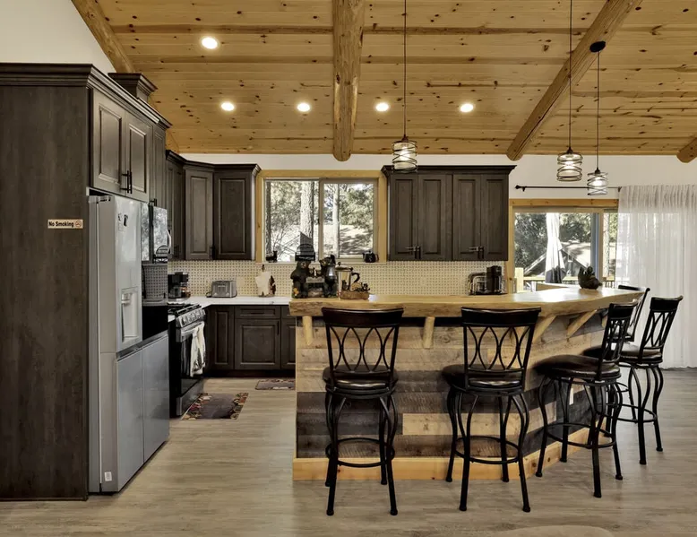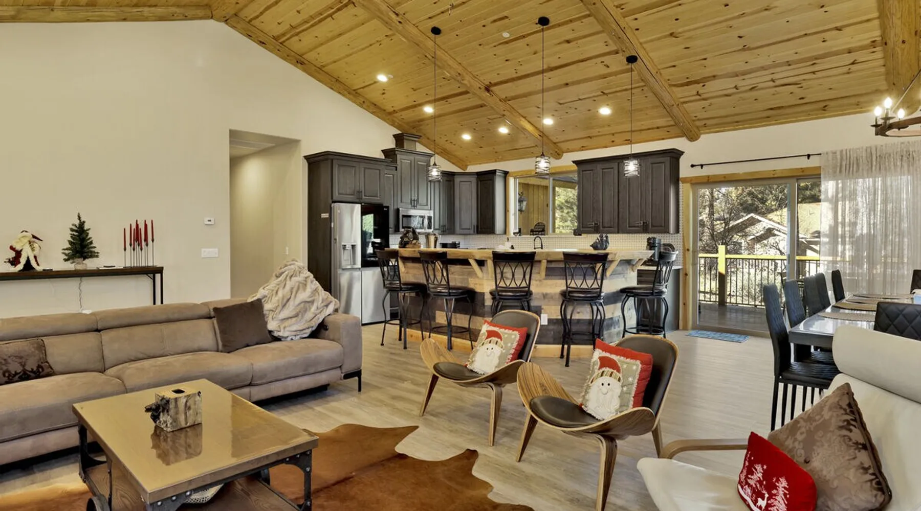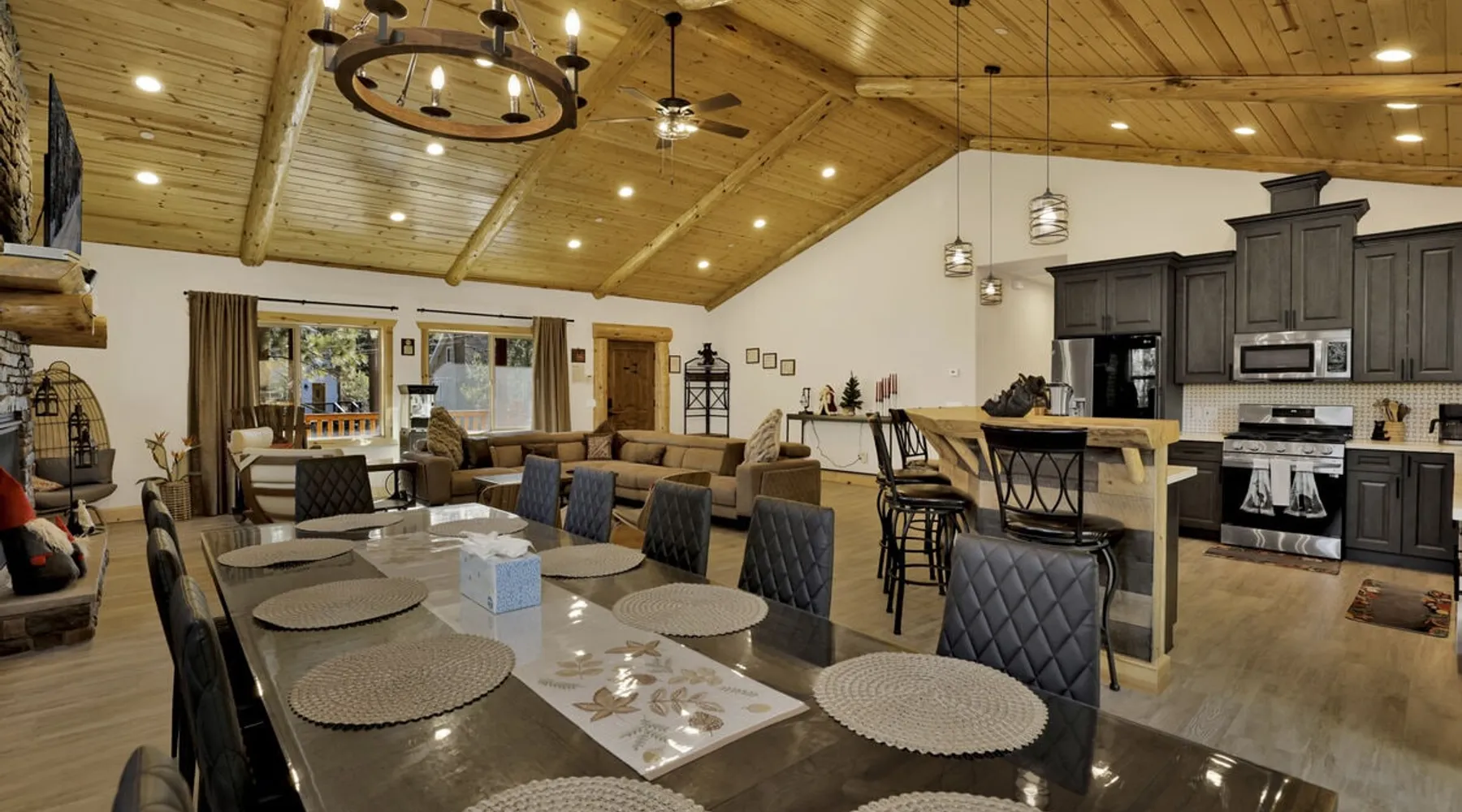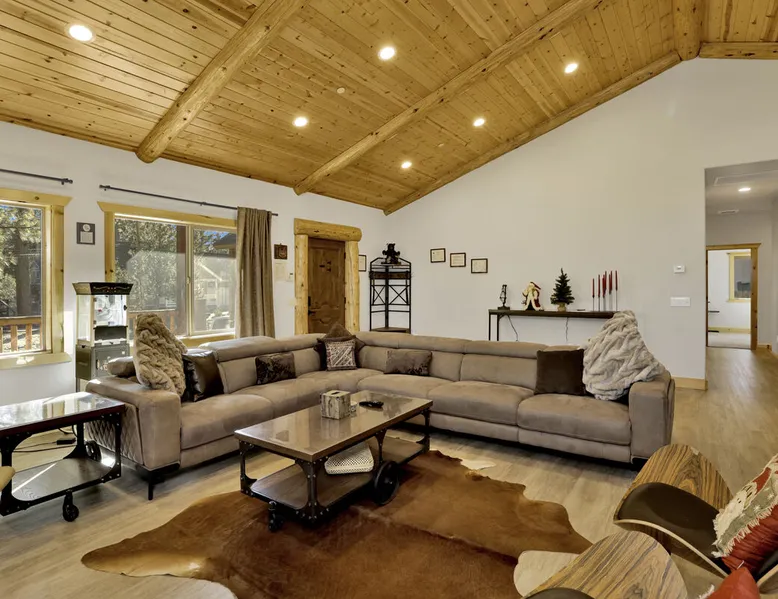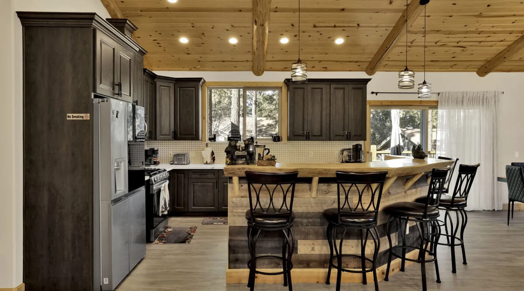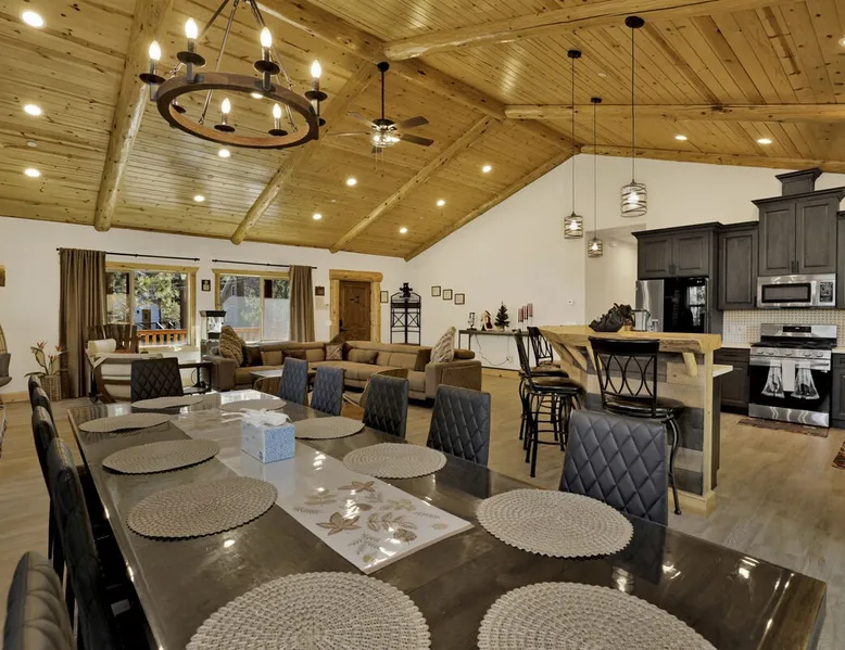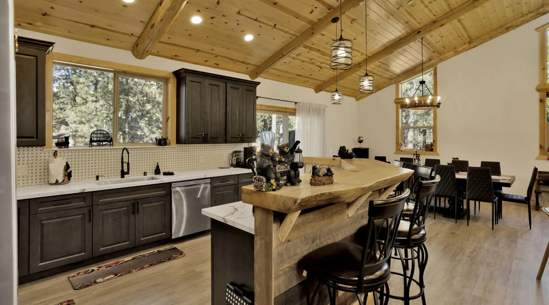 Whispering Pines Big Bear Lake - Ultra-Modern Luxury Log Cabin Retreat - Hot Tub Escape to Whispering Forest, a magical mountain retreat tucked into the serene pines of Big Bear Lake. From the moment you arrive, the cabin’s warm, inviting atmosphere wraps around you like a soft blanket. Sunlight filters through towering trees, casting dappled shadows across the rustic yet refined interior, where soaring ceilings, knotty pine walls, and a grand stone fireplace create the perfect blend. The space The open living spaces invite laughter and conversation, while the fully equipped kitchen with its generous island and stainless-steel appliances inspire leisurely breakfasts and memorable dinners with loved ones. With four beautifully appointed bedrooms and three full bathrooms, Whispering Forest effortlessly accommodates families, friends, or multi-generational gatherings. Step onto the elevated back deck to sip your morning coffee as the forest comes alive or unwind on the covered front porch as evening stars twinkle above. Step outside and you may not want to leave the property. Relax in the hot tub, BBQ your favorite meal, and don't worry when the nights get chilly, there's a portable heater to keep things cozy. Just a short drive from the lake, ski slopes, and the vibrant Big Bear Village, the cabin offers the ideal balance of seclusion and convenience. Whether you’re chasing winter snow, summer lake adventures, or simply a peaceful escape from everyday life, Whispering Forest invites you to slow down, breathe deeply, and immerse yourself in a mountain getaway where the forest truly whispers and every moment feels like home. Sleeping Arrangements: Bedroom 1: Queen Bed Bedroom 2: Full/Twin Bunk + Twin Bed Bedroom 3: Queen/Twin Bunk Bedroom 4: Full/Twin Bunk + Twin/Twin Bunk Bathroom Arrangements: Hallway Full Bath off Kitchen/Living Room Private Full Bath- Bedroom 1 Hallway Full Bath between Bedrooms 2 & 3 -Sleeps 10 -4 Car Driveway Parking -2 Pets Welcome w/ Additional Fees -2,119 Square Feet -City Permit #: VRR-2025-0912 Guest access Once checked in, guests can enjoy sole access to their private property for the duration of their booked dates. Registration Details 2025-0912