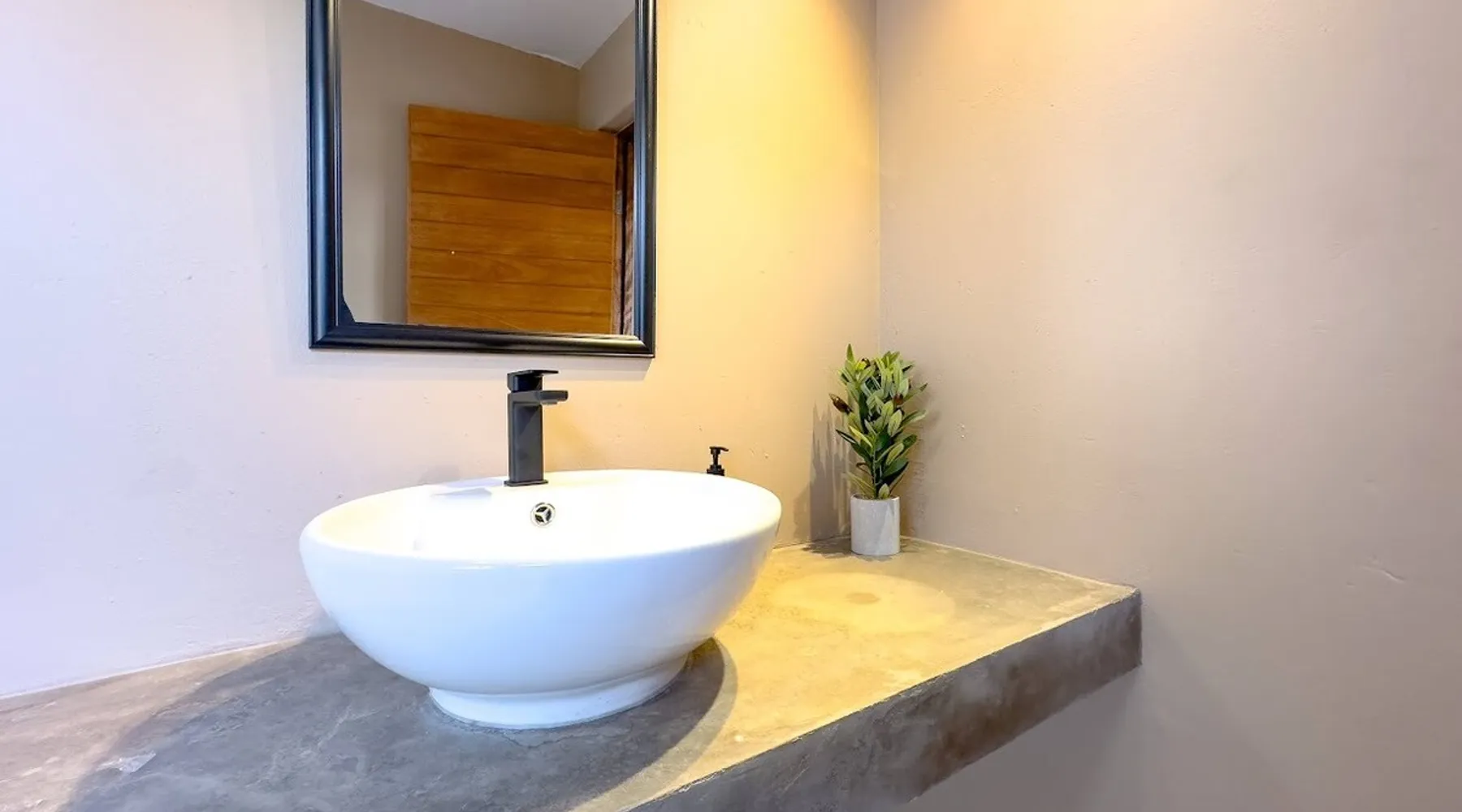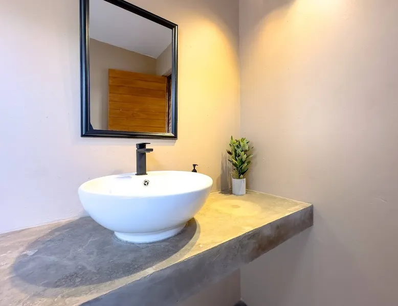 The house can accommodate 10 guests in five bedrooms and 4 bathrooms. Two bedrooms have en suite bathrooms. The downstairs en suite bedroom has a queen bed, and the bathroom has a bath and a secluded outdoor shower. The upstairs en suite bedroom has a queen bed, and the bathroom is equipped with a shower. Two of the other bedrooms are equipped with queen beds and the last one has two singles. The other two bathrooms, one downstairs, one upstairs are equipped with showers.