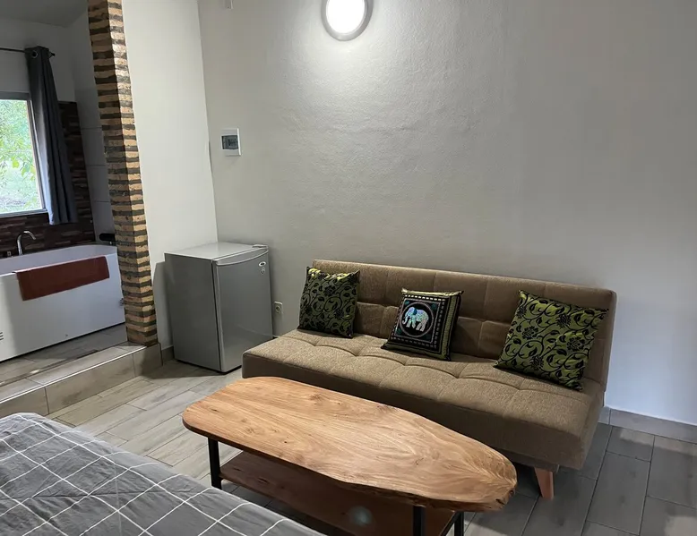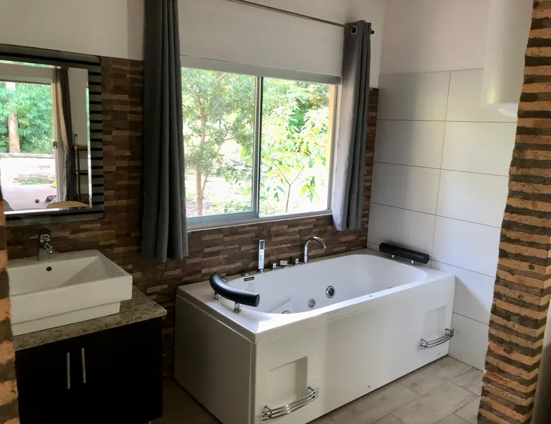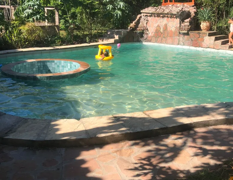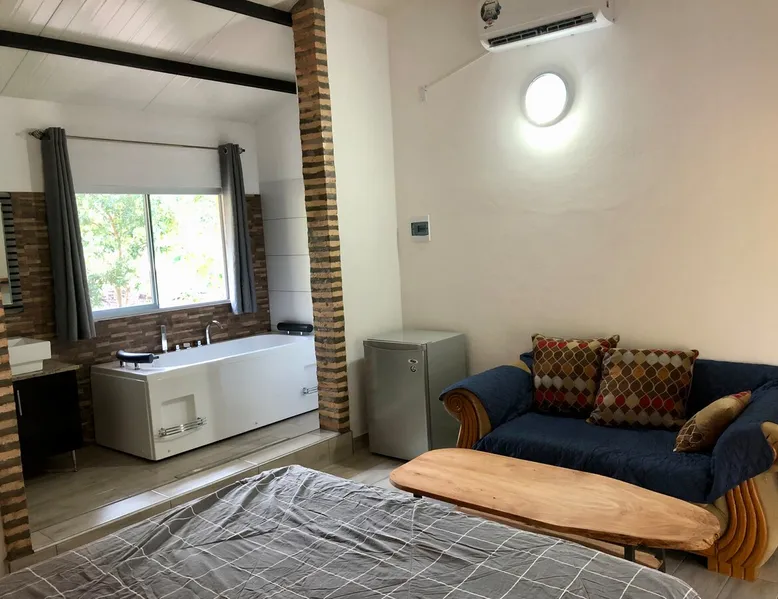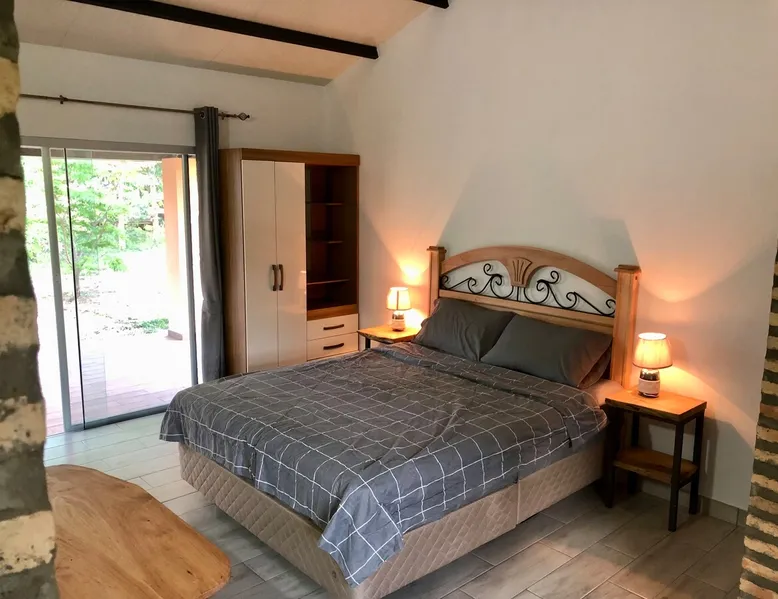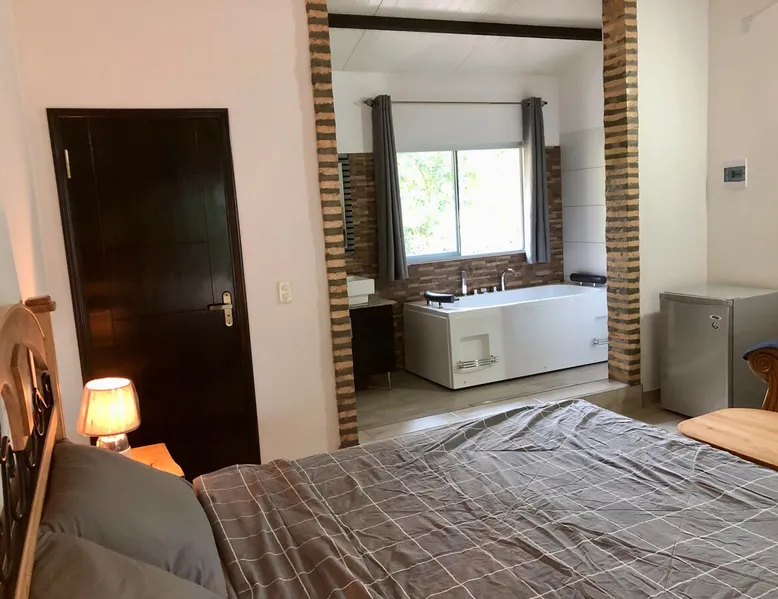 This is our home, not a hotel or guest house. You will be welcomed as we welcome friends. It is a boutique experience. We are happy to offer our guests the option of relaxing accommodation right at the foot of the mountains of La Colmena in our little Thai style homestead. Breakfast for 2 people is included for short term guests (up to 7 days). Guests can spoil themselves with Thai cuisine for extra charge. The space The house is approximately 25 square meters and is suitable for 2 people and has a main room with a queen-size bed and a sofa bed (180 x 110 cm) for a maximum of two additional people). The bathroom has a whirlpool bath tub with shower function. In front of the house there is a large terrace (3x4.5 meters) with chairs and a table. There is green space around the house. There is a kettle, toaster, dishes and cutlery, but no kitchen. The house also has air conditioning and mosquito nets on the windows and doors. The house is only a few meters away from the pool and community quincho. The house was completed in January 2025. Guest access Guests have access to our large swimming world with 18 meter pool as well as our soccer and volleyball courts (also badminton), can reserve a BBQ place at the greek once per week or per stay. Sports equipment and toys can be borrowed/rented. There are plenty of trails across our almost 30 hectares property including forrest with 6km trails (not maintained in summer). There is the opportunity to watch us at work with animals, in the fields and garden or even to participate and learn from our experience. Depending on the season, we also have our own products in our farm shop. Long-term renters are also allowed to run their own vegetable garden. Other things to note Prices include cooking gas, electricity, water, fire wood and end cleaning Internet: Starlink Crypto coin mining is not permitted Please note that from 1.-26. September we have construction work that may cause some noise.