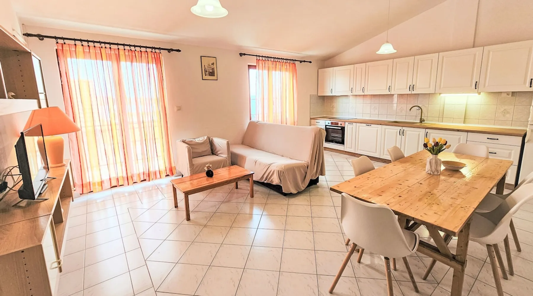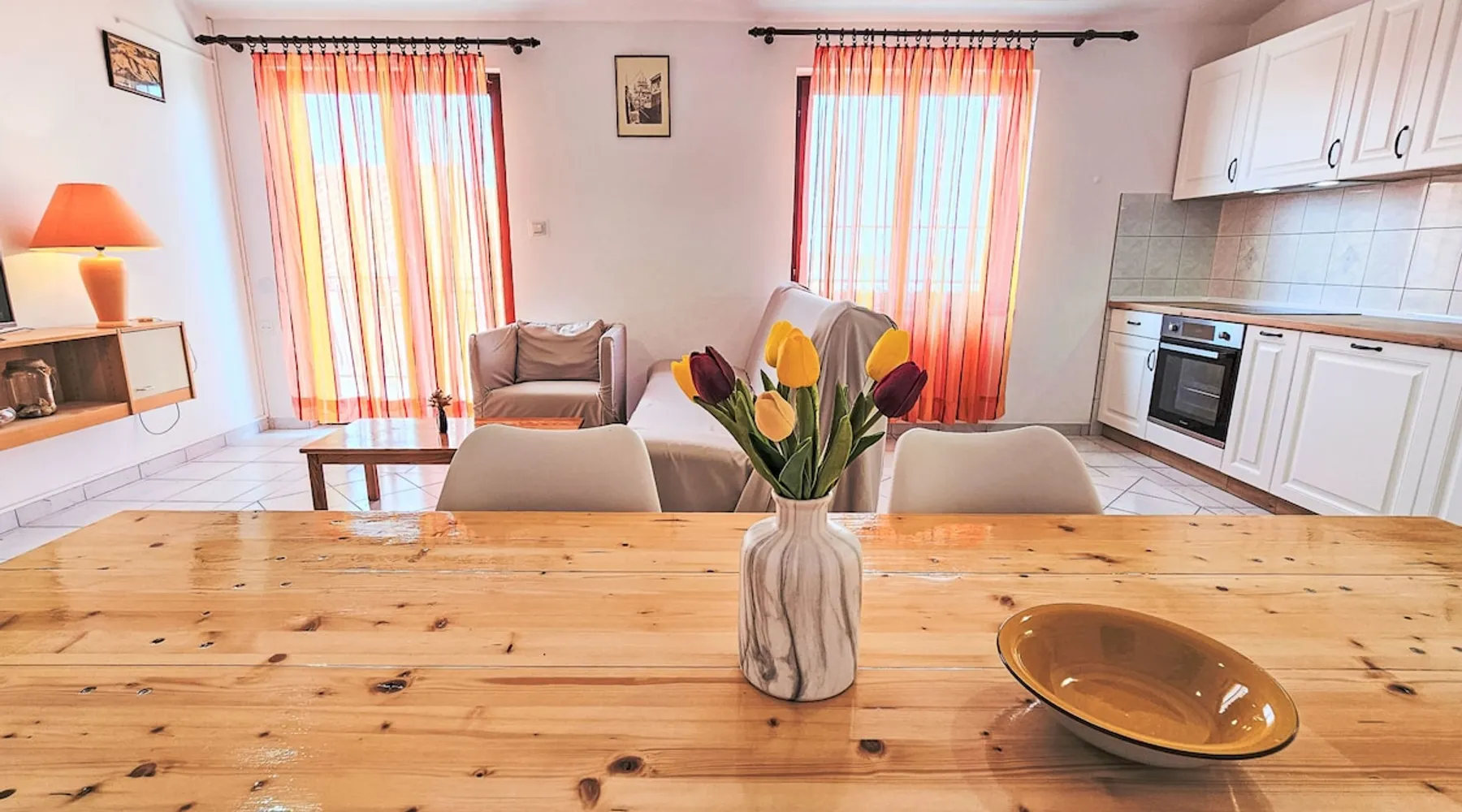 All discounts are already included, please go ahead and book the property if your travel dates are available. Below please see all the listing details 4-room apartment 100 m2 on 2nd floor, south facing position. Living/dining room 25 m2 with satellite TV (flat screen). Exit to the terrace. Entrance hall with air conditioning. 1 room with 1 bed (90 cm, length 190 cm), 1 french bed (160 cm, length 200 cm). Exit to the terrace. 1 room with 2 beds (90 cm, length 200 cm). The space 1 room with 1 bed (90 cm, length 190 cm), 1 double bed (2 x 90 cm, length 190 cm). Exit to the terrace. Open kitchen (4 hot plates, oven, kettle, microwave, freezer, electric coffee machine). Bath/WC, shower/WC. No heating option. Terrace 12 m2, terrace 6 m2. Terrace furniture. View of the sea. Facilities: washing machine, iron, hair dryer. Internet (WiFi, free). Maximum 1 pet/ dog allowed. - Included services: Final cleaning (Basic cleaning is always carried out by the guest) Weekly laundry (bed linen and towels) Local tax Wireless internet access (WIFI) Additional service charges may have to be paid locally on-site, see house rules and house manual for details. Please don't hesitate to contact us should you have any questions. Thank you. Žaborić 3 km from Brodarica: Apartment house "Rose". 1 km from the centre of Žaborić, in a sunny position, 100 m from the sea, 100 m from the beach. For shared use: property 400 m2. Barbecue. In the house: internet access. Parking at the house on the premises. Shop 800 m, restaurant 1 km, bus stop 150 m, concrete beach 100 m. Other things to note 1. Availability All open periods are instantly bookable. Please choose your dates and confirm your reservation without waiting for host approval. 2. Pricing We always offer you our best price and are unable to offer additional discounts. Please select your preferred travel dates to view the final price. Optional services described in the house rules can be booked after successful reservation by contacting us directly. 3. Check-in information You will receive the travel information with the exact address of the listing, the location for key collection and the contact details of your keyholder 28 days before arrival only if the pre check-in has been completed. In order to ensure a smooth handover of keys, we kindly ask you to contact the key holder by email 7 days before arrival, especially if your arrival takes place outside the stated check-in times. Please note, without an appointment, arrivals outside the stated check-in times will not be possible. 4. House Rules We share all property details in the full description. Please read both the description and the house rules. If available you will find optional amenities described in the house rules, which can be requested by contacting us directly.