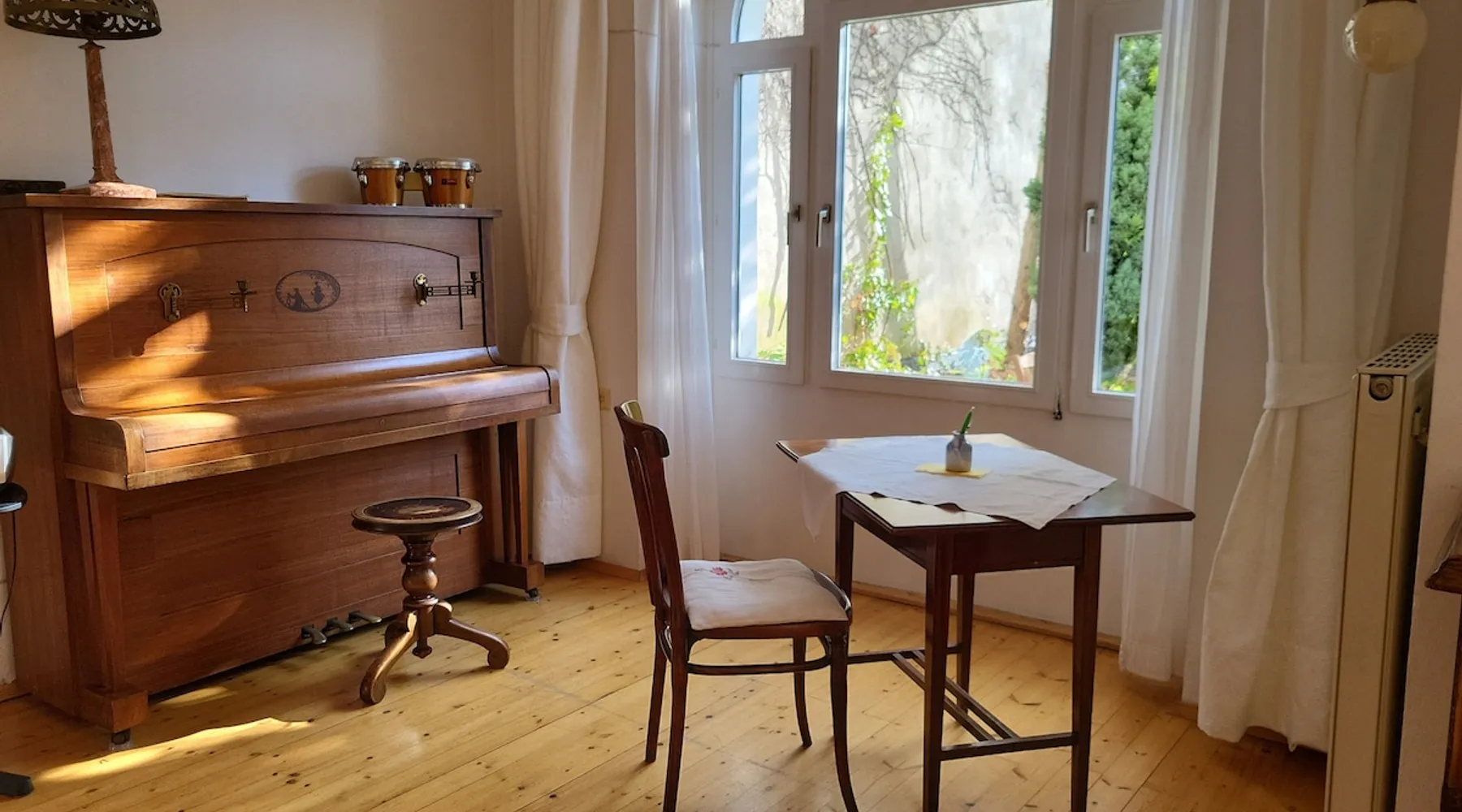 The space Discover the charming apartment located in a historic building in the idyllic garden and cottage district of Währing. Upon entering, the apartment offers a spacious feeling of room and, thanks to its hillside location, is one floor above street level. Here, coziness and functional living combine in perfect harmony. The interior features an inviting living area, distinguished by its unique ensemble of windows and glass doors, offering views of the private south-facing terrace, which spans 15 m2. This oasis-like extension of the living space, surrounded by a dense front garden, provides pleasant privacy. In addition to the comfortable seating and dining area in the living room, a functional piano adds to the atmospheric moments. The apartment also accommodates a spacious double bed in the back of the apartment and an additional single bed in the front area. Beyond its four walls, the advantages of an excellent location beckon: The convenient transportation links allow you to reach the city center in just 15 minutes using public transportation. A walk takes you in just 5 minutes to the picturesque Türkenschanzpark or in 15 minutes to the greenery of Vienna, the Wienerwald, where traditional Viennese wine taverns invite you to linger. For daily necessities, several supermarkets and restaurants are located in the immediate vicinity. The house's own garage also offers free parking.