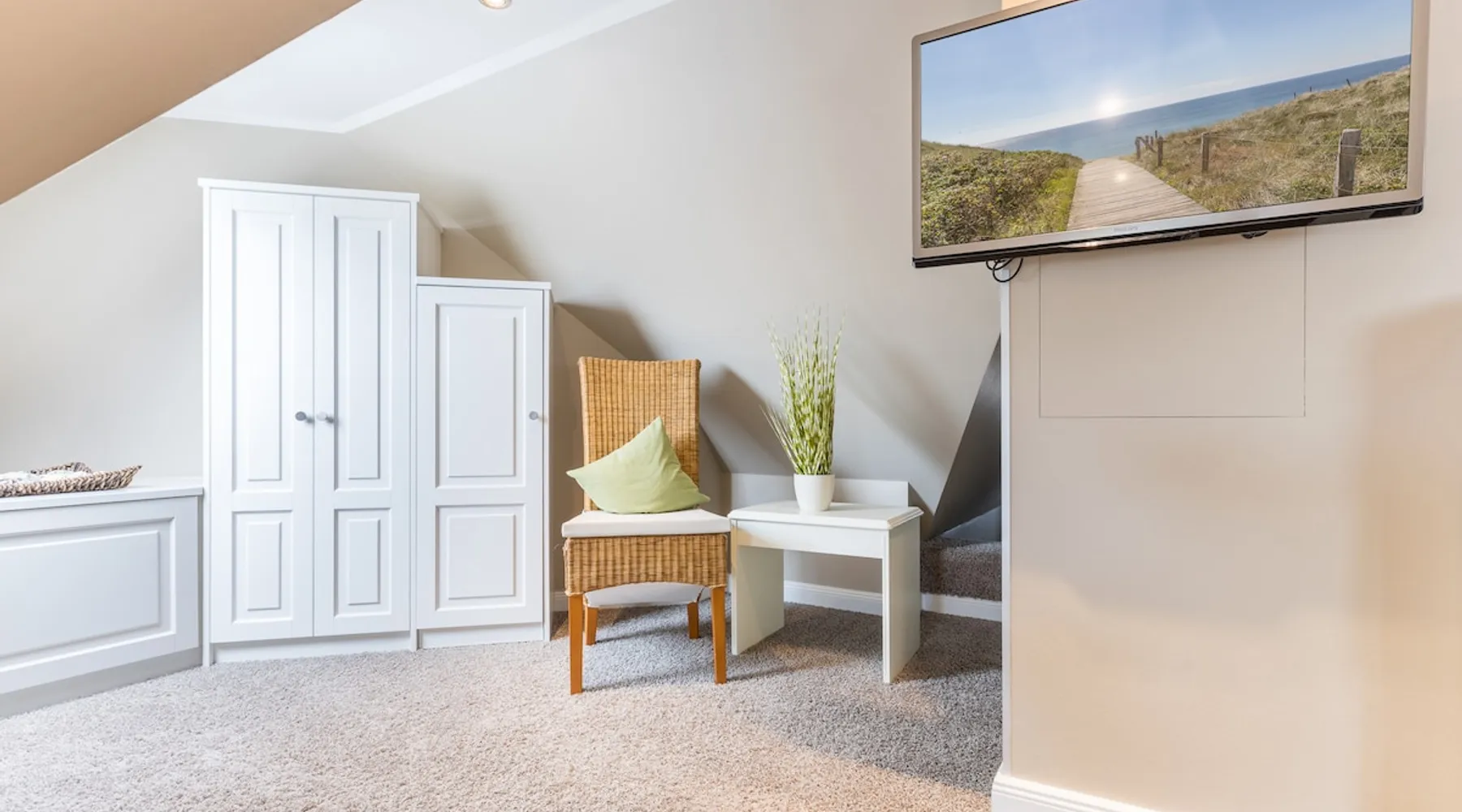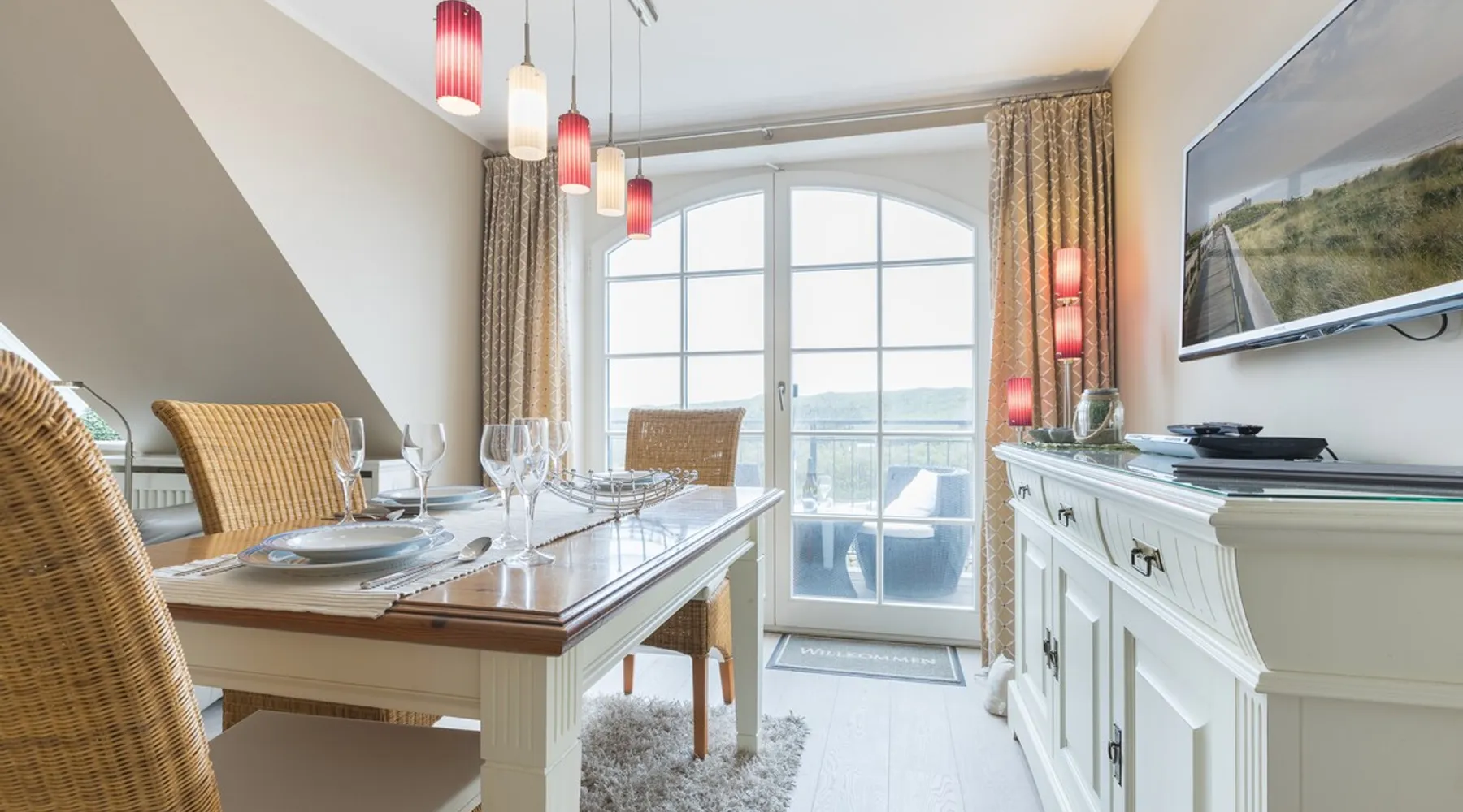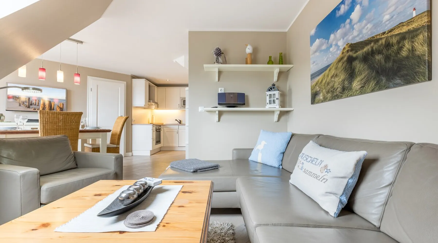 Enjoy unforgettable days in the apartment "Langeneß" in the beach residence on Sylt! This friendly home for up to 4 people has two bedrooms, a modern bathroom, and an open, well-equipped kitchen. Only 100 meters separate you from the beach, where relaxation and adventure are waiting for you. With amenities such as wifi, balcony and parking, this apartment is ideal for families and couples. Book your perfect Sylt vacation now! Other things to note Are you looking for a place to stay centrally located for your holiday on Sylt? The beach crossing almost at your doorstep? Then the Haus Strandresidenz with the apartment Langeneß is for you. The house is located in the heart of the island, the city of Westerland, and offers you everything the holiday heart desires if you want to travel with up to three people. On the upper floor of the apartment Langeneß is the living room with couch corner, 3D flat-screen TV and dining area. From here you can access your balcony, furnished with garden furniture from April to October. The kitchenette is well equipped with an oven, microwave, dishwasher and Nespresso coffee machine, so you won't lack anything. On the same floor there is a bedroom with a box spring double bed (180 x 200 cm) and a bathroom with bath, shower and toilet. In the attic of the apartment you find another room with single bunk bed (160 x 200cm) and a flat-screen TV. Westerland offers something for every holiday flavor, from shopping to numerous restaurants to long beach walks. In addition, from here you can reach the surrounding island towns such as Wenningstedt or Keitum in a few minutes by car or public transport. It's a non-smoking apartment where no animals are allowed. You will find a parking space right by the house. Amenities include: 3-room apartment with approx. 75 sqm of living space in the upper and attic for three people Upper floor: living room with Phillips 3D TV, radio, Blu-ray player, CD player, iPod docking station, telephone and Wi-Fi, open kitchen with microwave, oven, dishwasher, filter coffee machine and Nespresso machine, bedroom with box-spring double bed (180 x 200 cm mattresses separated) and flat-screen TV, bathroom with bathtub, shower and toilet DG: a room with single bunk bed (160x200cm) and flat-screen TV Washing machine, dryer and safe in the house.