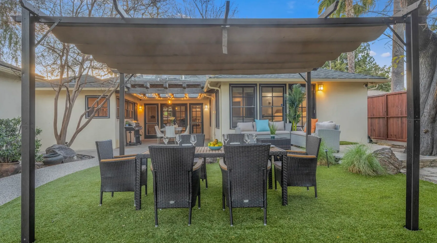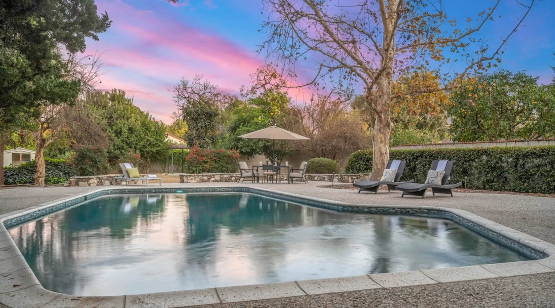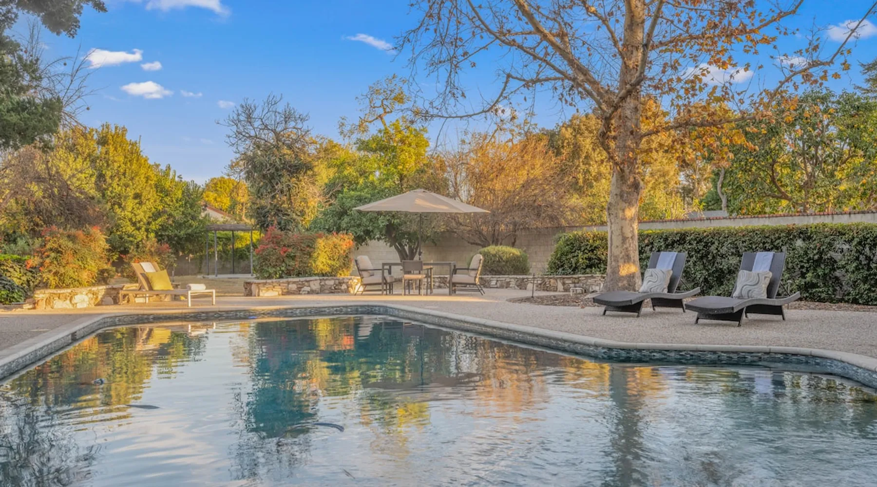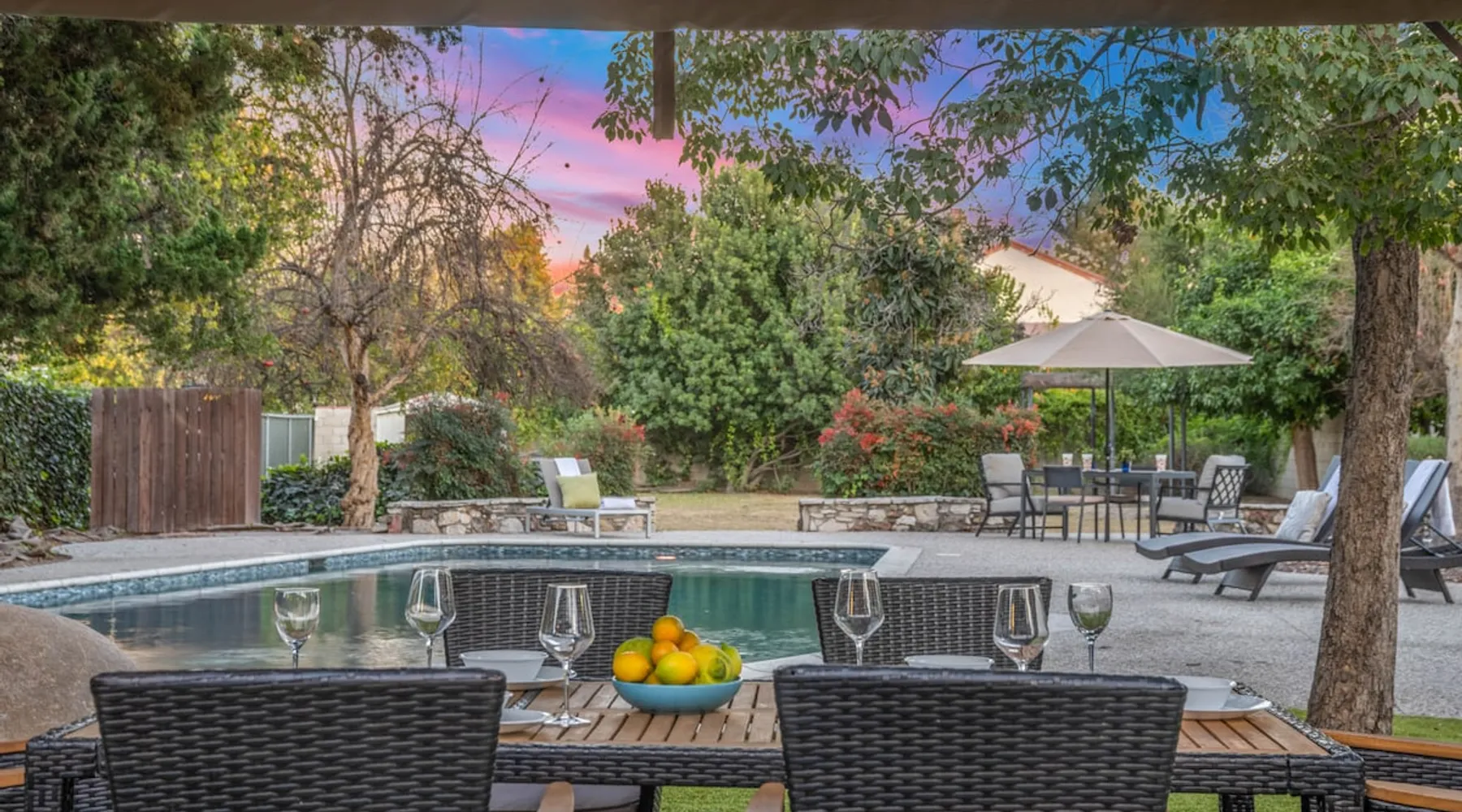 Welcome to Sherwood Oasis, a stunning 5-bedroom gated single-story retreat. Designed for relaxation and entertainment, this home features wide-open spaces, a sprawling, nearly half-acre yard perfect for gatherings, and an oversized sparkling pool for endless fun. A beautifully remodeled chef’s kitchen invites culinary creativity, while including a charming remodeled guest house. Don’t miss this luxurious getaway—reach out now to book your stay and experience Sherwood Oasis for yourself! The space The main house boasts 4 spacious bedrooms and 3 well-appointed bathrooms, while the charming guest house includes a luxurious king bed, a comfortable sofa, a fully equipped kitchen, dining area, and a Smart TV—perfect for hosting friends or family. Outdoor Amenities Welcome to Sherwood Oasis Discover your perfect retreat in the heart of Sherwood Forest, California. This stunning 5-bedroom gated single-story home is designed for ultimate relaxation and entertainment, offering unmatched elegance and comfort. Outdoor Paradise One of the standout features of Sherwood Oasis is its expansive outdoor space. The highlight is the massive gated pool, which can be heated to over 90 degrees for year-round enjoyment (additional fee applies). The pool is surrounded by impeccably landscaped grounds with manicured trees, creating a serene and private sanctuary. The spacious patio, shaded by lush greenery, is perfect for entertaining guests or enjoying tranquil evenings under the stars. The property is surrounded by lush trees and vegetation, creating a beautiful, natural setting. Due to this, occasional leaves may find their way into the pool. While this is part of the charm of a green, serene environment, we do our best to manage it, our pool technician visits twice a week to ensure the pool stays clean and well-maintained. Master Suite Retreat Escape to the separate master wing, featuring an en-suite bathroom that redefines luxury. This Zen-like oasis boasts a Japanese soaking tub, a skylight, a walk-in shower with a rain shower head and waterfall, and elegant tilework throughout. The suite includes an expansive walk-in closet with custom built-ins and breathtaking views of the lush rear grounds, offering a peaceful sanctuary to unwind. Additional Amenities Pool table and games for indoor entertainment Two cozy fireplaces Basketball pool hoop for added fun Stylish patio furniture and outdoor cooler Explore Sherwood Forest Sherwood Forest offers more than beautiful homes. It’s a community filled with opportunities to connect with nature and explore local attractions. Enjoy nearby hiking trails, parks, and renowned golf courses. Seasonal events like farmers’ markets and festivals bring the community to life, while a variety of restaurants—from charming cafes to upscale dining—cater to every culinary taste. Families will love the excellent schools and recreational facilities in the area. Whether you’re relaxing by your private pool, entertaining friends, or exploring the vibrant neighborhood, Sherwood Oasis offers an unparalleled living experience in one of California’s most desirable communities. Book your stay today and experience the magic of Sherwood Oasis! Other things to note Pool heating: Pool Heating is at an additional cost of $299/day (huge pool) with a 3-day minimum. It takes a day to heat the pool so let us know 48 hrs. before checking in if you want the pool heated and at what temperature. *89-96 is recommended. BBQ: Please note we provide a BBQ grill and empty propane tanks. If you would like our staff to fill up the propane tank for you it's $69/per tank. Otherwise, the tanks can be filled at a nearby propane gas station or store for only the cost of the propane. Please let us know if you have any questions. Pets: This home is pet friendly and there is a $250 pet cleaning fee. This fee is per pet. Keys: Any Missing keys to the property will be subjected to a $150 fee per set of keys. Clickers: Any gate/garage clickers missing to the property will be subjected to a $100 per clicker For rentals with term 30-day and longer we require a flat non-refundable utilities fee which is determined by the property size and season specific usage and paid upfront. Additional beds: Please let us know 24 hours before your reservation if you would like us to make up the sofa sleeper so that it’s ready for your stay. Rollaway beds available at $99 each. Important Note for Late or Last-Minute Bookings: Thank you for your reservation! Please note that for bookings made after 4 PM or for same-day arrivals, we may not always have time to fully refresh the property before your check-in, depending on the timing of your reservation. If you notice anything that needs attention upon arrival, please don’t hesitate to message us — we’re happy to send someone out the next day to take care of it. Your comfort is our priority, and we’ll do our best to ensure you have a great stay. Registration Details HSR22-003435