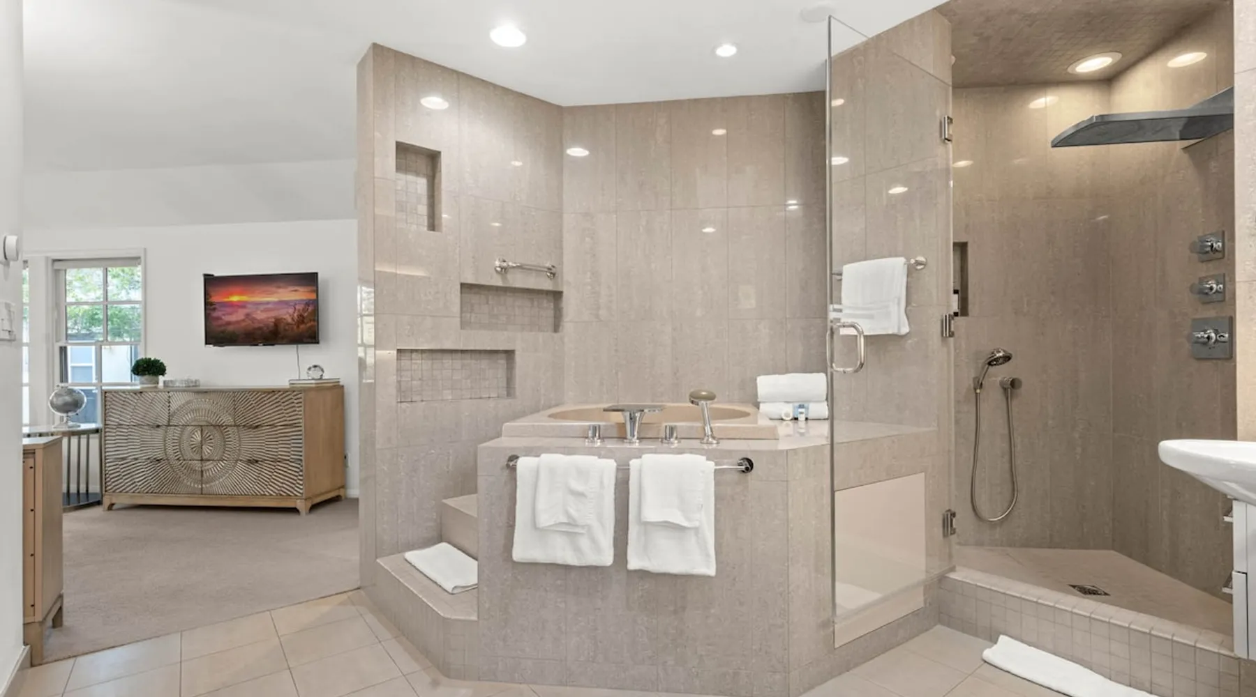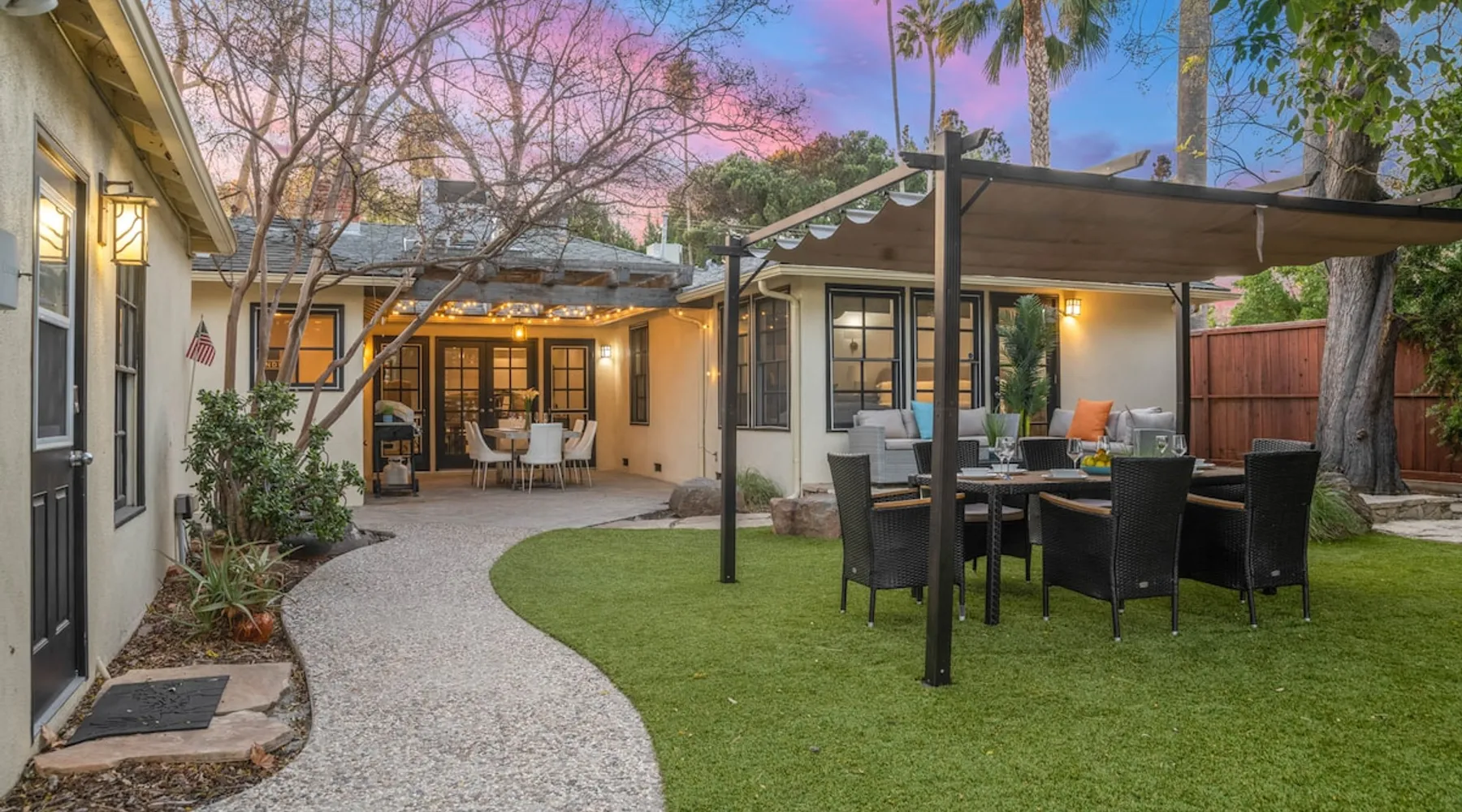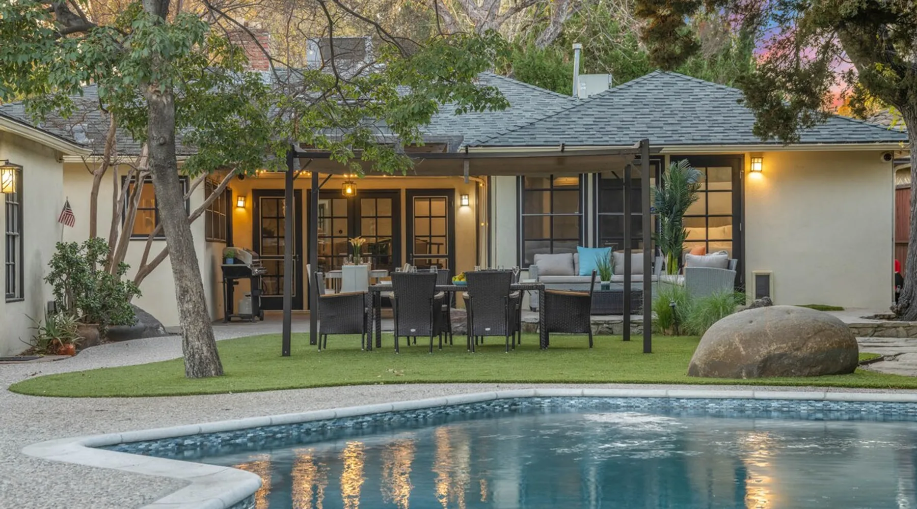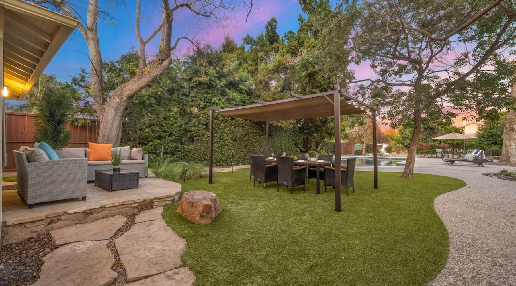 Welcome to Sherwood Oasis, a stunning 5-bedroom gated single-story retreat. Designed for relaxation and entertainment, this home features wide-open spaces, a sprawling, nearly half-acre yard perfect for gatherings, and an oversized sparkling pool for endless fun. A beautifully remodeled chef’s kitchen invites culinary creativity, while including a charming remodeled guest house. Don’t miss this luxurious getaway—reach out now to book your stay and experience Sherwood Oasis for yourself! The space The main house boasts 4 spacious bedrooms and 3 well-appointed bathrooms, while the charming guest house includes a luxurious king bed, a comfortable sofa, a fully equipped kitchen, dining area, and a Smart TV—perfect for hosting friends or family. Outdoor Amenities Welcome to Sherwood Oasis Discover your perfect retreat in the heart of Sherwood Forest, California. This stunning 5-bedroom gated single-story home is designed for ultimate relaxation and entertainment, offering unmatched elegance and comfort. Outdoor Paradise One of the standout features of Sherwood Oasis is its expansive outdoor space. The highlight is the massive gated pool, which can be heated to over 90 degrees for year-round enjoyment (additional fee applies). The pool is surrounded by impeccably landscaped grounds with manicured trees, creating a serene and private sanctuary. The spacious patio, shaded by lush greenery, is perfect for entertaining guests or enjoying tranquil evenings under the stars. The property is surrounded by lush trees and vegetation, creating a beautiful, natural setting. Due to this, occasional leaves may find their way into the pool. While this is part of the charm of a green, serene environment, we do our best to manage it, our pool technician visits twice a week to ensure the pool stays clean and well-maintained. Master Suite Retreat Escape to the separate master wing, featuring an en-suite bathroom that redefines luxury. This Zen-like oasis boasts a Japanese soaking tub, a skylight, a walk-in shower with a rain shower head and waterfall, and elegant tilework throughout. The suite includes an expansive walk-in closet with custom built-ins and breathtaking views of the lush rear grounds, offering a peaceful sanctuary to unwind. Additional Amenities Pool table and games for indoor entertainment Two cozy fireplaces Basketball pool hoop for added fun Stylish patio furniture and outdoor cooler Explore Sherwood Forest Sherwood Forest offers more than beautiful homes. It’s a community filled with opportunities to connect with nature and explore local attractions. Enjoy nearby hiking trails, parks, and renowned golf courses. Seasonal events like farmers’ markets and festivals bring the community to life, while a variety of restaurants—from charming cafes to upscale dining—cater to every culinary taste. Families will love the excellent schools and recreational facilities in the area. Whether you’re relaxing by your private pool, entertaining friends, or exploring the vibrant neighborhood, Sherwood Oasis offers an unparalleled living experience in one of California’s most desirable communities. Book your stay today and experience the magic of Sherwood Oasis! Other things to note Pool heating: Pool Heating is at an additional cost of $299/day (huge pool) with a 3-day minimum. It takes a day to heat the pool so let us know 48 hrs. before checking in if you want the pool heated and at what temperature. *89-96 is recommended. BBQ: Please note we provide a BBQ grill and empty propane tanks. If you would like our staff to fill up the propane tank for you it's $69/per tank. Otherwise, the tanks can be filled at a nearby propane gas station or store for only the cost of the propane. Please let us know if you have any questions. Pets: This home is pet friendly and there is a $250 pet cleaning fee. This fee is per pet. Keys: Any Missing keys to the property will be subjected to a $150 fee per set of keys. Clickers: Any gate/garage clickers missing to the property will be subjected to a $100 per clicker For rentals with term 30-day and longer we require a flat non-refundable utilities fee which is determined by the property size and season specific usage and paid upfront. Additional beds: Please let us know 24 hours before your reservation if you would like us to make up the sofa sleeper so that it’s ready for your stay. Rollaway beds available at $99 each. Important Note for Late or Last-Minute Bookings: Thank you for your reservation! Please note that for bookings made after 4 PM or for same-day arrivals, we may not always have time to fully refresh the property before your check-in, depending on the timing of your reservation. If you notice anything that needs attention upon arrival, please don’t hesitate to message us — we’re happy to send someone out the next day to take care of it. Your comfort is our priority, and we’ll do our best to ensure you have a great stay. Registration Details HSR22-003435